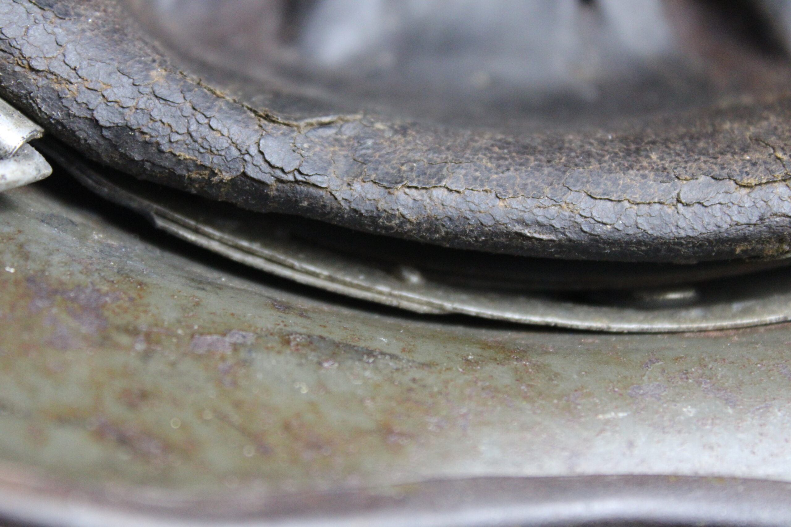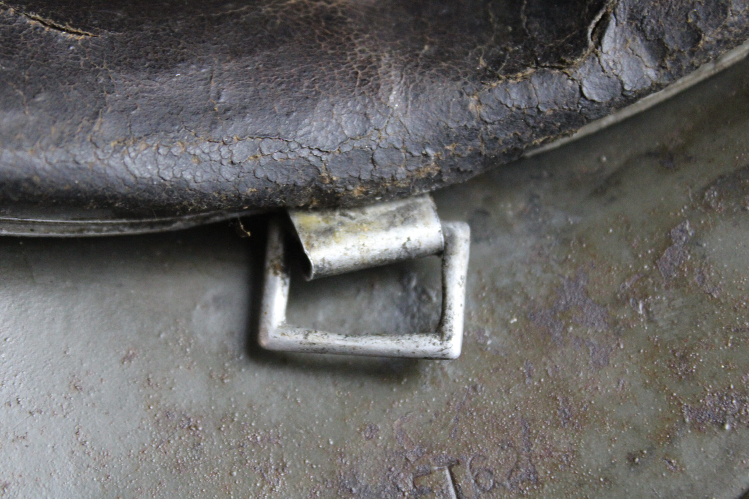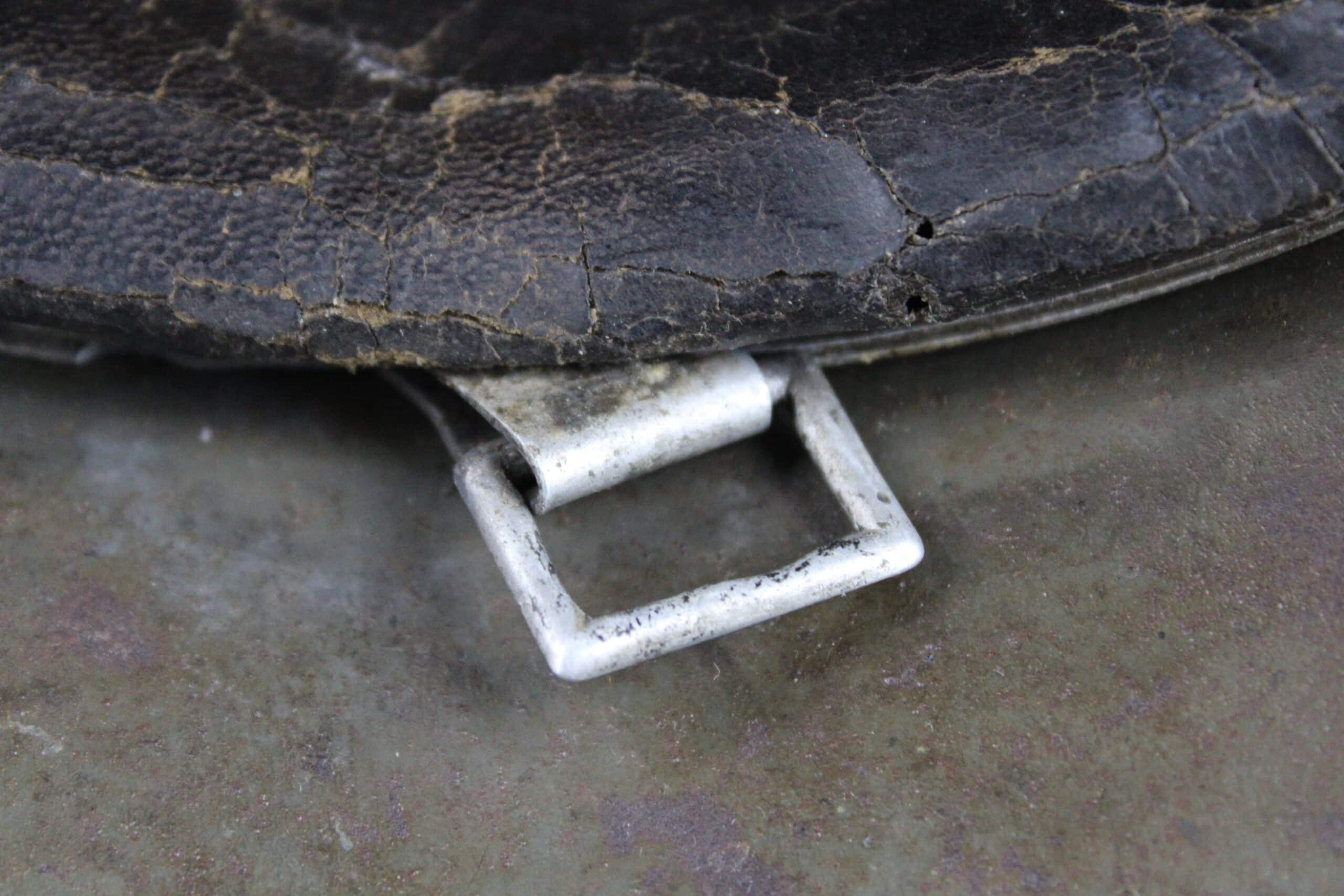 Emplacement de l’aigle de la Heer bien visible. Cerclage aluminium renforcé en place, maintenu par ses 3 rivets. Cuir en place, l’intérieur est dans son jus d’usage conforme à l’intégralité de la pièce.