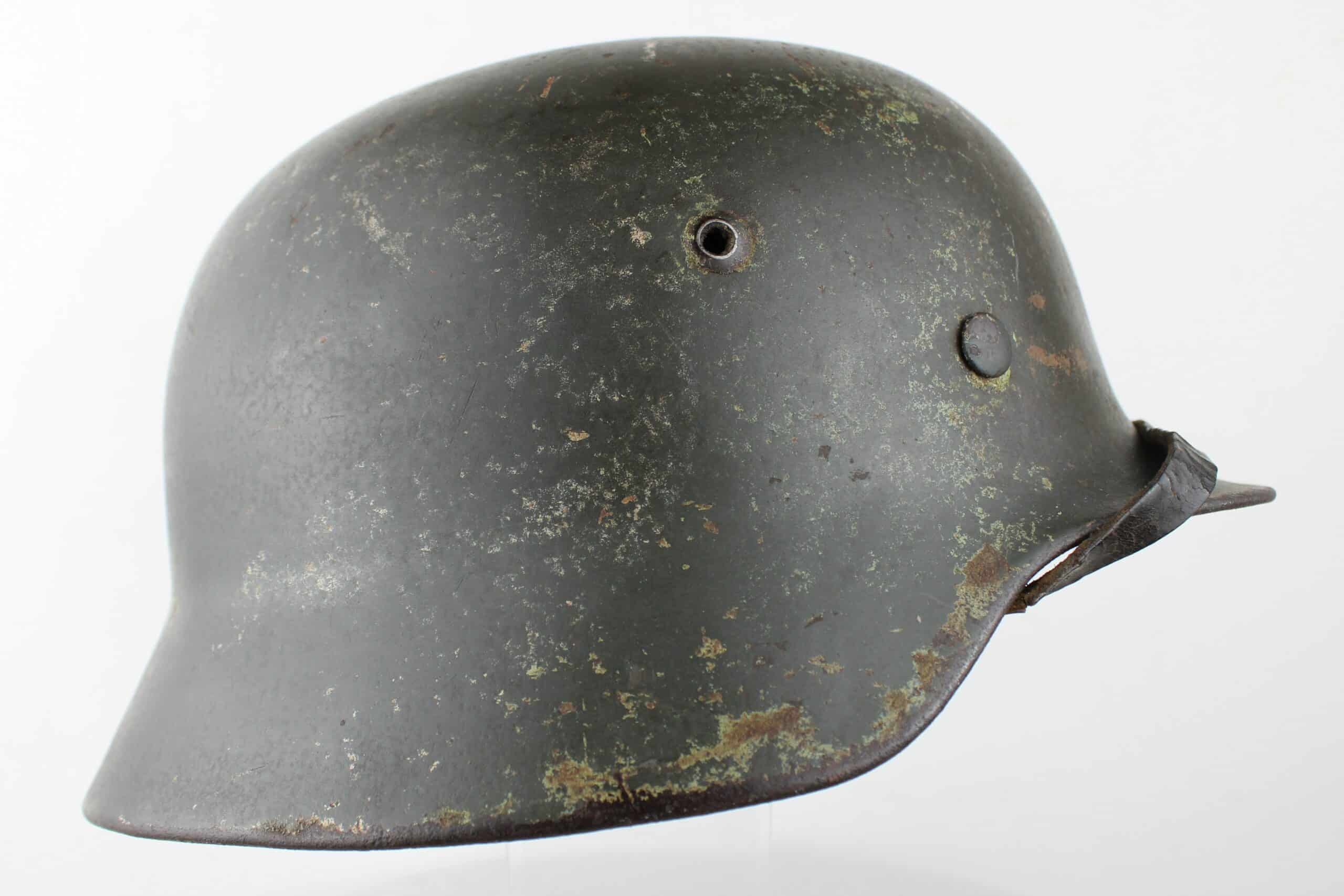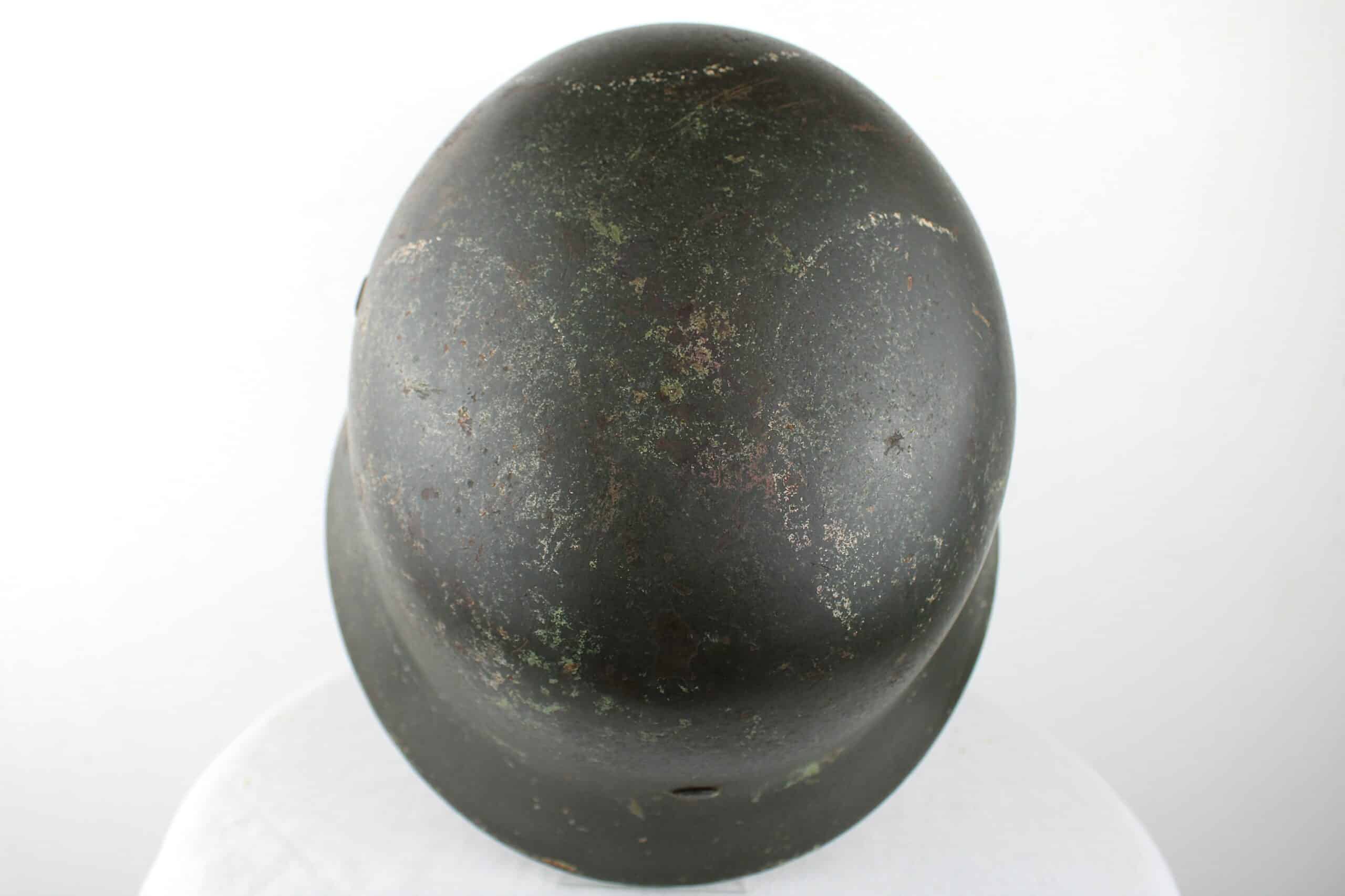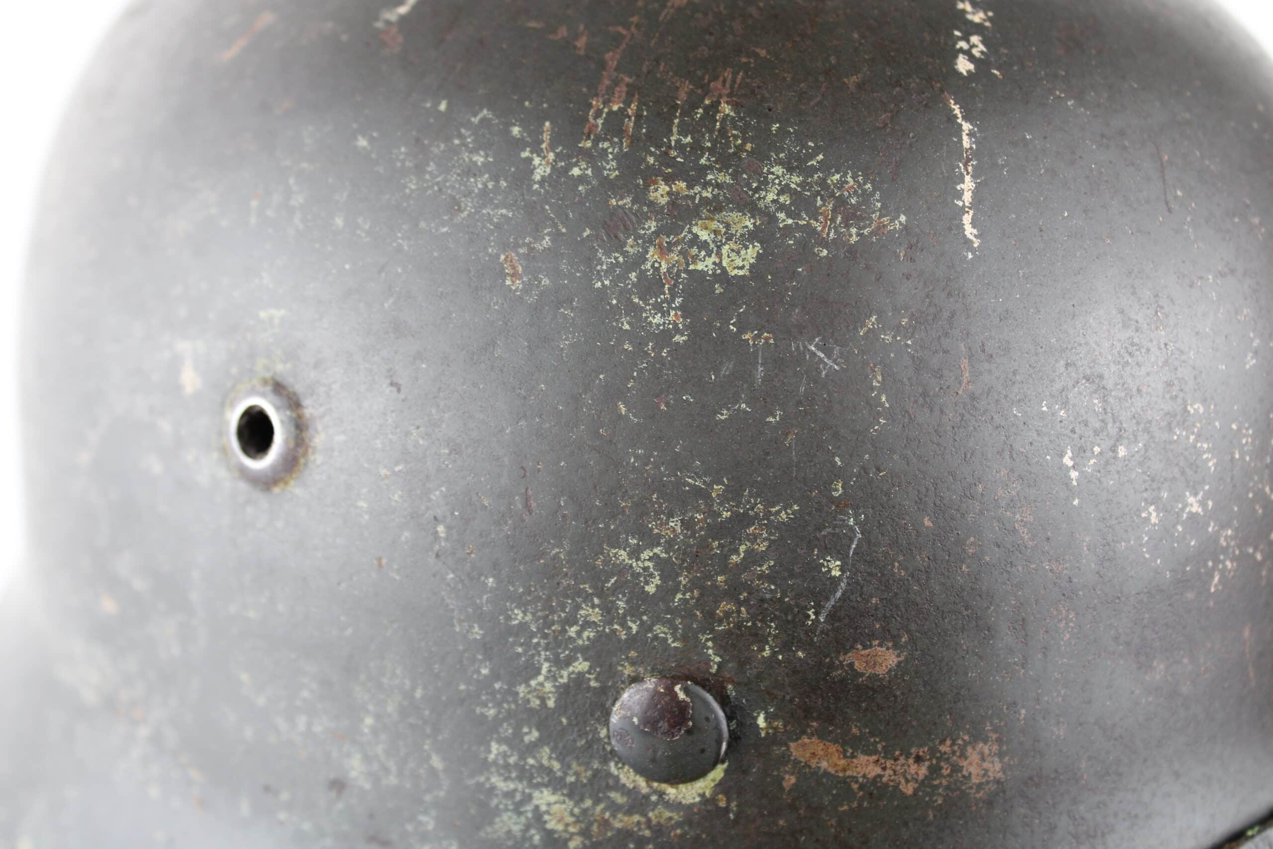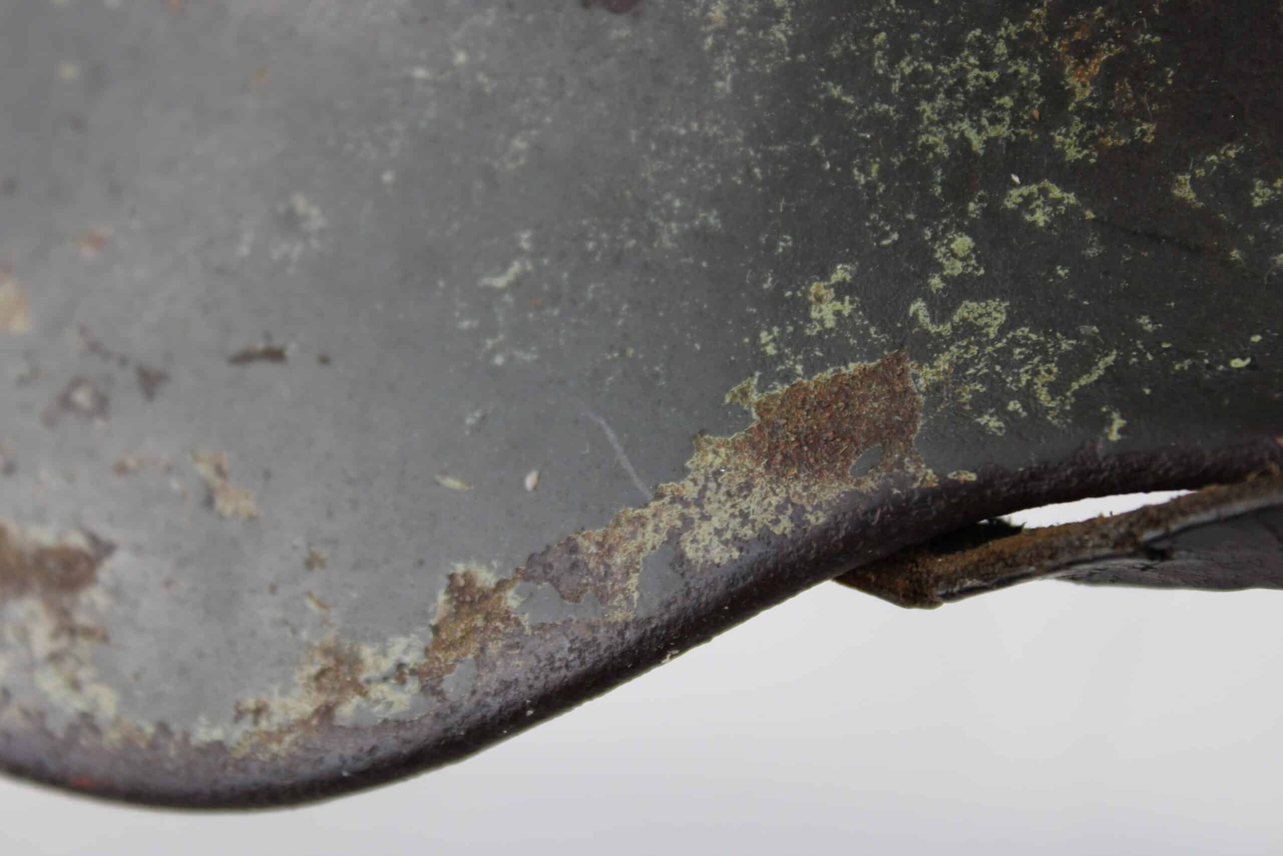 Coque avec peinture Feldgrau et reste de camouflage tortue visible, reste de l’aigle doré de la Kriegsmarine. Cerclage aluminium renforcé en place maintenu par ses 3 rivets. Jugulaire complète dans sa pleine longueur encore en place avec boucle acier et marquage fabricant visible.