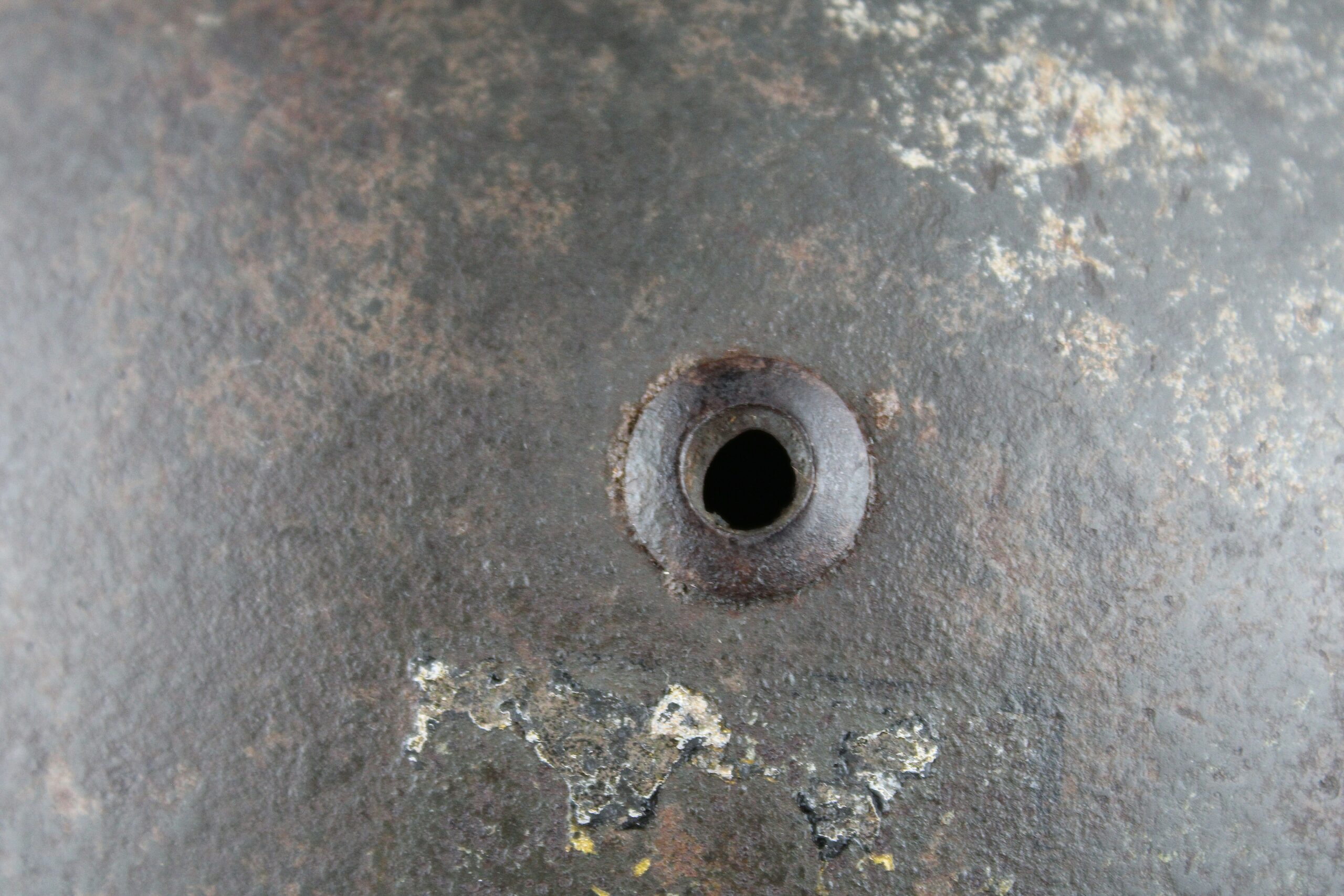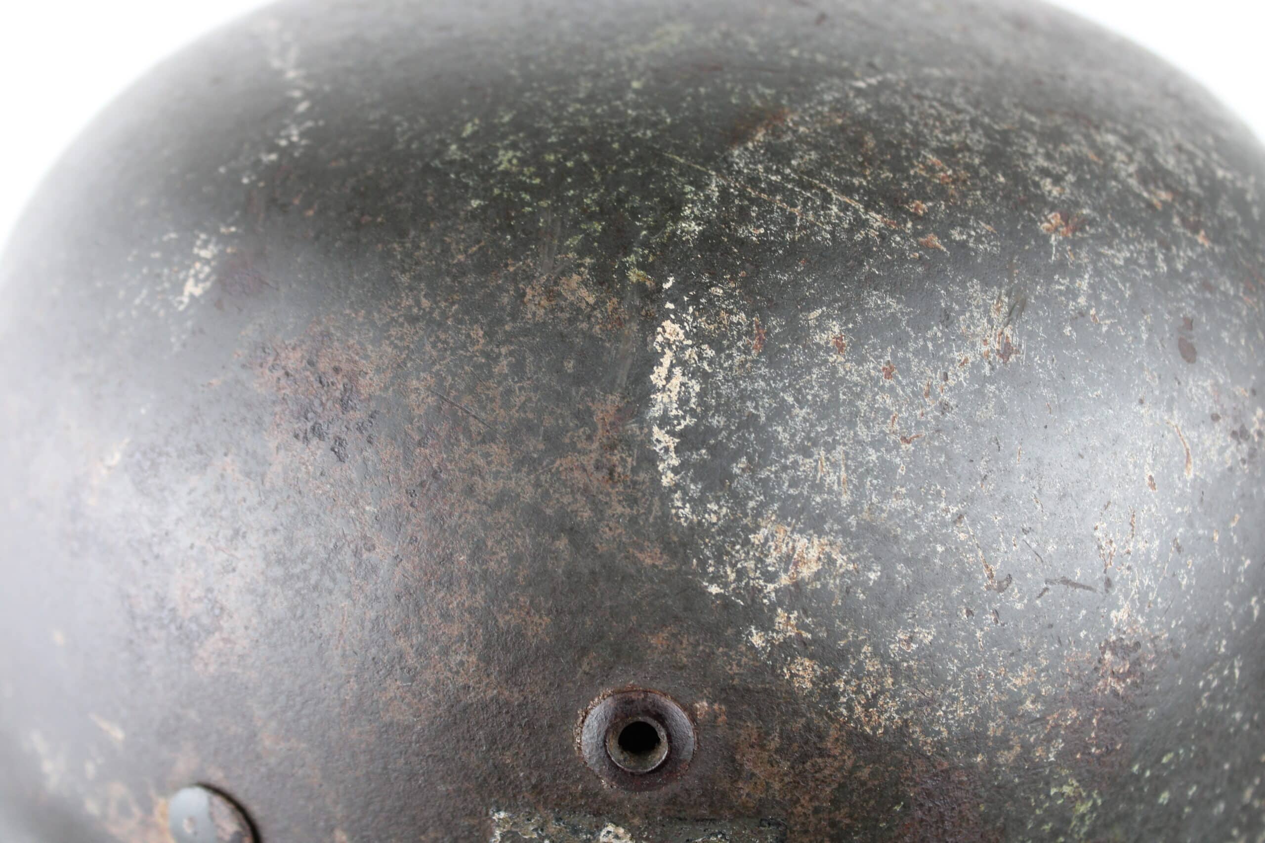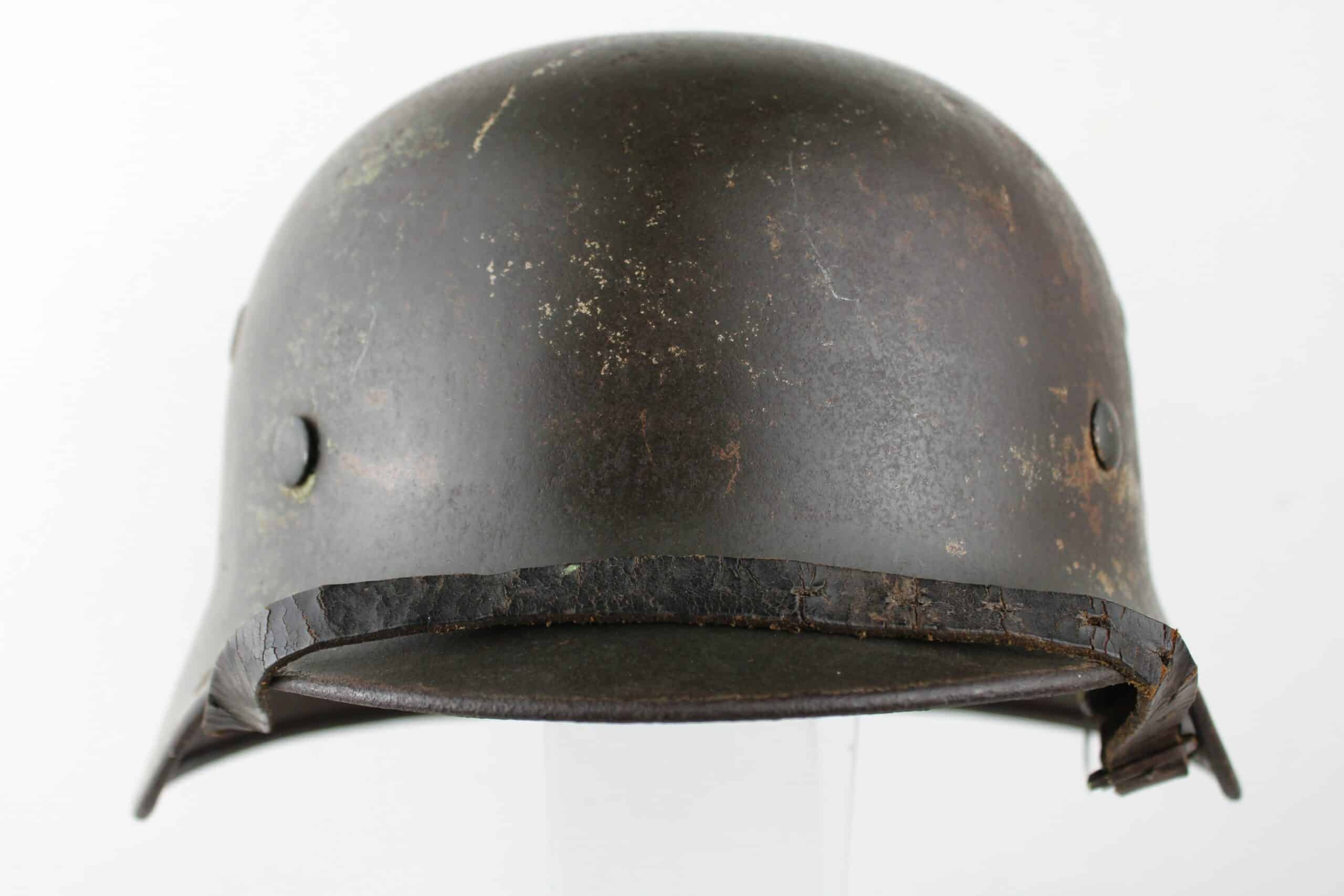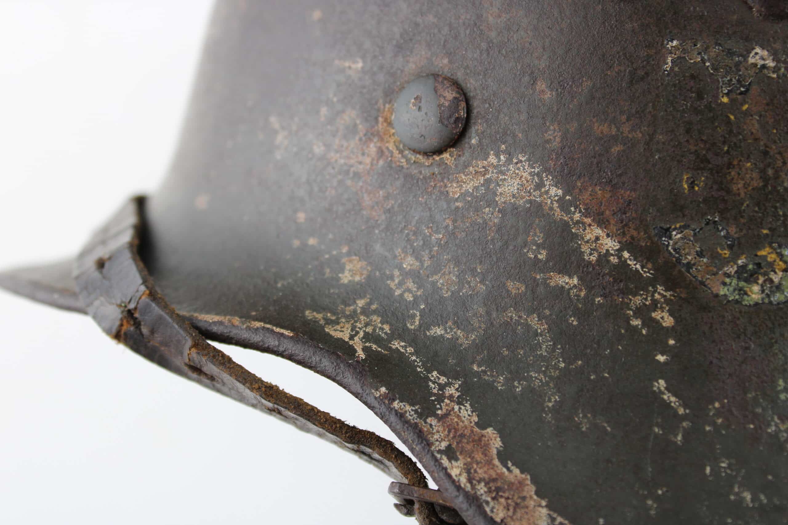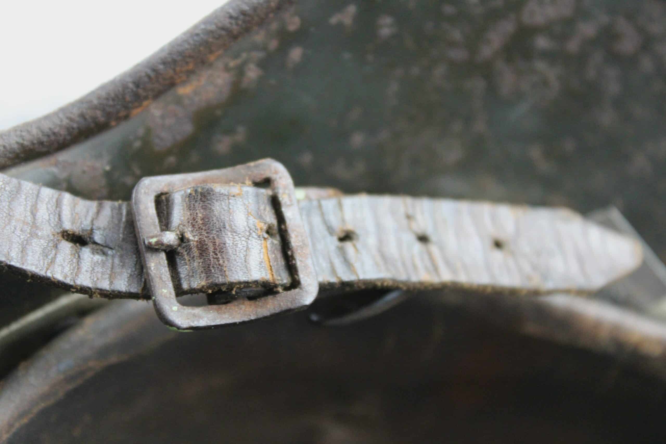 Coque avec peinture Feldgrau et reste de camouflage tortue visible, reste de l’aigle doré de la Kriegsmarine. Cerclage aluminium renforcé en place maintenu par ses 3 rivets. Jugulaire complète dans sa pleine longueur encore en place avec boucle acier et marquage fabricant visible.