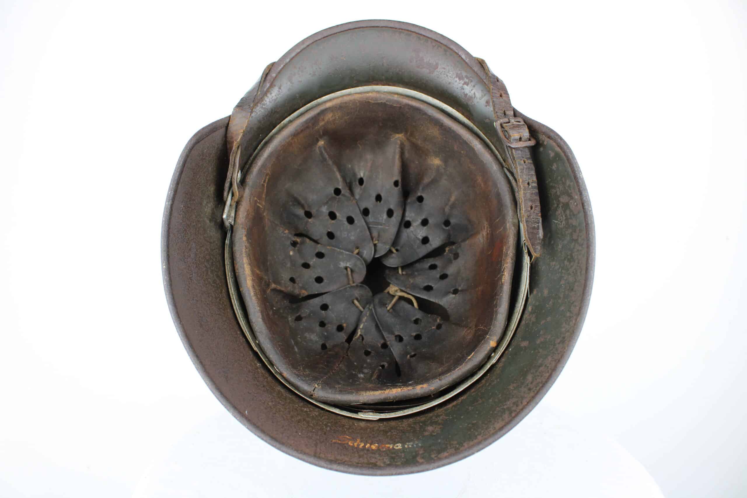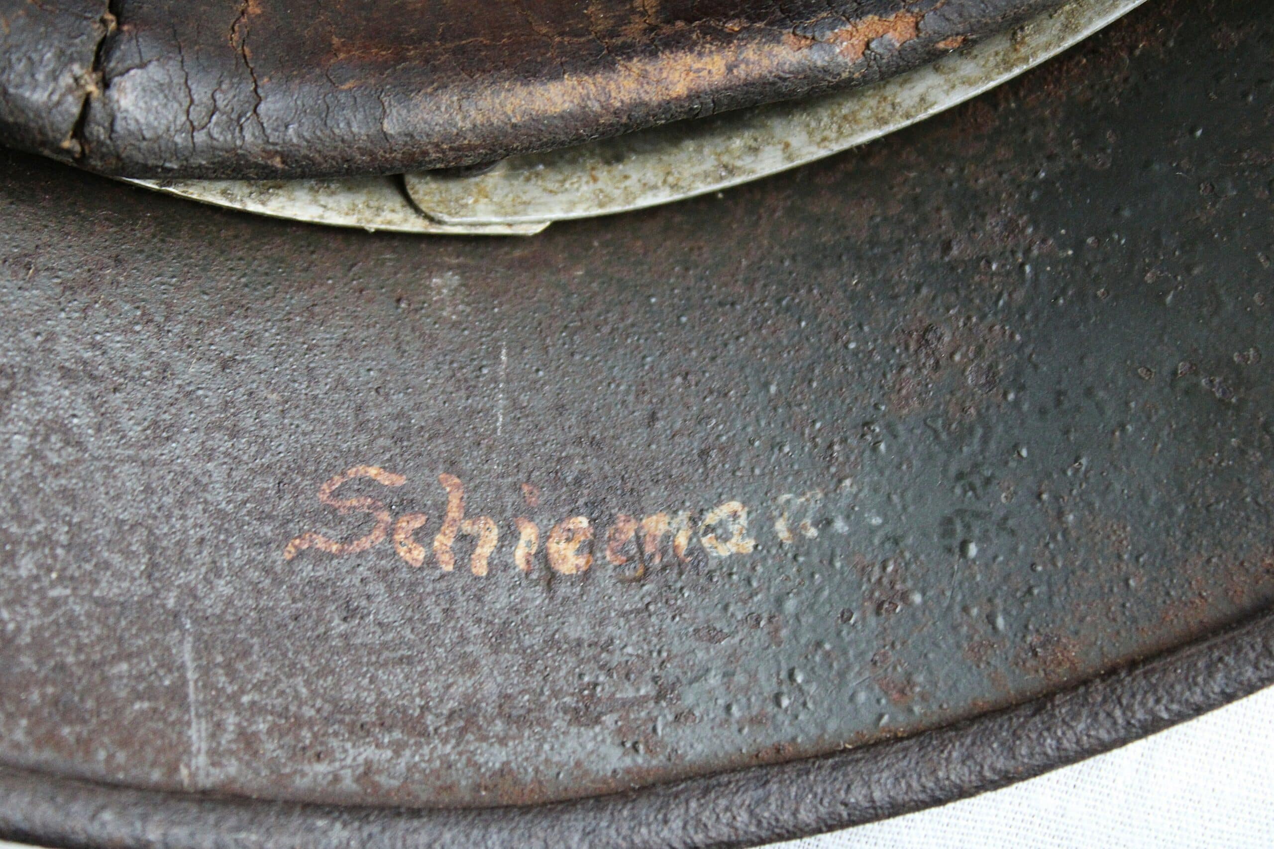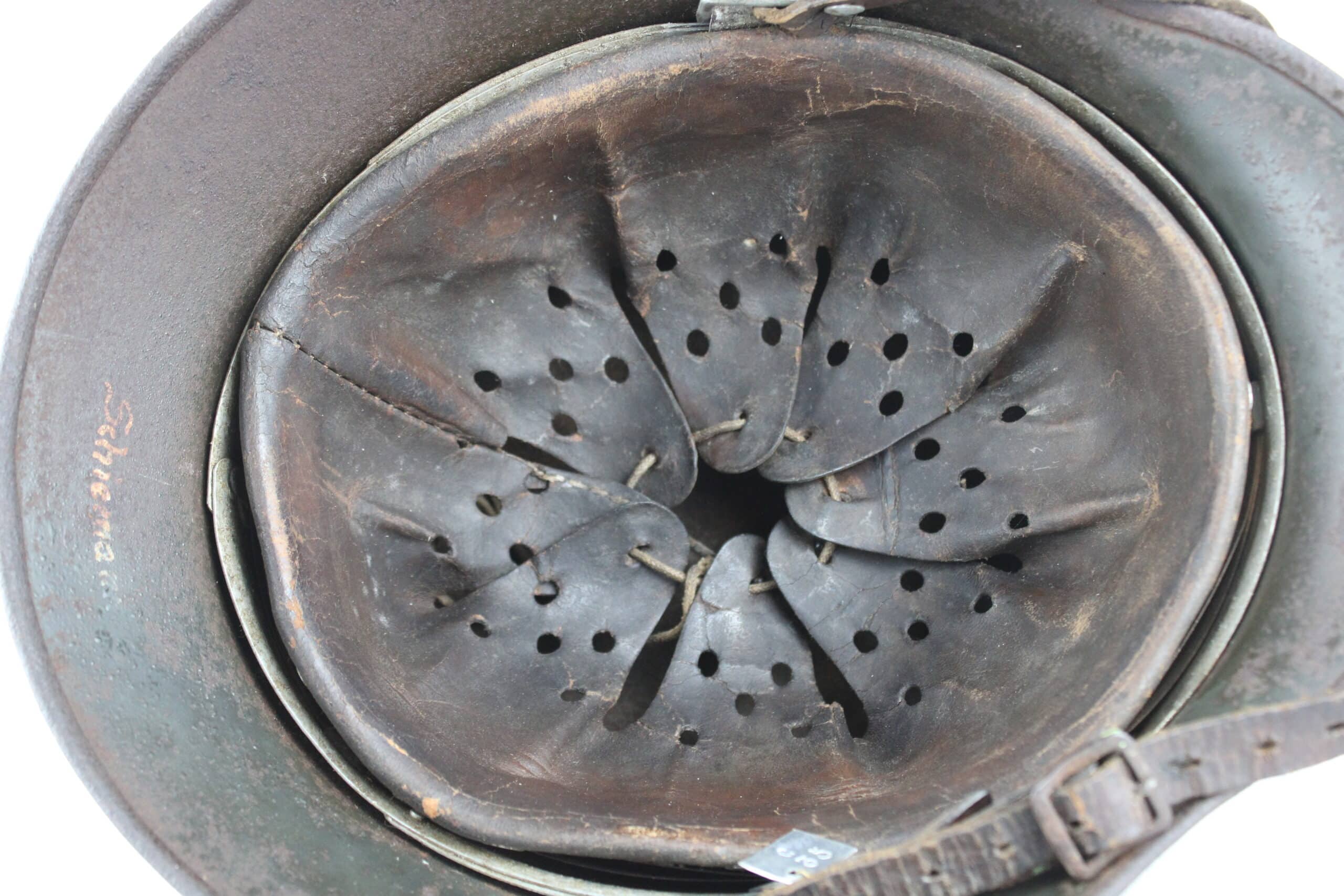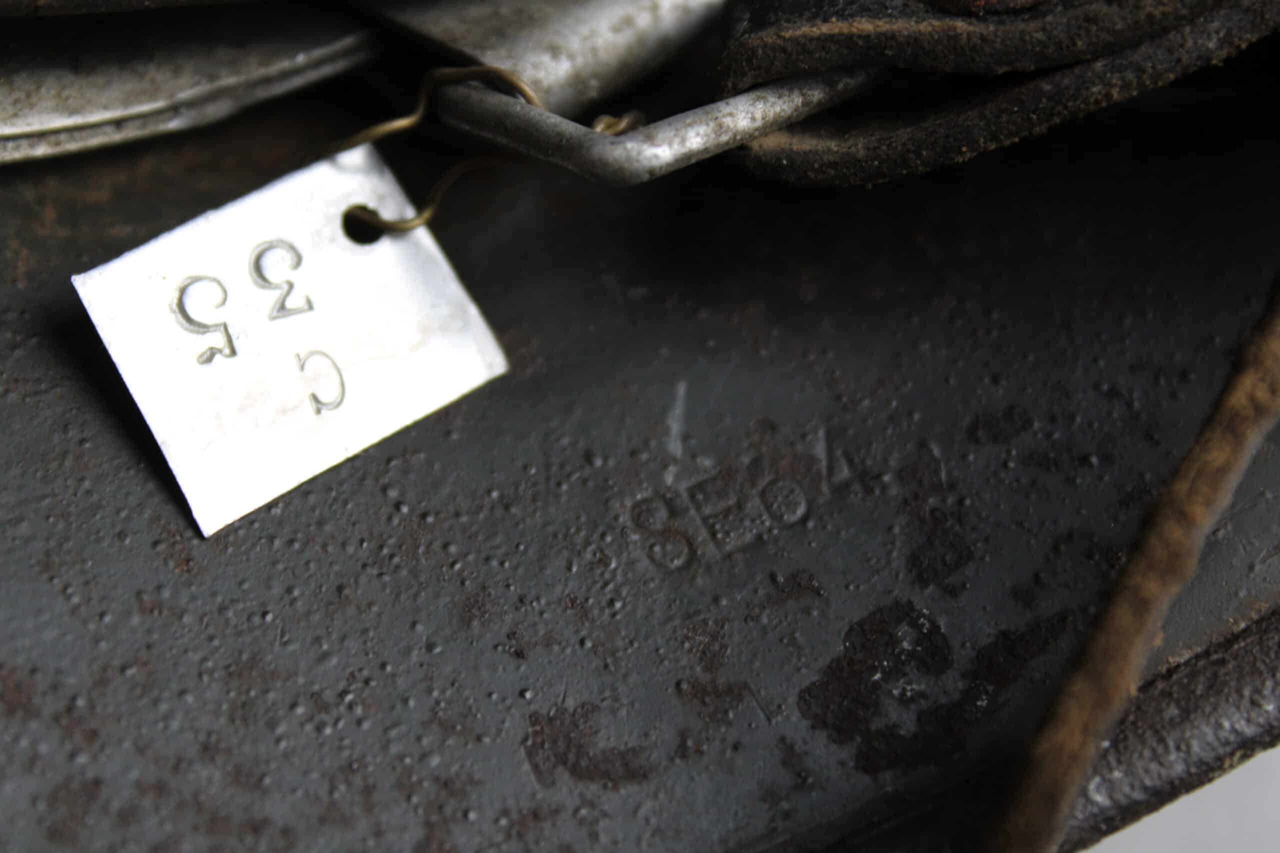 Nom “SCHIEMANN” peint en blanc dans la nuquière, et au pontet de jugulaire est attaché une petite plaque aluminium frappé “C35” qui semble être un numéro d’attribution. Ce genre de petite plaque d’attribution s’est déjà rencontré sur du matériel KM, permettant au soldat d’identifier son casque sur l’étagère.