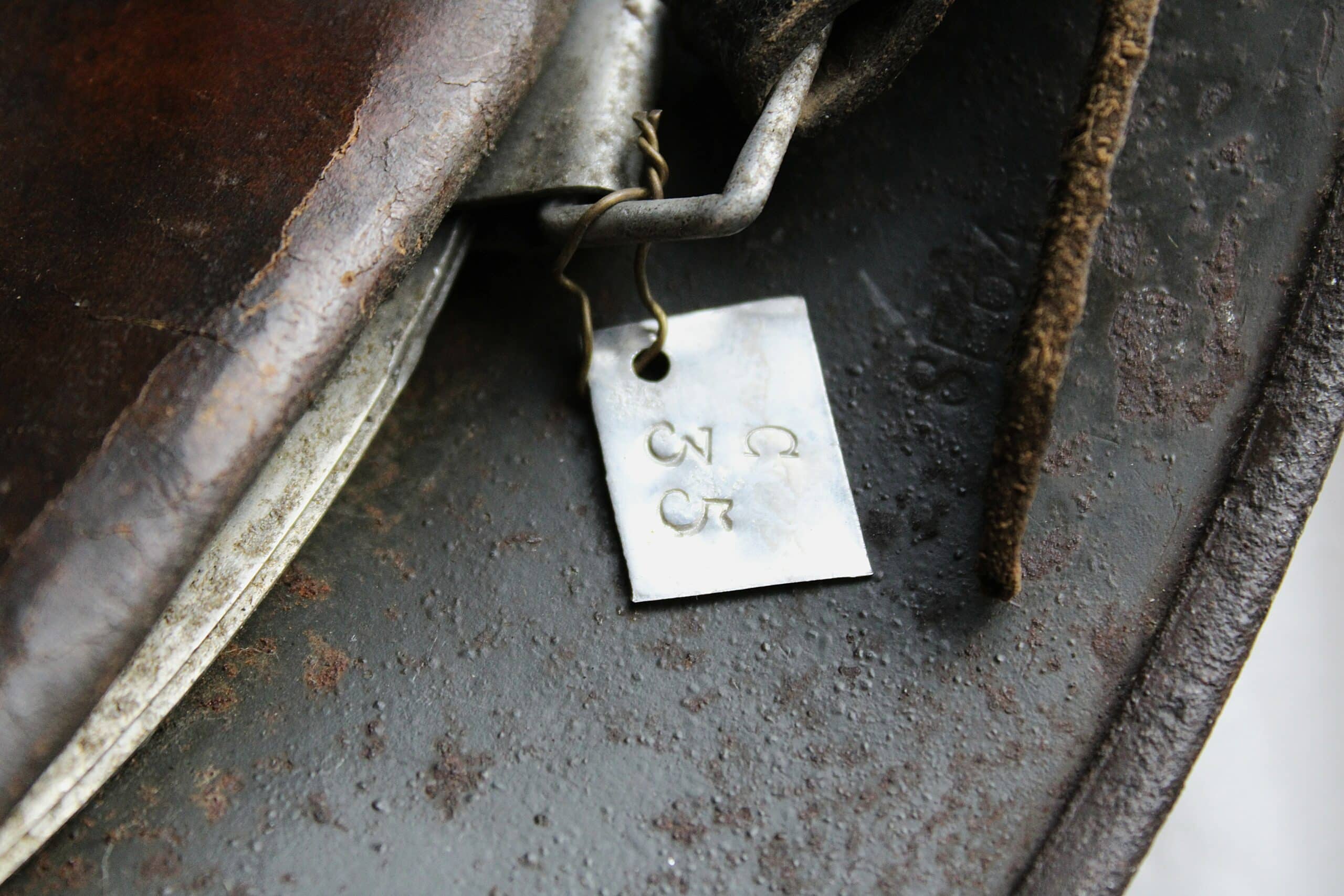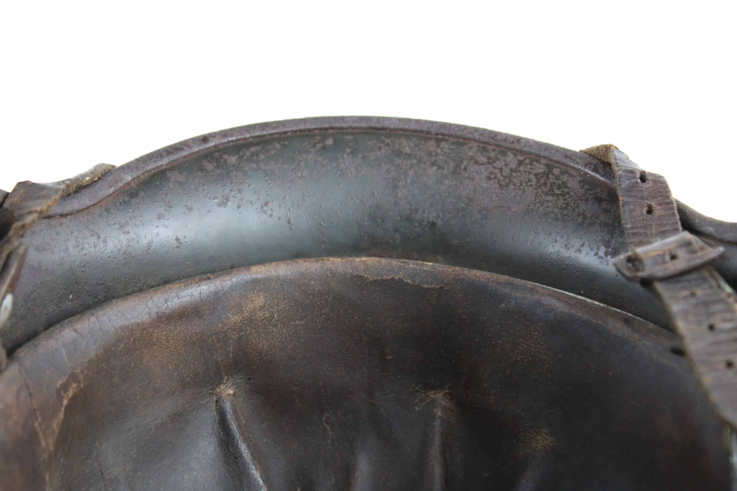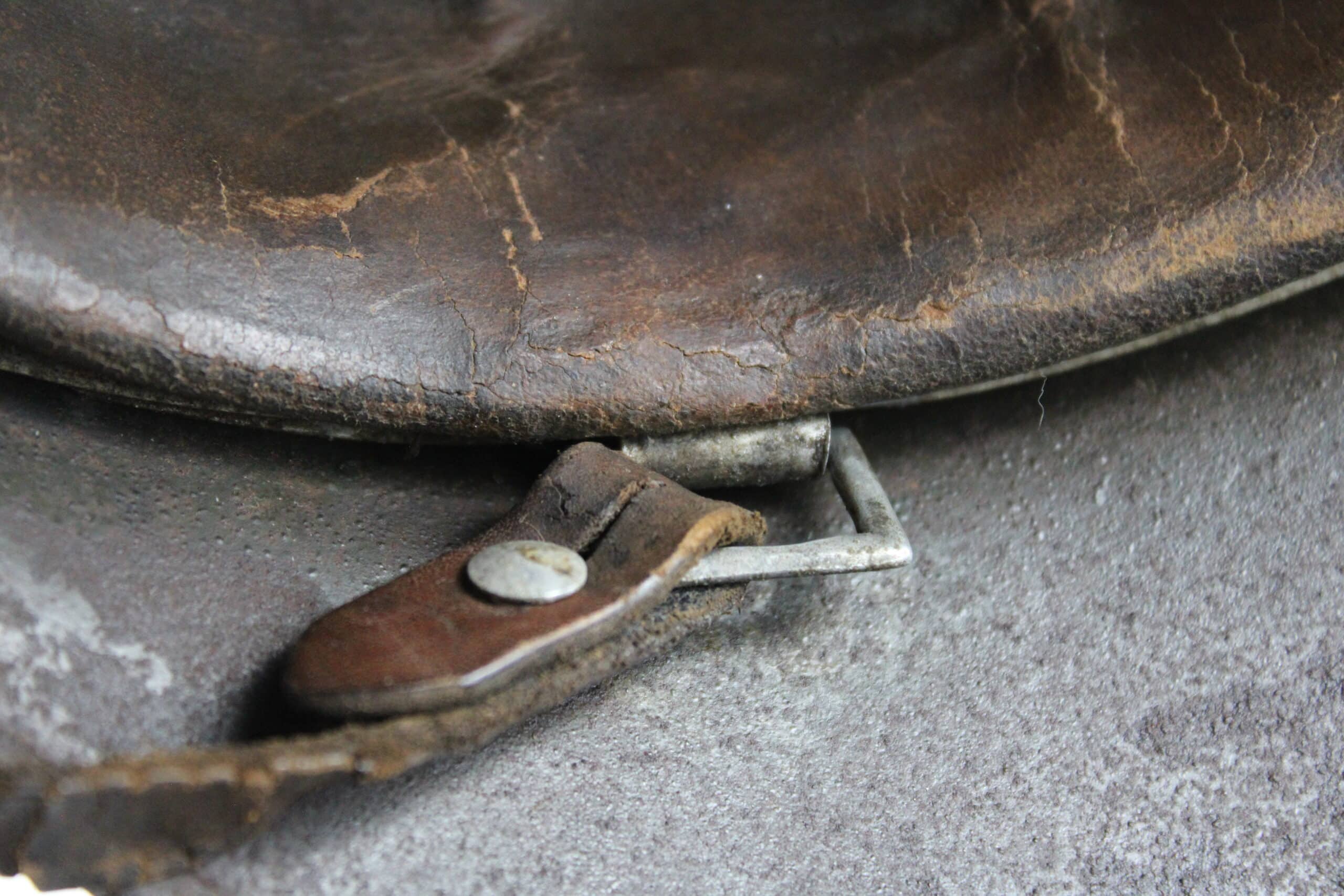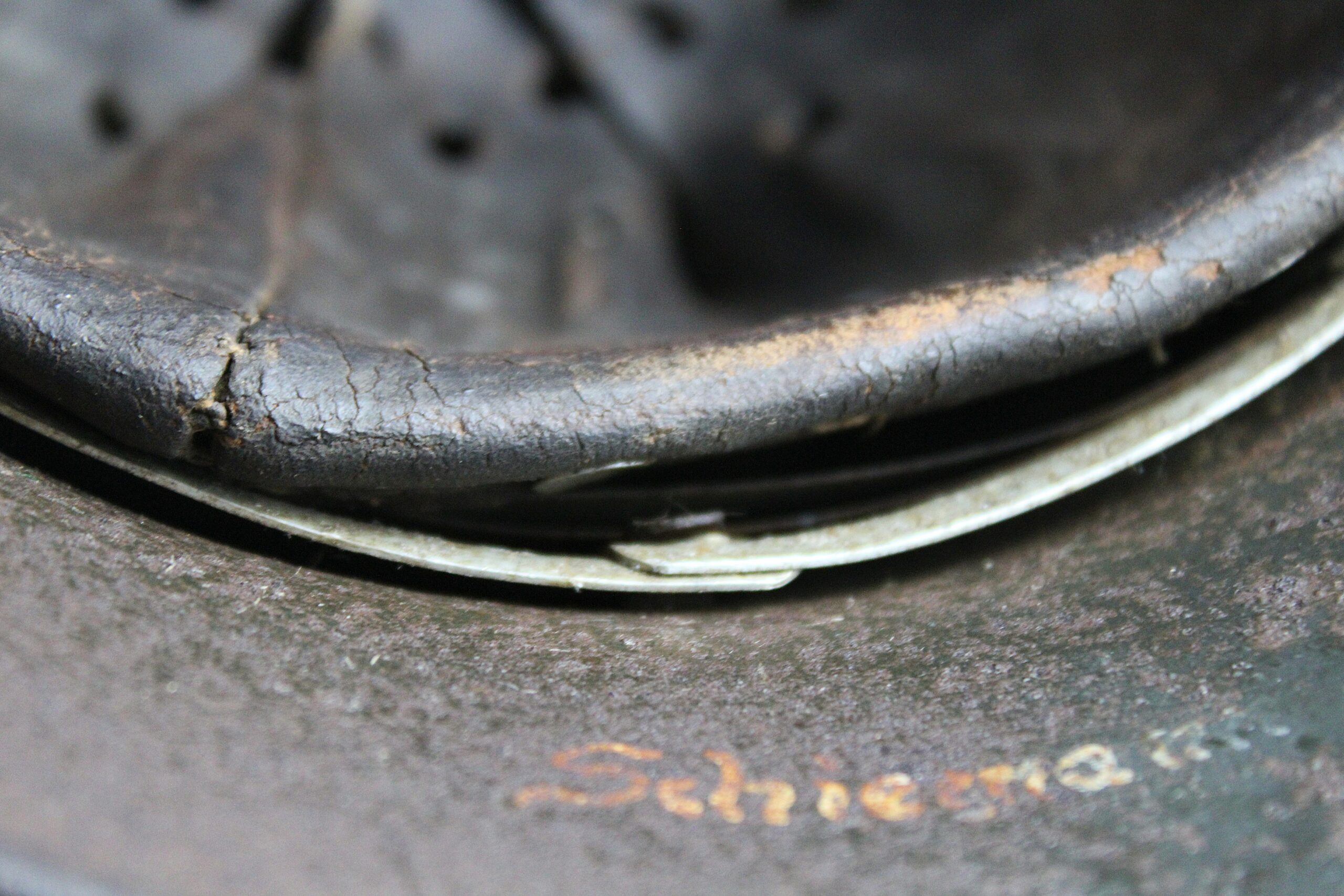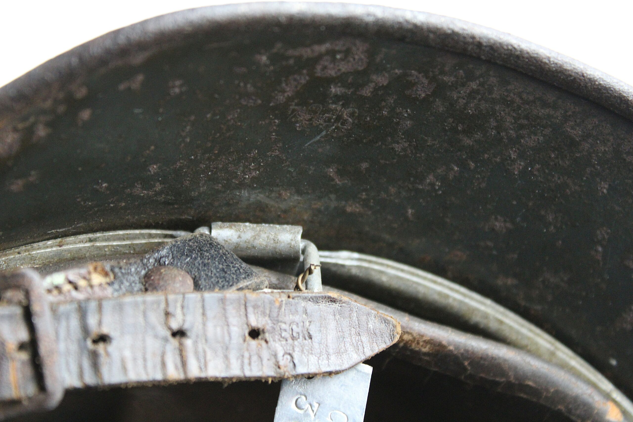 Nom “SCHIEMANN” peint en blanc dans la nuquière, et au pontet de jugulaire est attaché une petite plaque aluminium frappé “C35” qui semble être un numéro d’attribution. Ce genre de petite plaque d’attribution s’est déjà rencontré sur du matériel KM, permettant au soldat d’identifier son casque sur l’étagère.