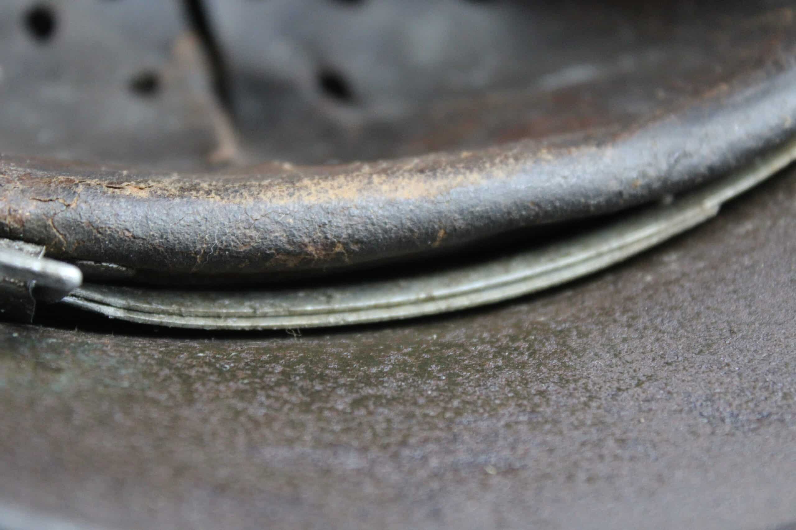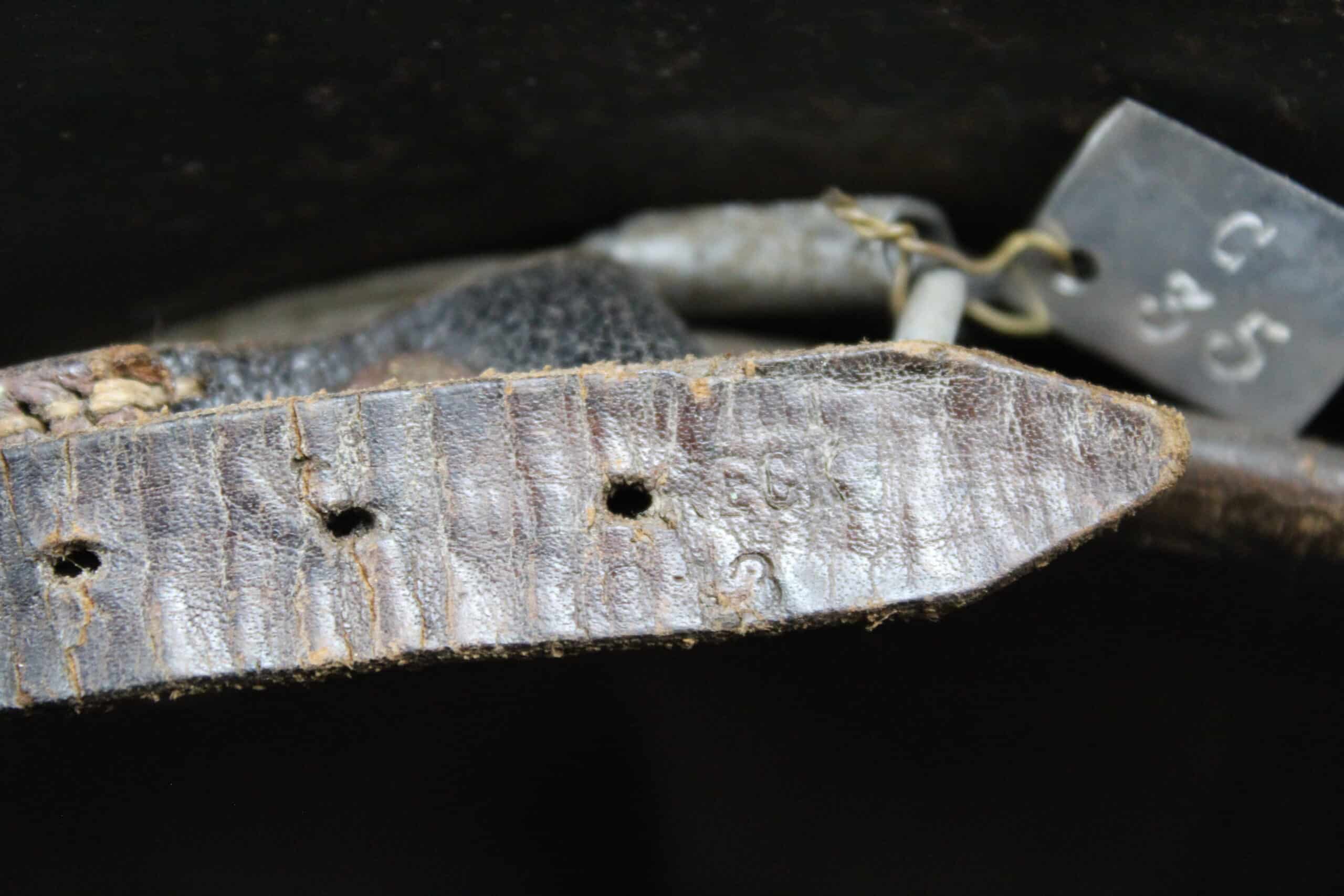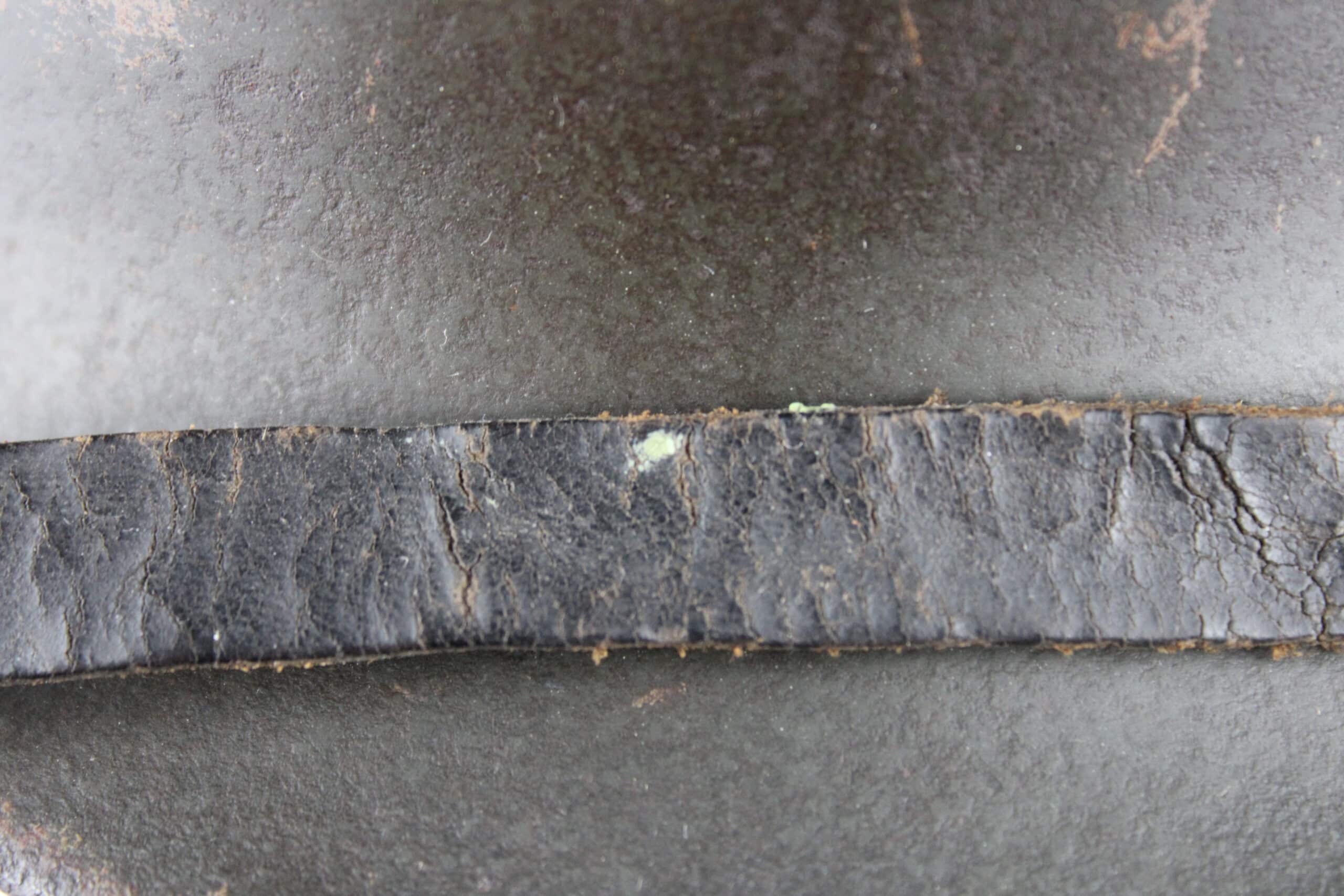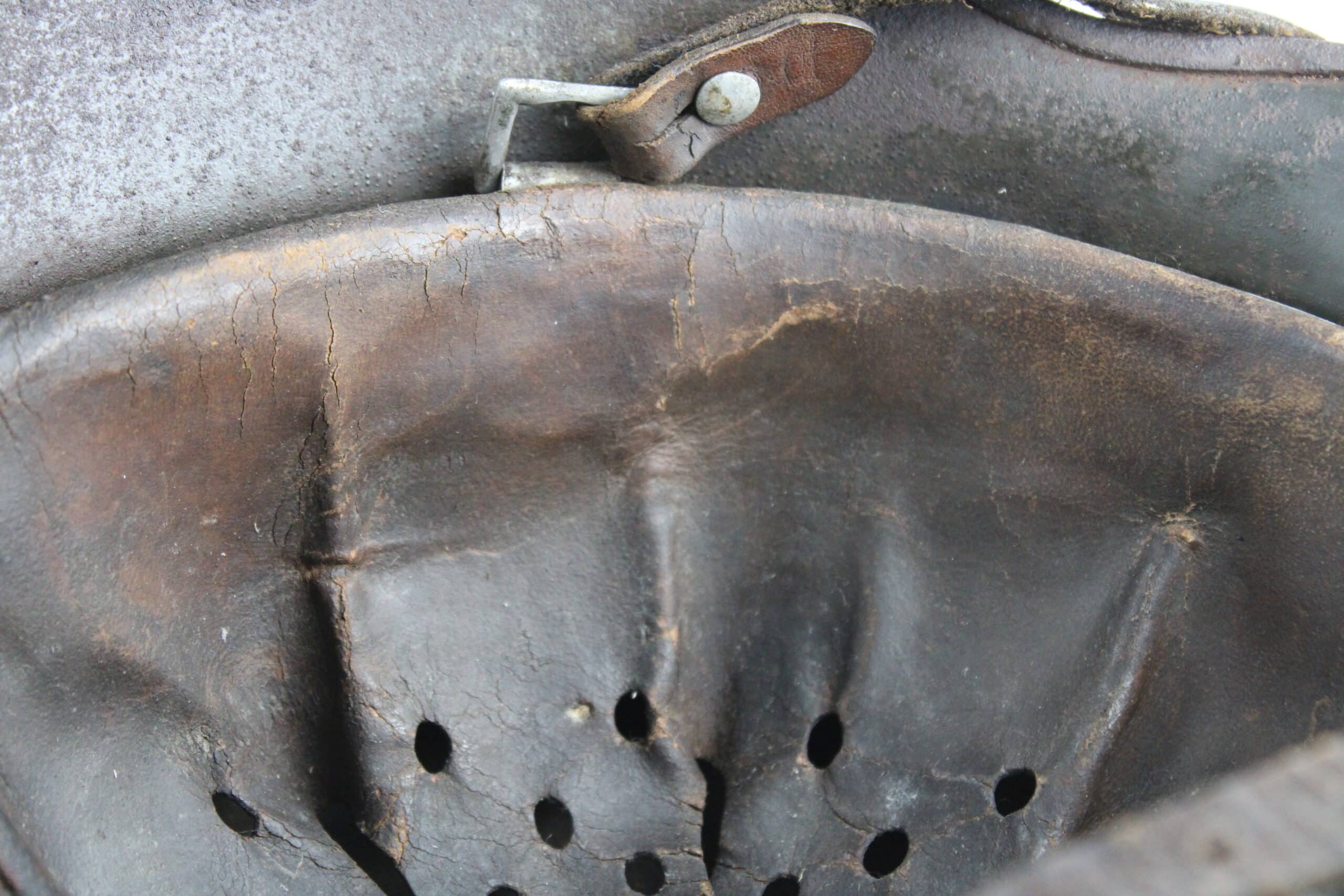 Nom “SCHIEMANN” peint en blanc dans la nuquière, et au pontet de jugulaire est attaché une petite plaque aluminium frappé “C35” qui semble être un numéro d’attribution. Ce genre de petite plaque d’attribution s’est déjà rencontré sur du matériel KM, permettant au soldat d’identifier son casque sur l’étagère.