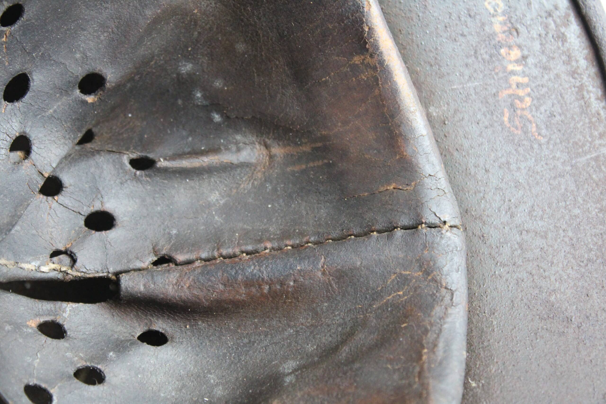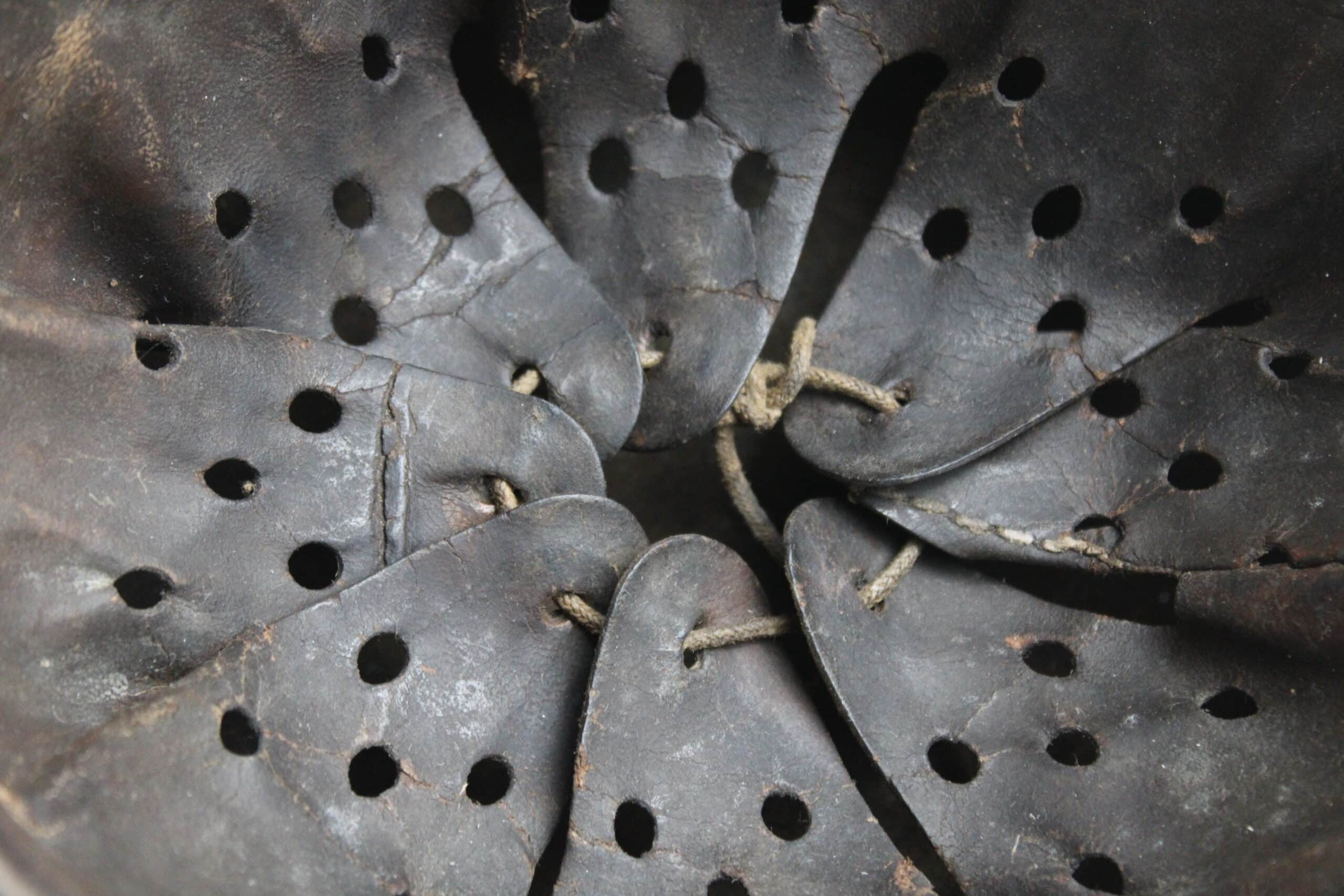 Cuir en place monté sur un cerclage aluminium renforcé, l’intérieur est dans son jus d’usage conforme à l’intégralité de la pièce, cordon de serrage en place