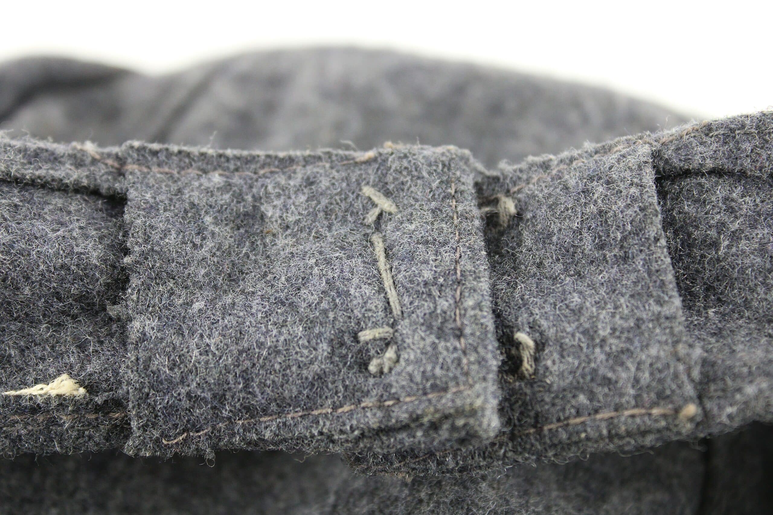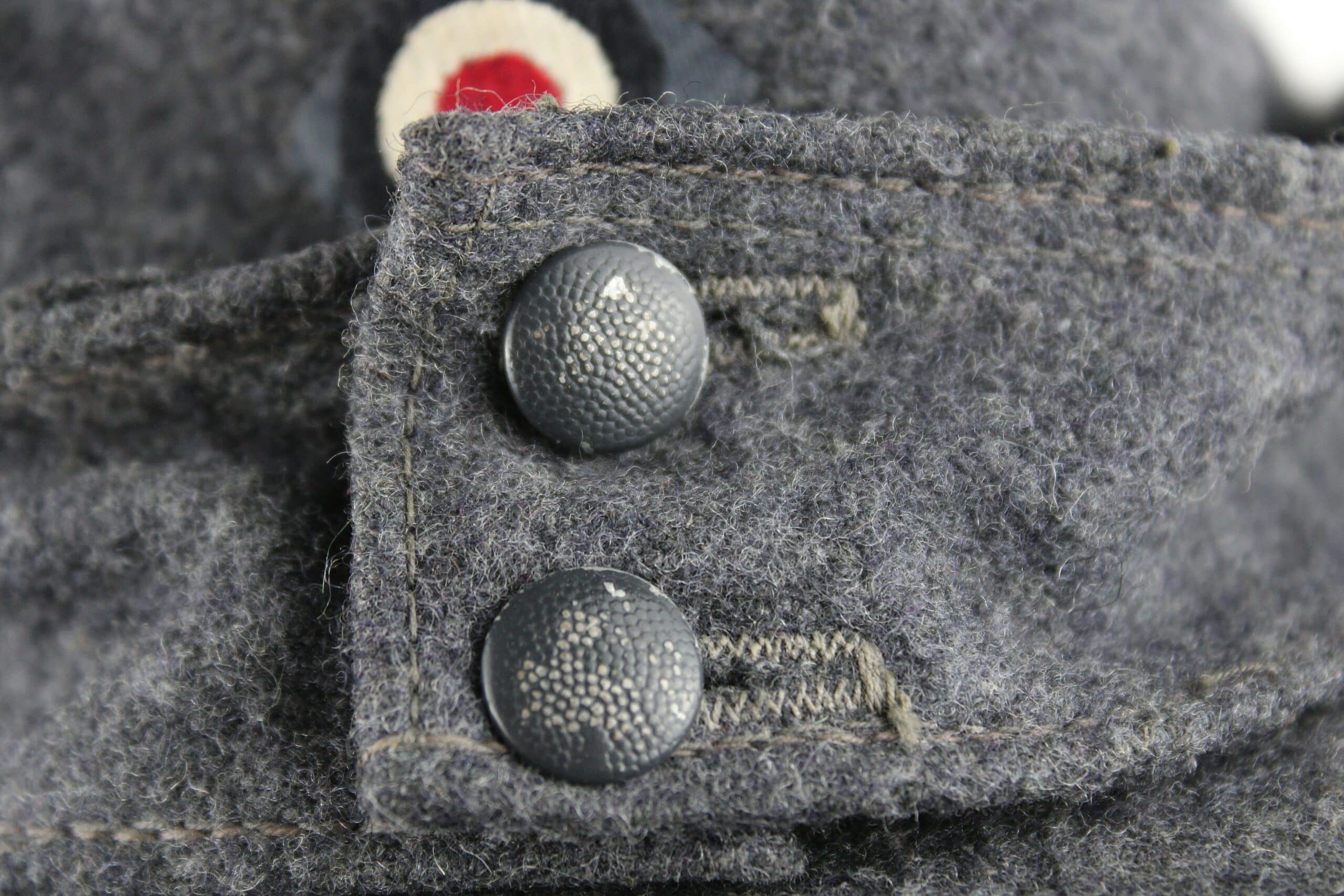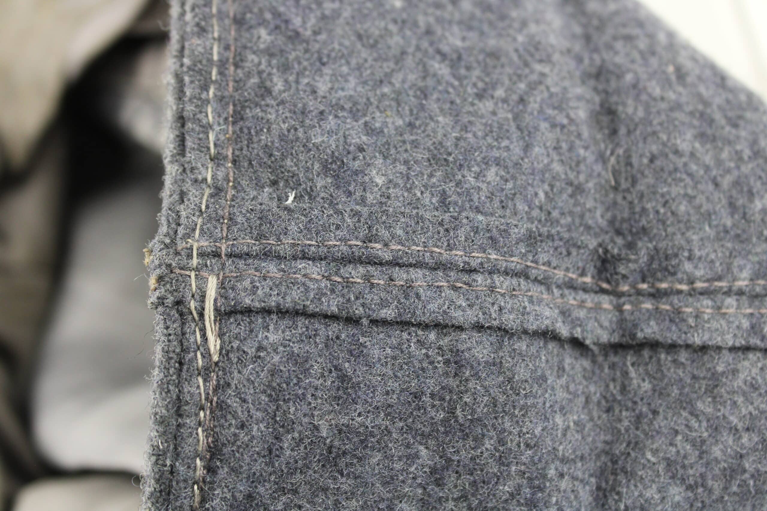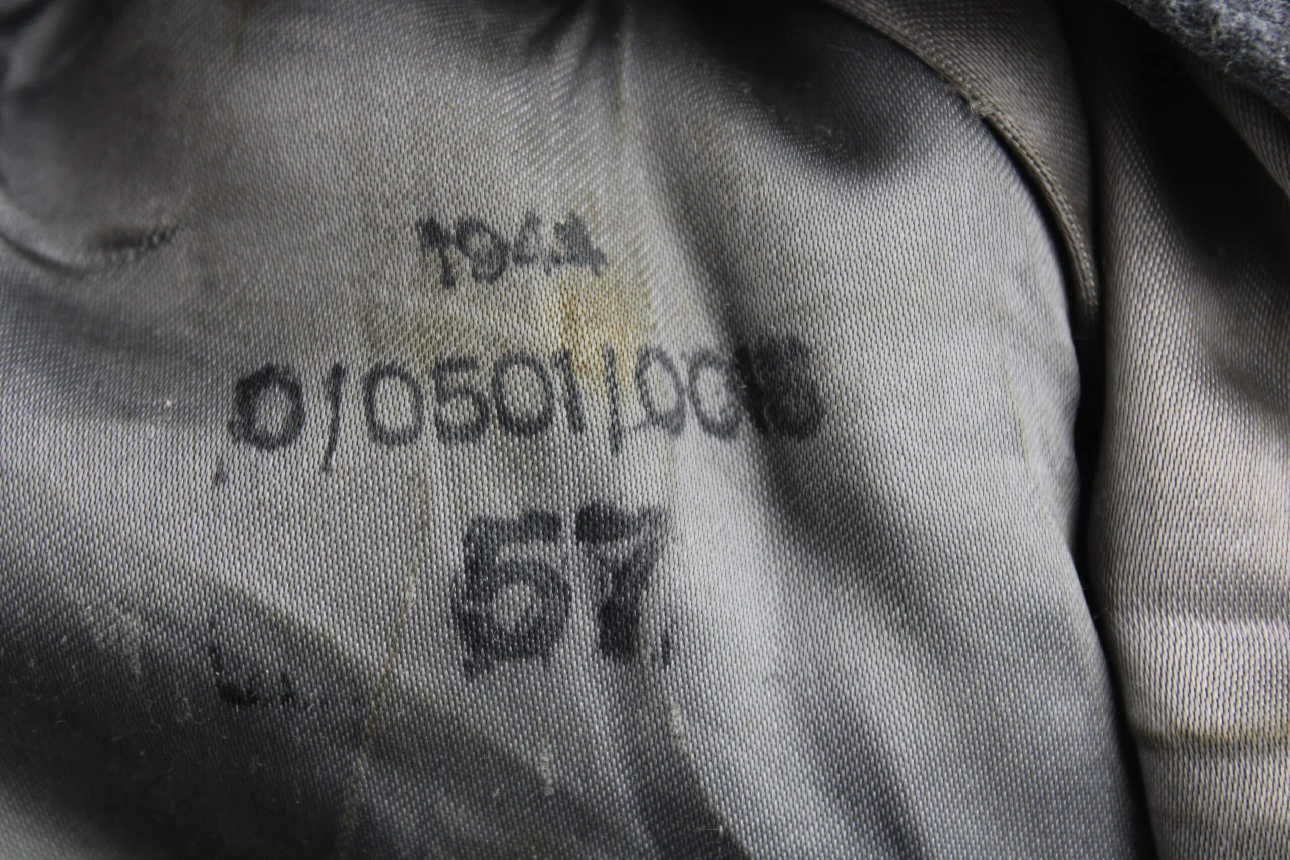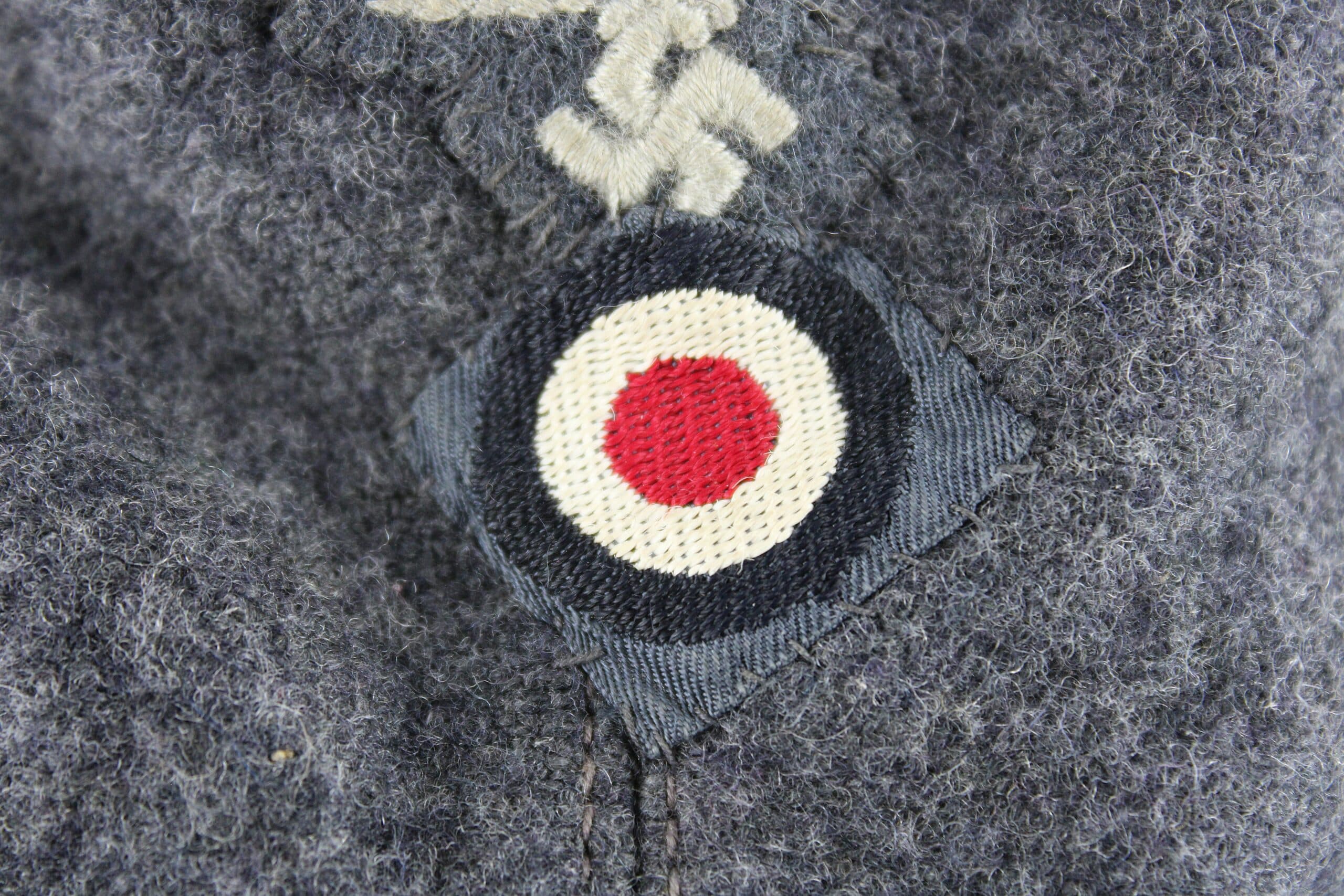 Drap ortie bleu en parfait état sans trou ni manque, rabat fermant à l’avant par deux boutons peints en bleu, doublure en rayonne spécifique du matériel tardif, Aigle de luftwaffe brodé avec cocarde de fabrication bevo cousus main et monté d’origine. Ce mélange de type d’insigne est courant sur les M43 luftwaffe.