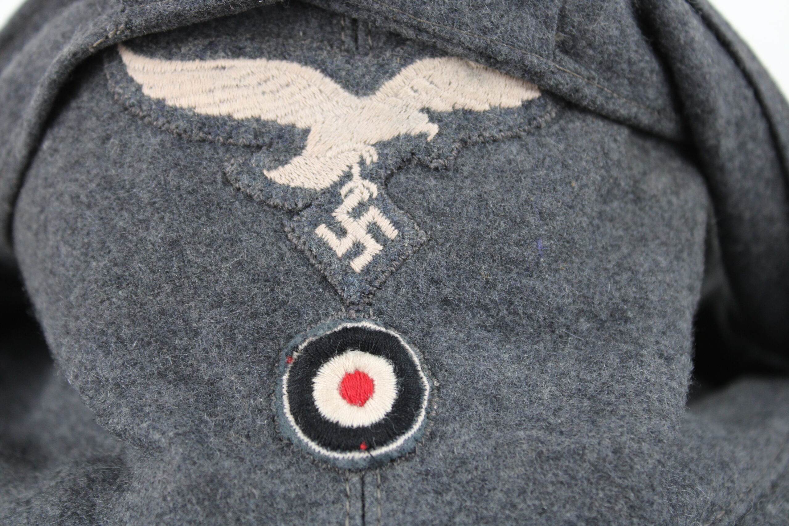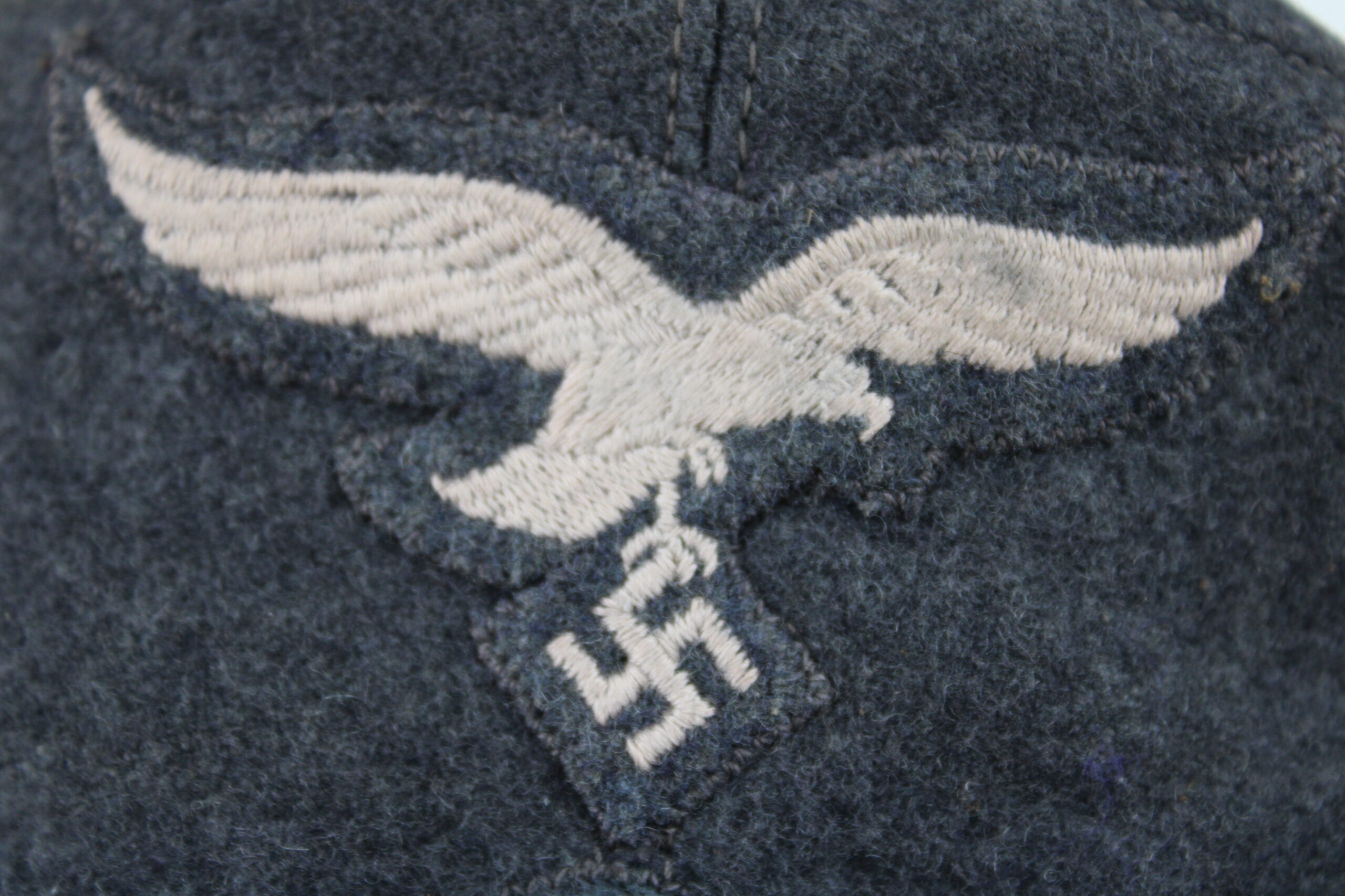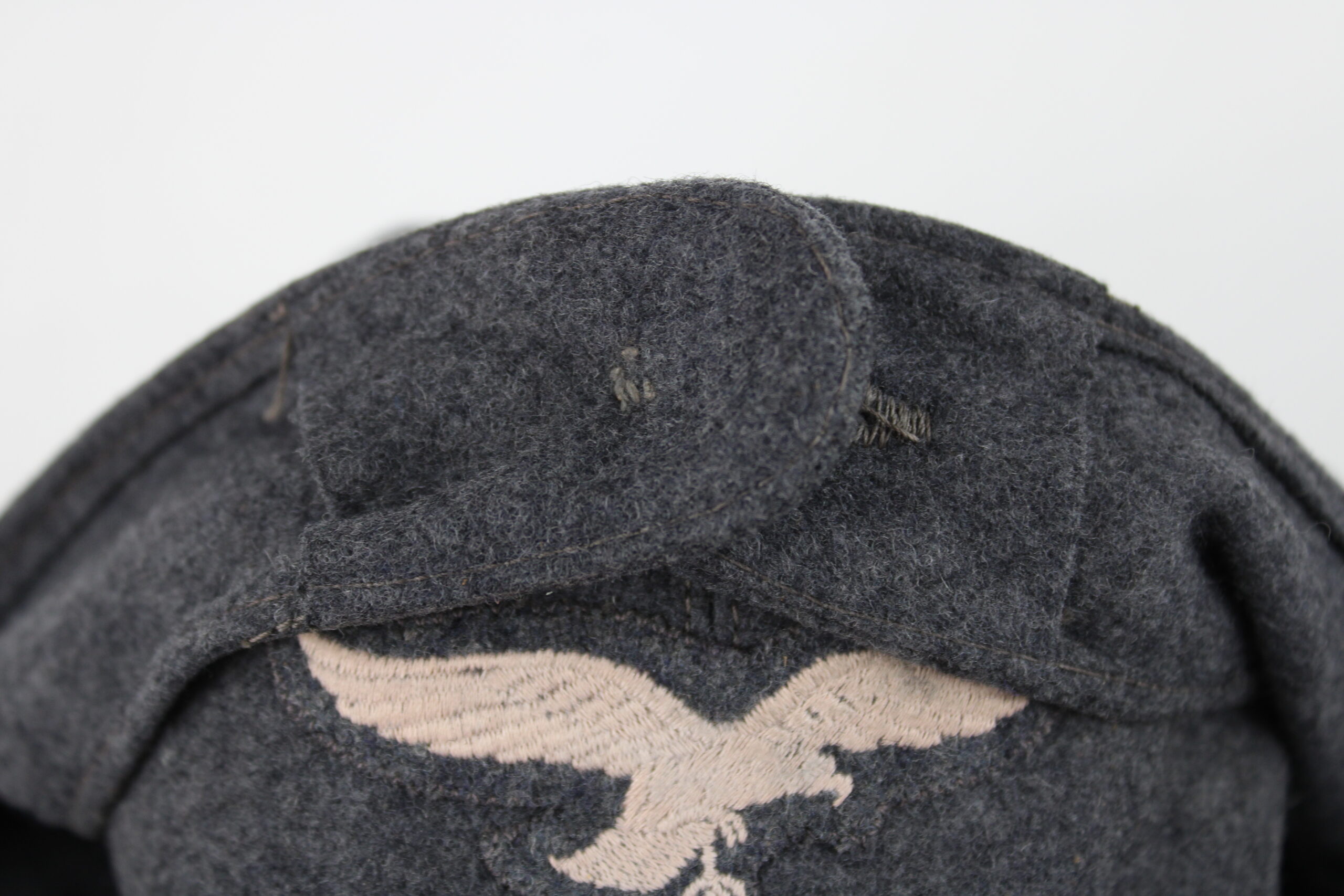 Drap bleu en parfait état, rabat fermant à l’avant par un bouton peints en bleu et cousu d’origine, doublure en rayonne fine de qualité, Aigle de luftwaffe brodé avec cocarde cousus zig-zag finement et monté d’origine.