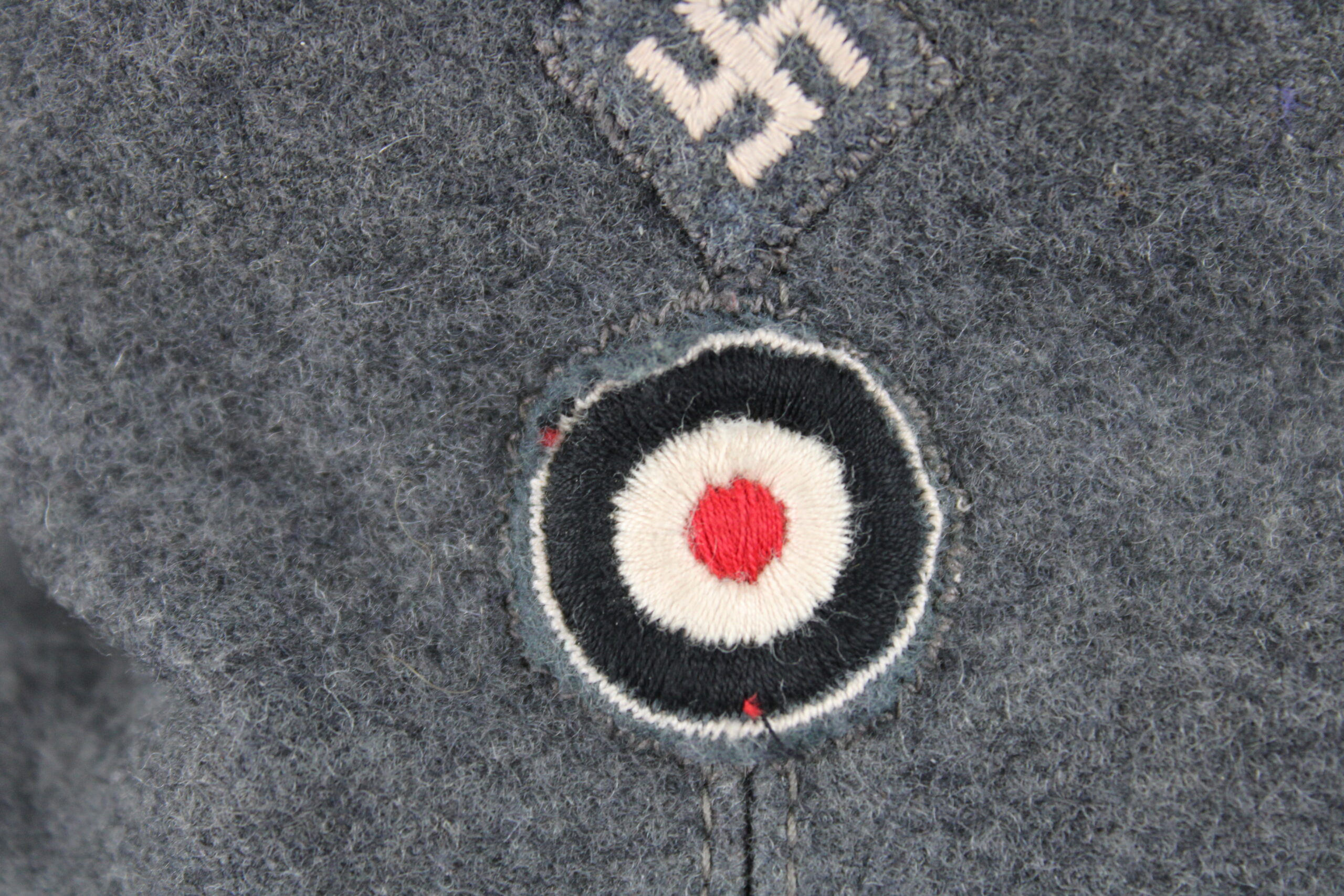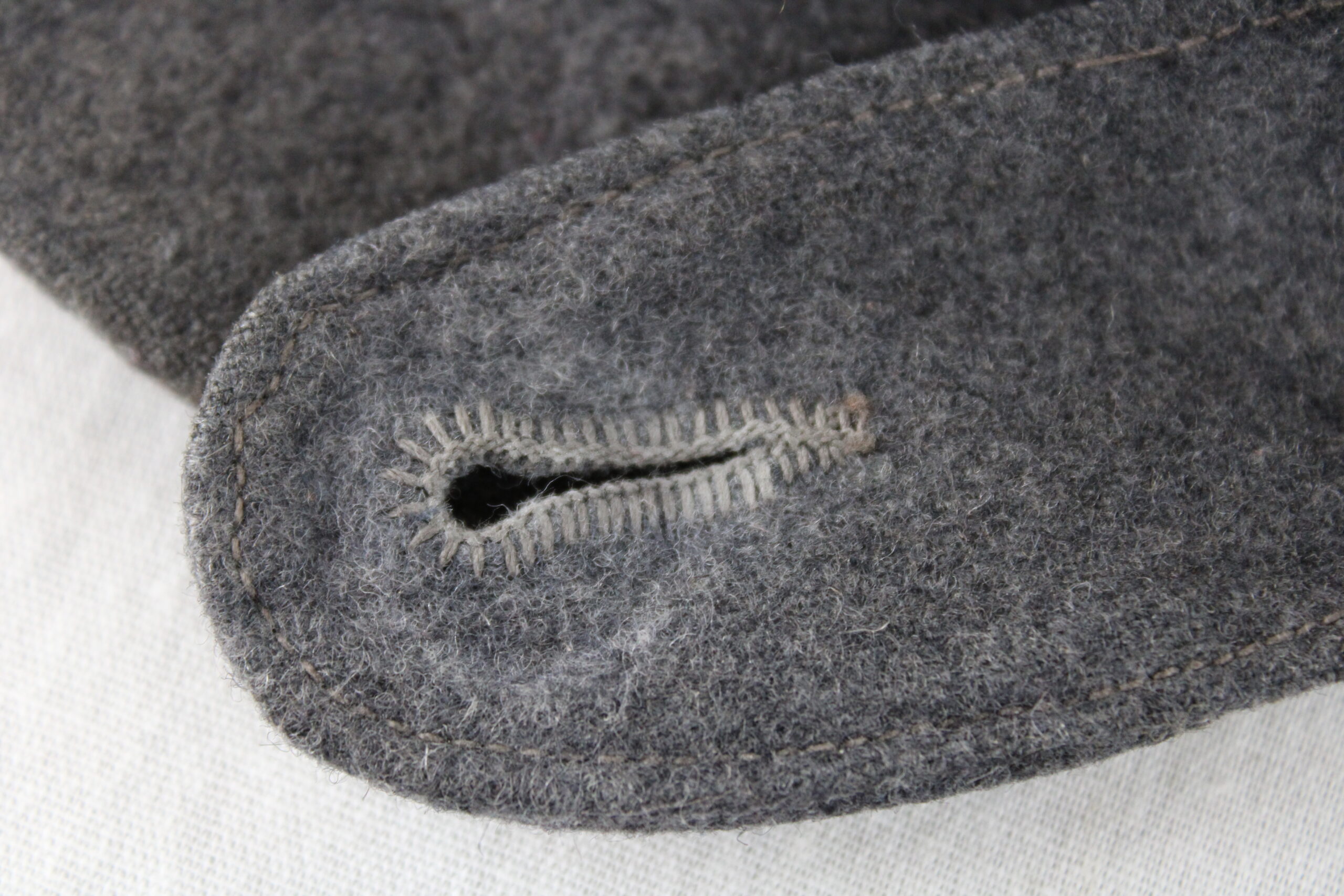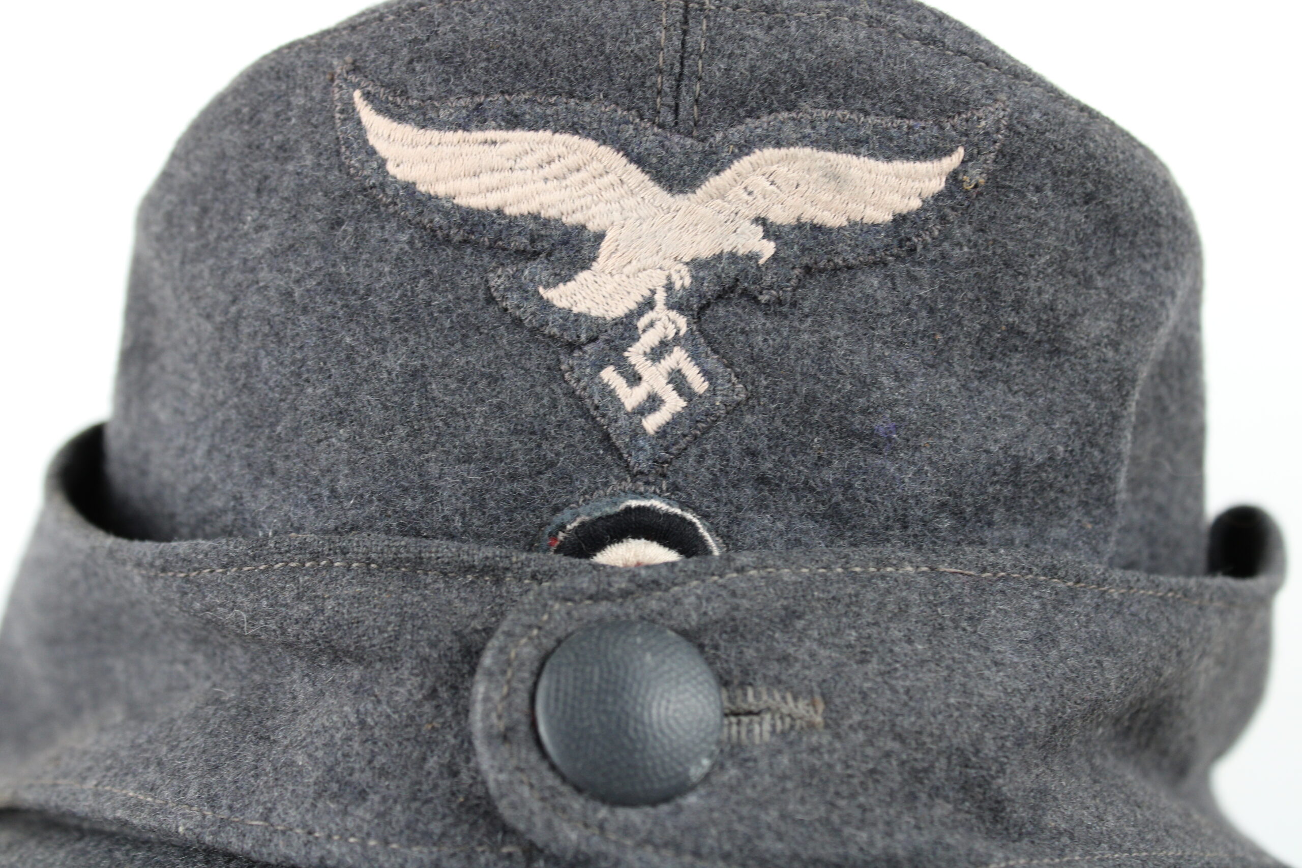 Drap bleu en parfait état, rabat fermant à l’avant par un bouton peints en bleu et cousu d’origine, doublure en rayonne fine de qualité, Aigle de luftwaffe brodé avec cocarde cousus zig-zag finement et monté d’origine.