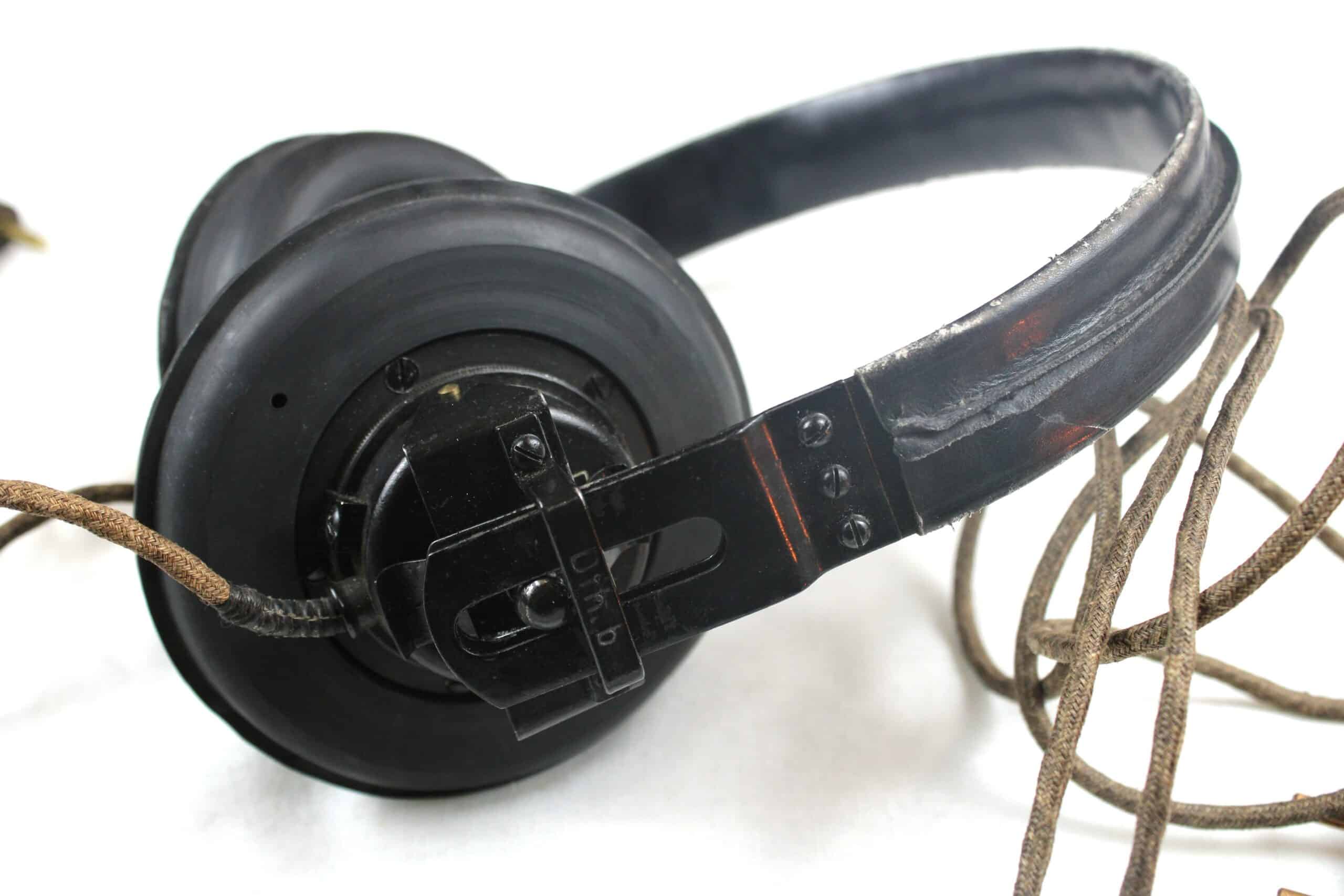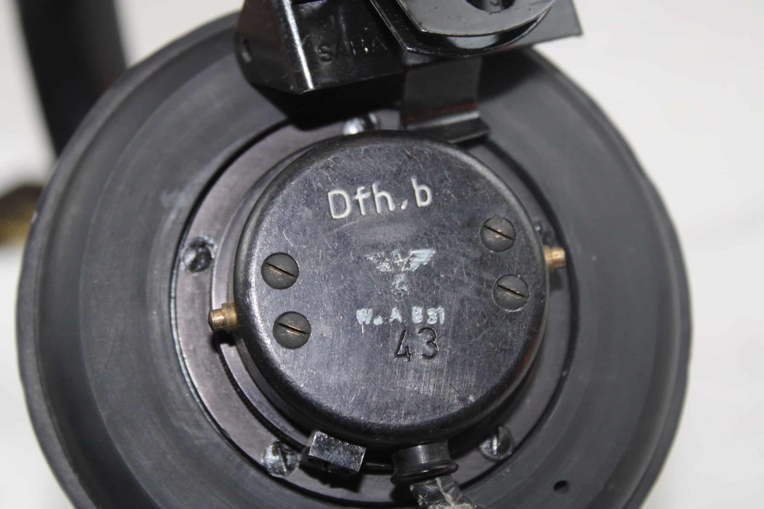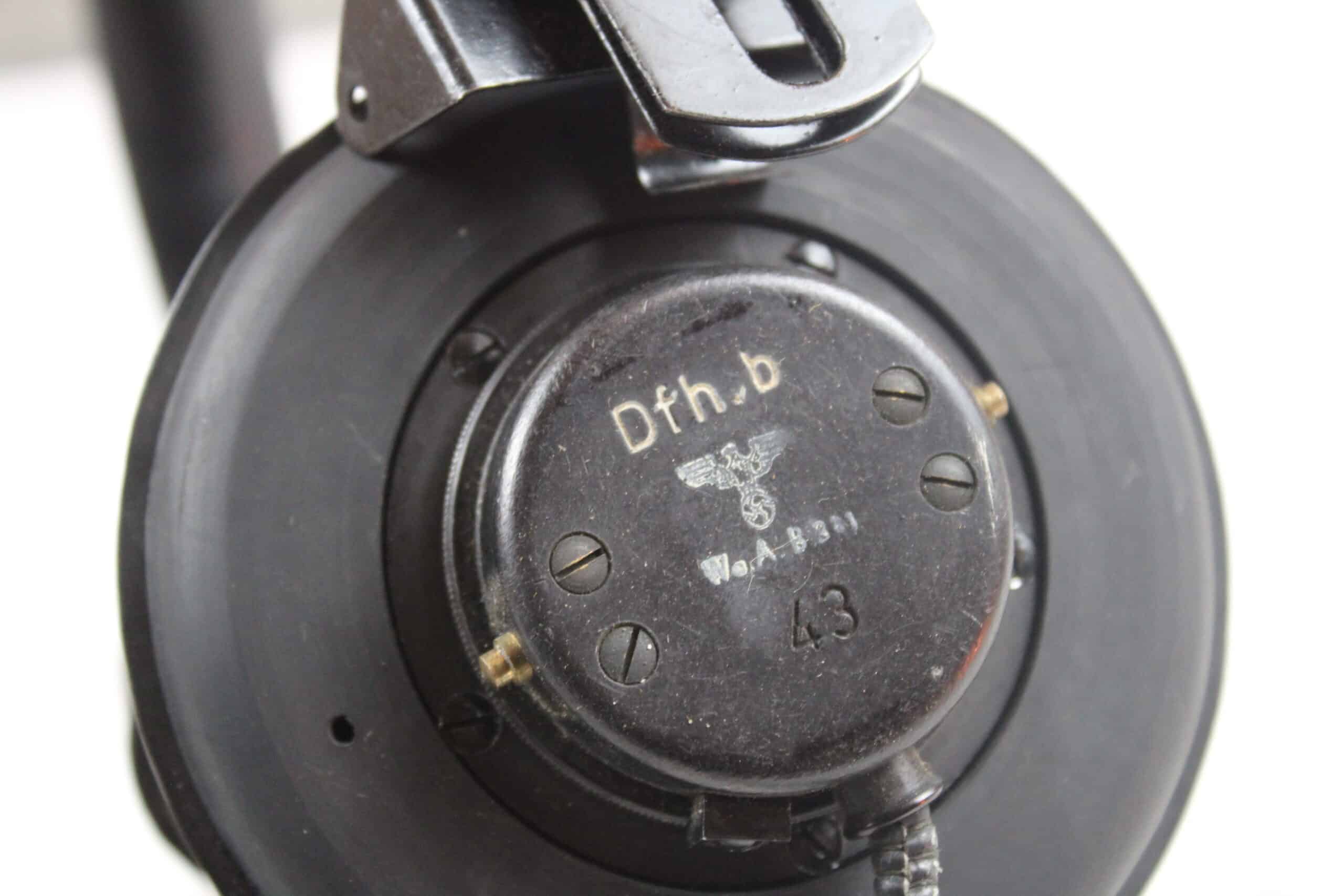 Un casque écouteurs spécifique modèle Dfh.B fabrication SABA bien marqué et daté de 1943 avec ses WaffenAmt, les parties métalliques sont peintes en noir , arceau recouvert de son cuir, visserie entièrement présente, se démonte sans difficulté. Cordon présent dans toute sa longueur et prise en très bon état. Les coussinets sont en revanche des repro de fabrication américaine.