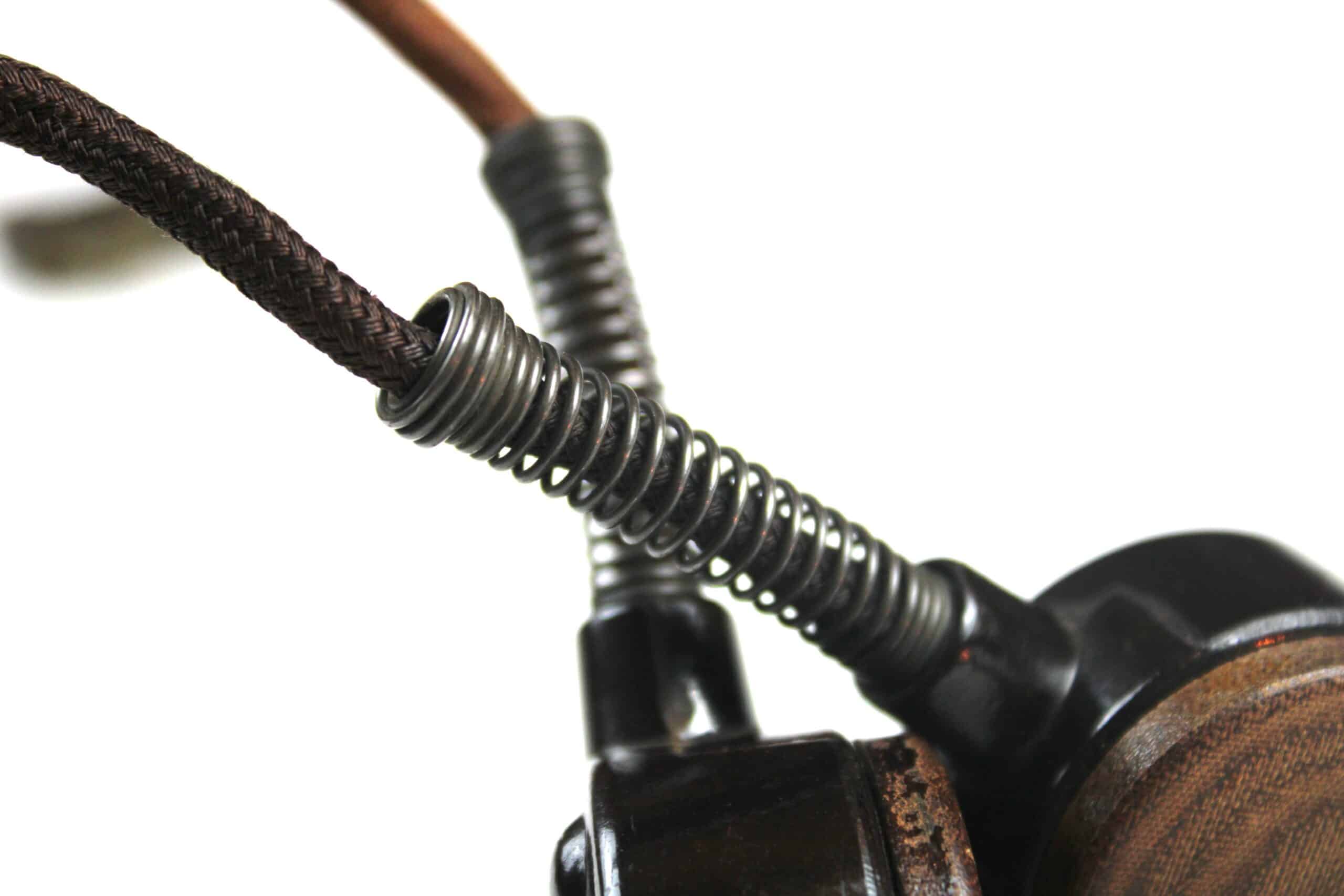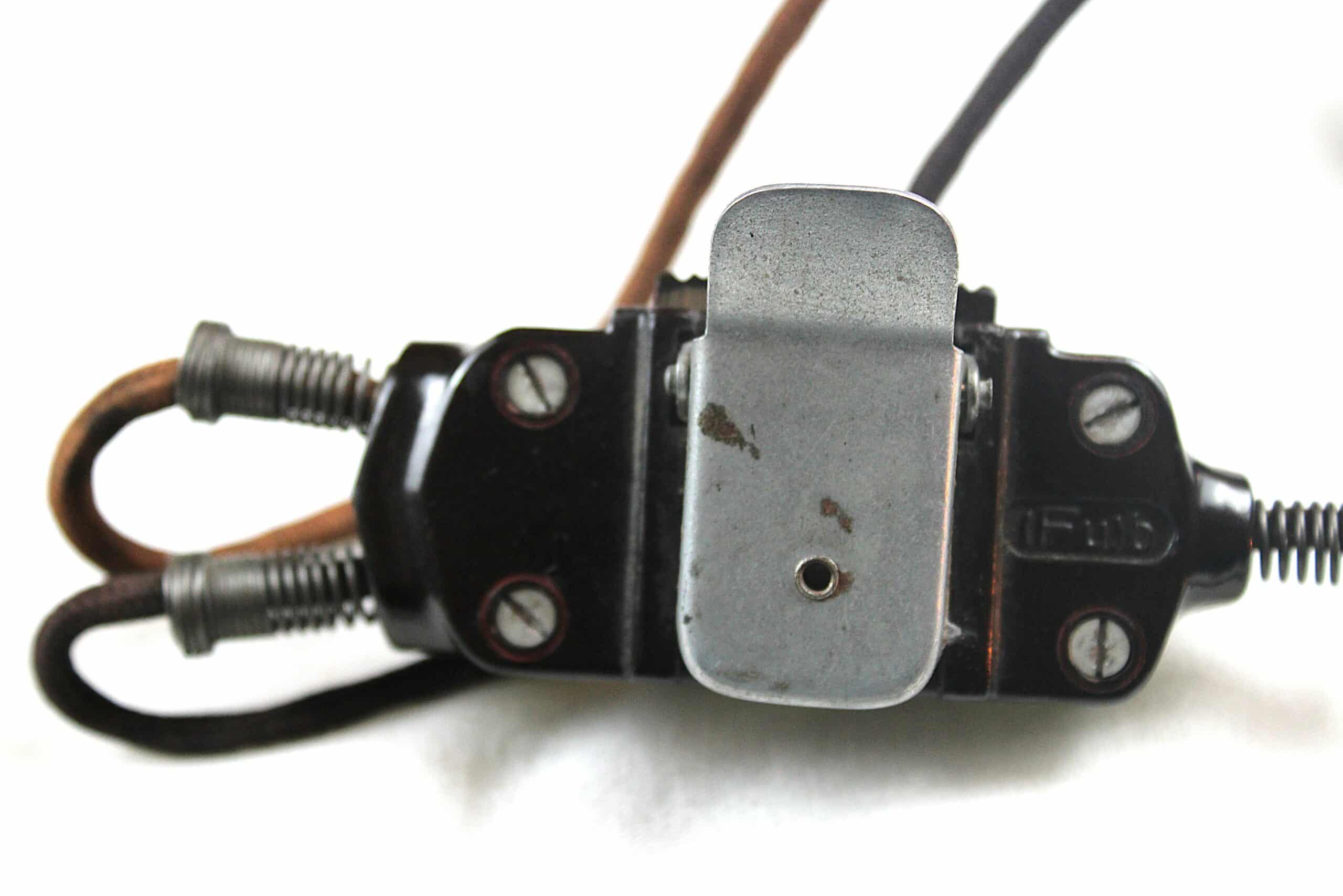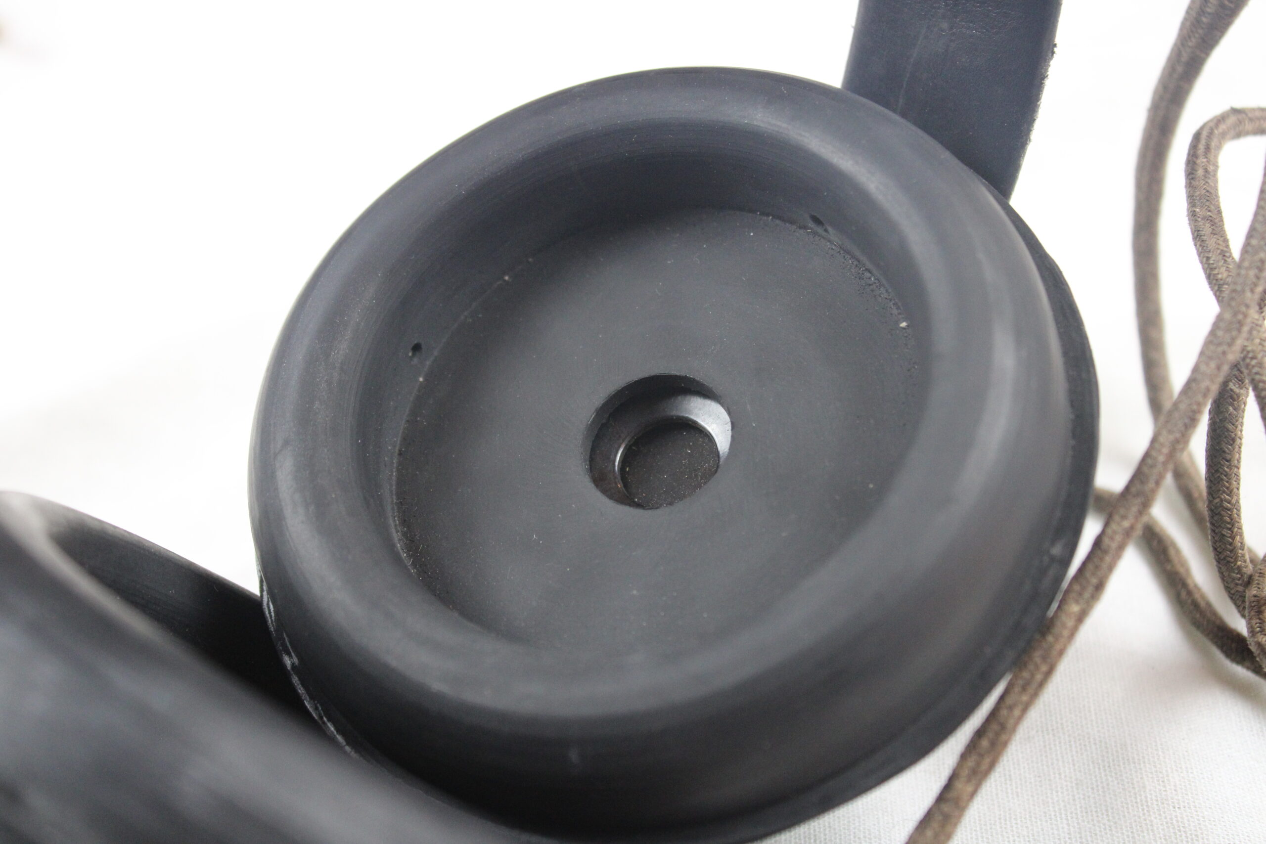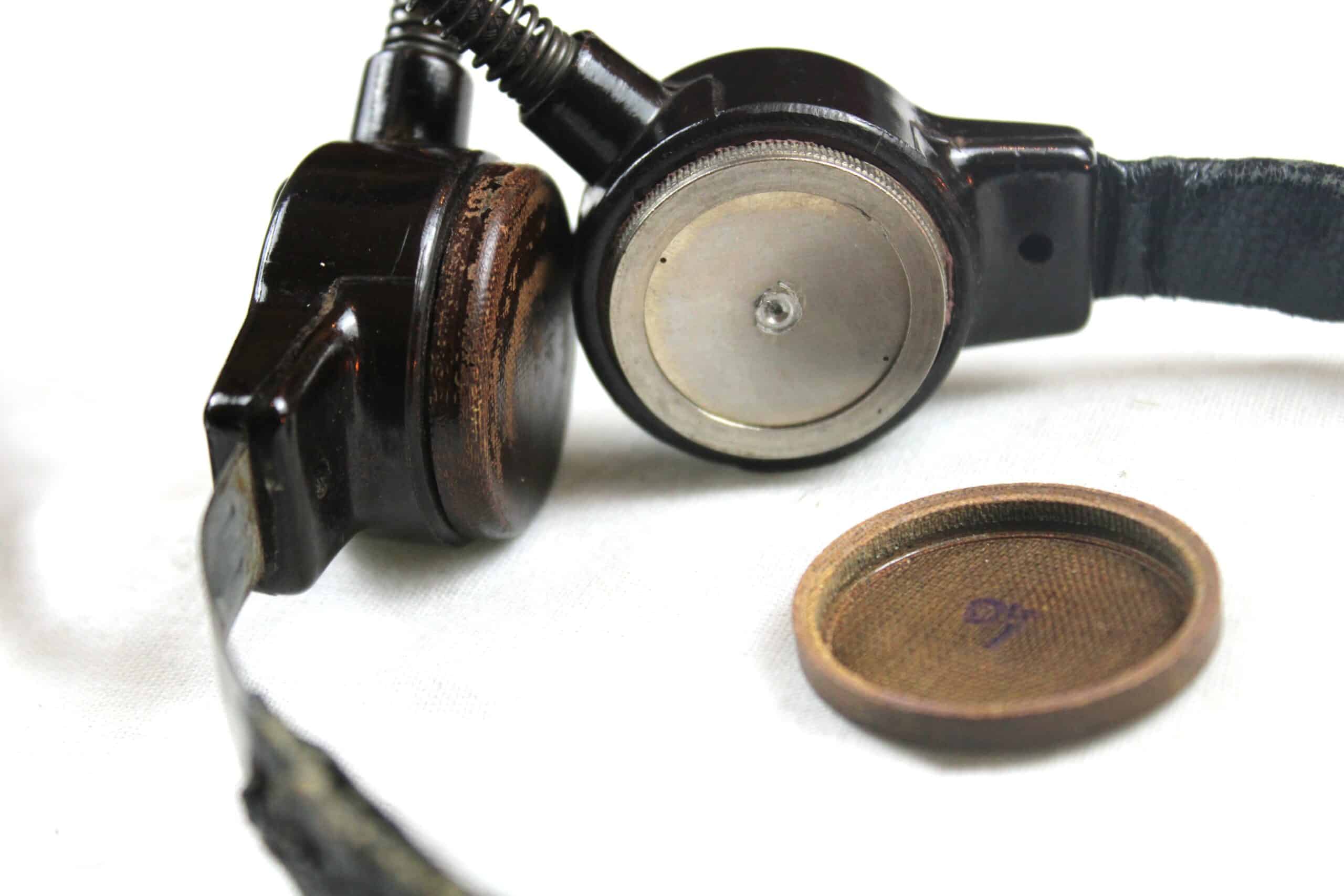 Un laryngophone Fu.b complet, arceau avec son cuir, les bakélites rouge sont en très bon état et sans casse , visserie complète, commutateur parfaitement fonctionnel, cordon dans toute sa longueur avec sa prise en parfait état, bague marqué Kmf.B sur le cordon. A noter un capuchon qui ne tient pas en place mais est bien présent.