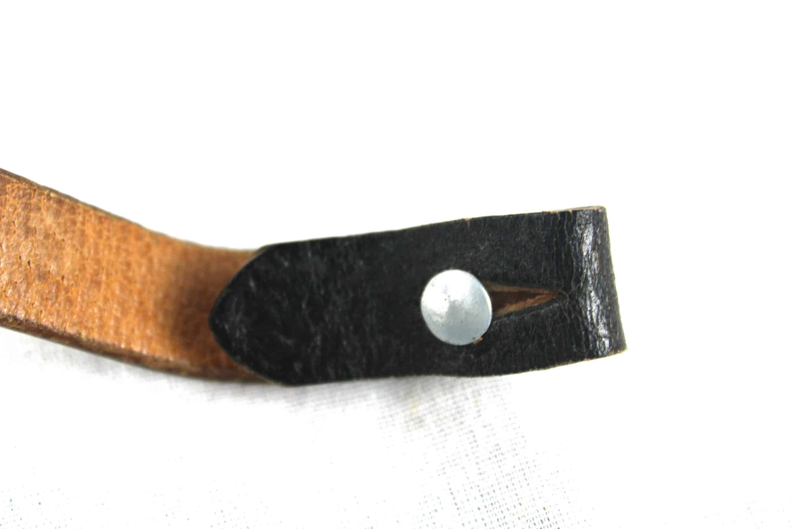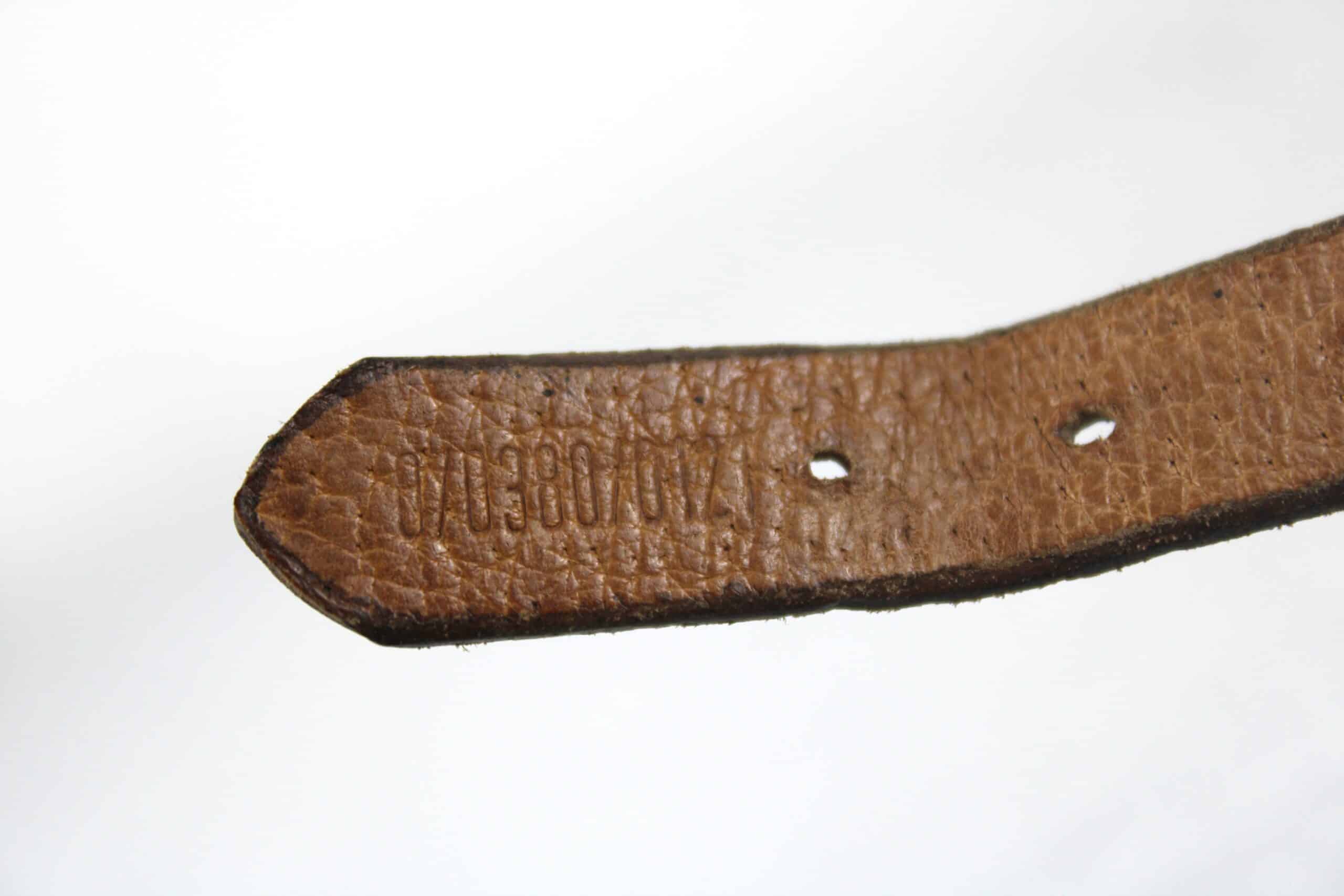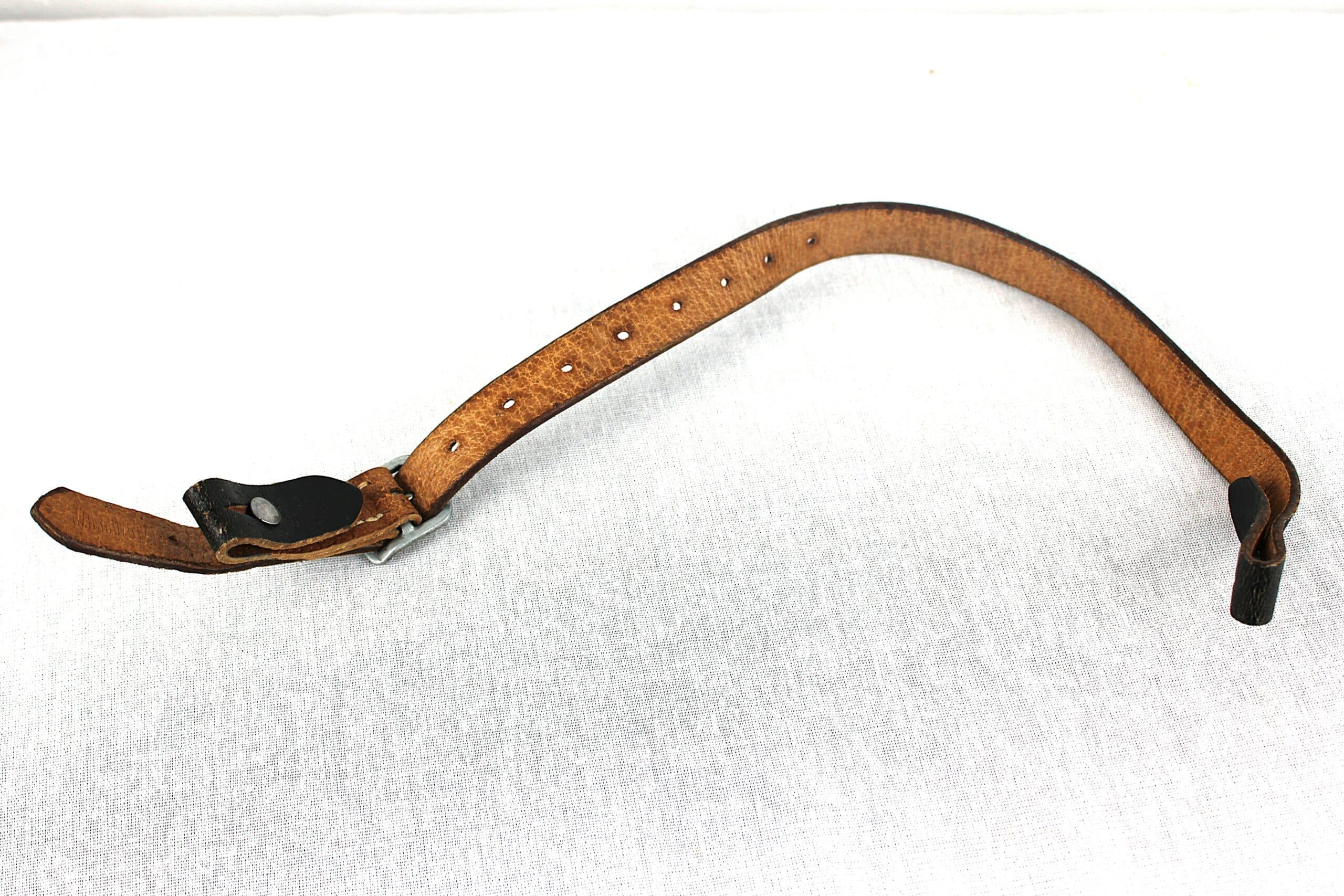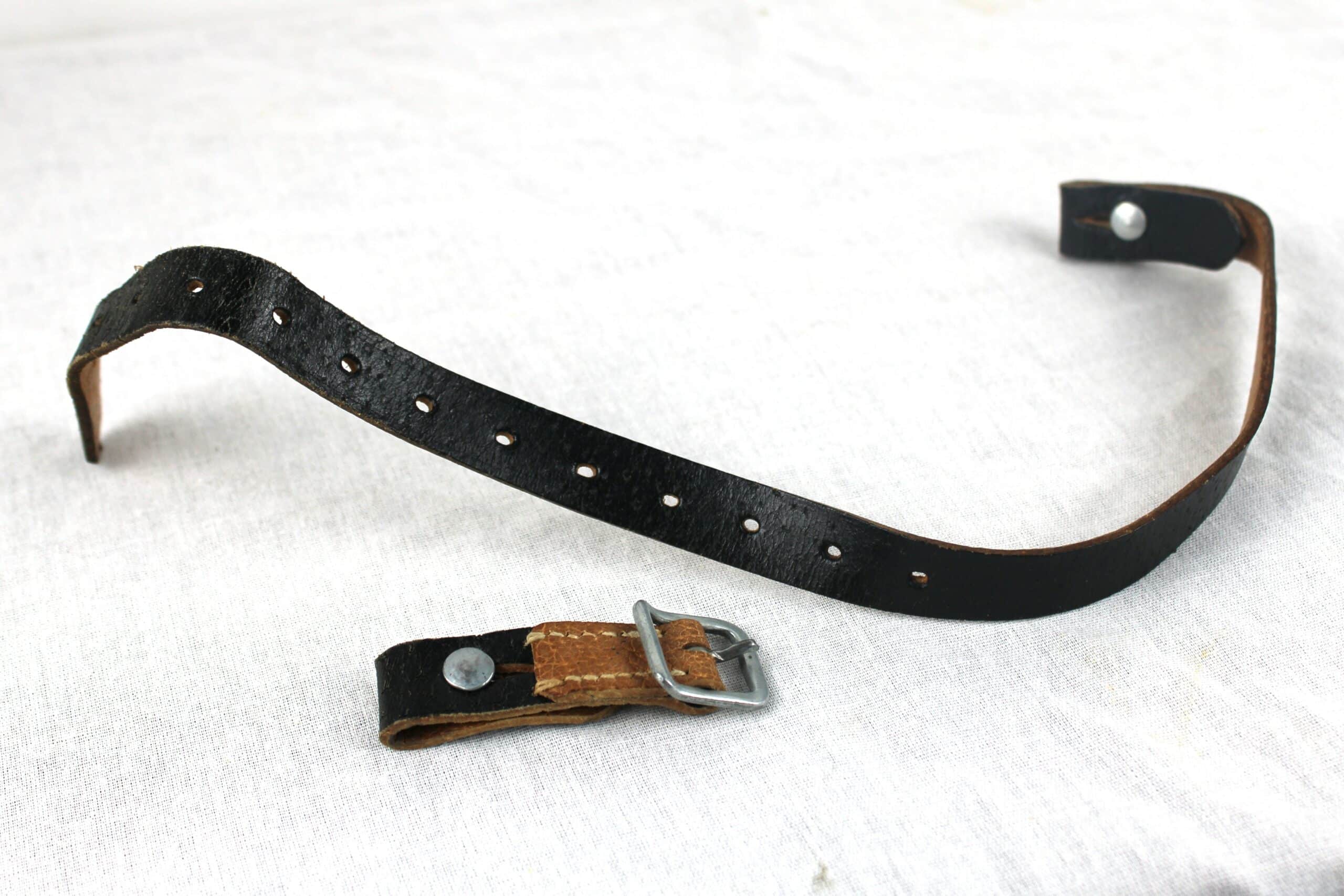 Très belle jugulaire pour casque allemand dans son état neuve de stock, fabrication tardive en cuir de porc très reconnaissable, boucle acier non peinte, couture parfaitement neuve, les rivets de maintient sont présents. Partie longue a 13 trous ovales.