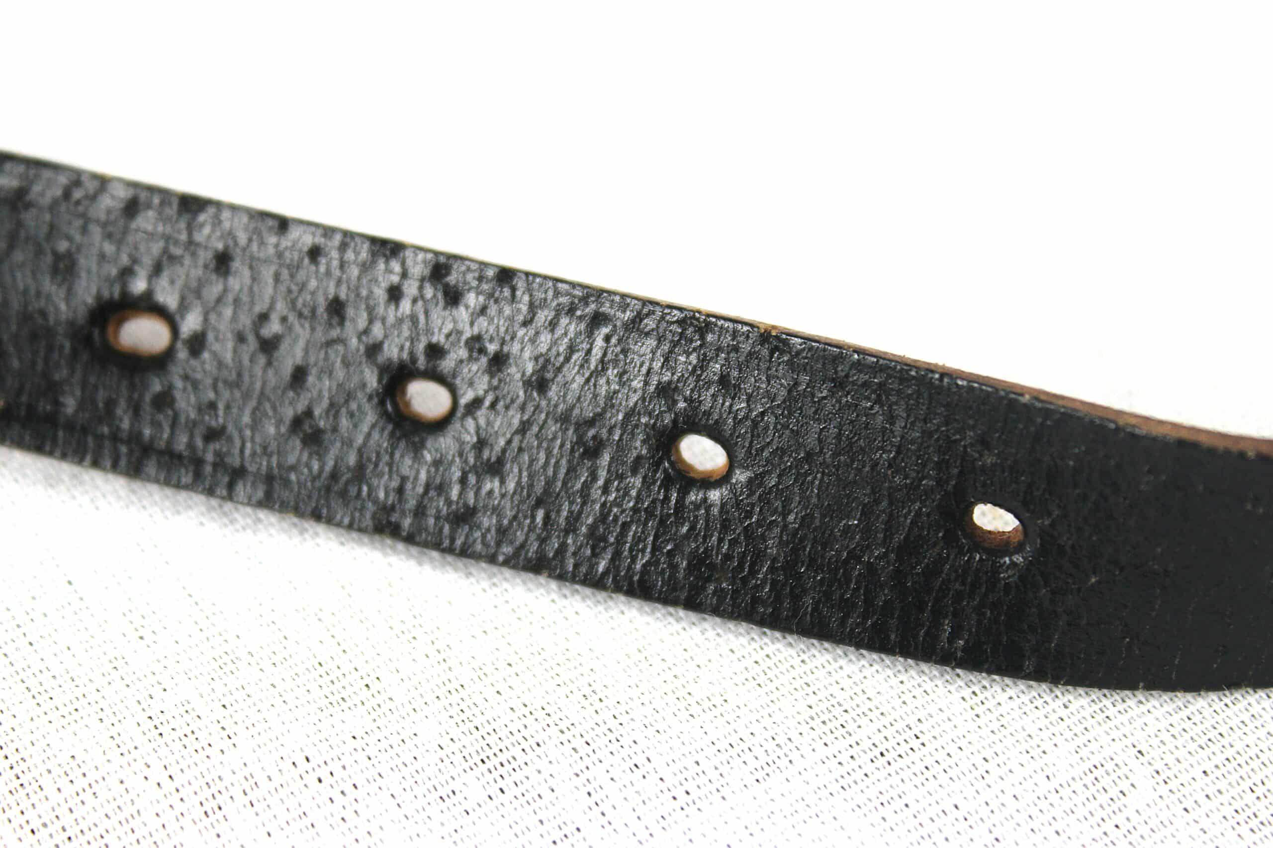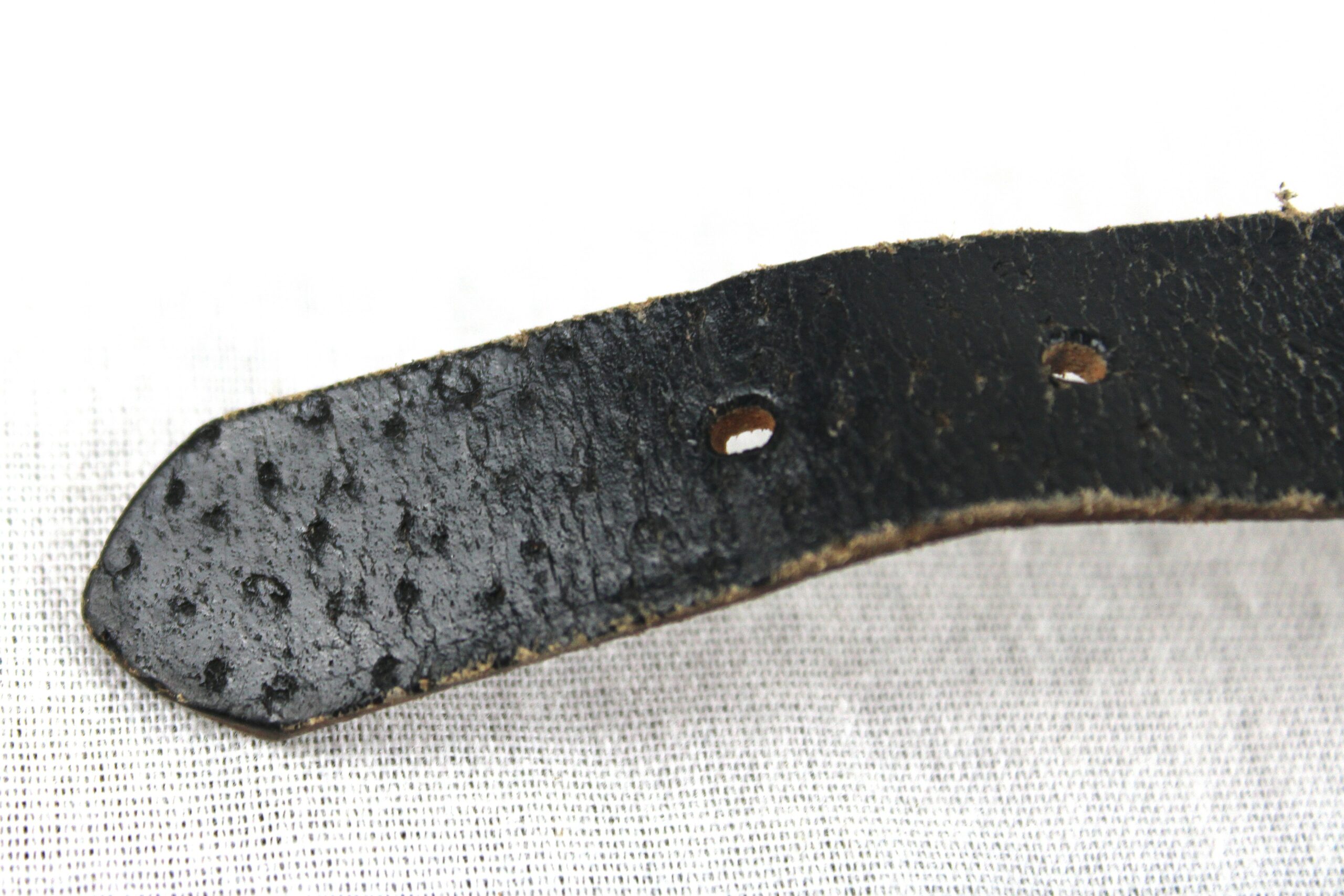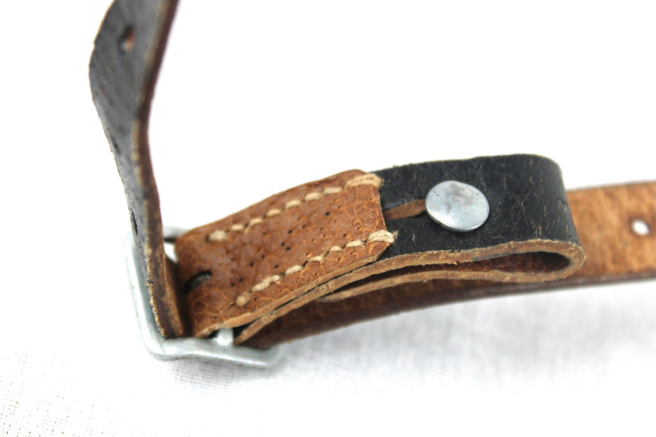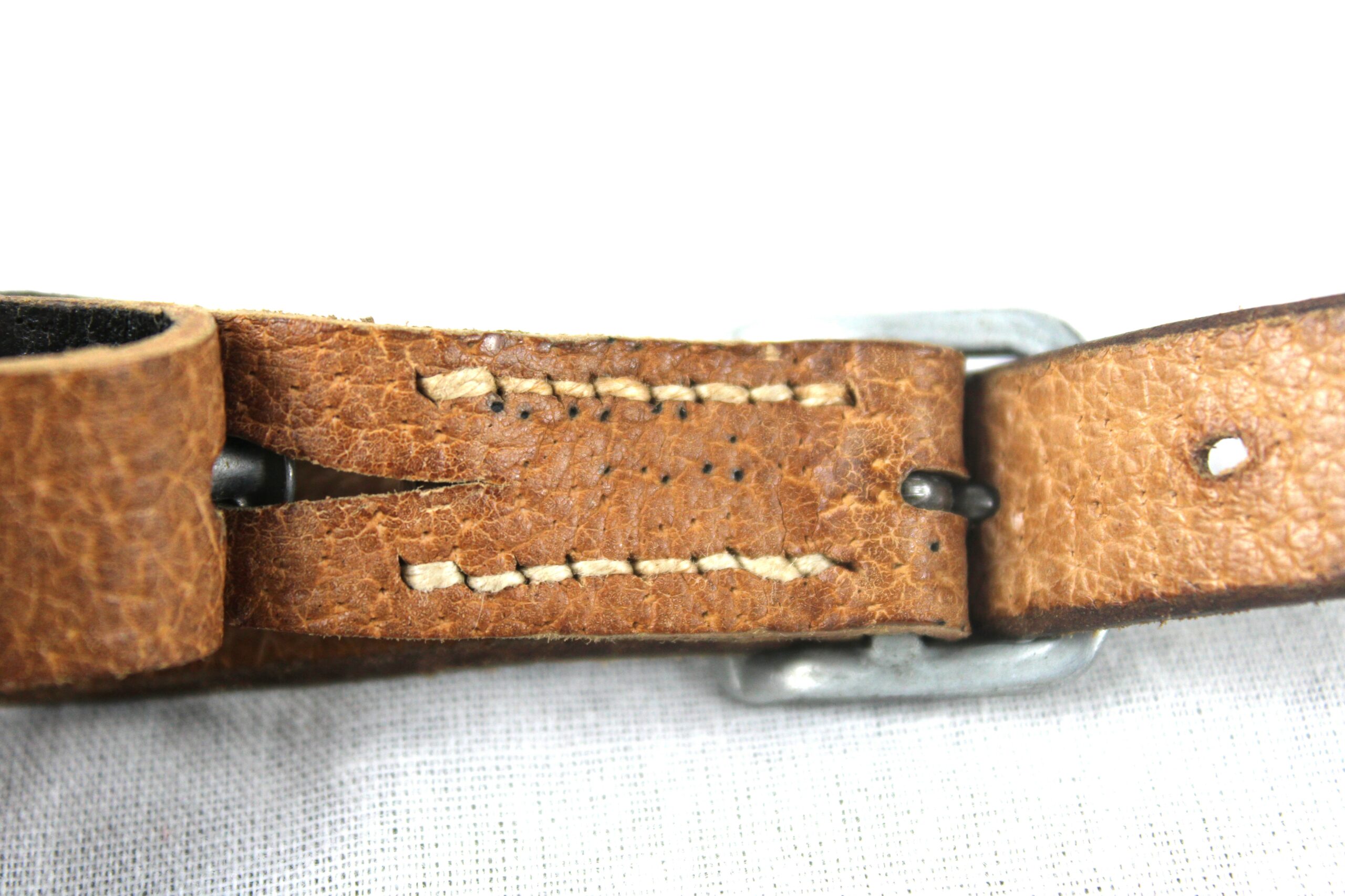 Très belle jugulaire pour casque allemand dans son état neuve de stock, fabrication tardive en cuir de porc très reconnaissable, boucle acier non peinte, couture parfaitement neuve, les rivets de maintient sont présents. Partie longue a 13 trous ovales.