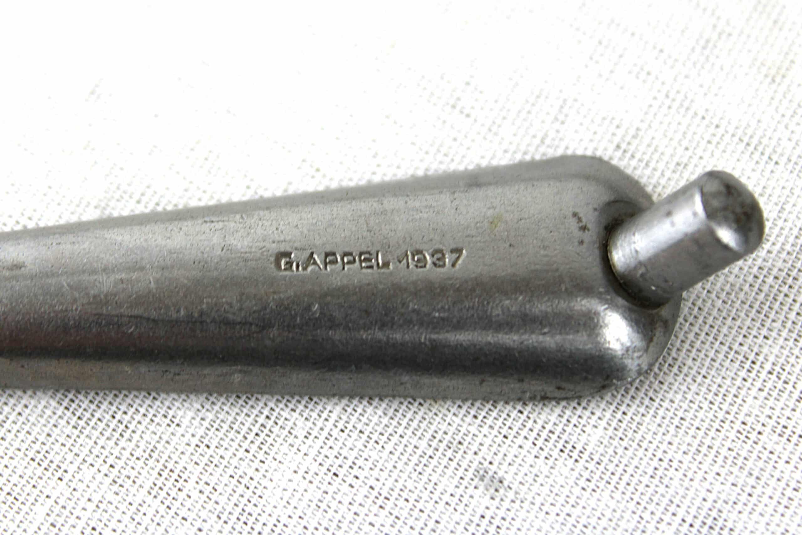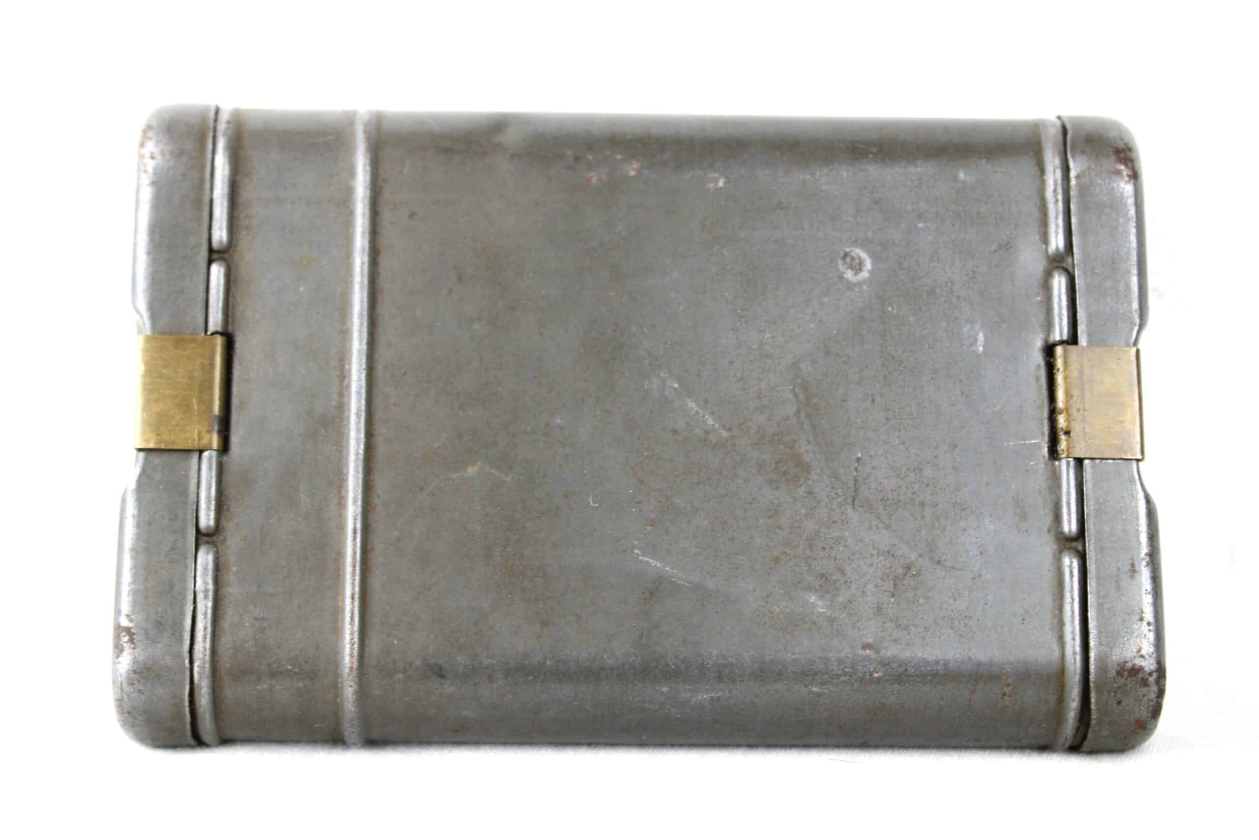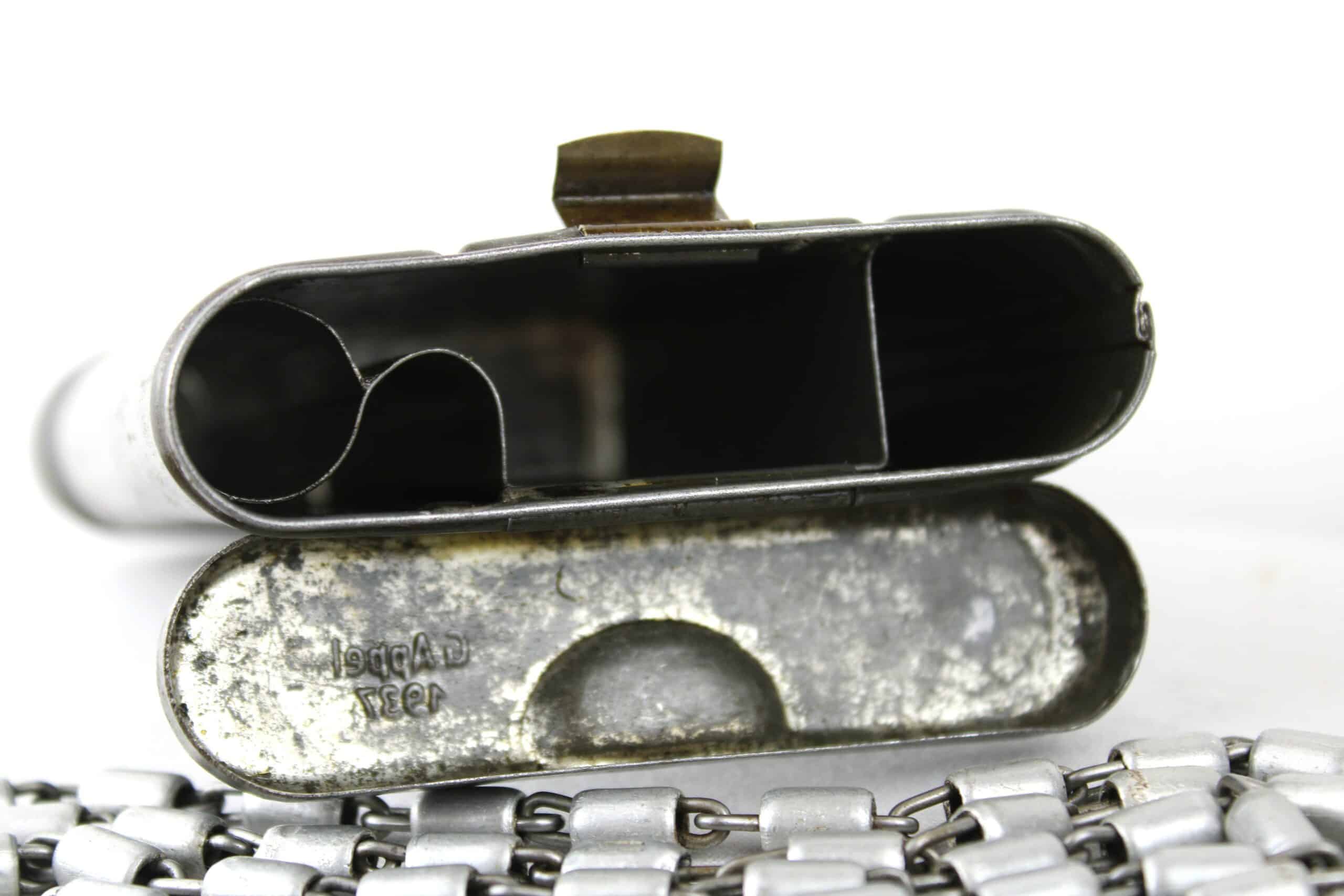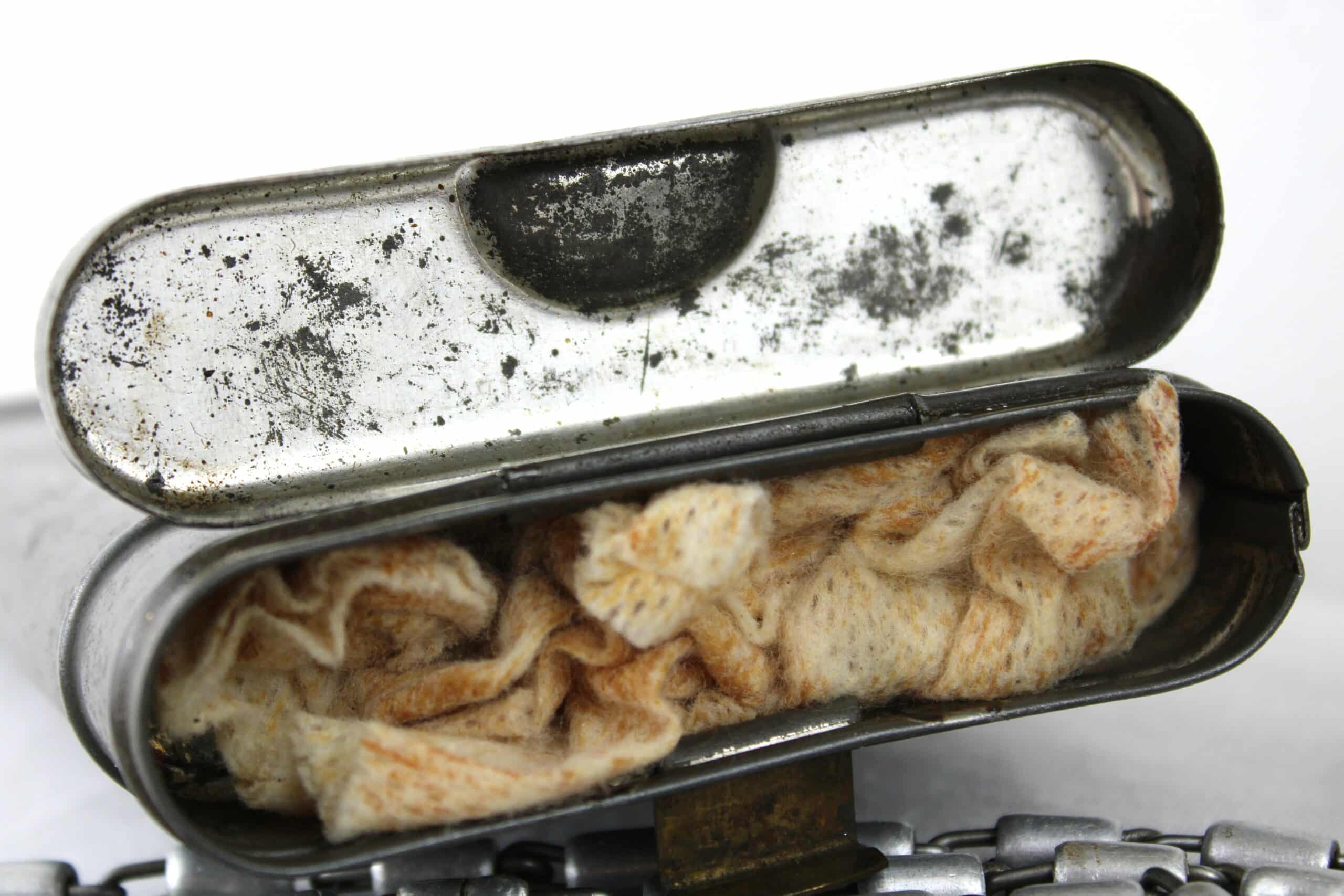 Boite en bon état avec ses fermeture en laiton, bien marquée avec Waffen Amt; Huilier fonctionnel et plein en acier, bien marqué G.Appel 1937; cuillère du même fabricant et même année; chaine en très bon état avec Waffen Amt et marquage M ? (Kriegsmarine?) ; les deux écouvillons en bon état avec leurs crochets de chaine.