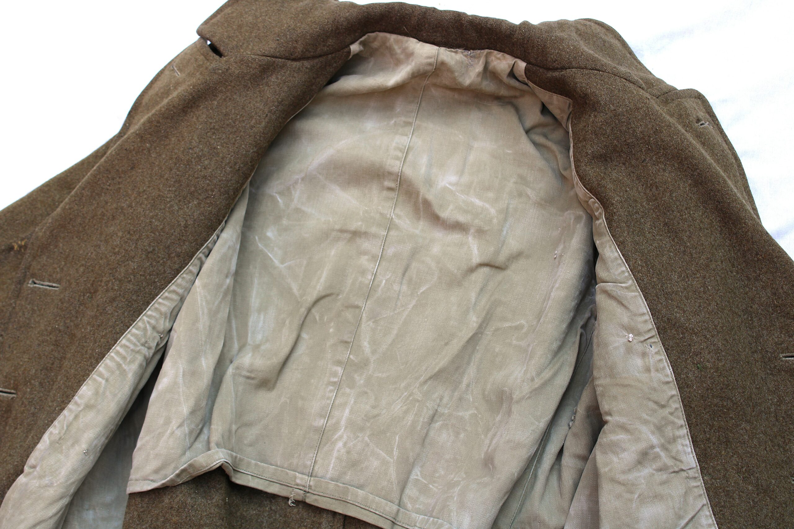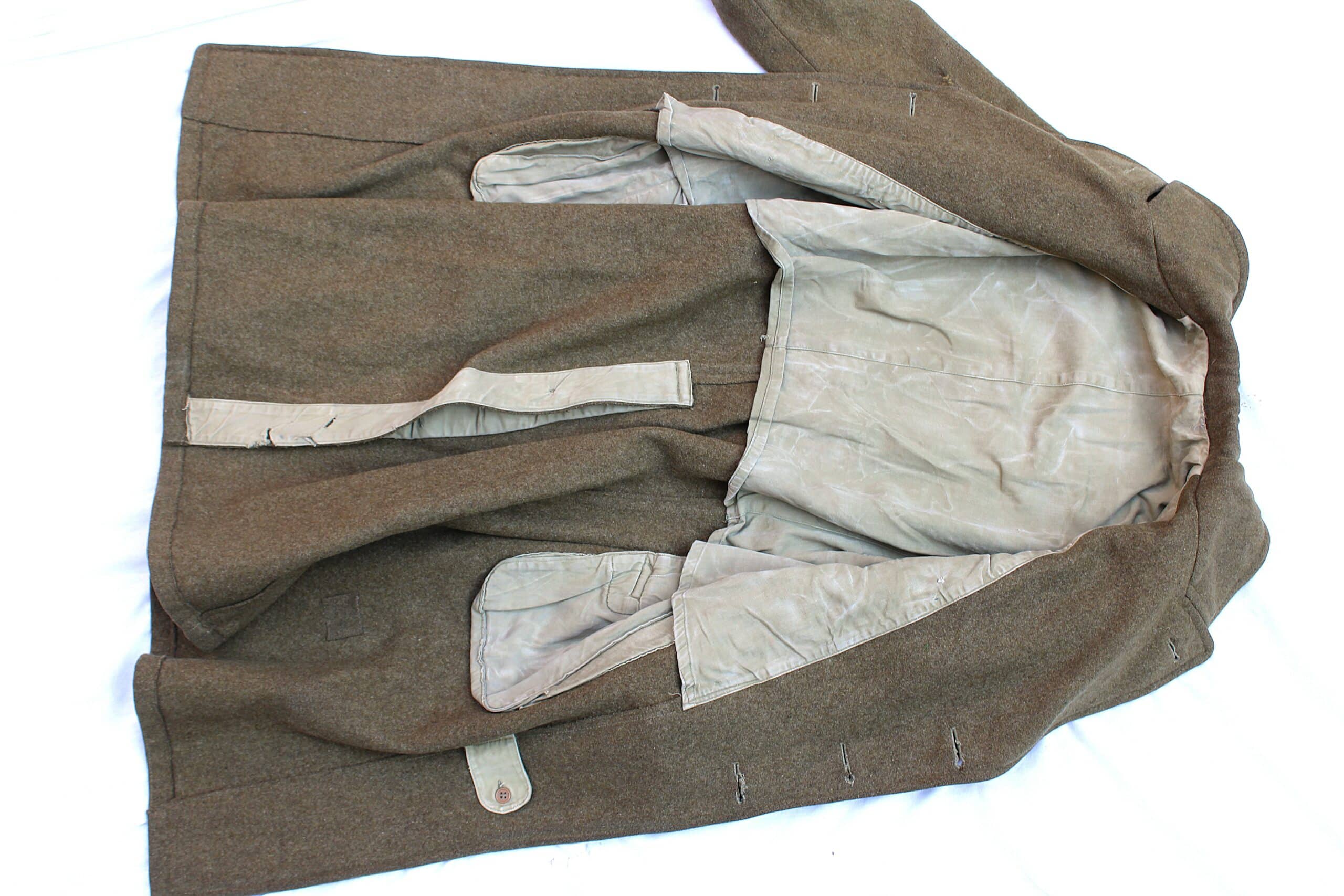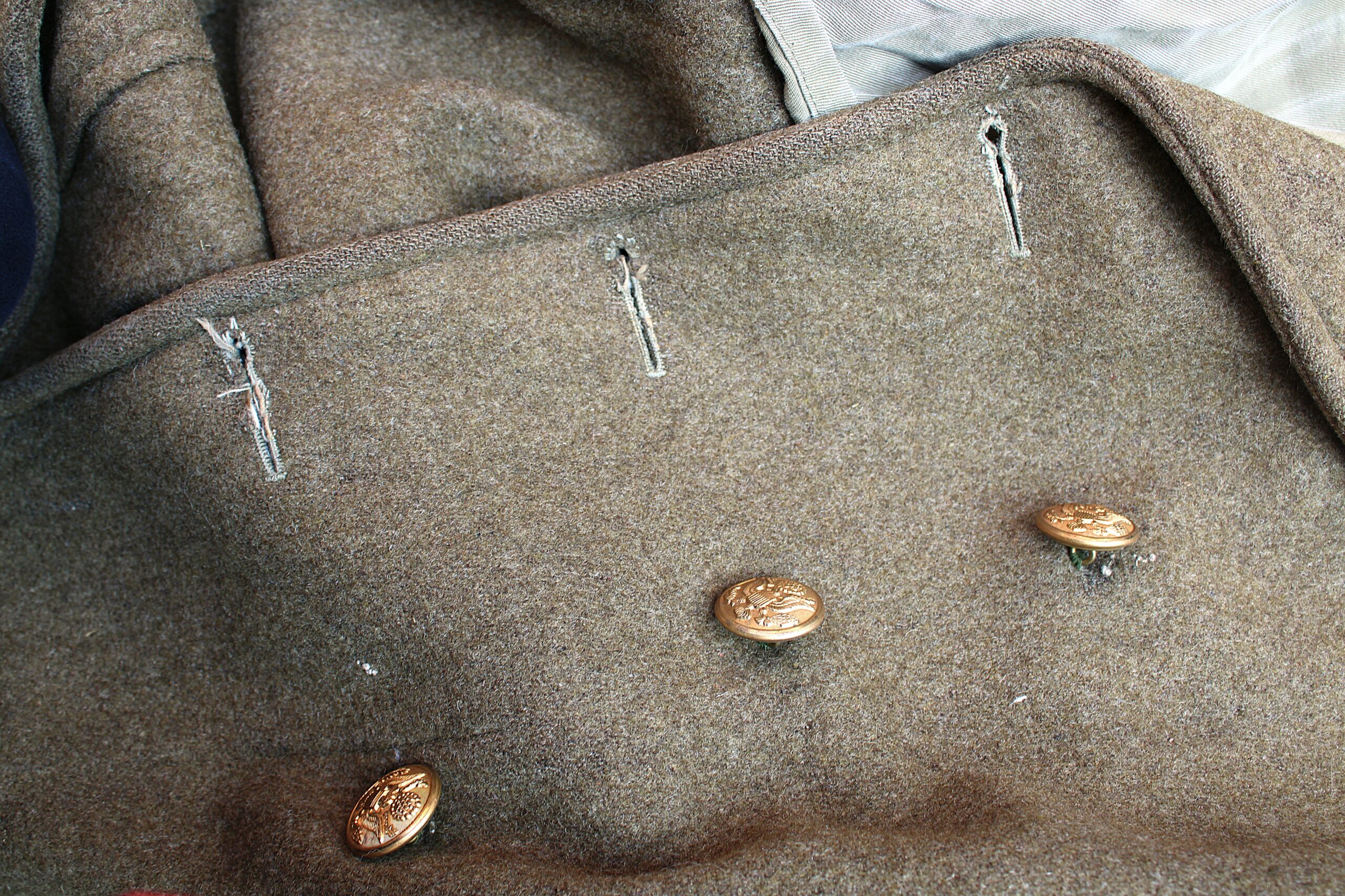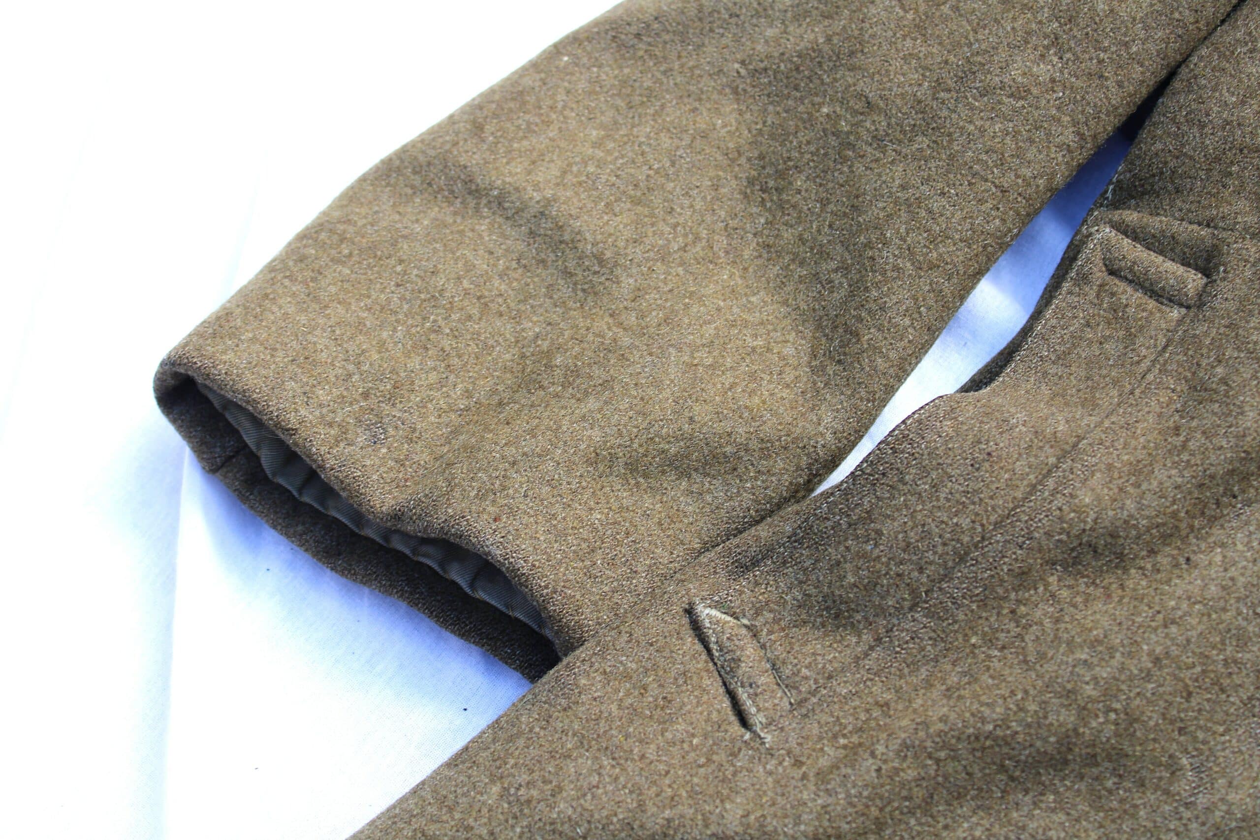 Tous les boutons sont présent, modèle en métal doré. Doublure bien présente, délavée, à noter quelques trous d’usure sans gravité sous l’aisselle gauche et sur la bande de doublure de jupe, invisible d’extérieur. Une petite réparation d’époque sur le bas de la jupe à gauche , une couture au niveau de la doublure du col, ainsi qu’une petite couture sur la manche droite quasi invisible. Rien de véritablement dérangeant une fois porté. Bande de serrage du dos présente avec ses boutons, pattes d’épaule également présentes ainsi que les boutons internes de poches.