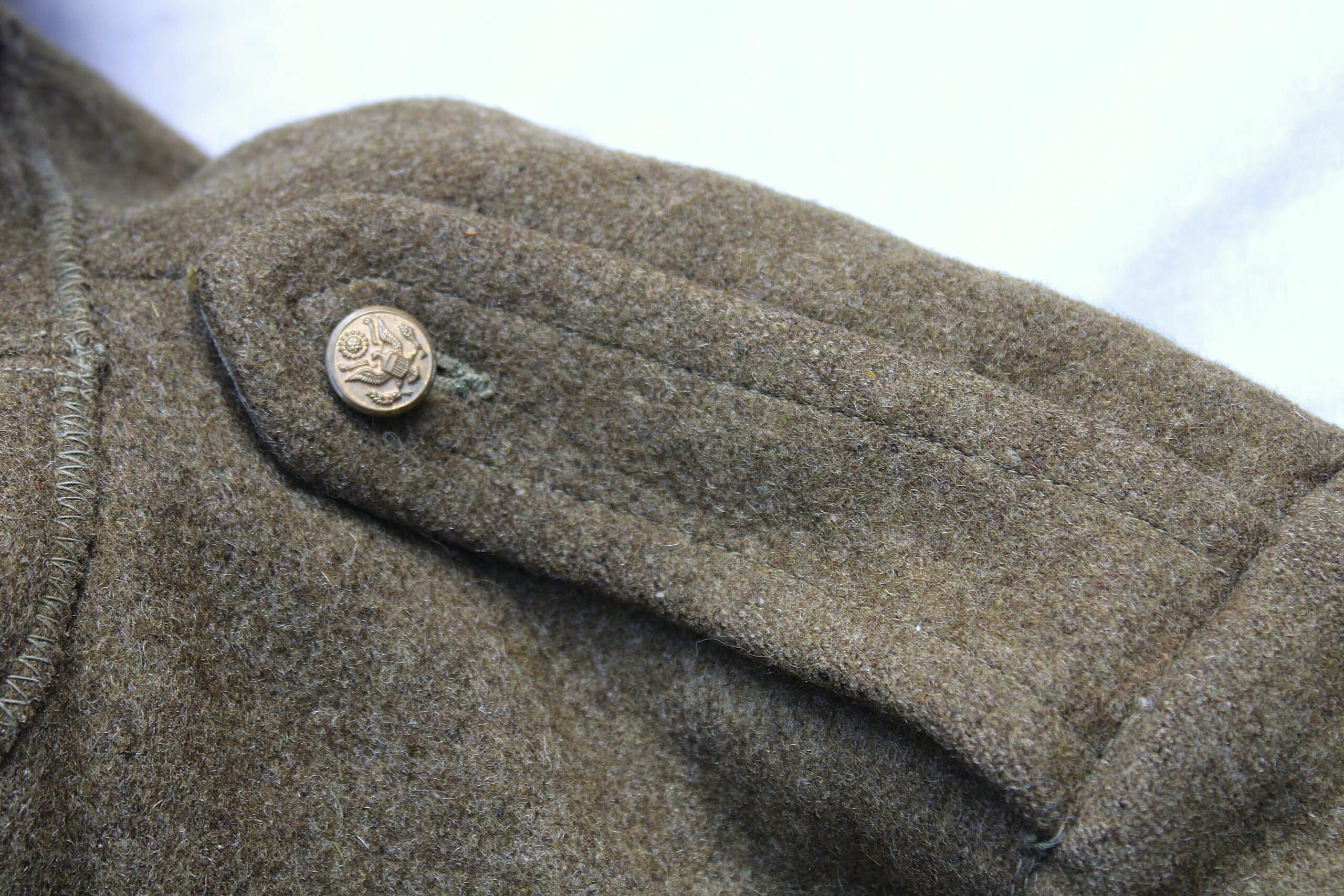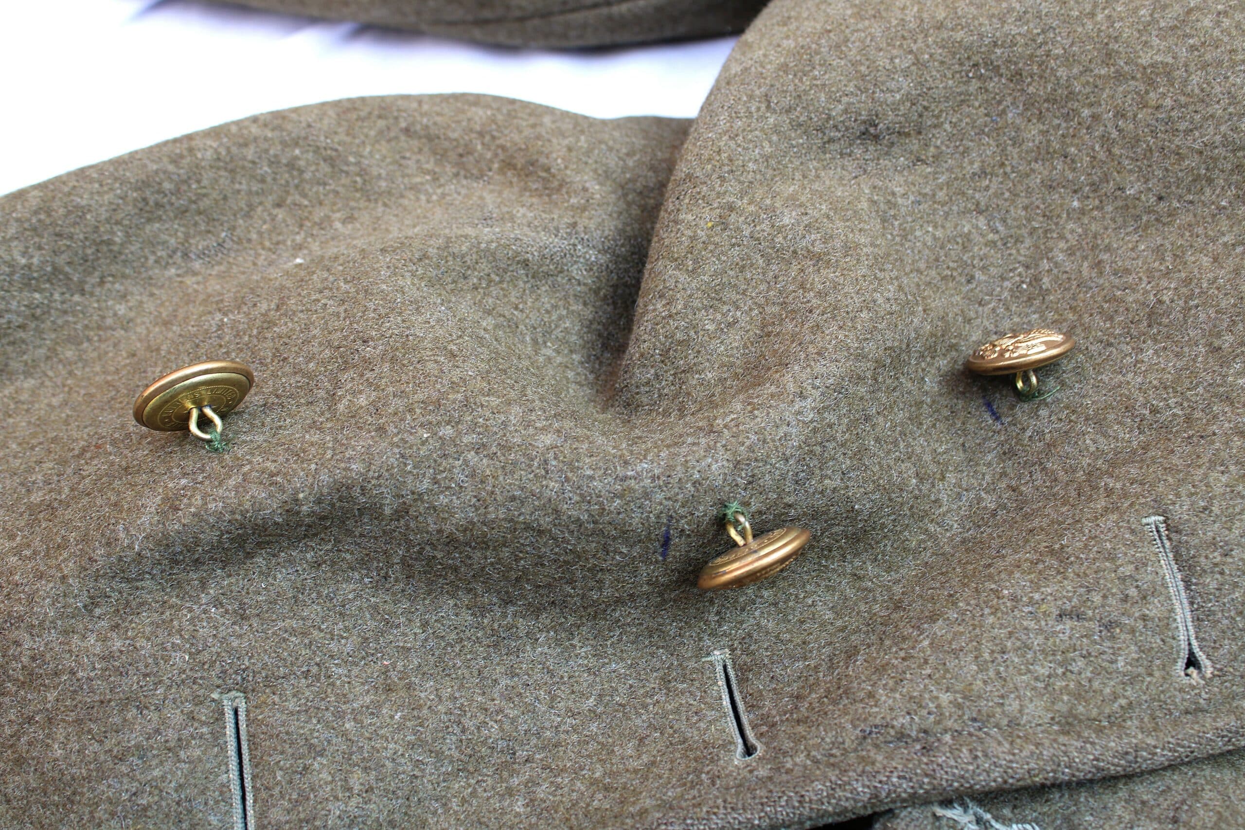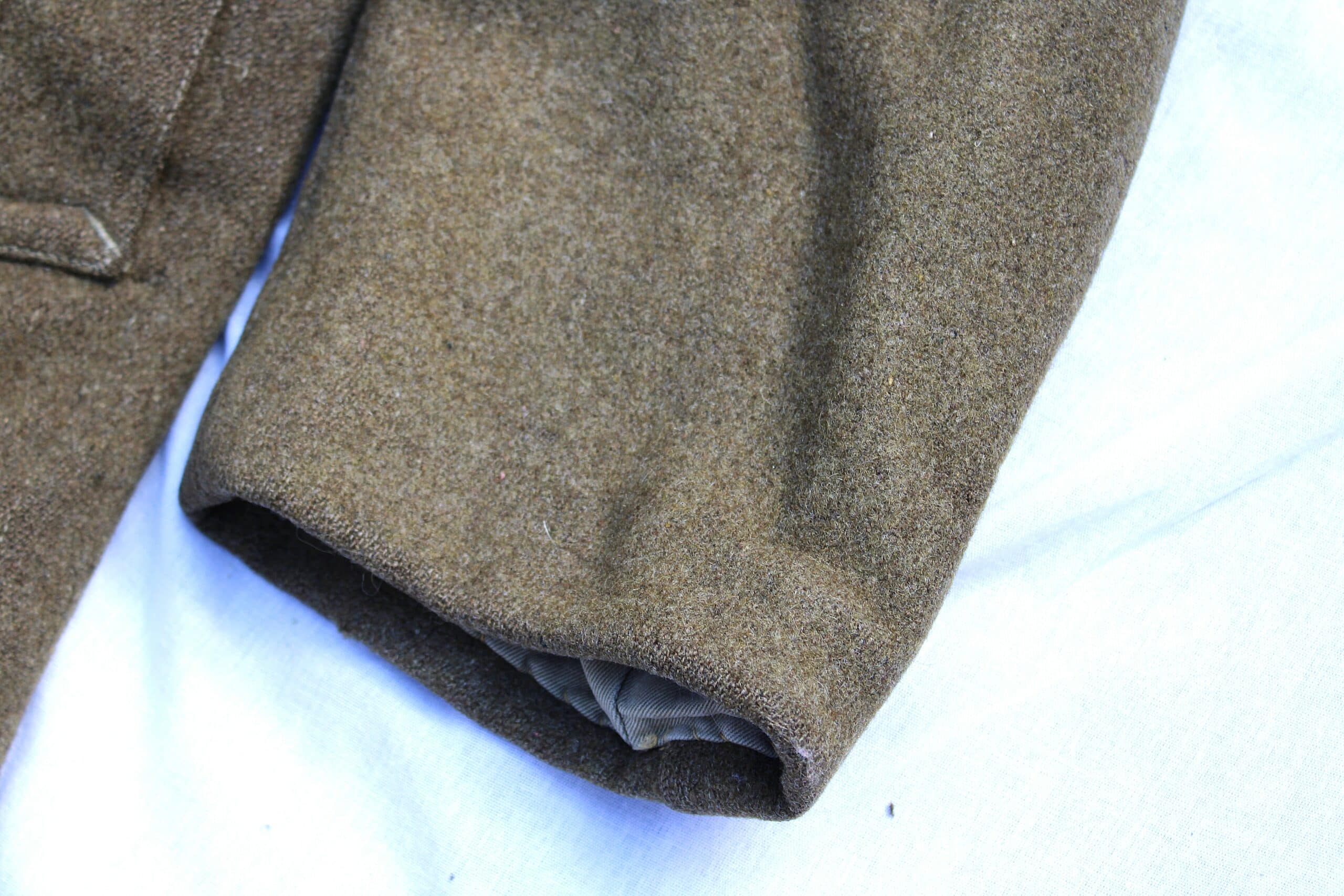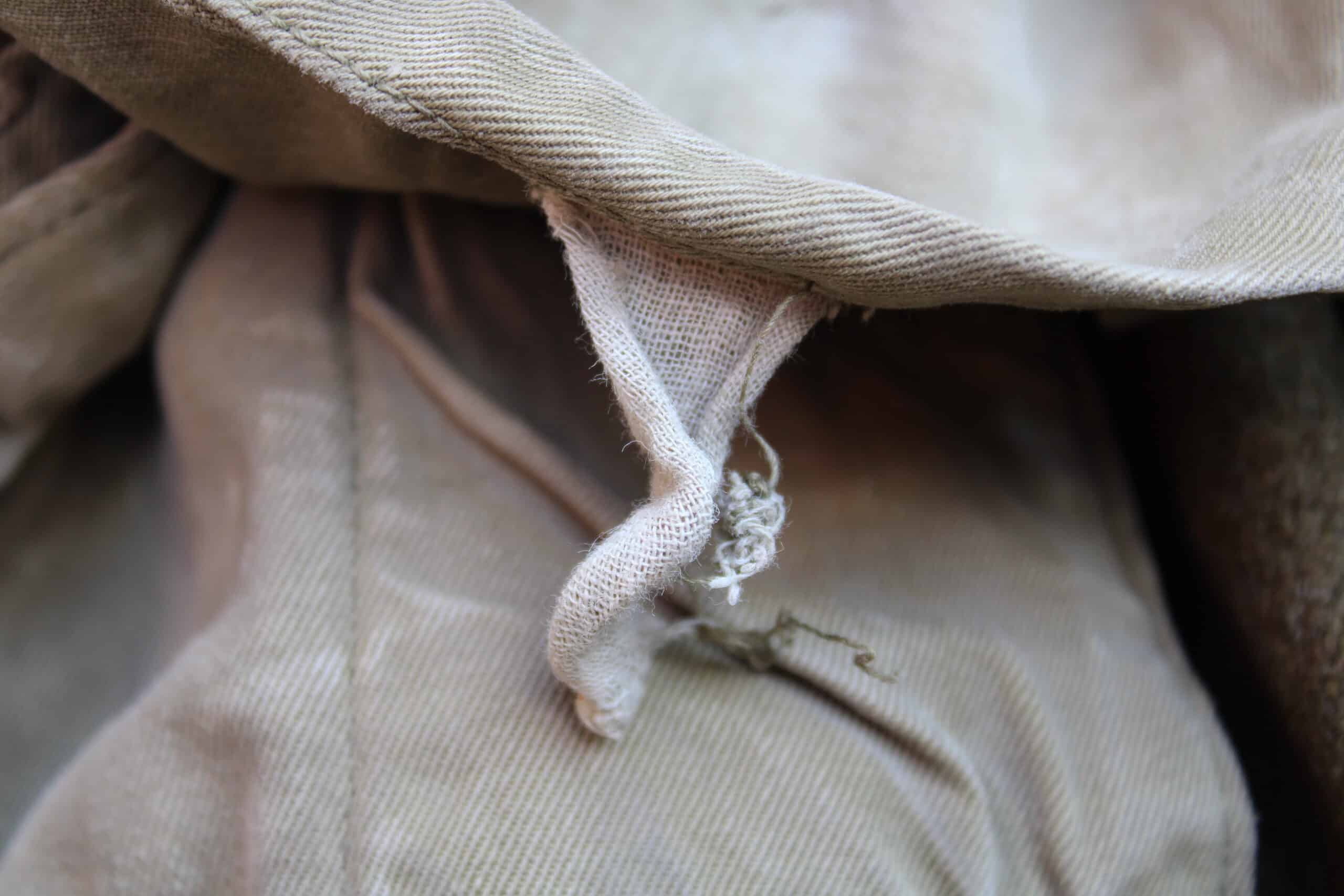Tous les boutons sont présent, modèle en métal doré. Doublure bien présente, délavée, à noter quelques trous d’usure sans gravité sous l’aisselle gauche et sur la bande de doublure de jupe, invisible d’extérieur. Une petite réparation d’époque sur le bas de la jupe à gauche , une couture au niveau de la doublure du col, ainsi qu’une petite couture sur la manche droite quasi invisible. Rien de véritablement dérangeant une fois porté. Bande de serrage du dos présente avec ses boutons, pattes d’épaule également présentes ainsi que les boutons internes de poches.