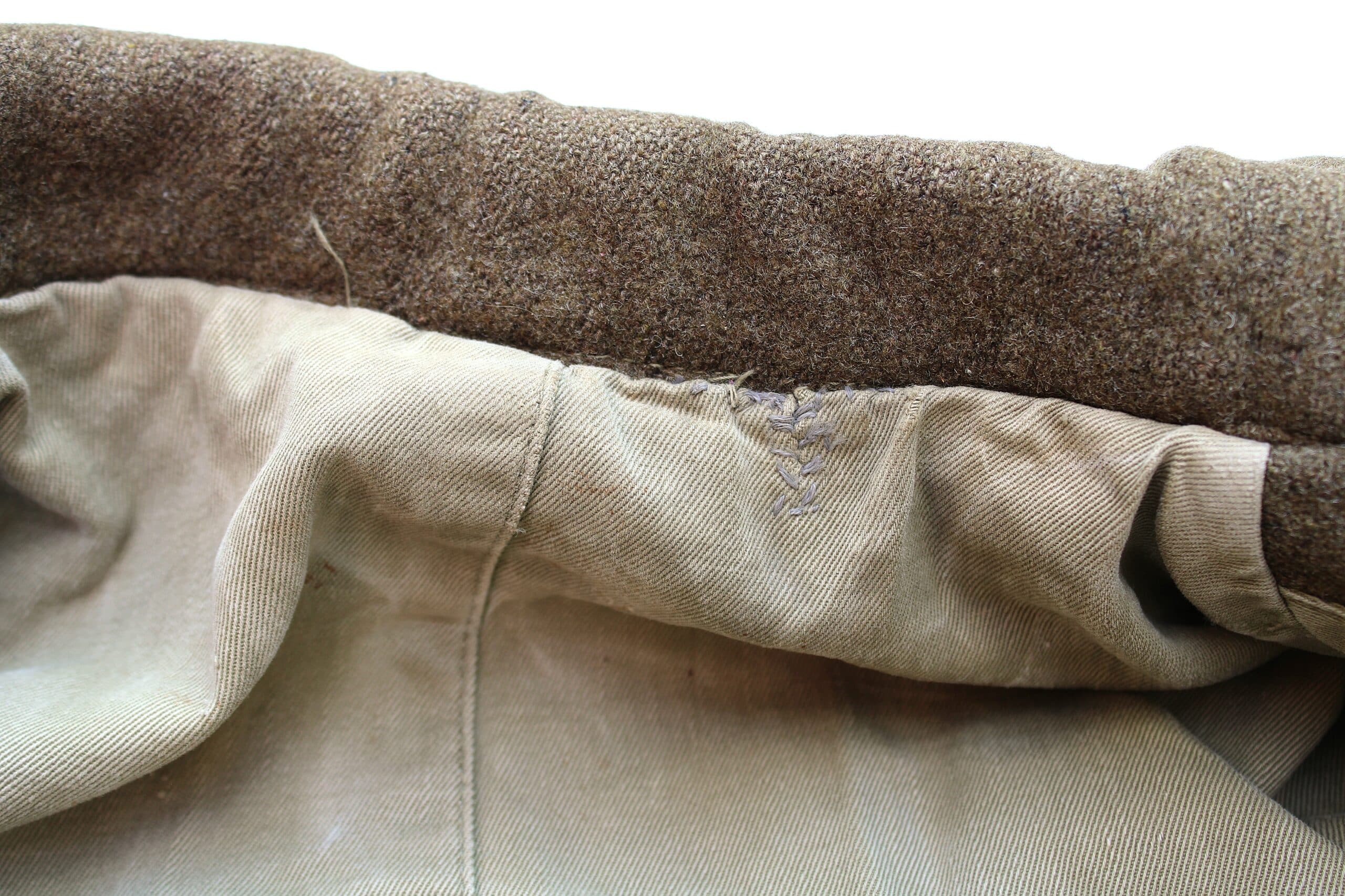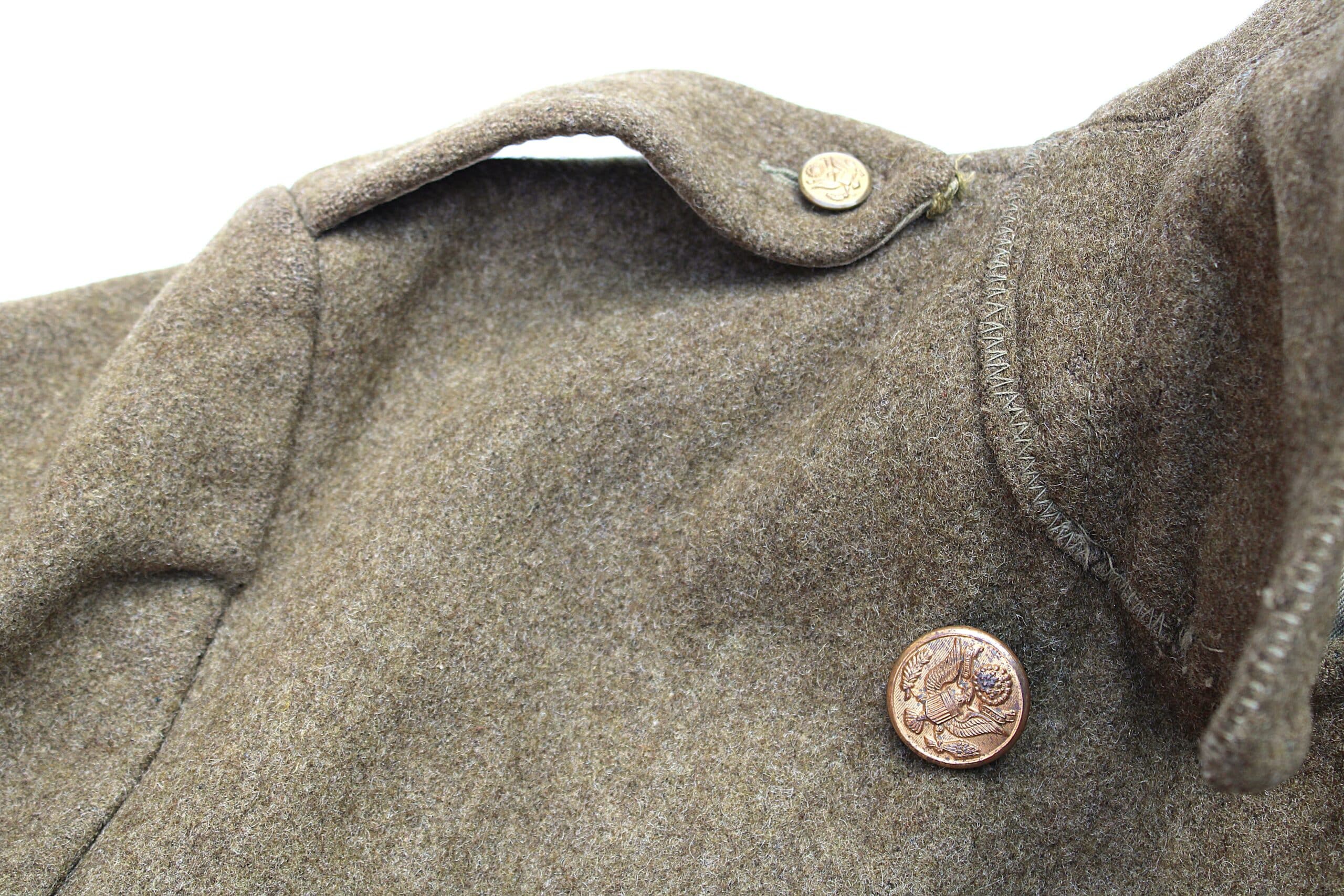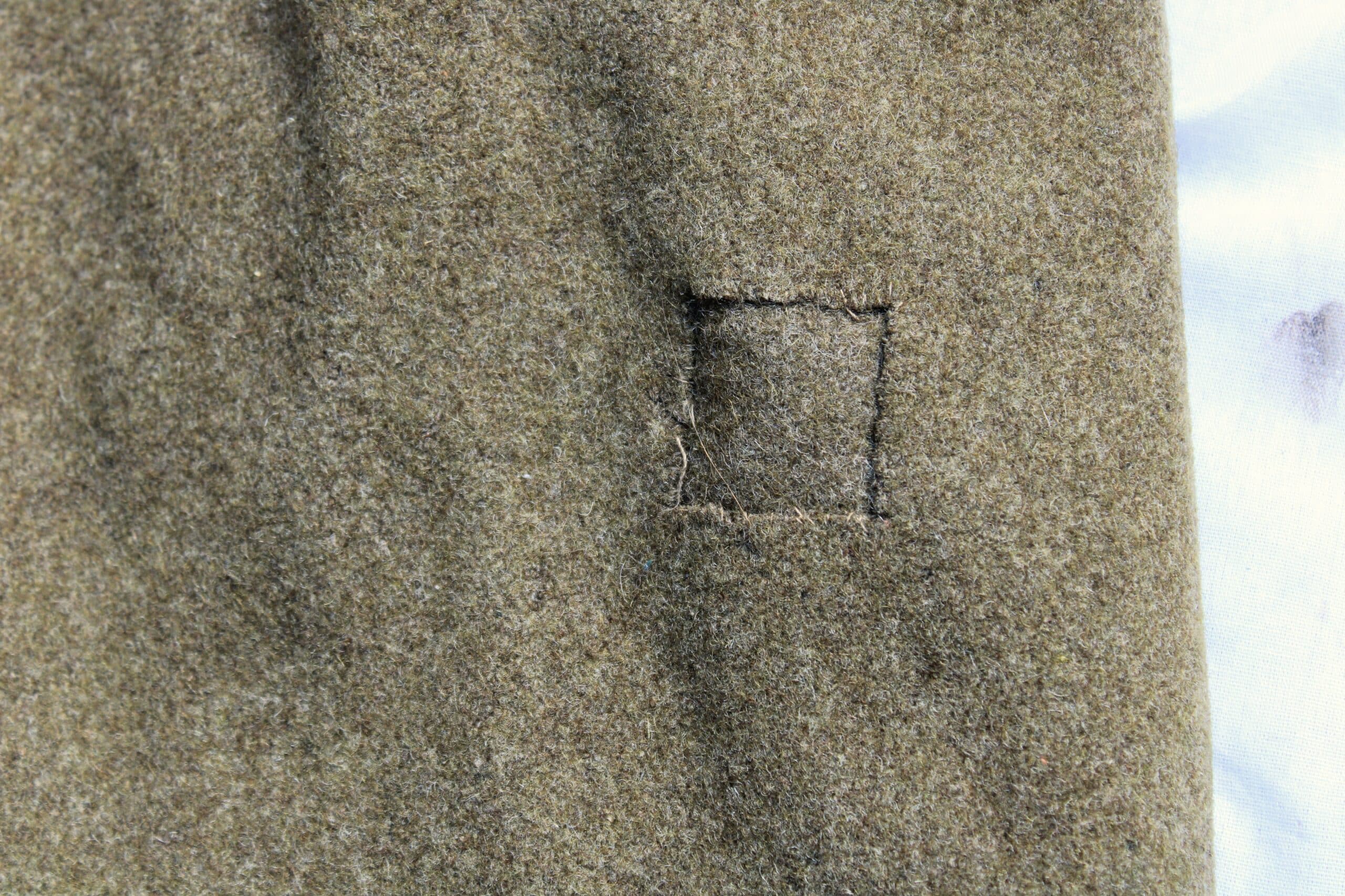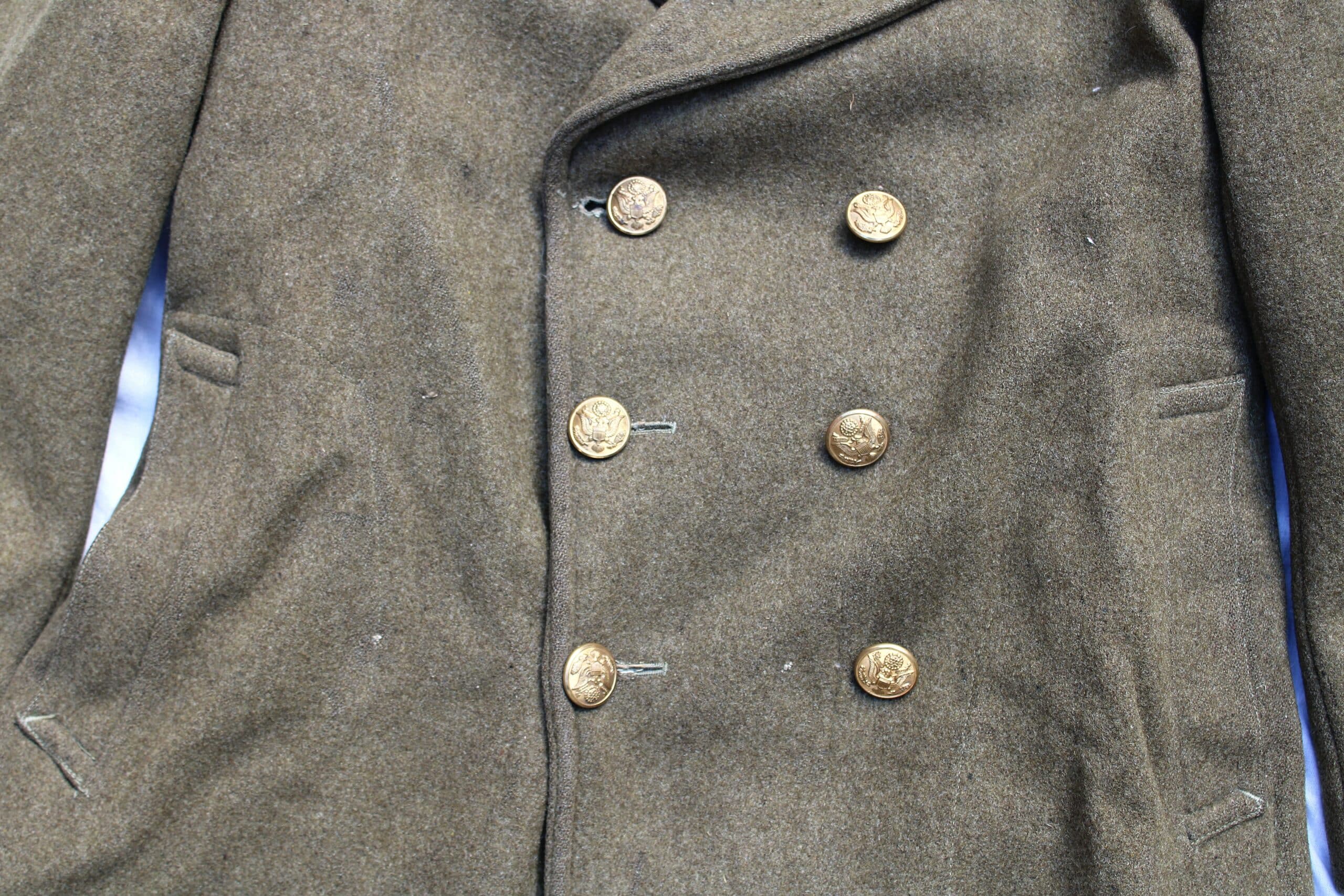 Tous les boutons sont présent, modèle en métal doré. Doublure bien présente, délavée, à noter quelques trous d’usure sans gravité sous l’aisselle gauche et sur la bande de doublure de jupe, invisible d’extérieur. Une petite réparation d’époque sur le bas de la jupe à gauche , une couture au niveau de la doublure du col, ainsi qu’une petite couture sur la manche droite quasi invisible. Rien de véritablement dérangeant une fois porté. Bande de serrage du dos présente avec ses boutons, pattes d’épaule également présentes ainsi que les boutons internes de poches.
