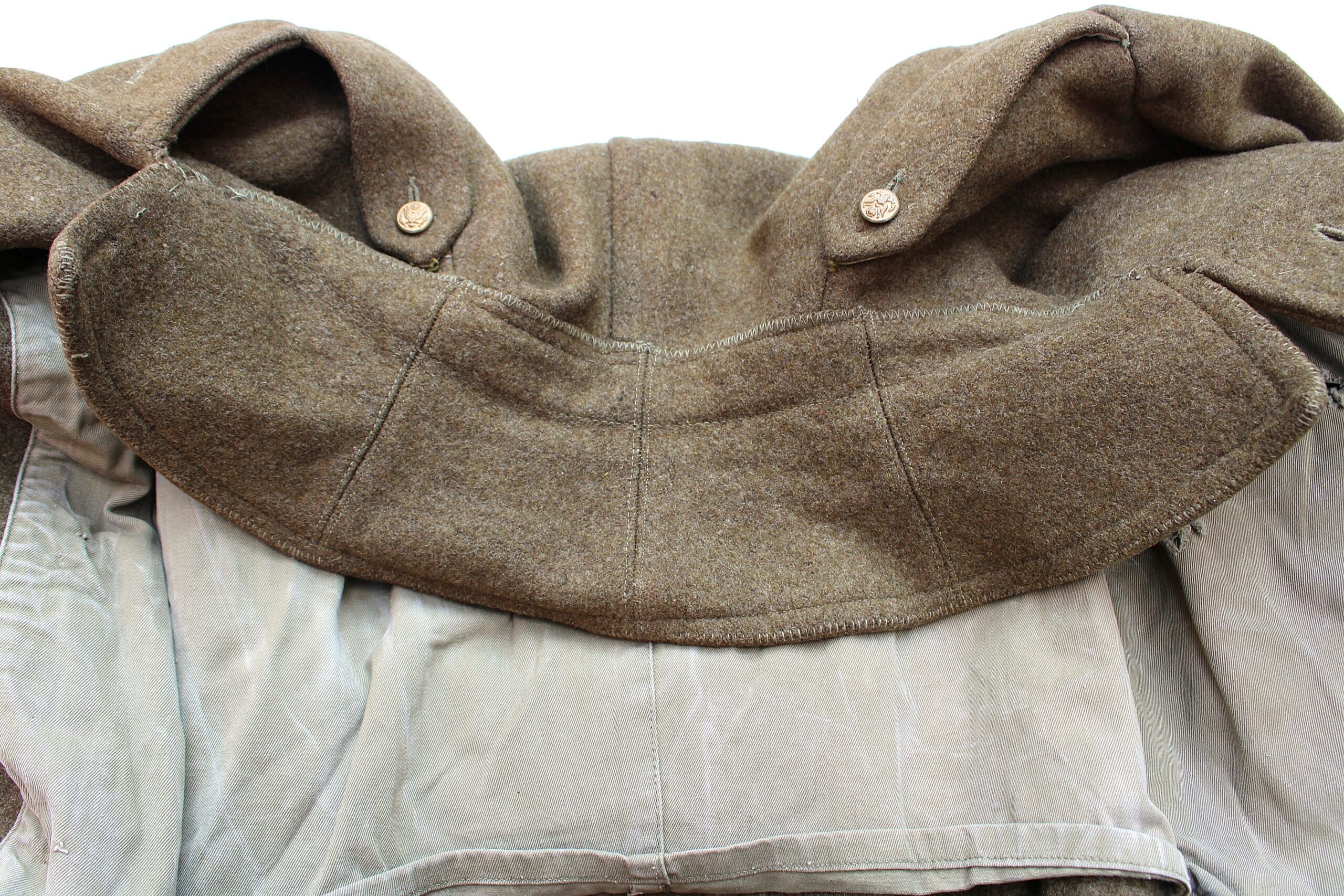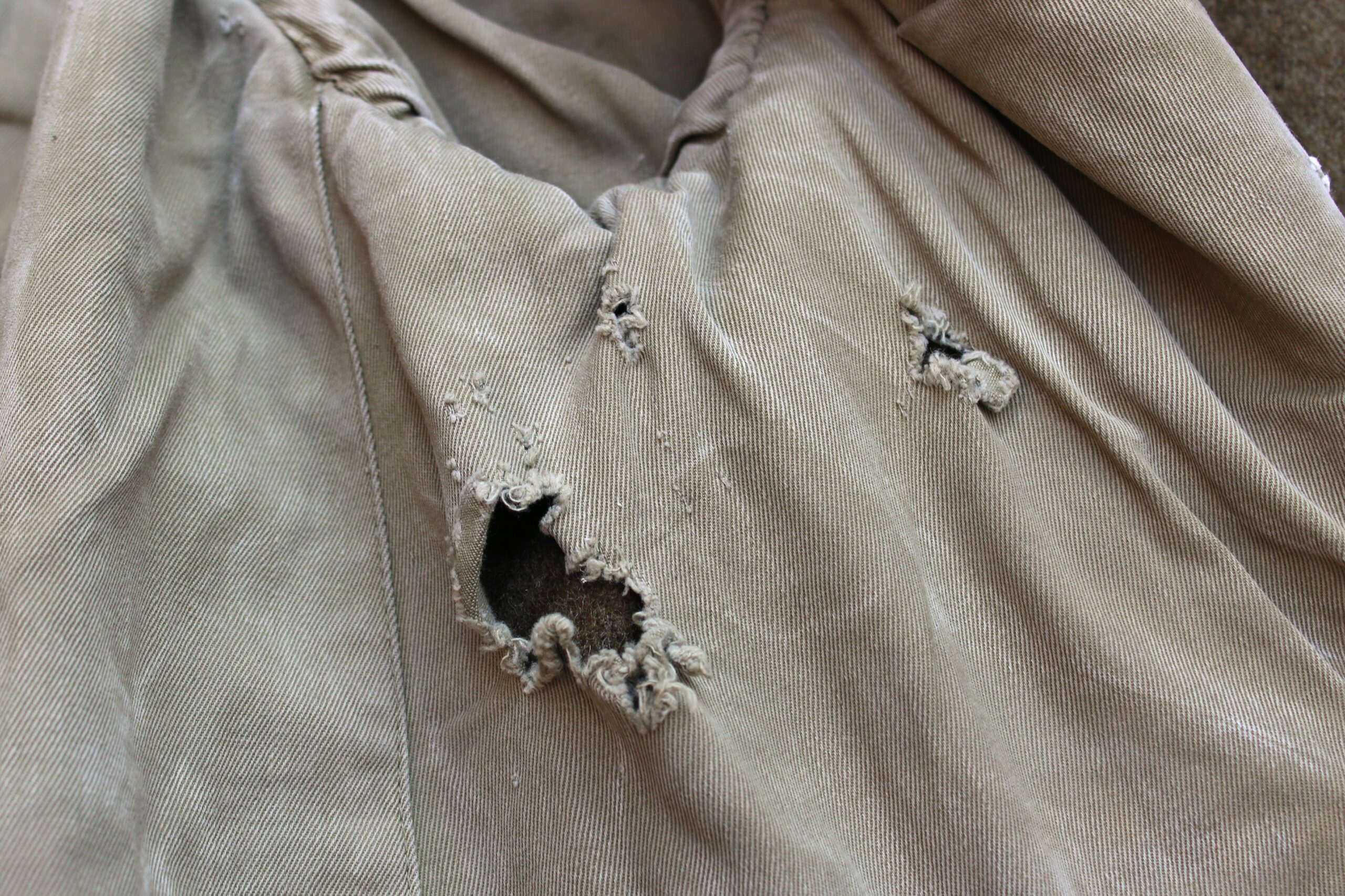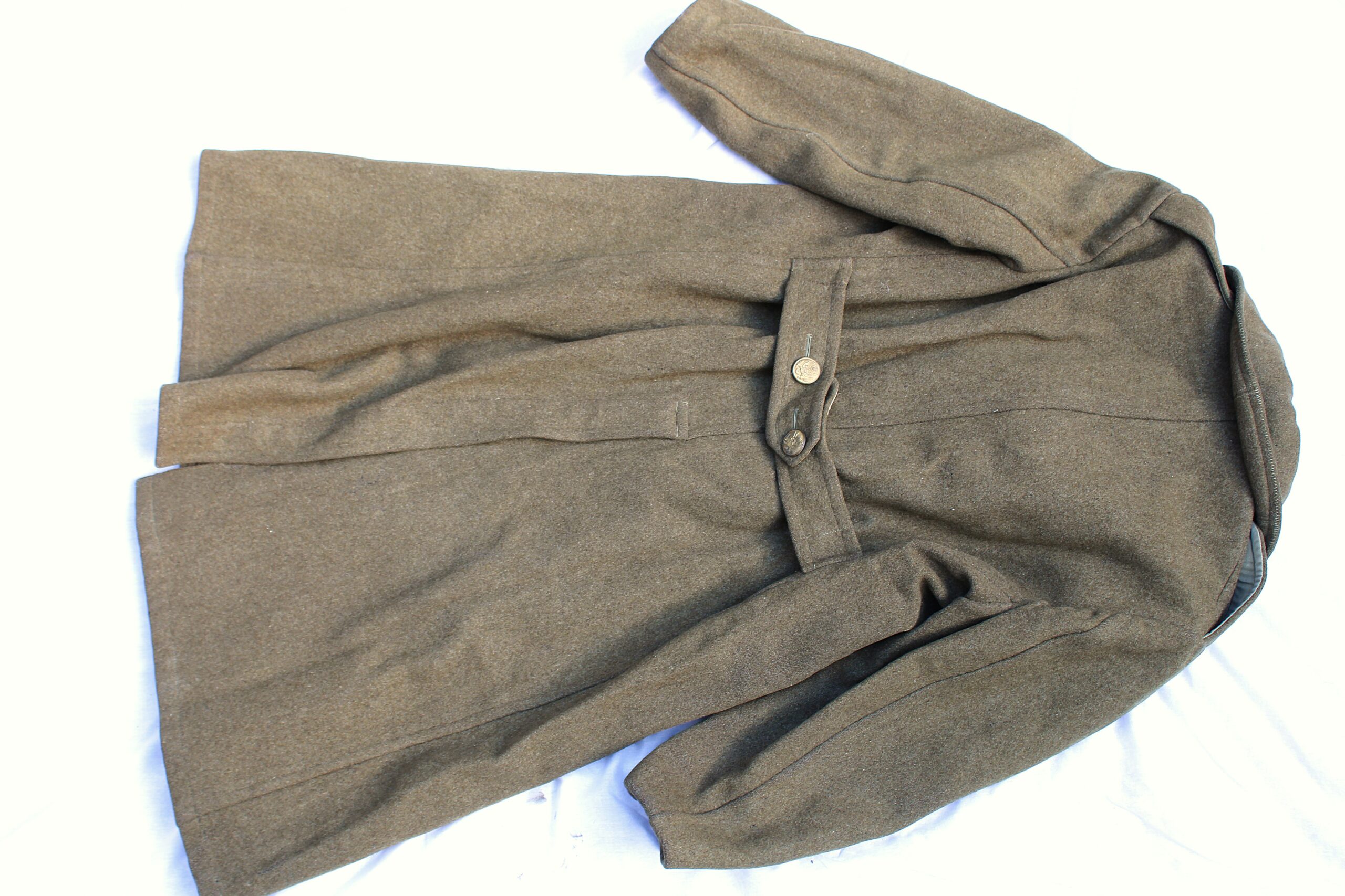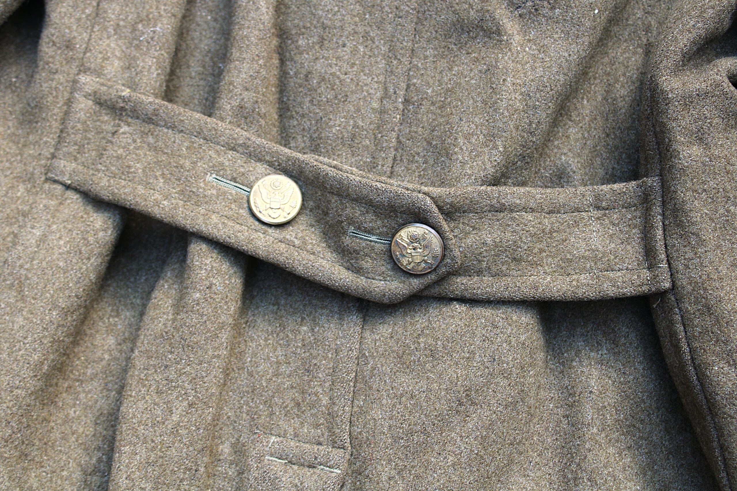 Tous les boutons sont présent, modèle en métal doré. Doublure bien présente, délavée, à noter quelques trous d’usure sans gravité sous l’aisselle gauche et sur la bande de doublure de jupe, invisible d’extérieur. Une petite réparation d’époque sur le bas de la jupe à gauche , une couture au niveau de la doublure du col, ainsi qu’une petite couture sur la manche droite quasi invisible. Rien de véritablement dérangeant une fois porté. Bande de serrage du dos présente avec ses boutons, pattes d’épaule également présentes ainsi que les boutons internes de poches.