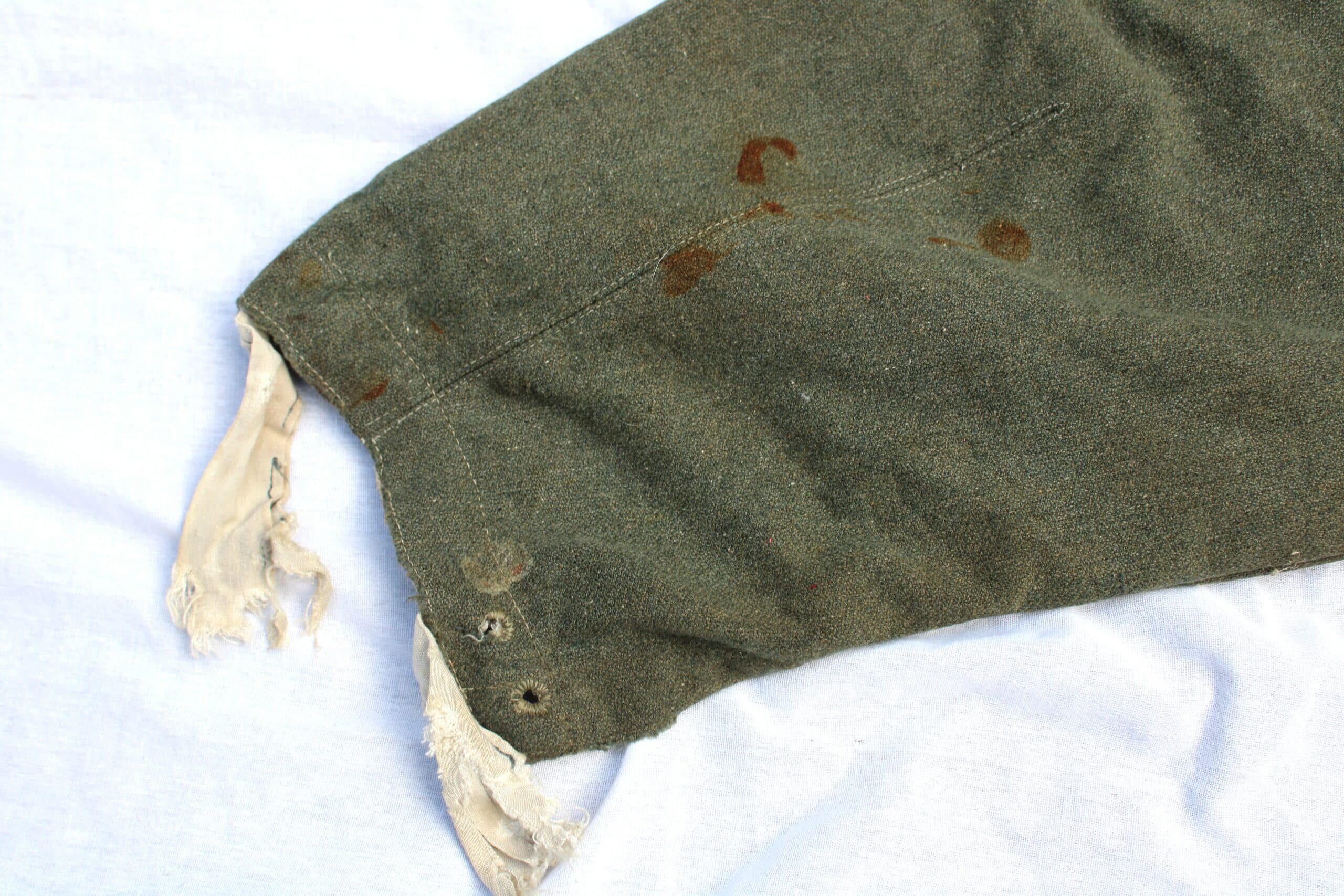Il est dans son état brut, rapiécé aux genoux avec du bon drap feldgrau, tache d’encre au niveau de la poche droite, petites réparations multiple, quelques boutons manquants, mais reste néanmoins plutôt présentable avec une bonne taille mannequin.