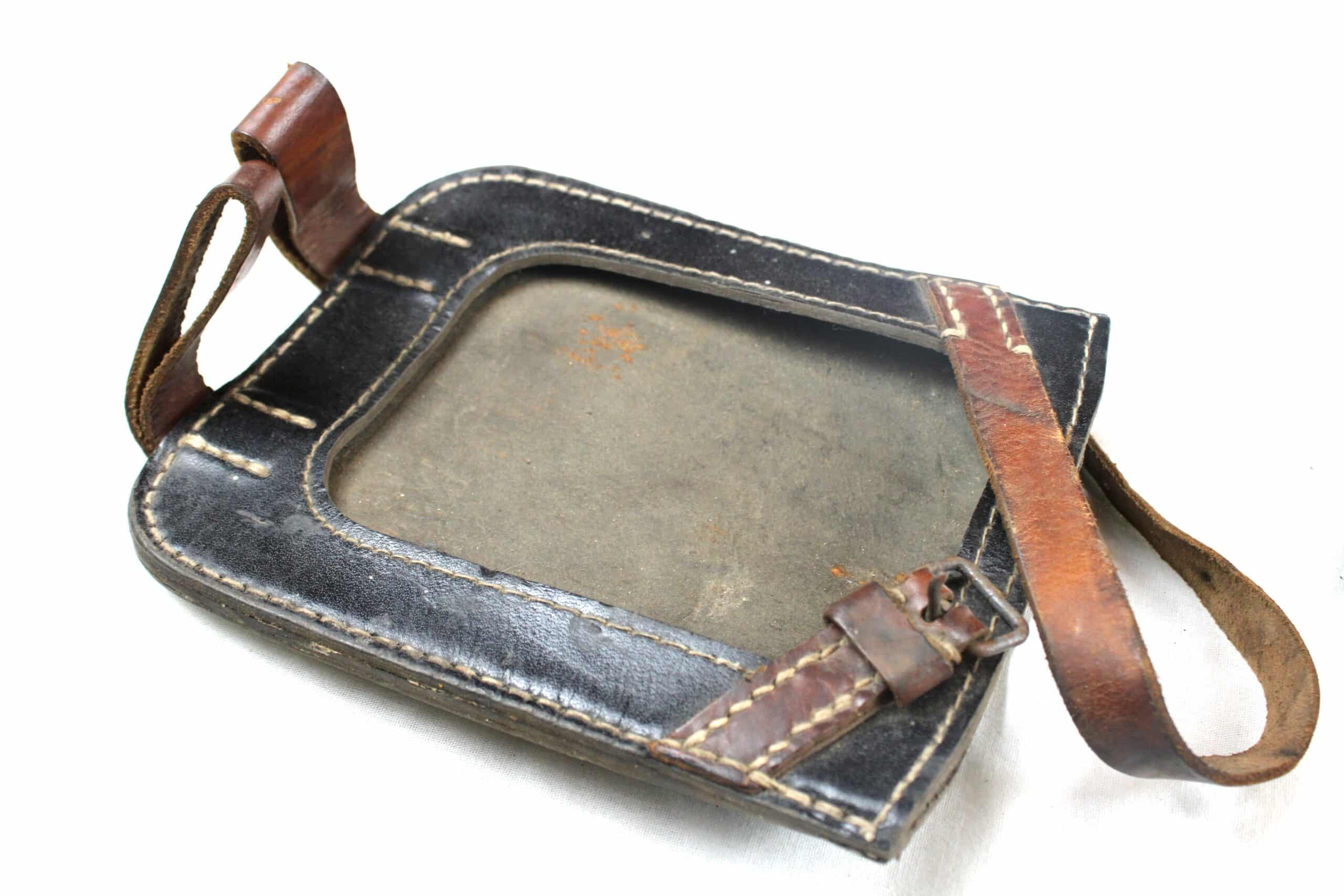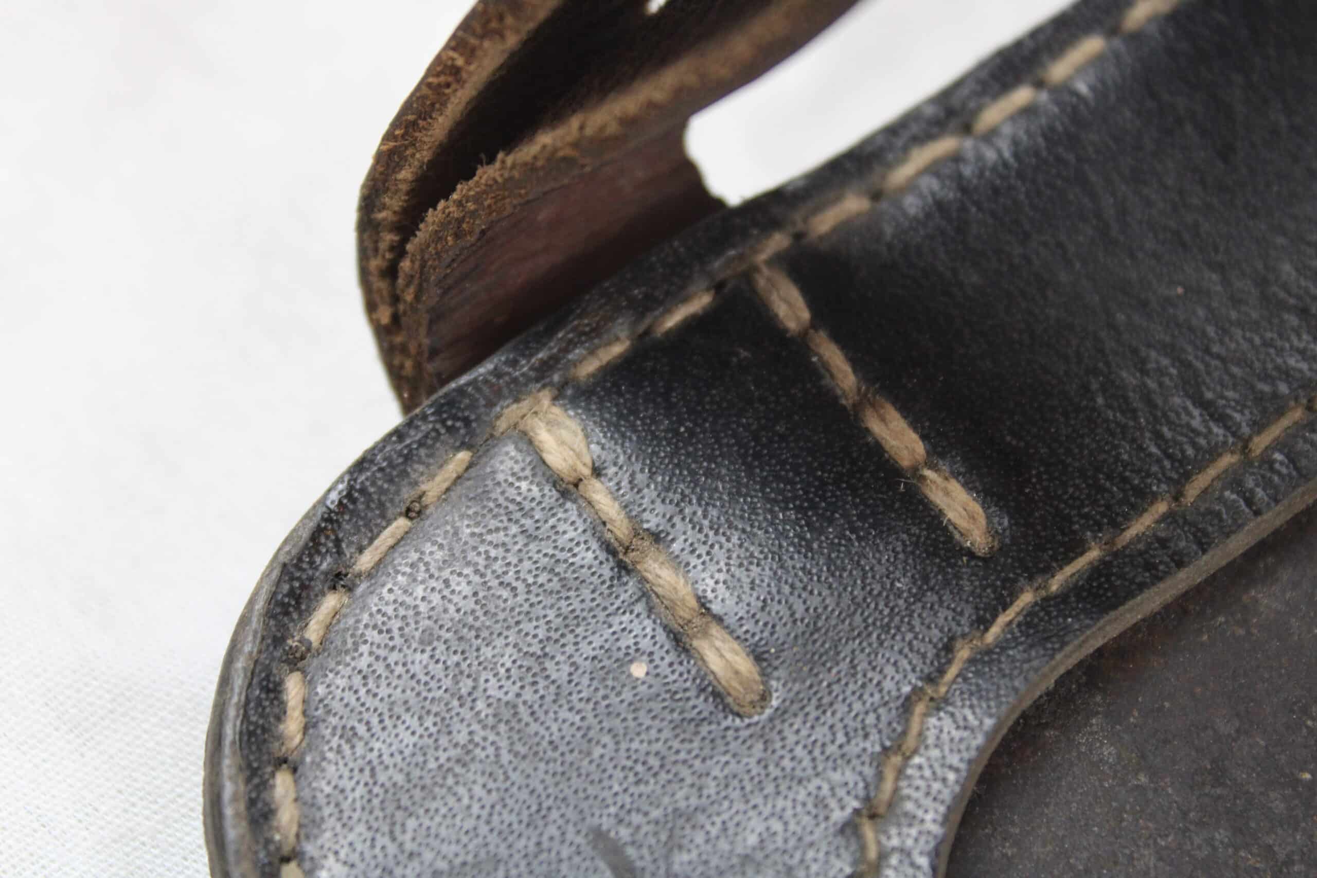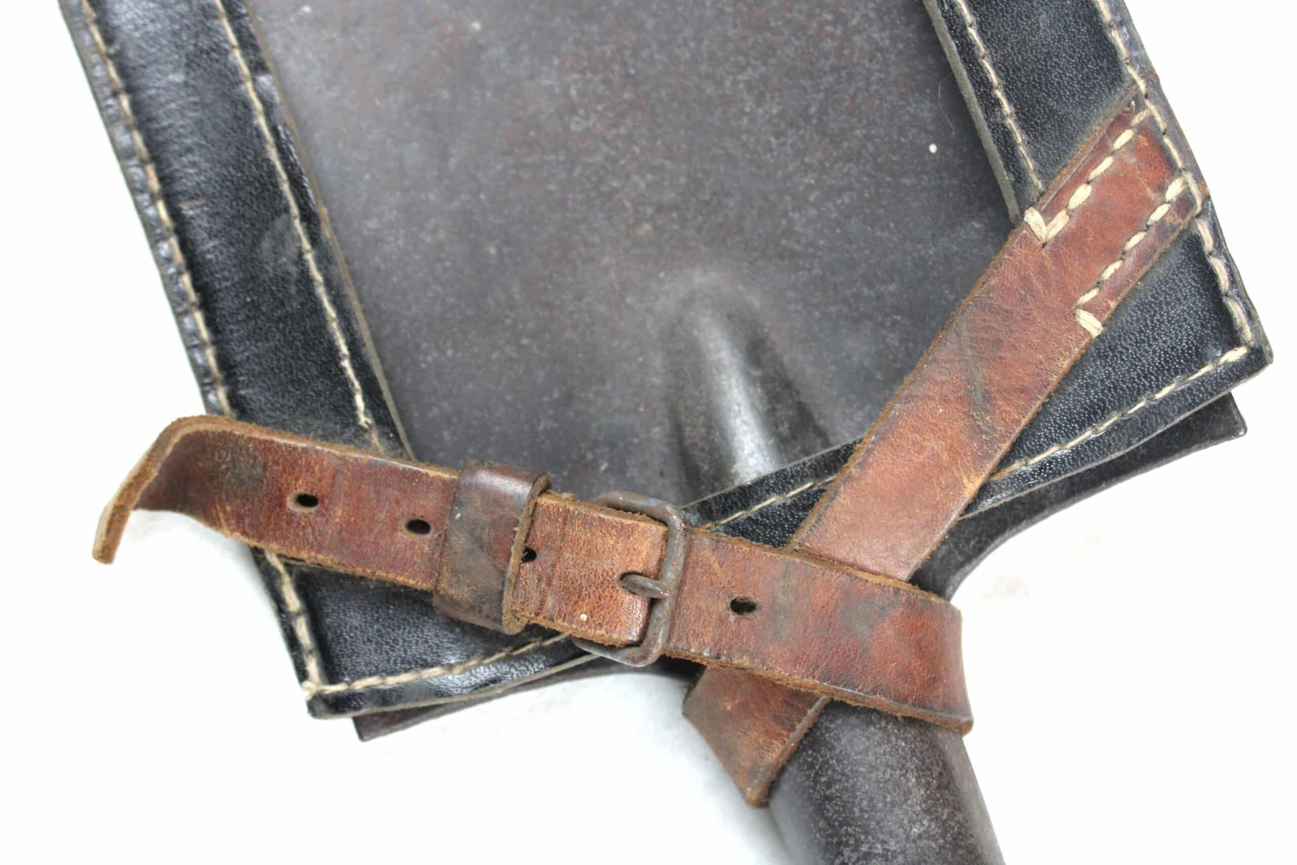 Pelle droite avec le logo du célèbre fabricant “REX” encore bien visible et code WaffenAmt sur le fer, base soudé conforme aux bonnes fabrication WW2, manche en très bon état solide, présente dans une housse Presstoff noir en très belle état, bien souple et sans fragilité. Passant de cienturon, sangle de serrage en cuir brun, bouclerie en très bon état.