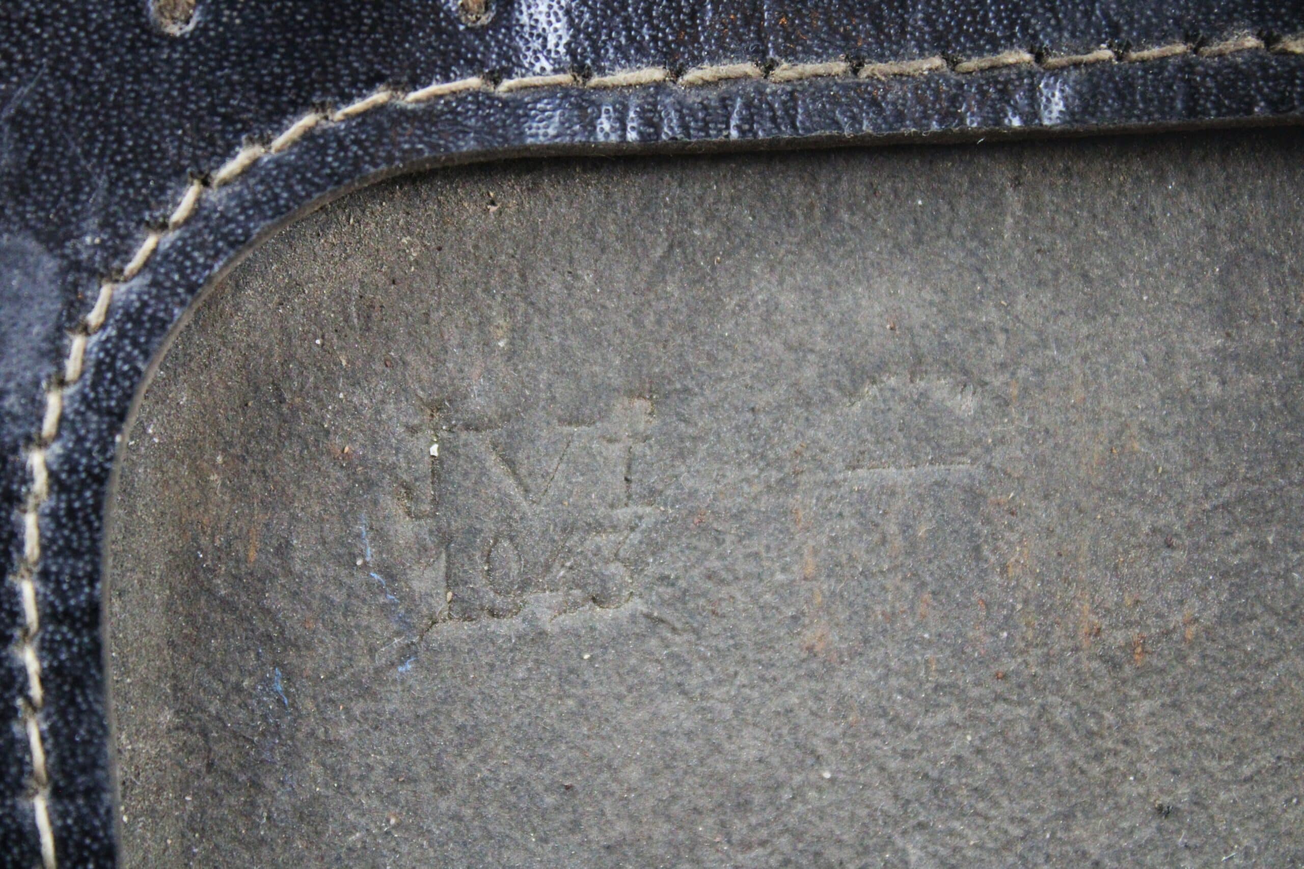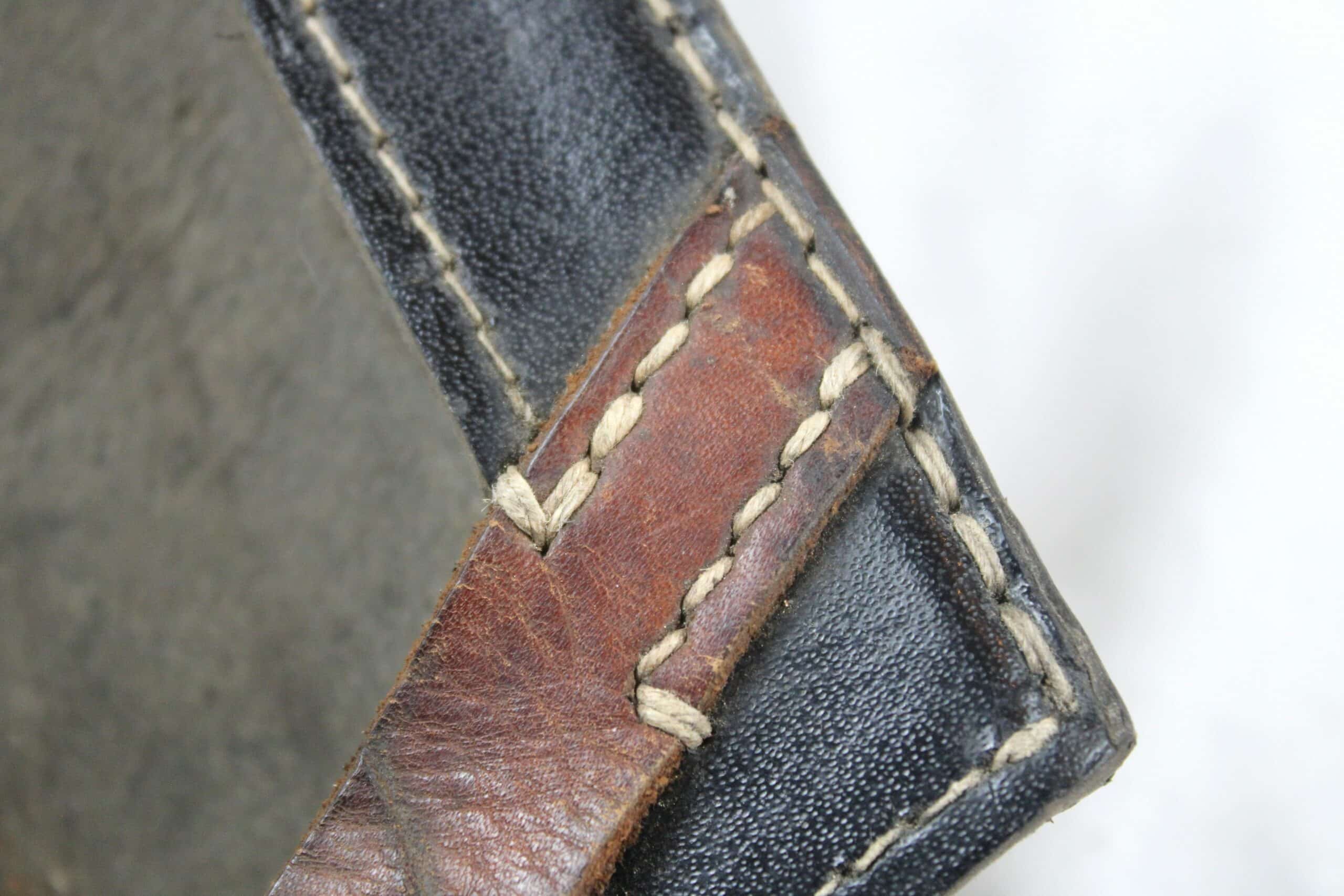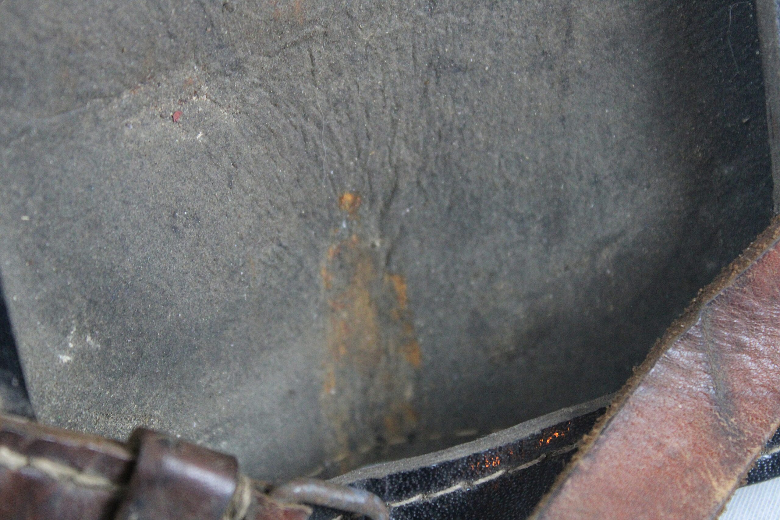 Pelle droite avec le logo du célèbre fabricant “REX” encore bien visible et code WaffenAmt sur le fer, base soudé conforme aux bonnes fabrication WW2, manche en très bon état solide, présente dans une housse Presstoff noir en très belle état, bien souple et sans fragilité. Passant de cienturon, sangle de serrage en cuir brun, bouclerie en très bon état.