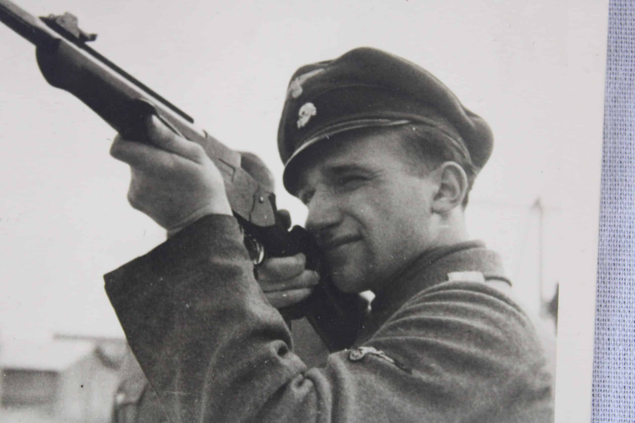 Photo en situation de chasse du SS Untersturmfuhrer Gerhard Knabe du SS-Pz. Nachr.Abt 9. Photo probablement prise lorsque la division Hohenstaufen se trouve en Picardie, début 1943.