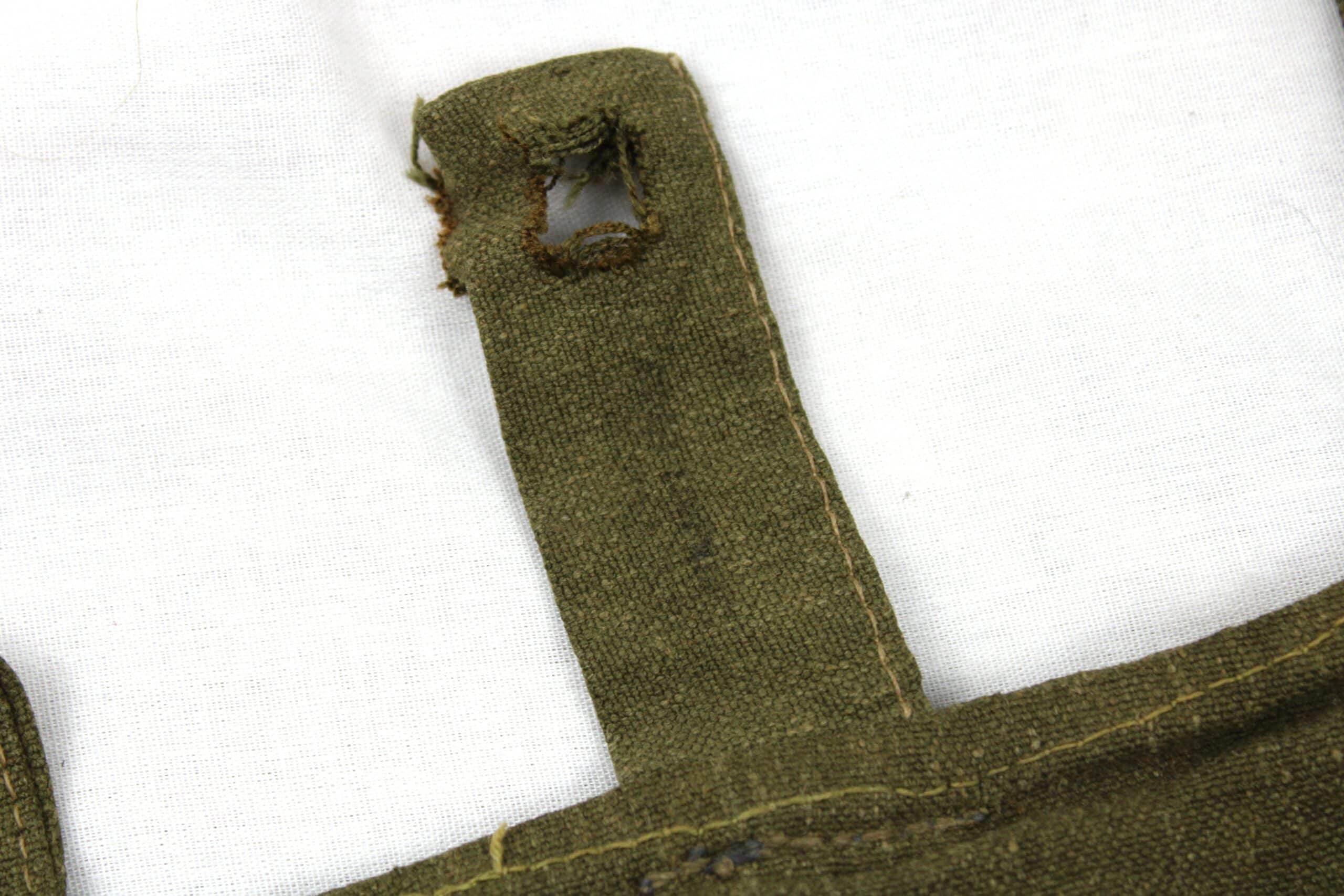 Sac à pain dans son jus de découverte de la région de Brest, crochet de ceinturon manquant, bouton d’un des deux passant également absent, tous les autres boutons sont en revanche montés d’origine, les cuirs et boucleries sont en bon état. Le bouton du passant se trouve à l’intérieur du sac.