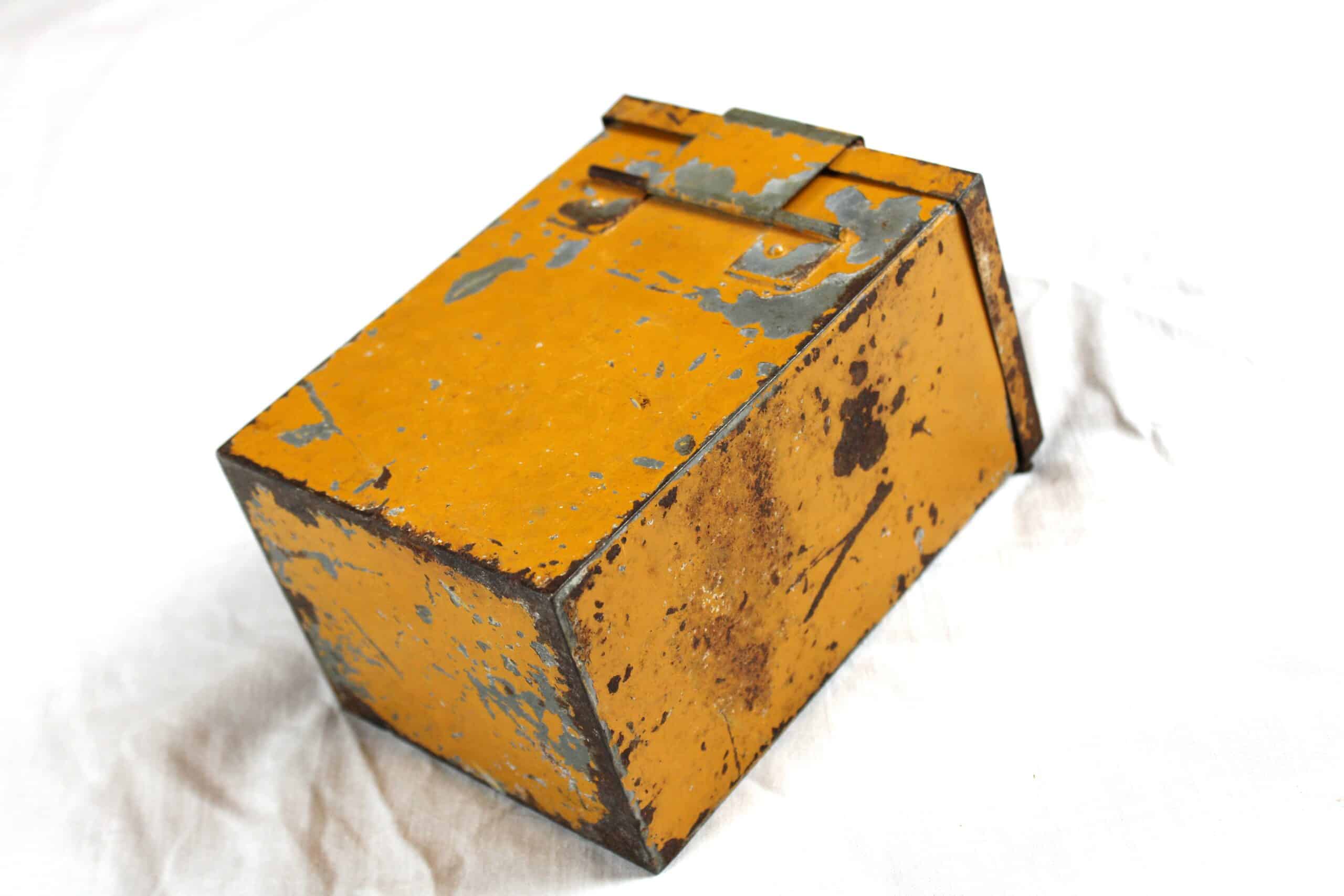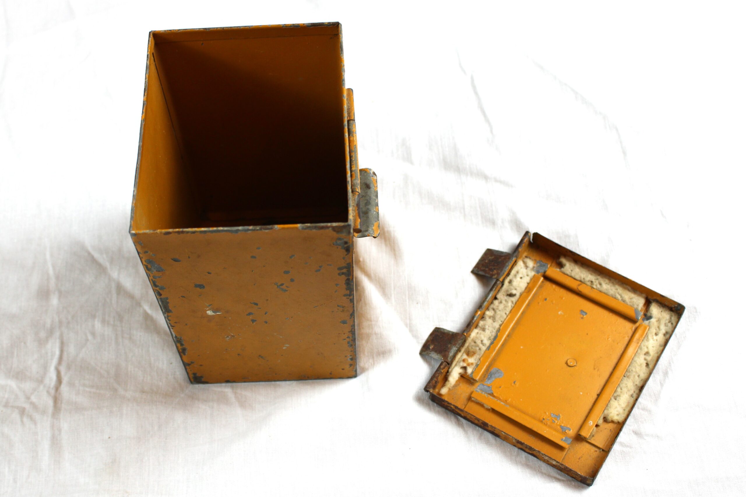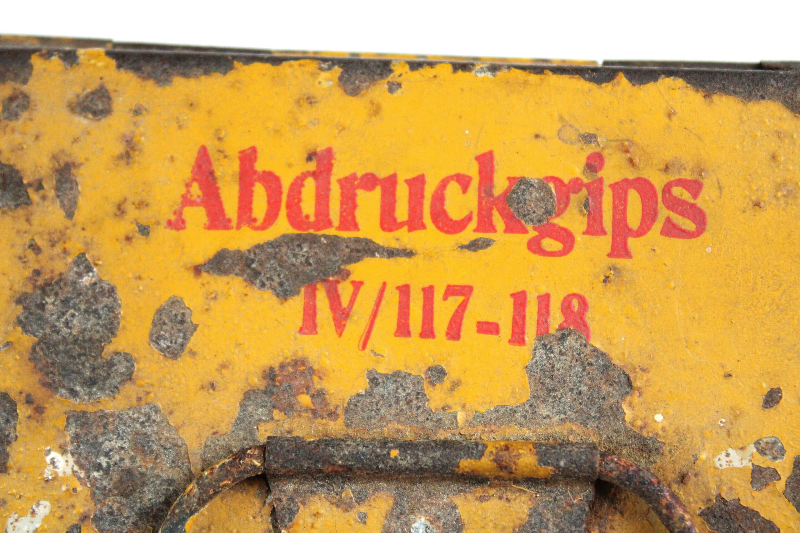 Peinture jaune d’origine avec ses marquages, pas de WaffenAmt ni de fabricant. Poignée et fermeture fonctionnelles, malheureusement les charnières sont dessoudées  mais présentes, ce qui ne gêne en rien pour la présentation en vitrine. Peut être facilement réparé puisque soudé normalement à l’étain.