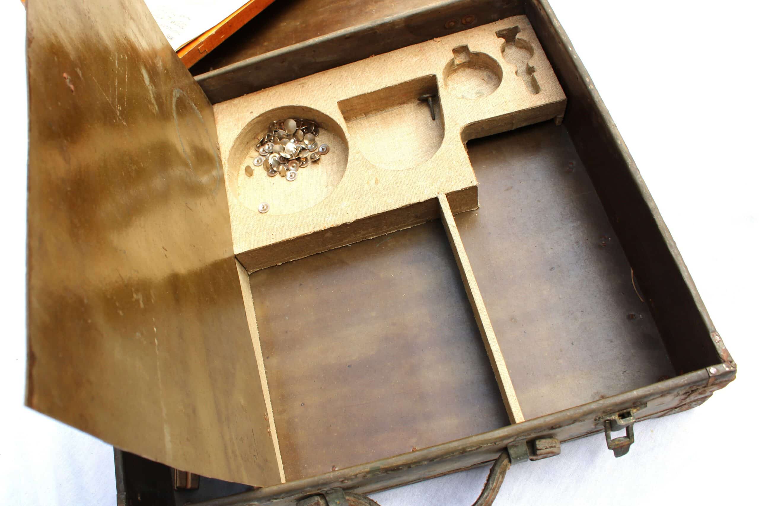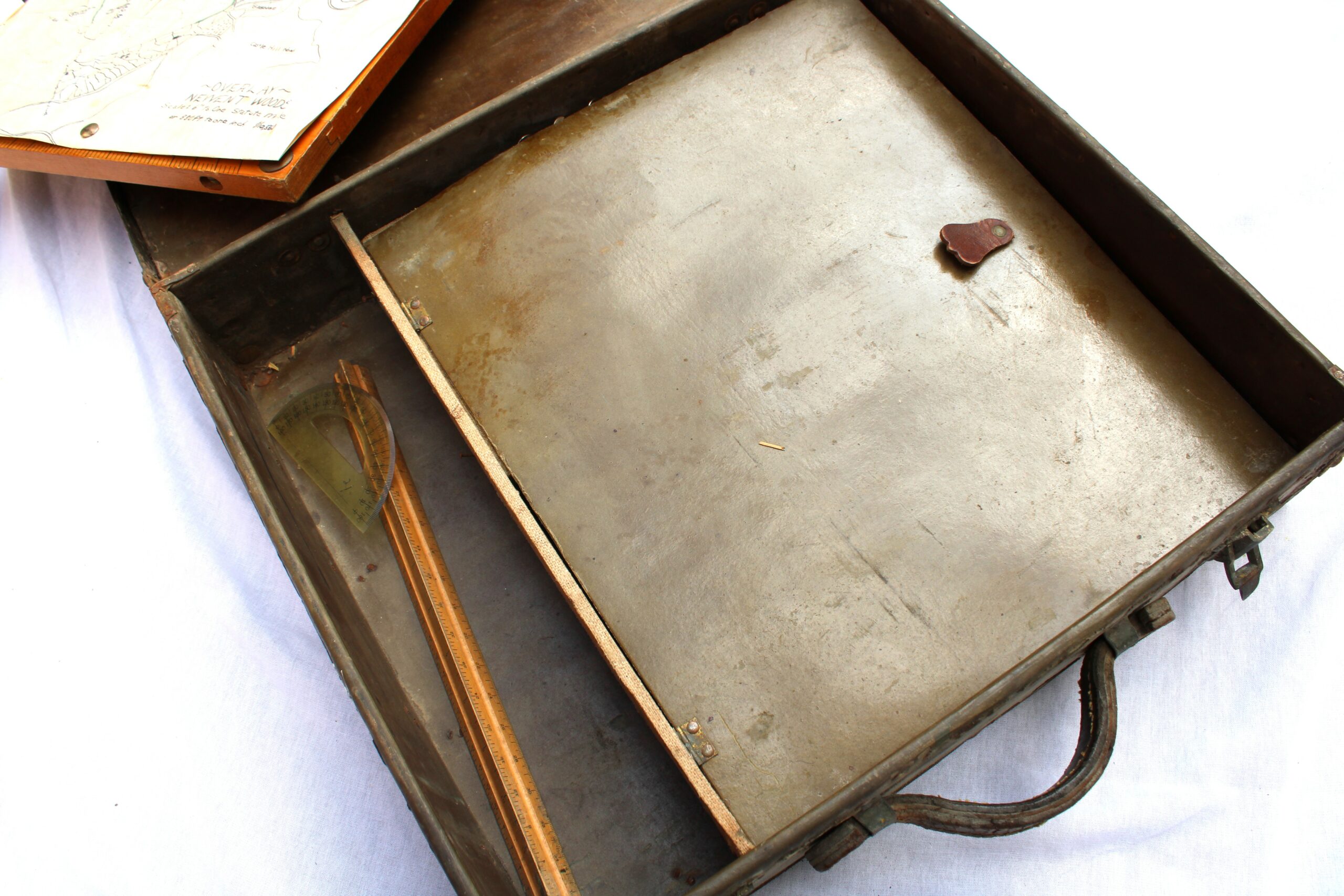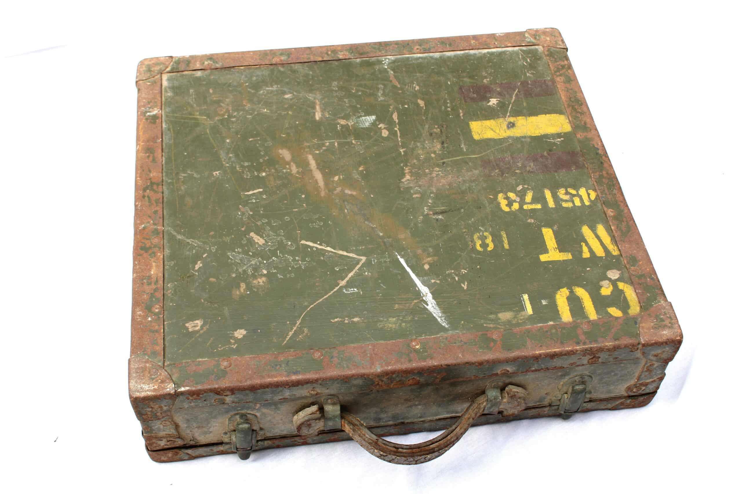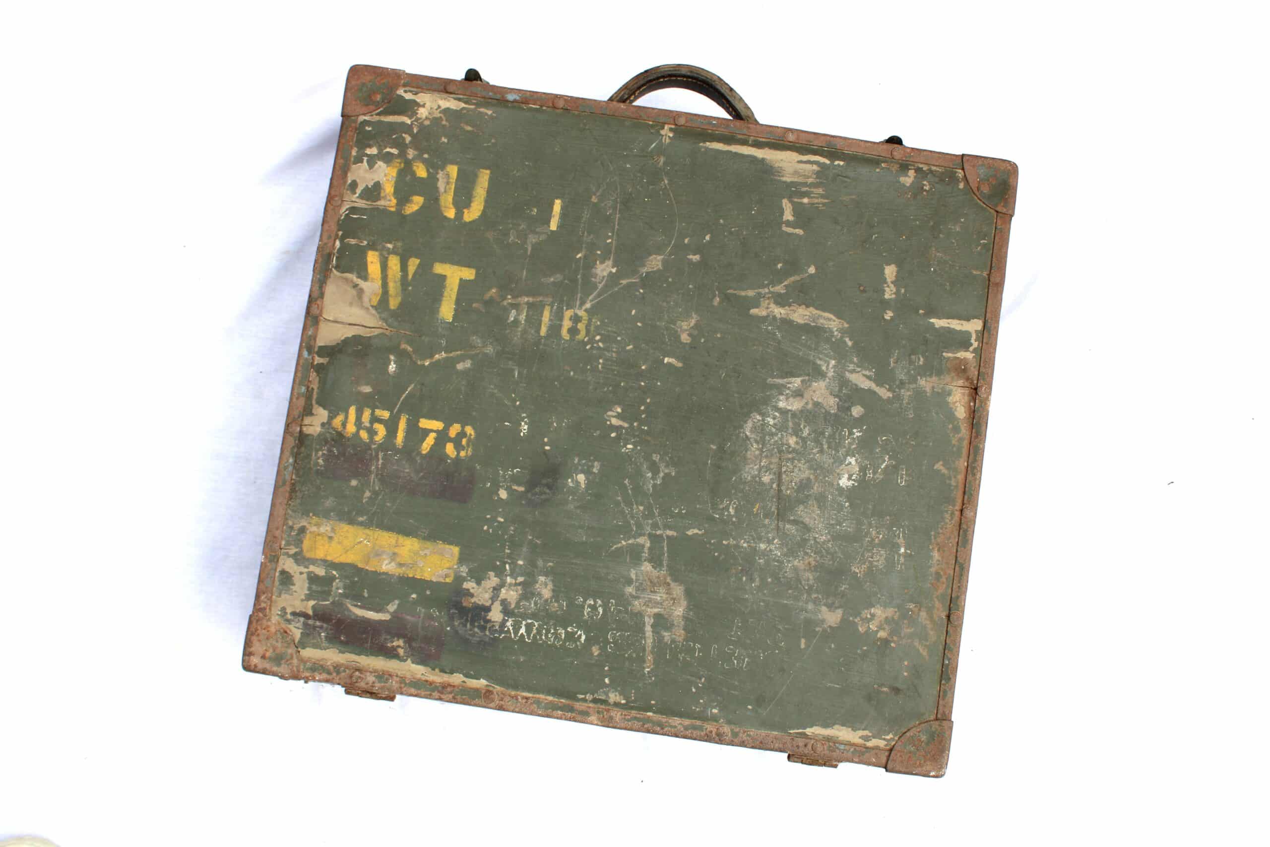 Caisse destinée au transport du kit « Sketching Map Board » de l’Engineer , superbe code TQM peint sur les deux faces, poignée cuir en bon état, système de fermeture présent et fonctionnel, la caisse possède un jus incroyable.