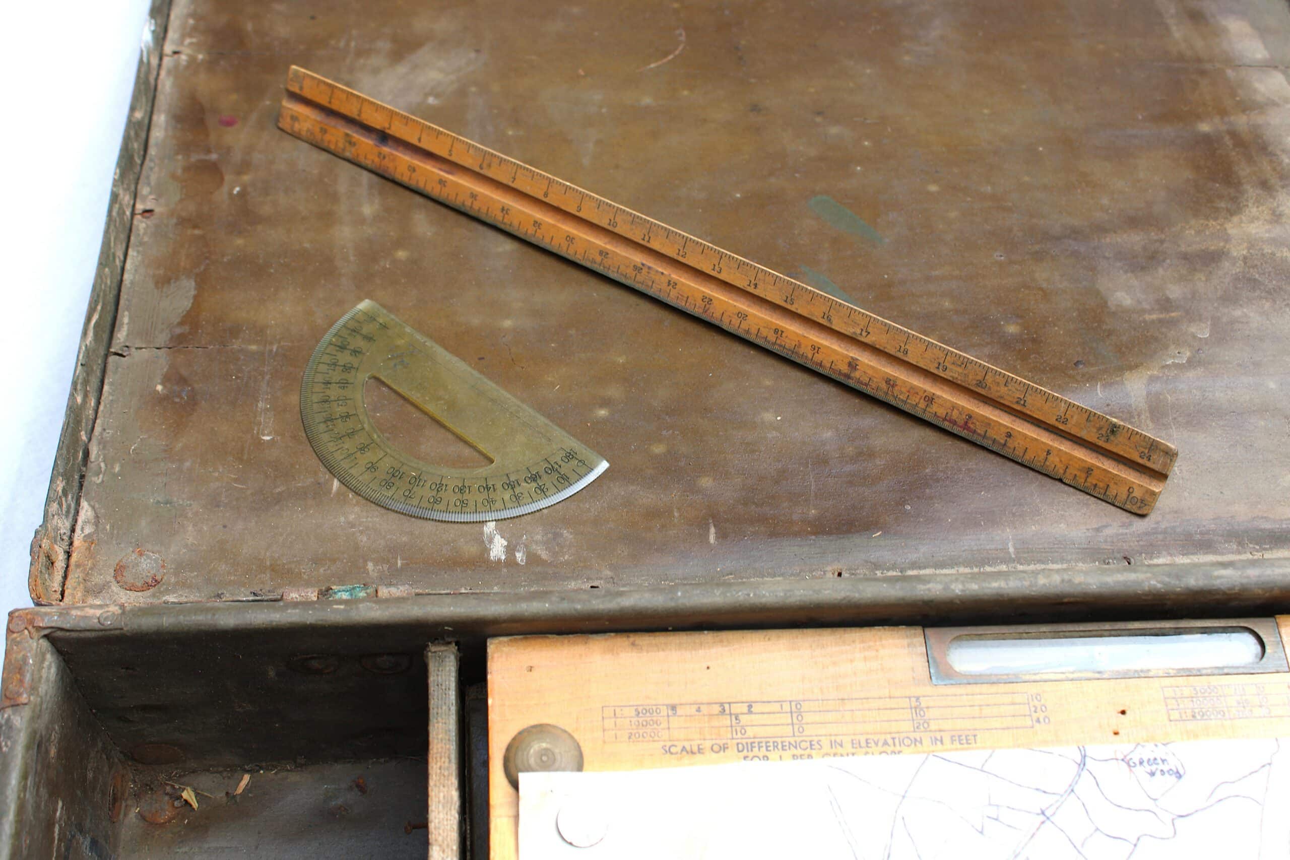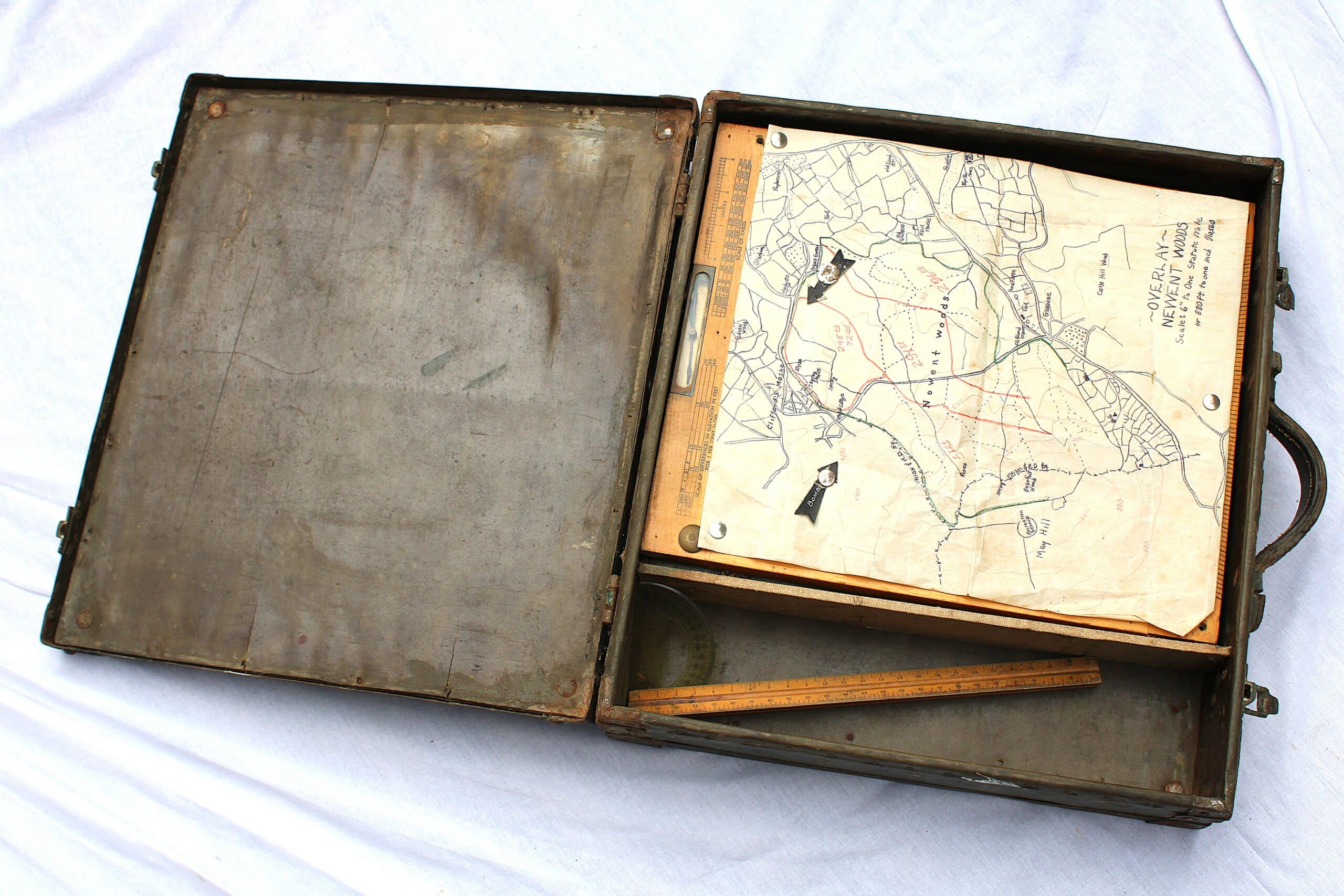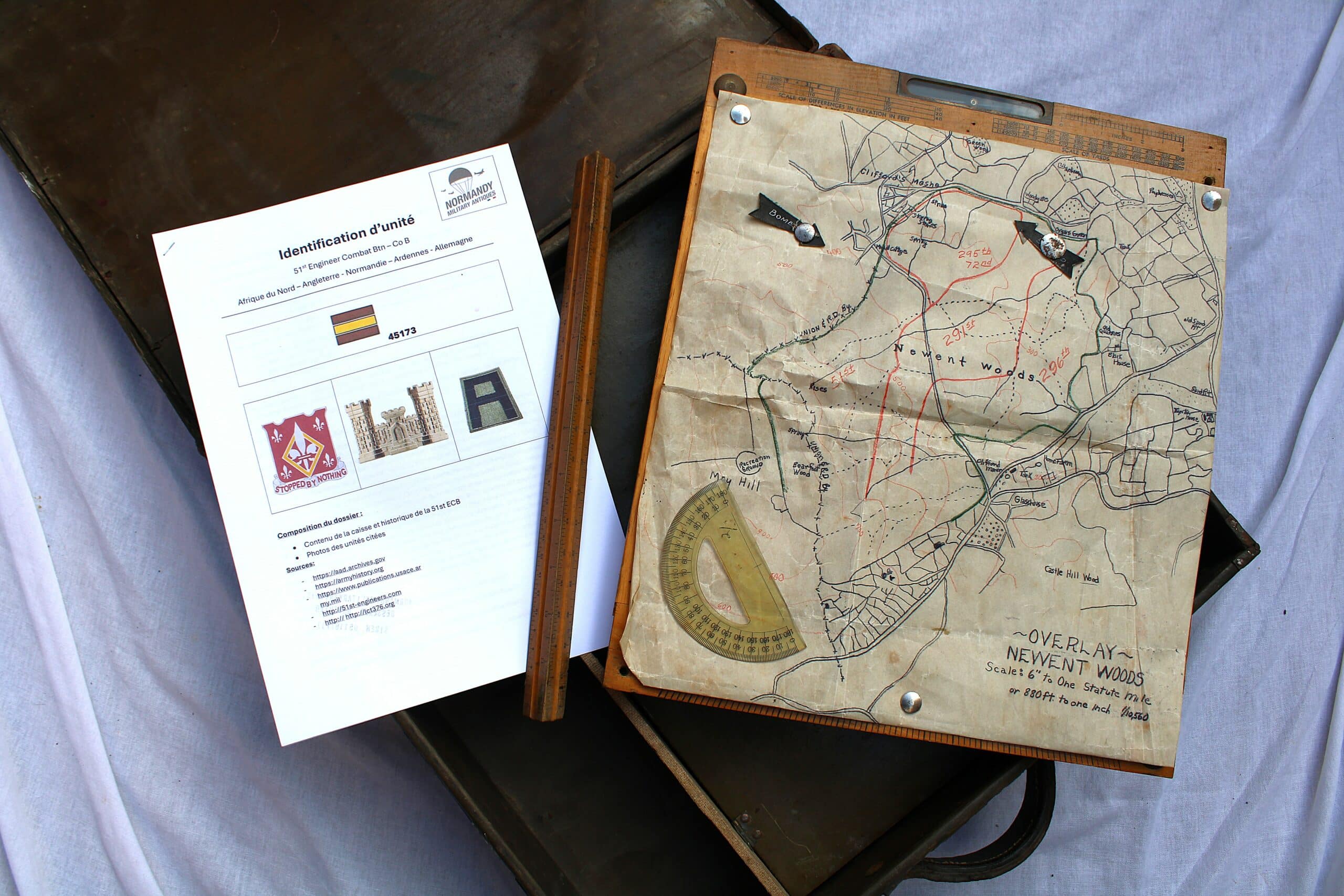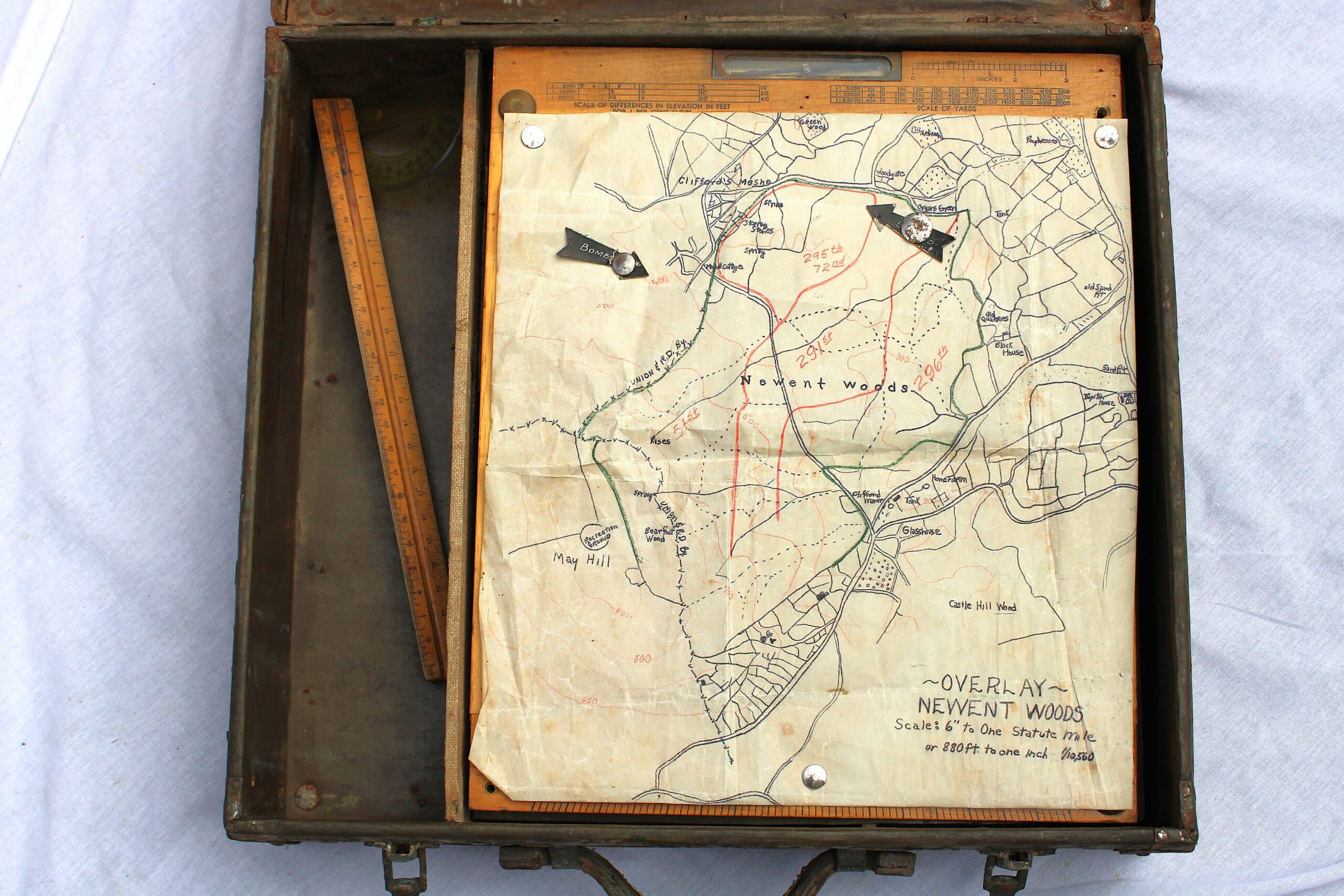 A l’intérieur se trouve la planche « Sketching Board Model 1913 » en très bel état , ainsi qu’une règle à échelle de fabrication US avec initiales de l’utilisateur présentes, un rapporteur d’angle de fabrication anglaise en Plexiglass, sous le rabat du compartiment intérieur se trouve un gros lot de punaises. Sur le Sketching Board se trouve une carte sur calque, en place d’origine, identifiant un exercice en Angleterre nommé « OVERLAY » qui s’est déroulé dans la Newent Woods dans le sud ouest de l’Angleterre, sur lequel nous pouvons identifier différentes unités Engineer.