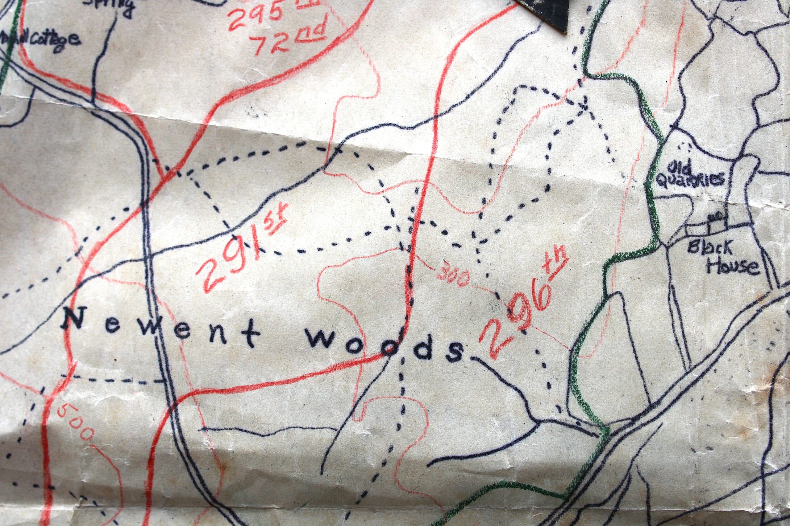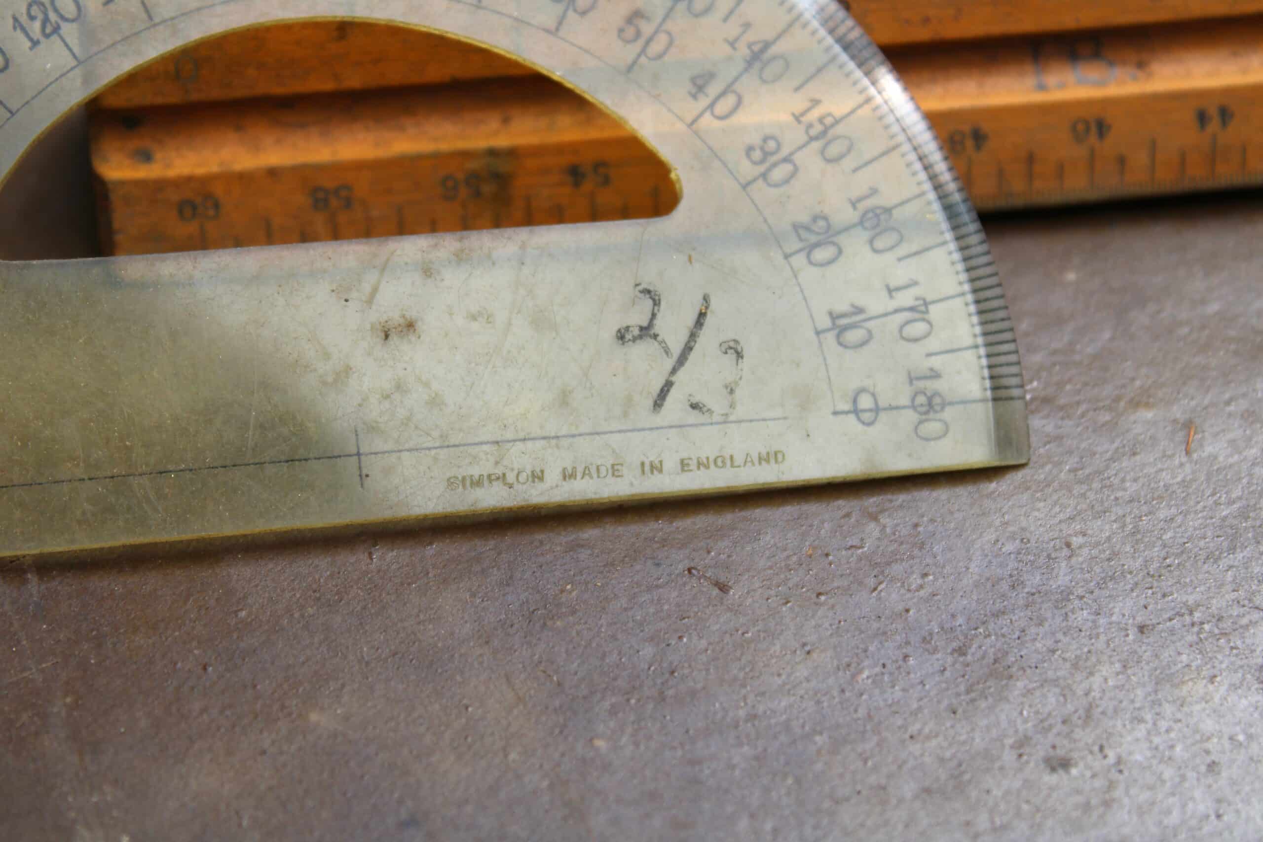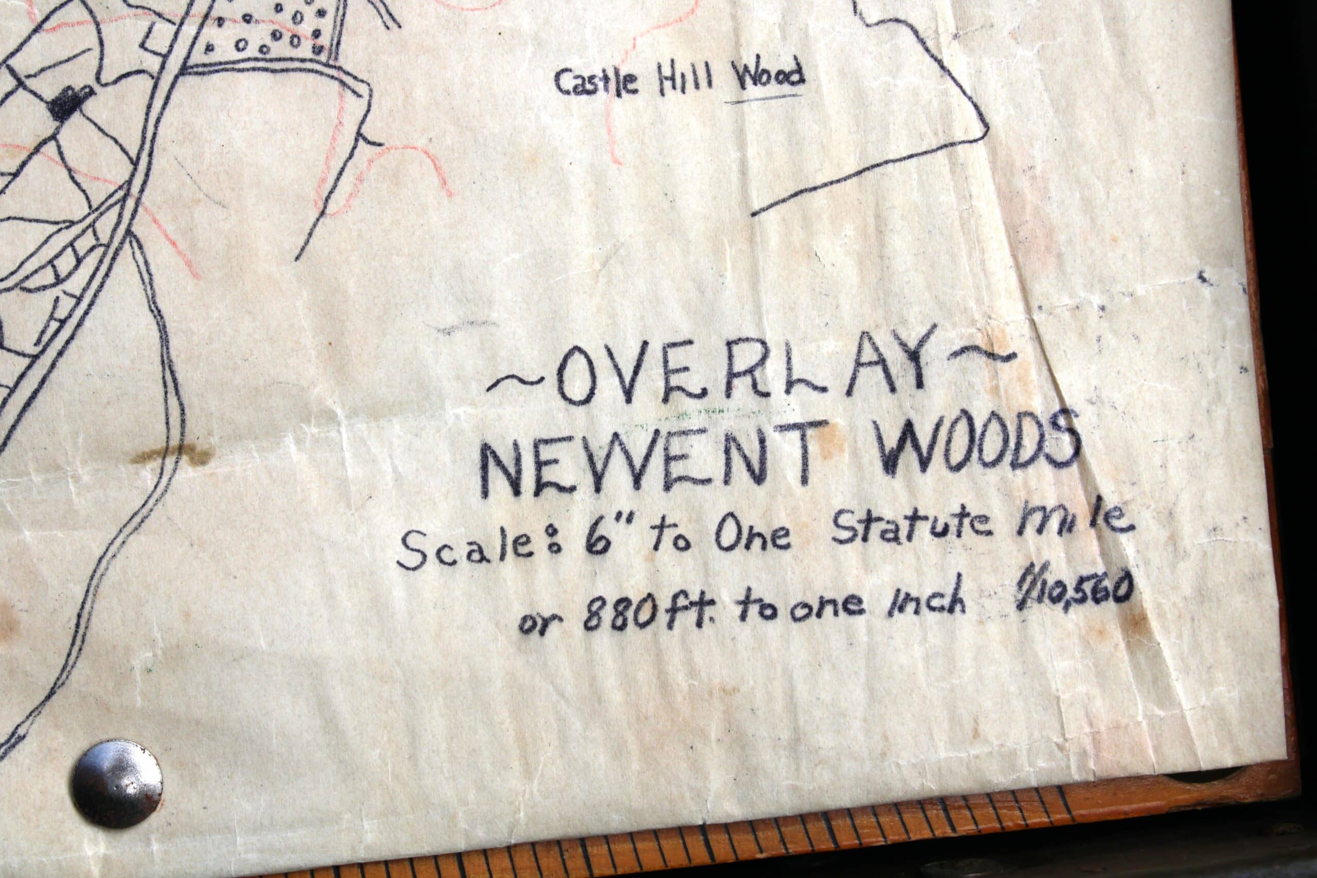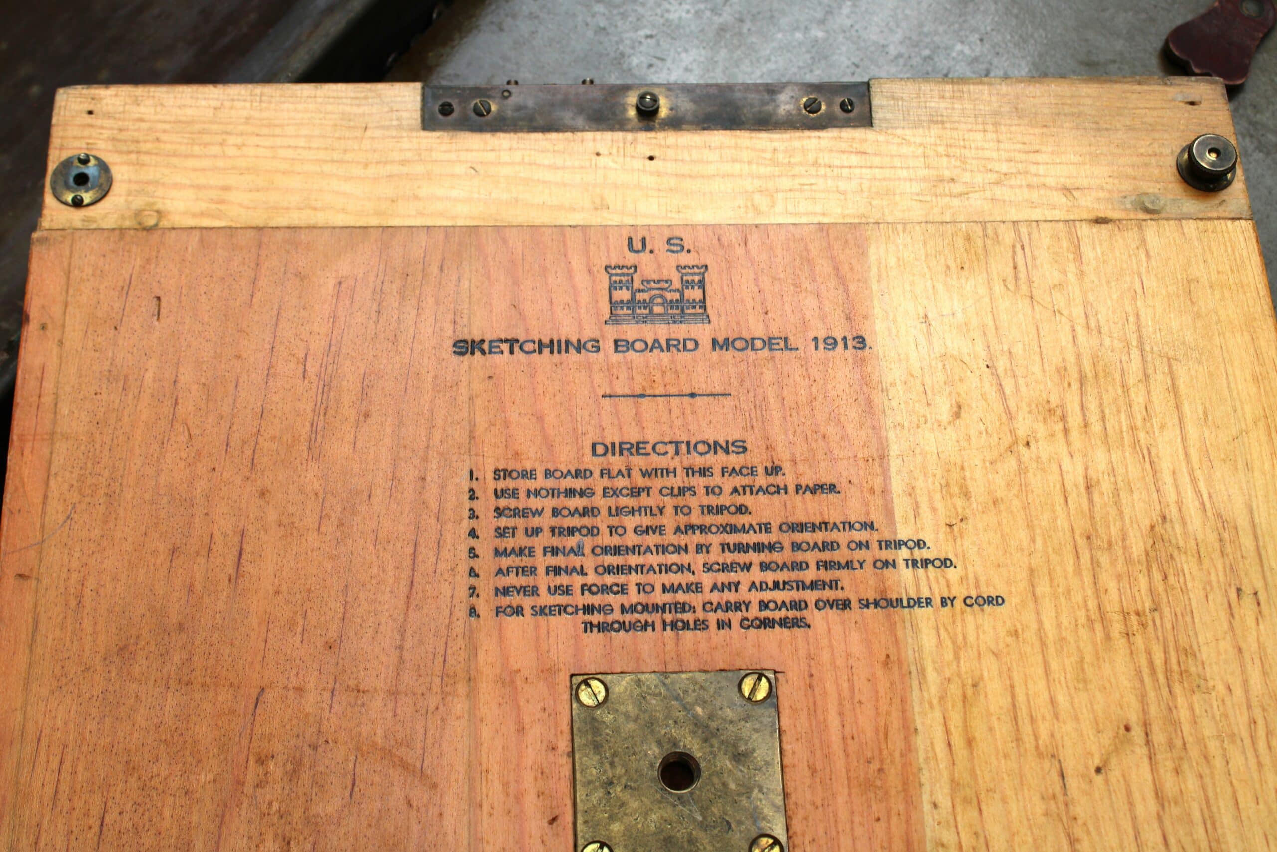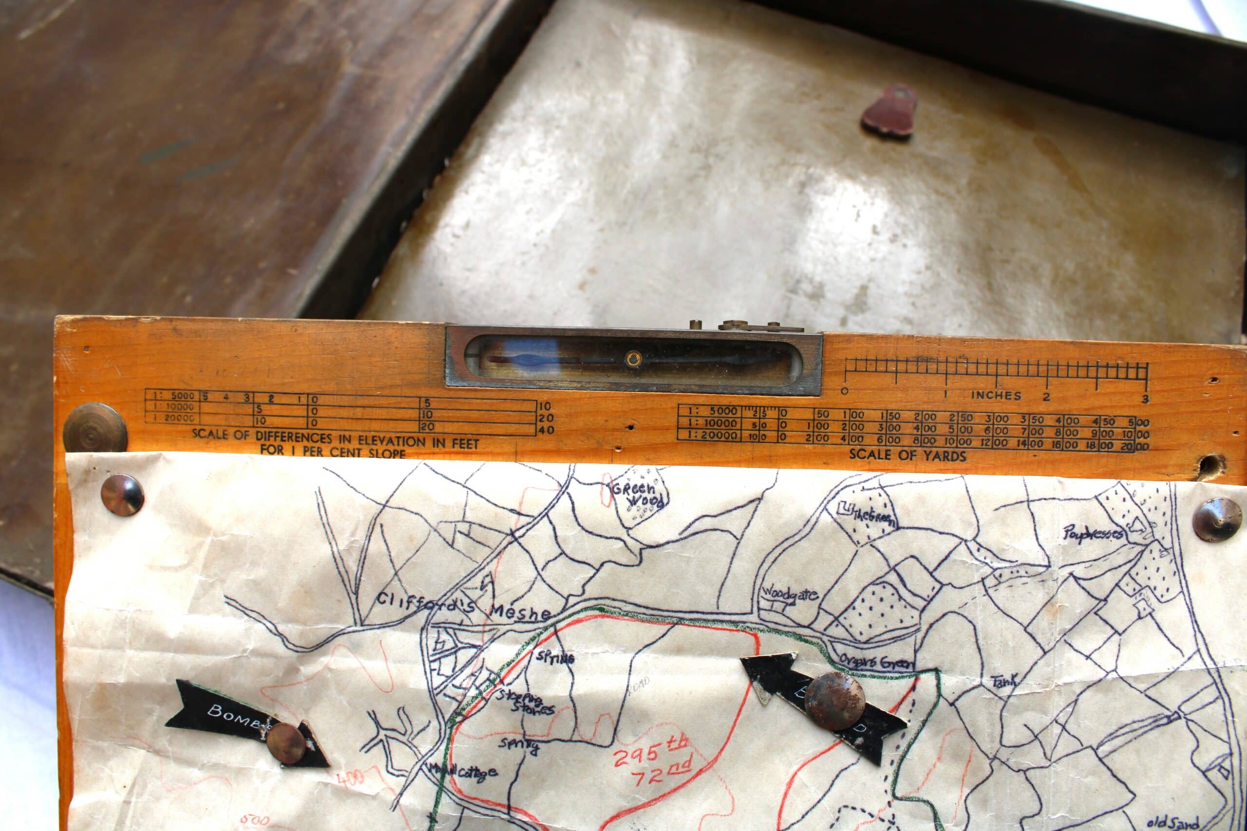 A l’intérieur se trouve la planche « Sketching Board Model 1913 » en très bel état , ainsi qu’une règle à échelle de fabrication US avec initiales de l’utilisateur présentes, un rapporteur d’angle de fabrication anglaise en Plexiglass, sous le rabat du compartiment intérieur se trouve un gros lot de punaises. Sur le Sketching Board se trouve une carte sur calque, en place d’origine, identifiant un exercice en Angleterre nommé « OVERLAY » qui s’est déroulé dans la Newent Woods dans le sud ouest de l’Angleterre, sur lequel nous pouvons identifier différentes unités Engineer.