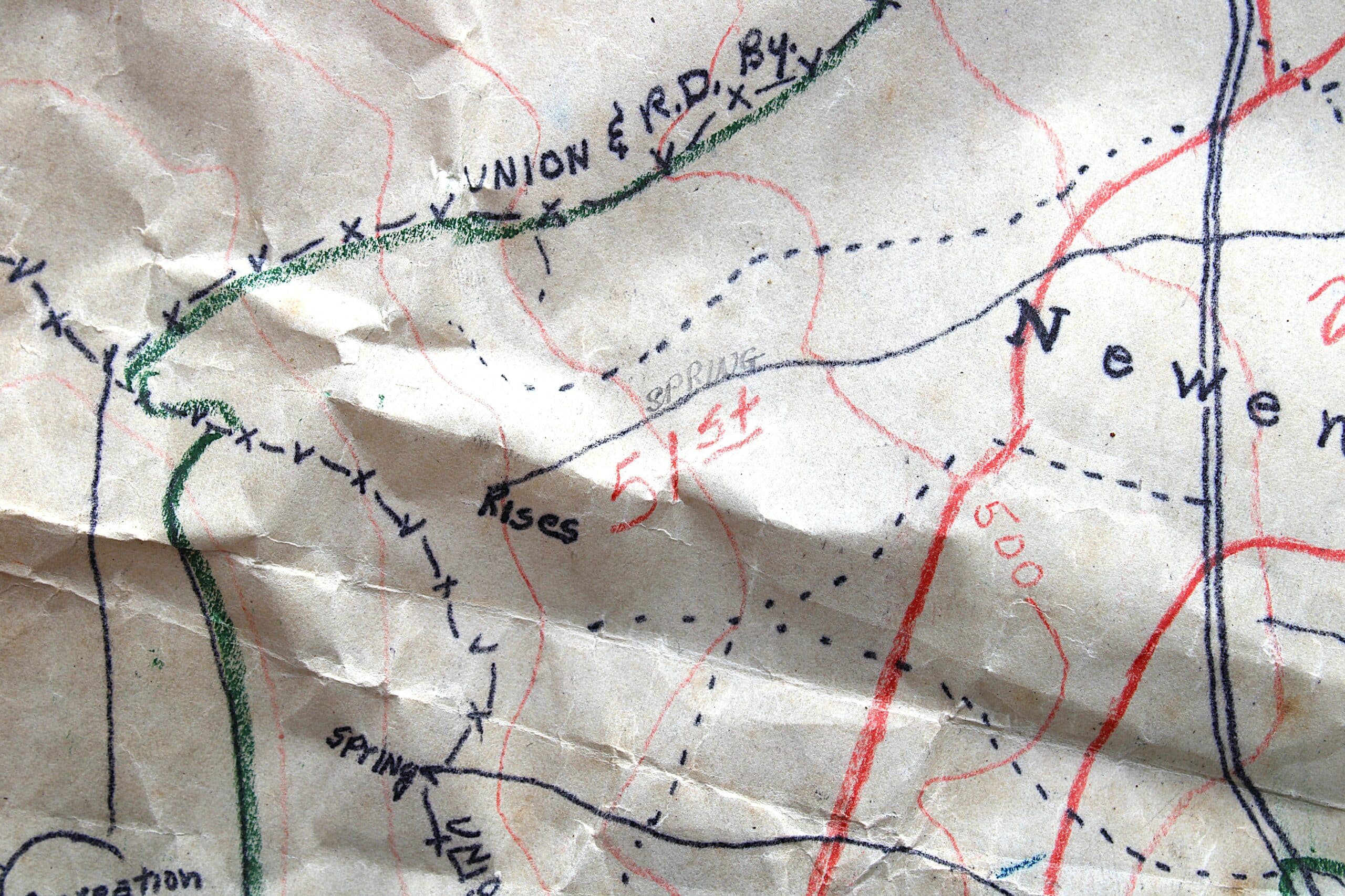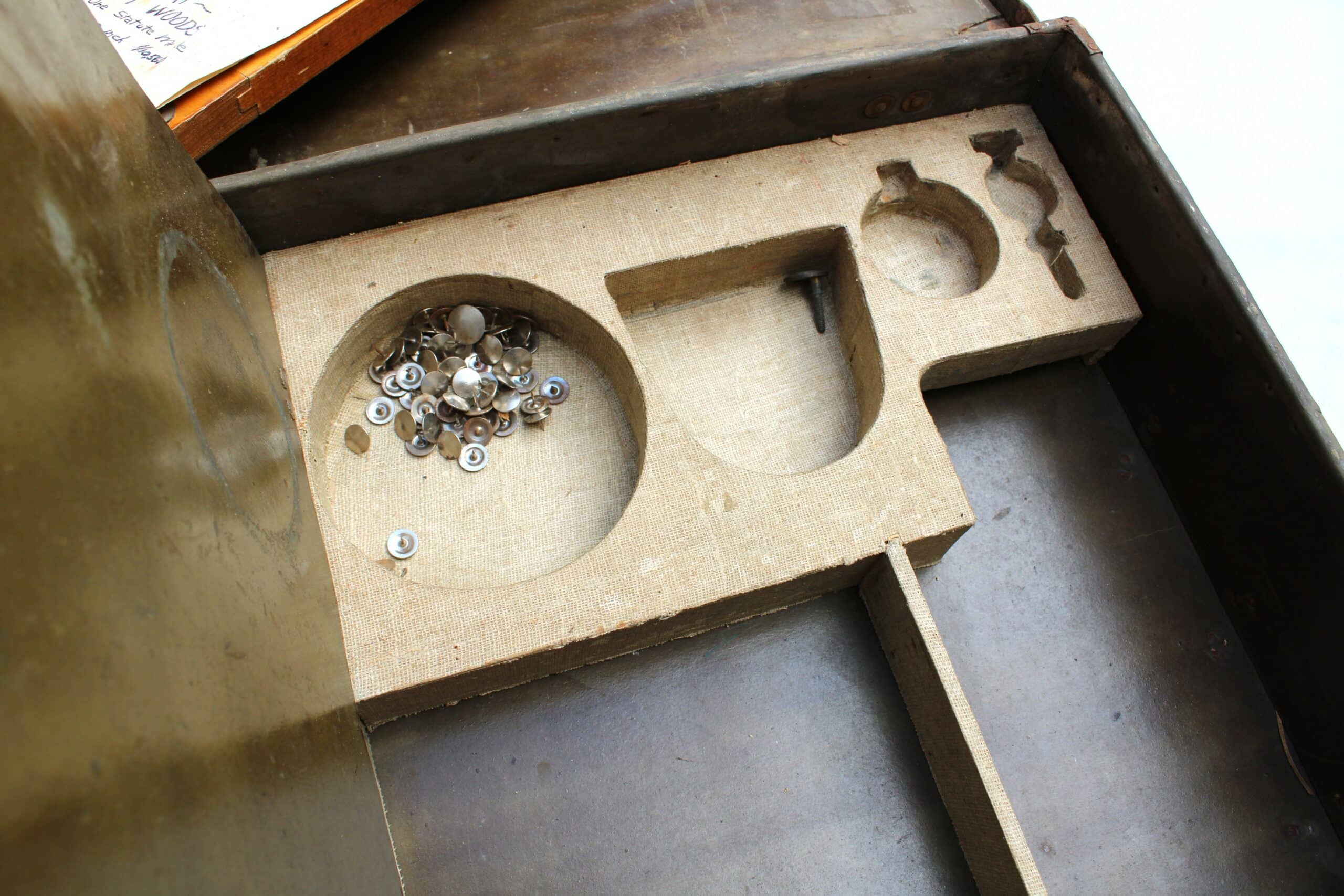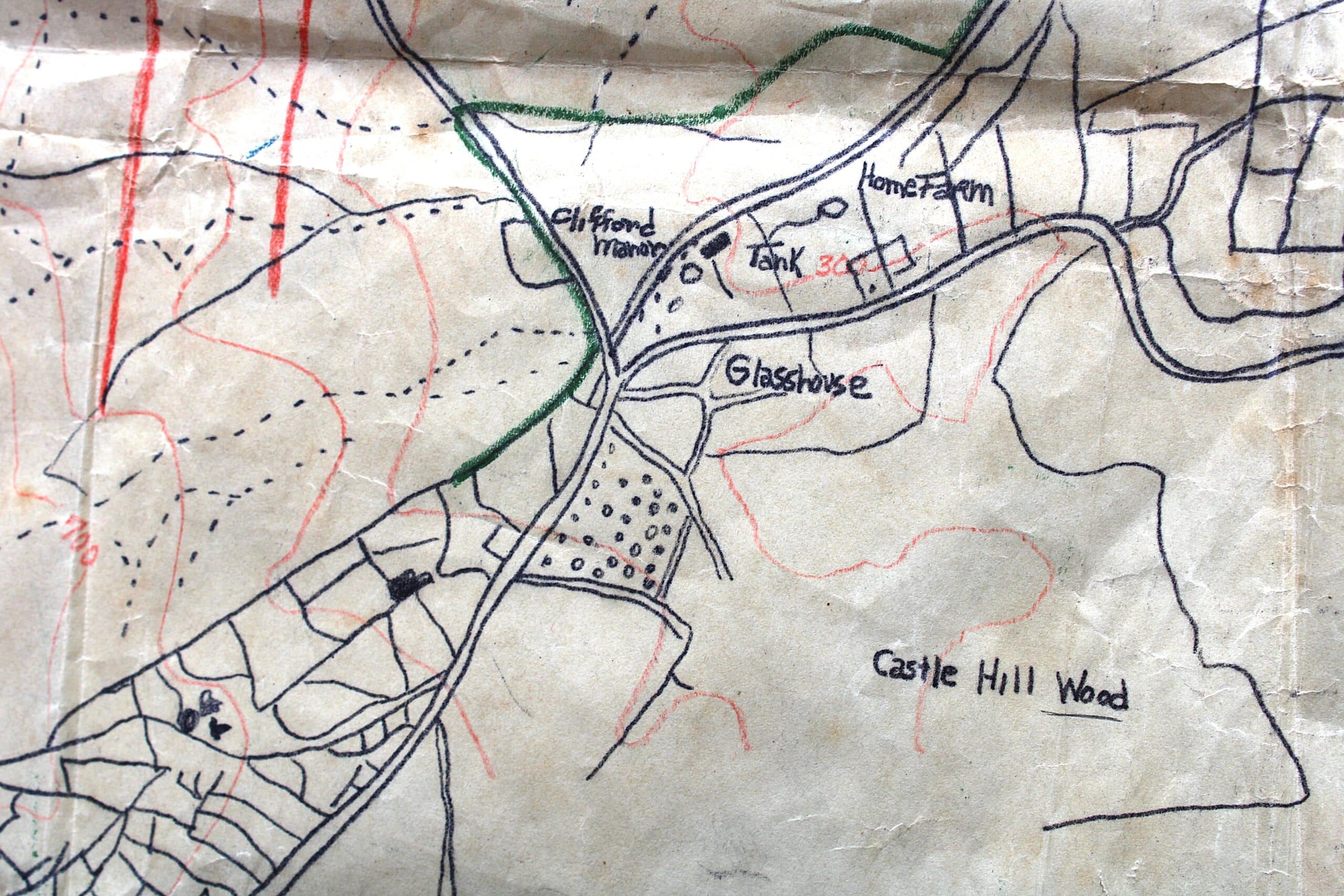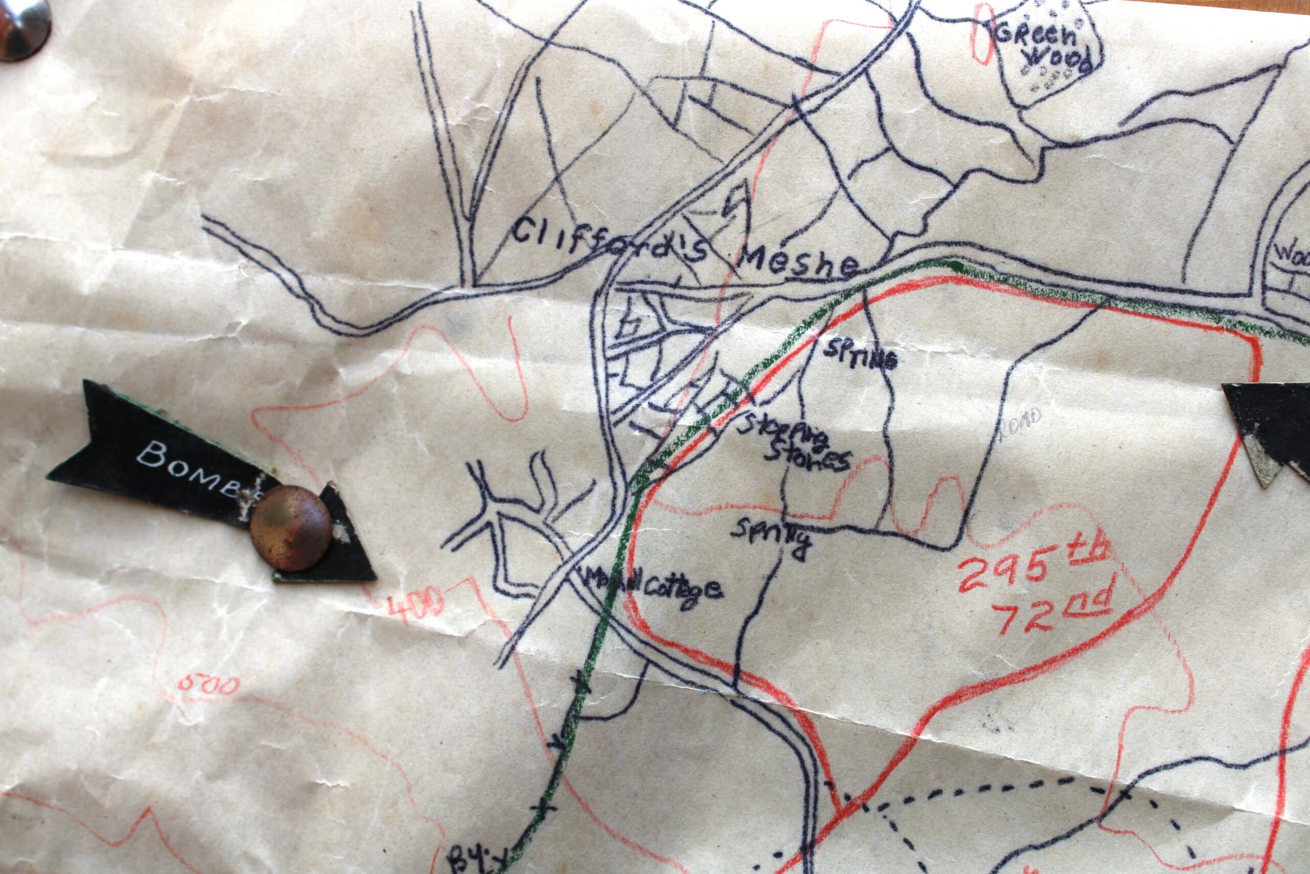 A l’intérieur se trouve la planche « Sketching Board Model 1913 » en très bel état , ainsi qu’une règle à échelle de fabrication US avec initiales de l’utilisateur présentes, un rapporteur d’angle de fabrication anglaise en Plexiglass, sous le rabat du compartiment intérieur se trouve un gros lot de punaises. Sur le Sketching Board se trouve une carte sur calque, en place d’origine, identifiant un exercice en Angleterre nommé « OVERLAY » qui s’est déroulé dans la Newent Woods dans le sud ouest de l’Angleterre, sur lequel nous pouvons identifier différentes unités Engineer.