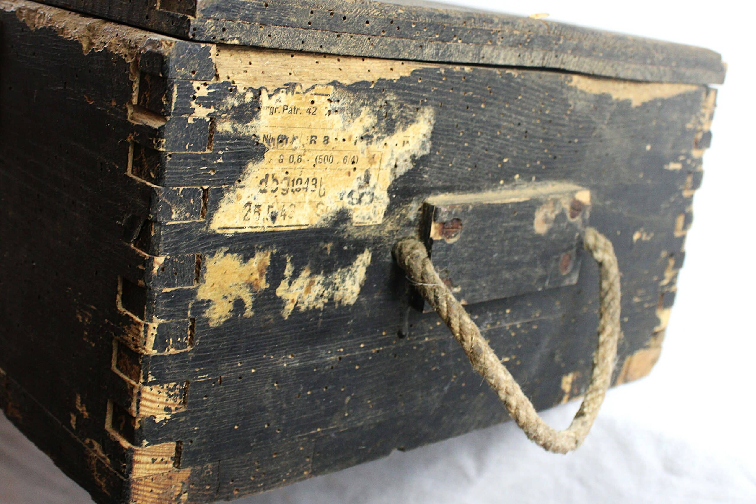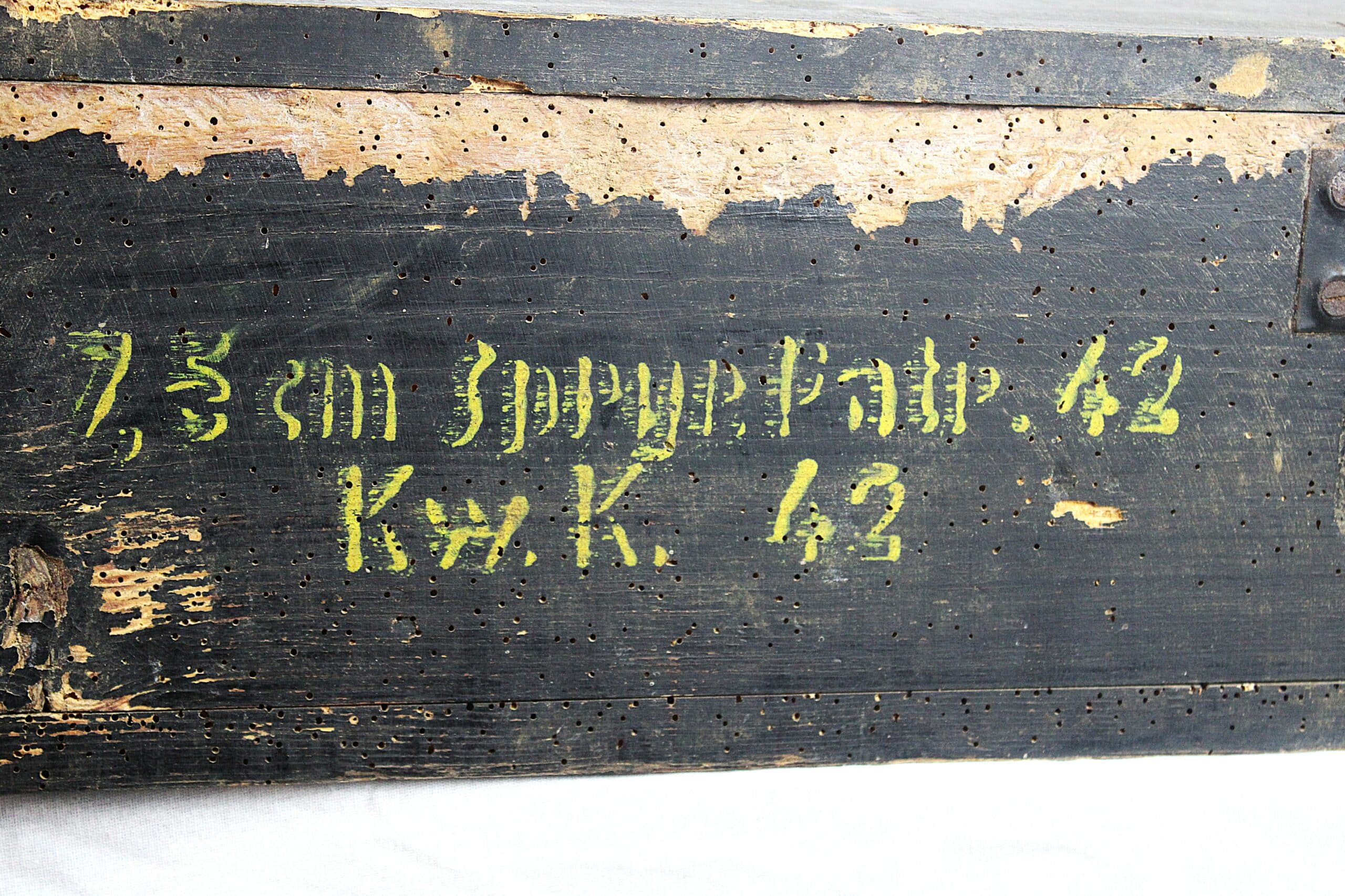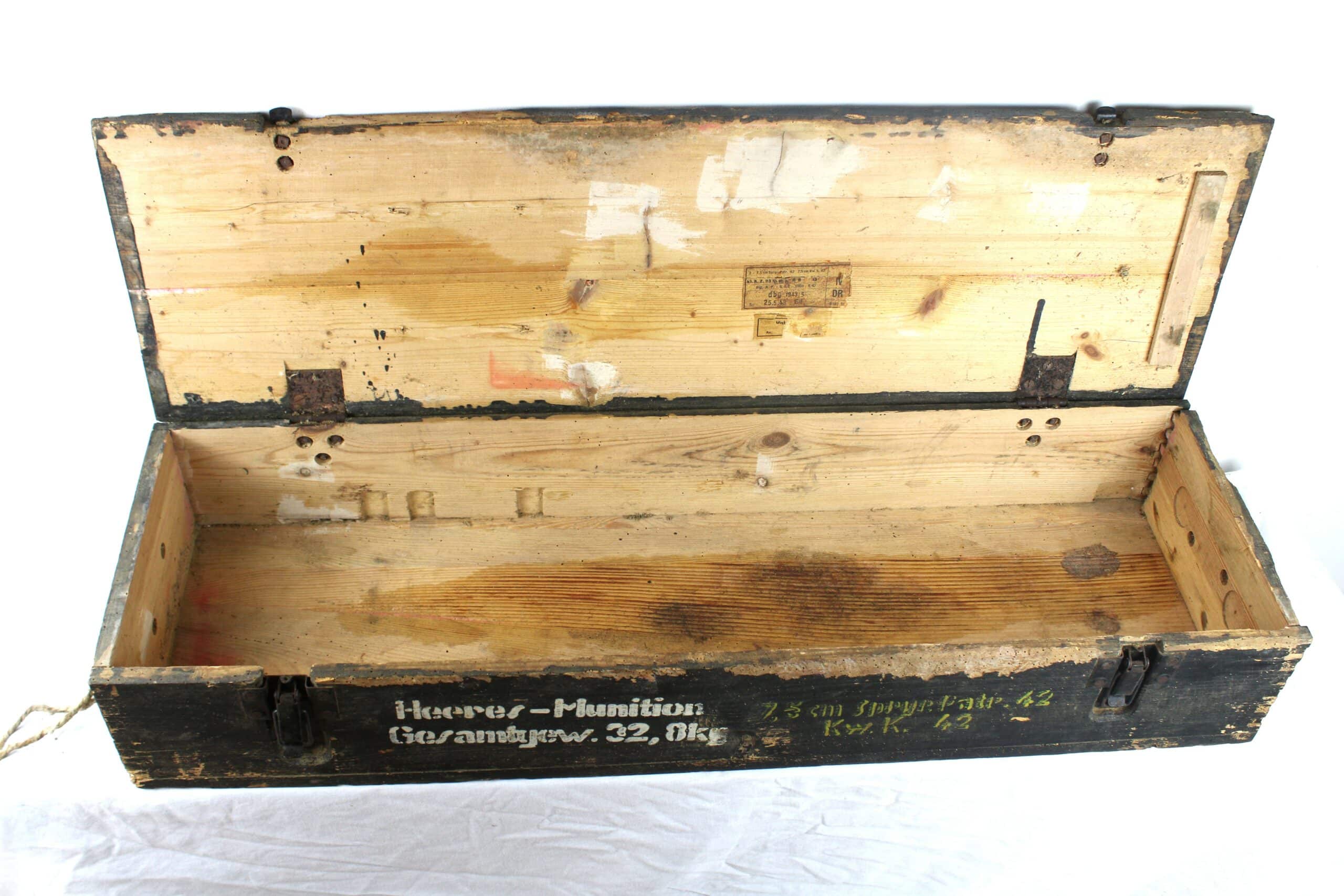 Très beaux marquages sur l’ensemble de la pièce, étiquette présente sur le coté droit de la caisse et à l’intérieur indiquant que celle-ci est destinée au transport d’obus explosifs.