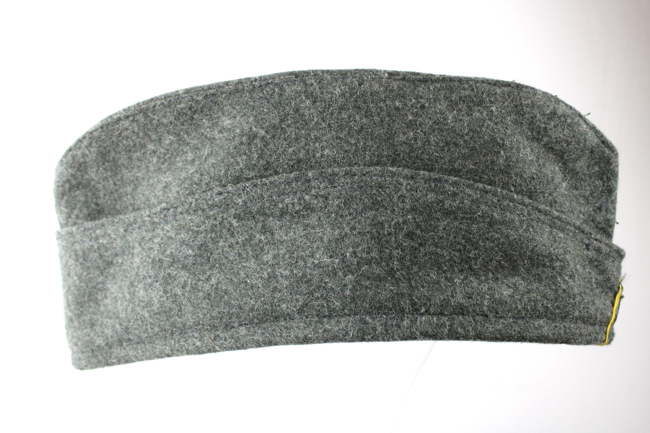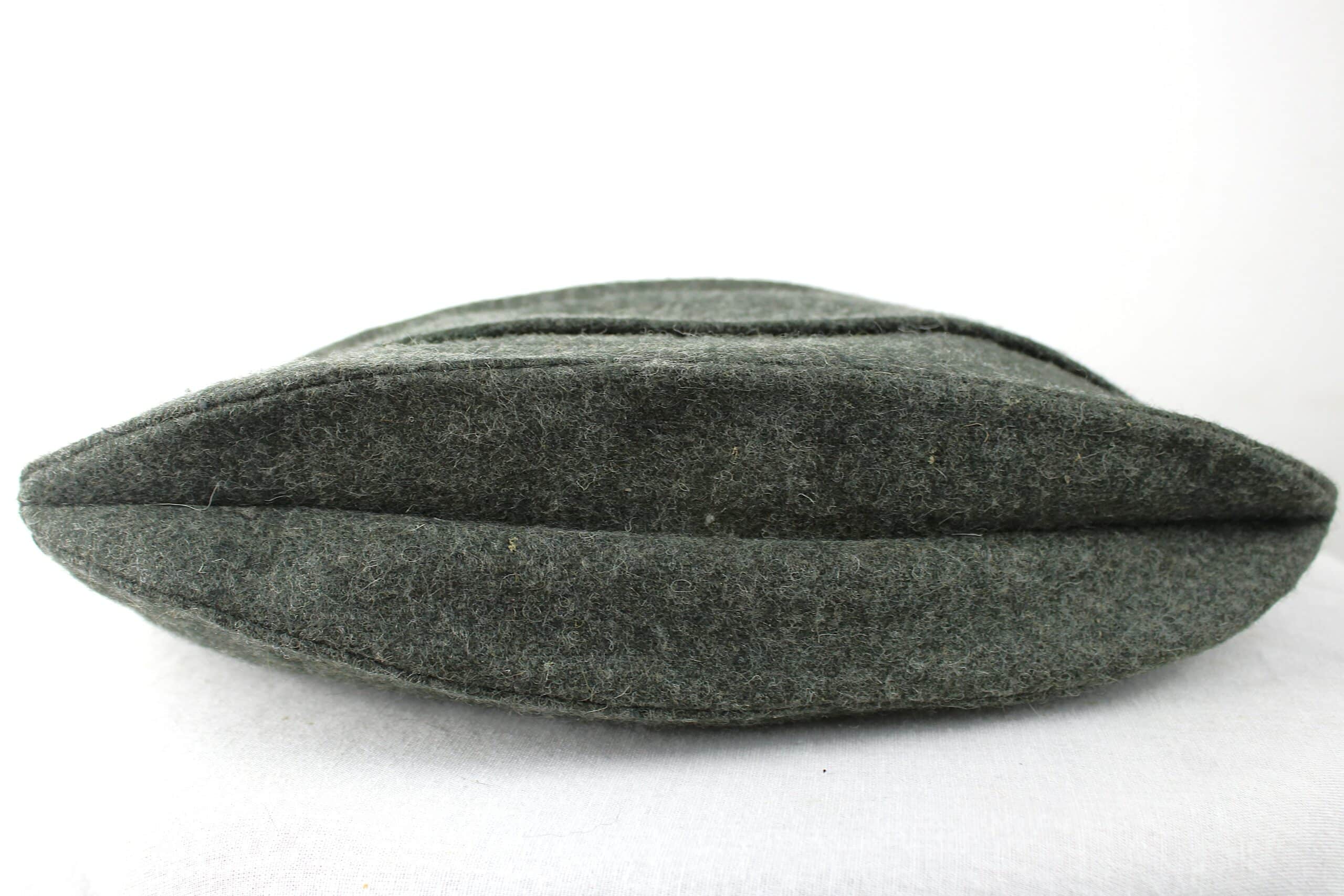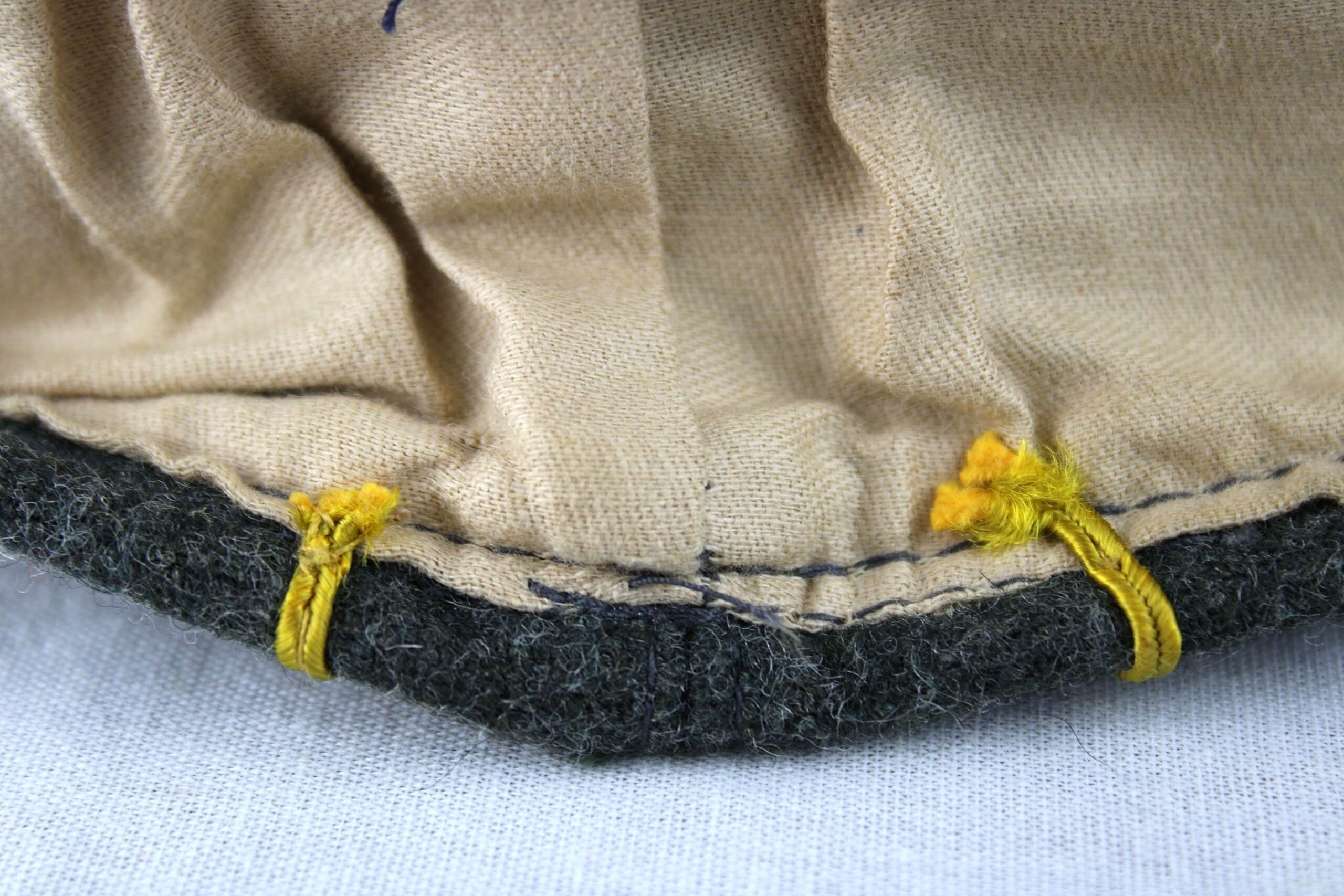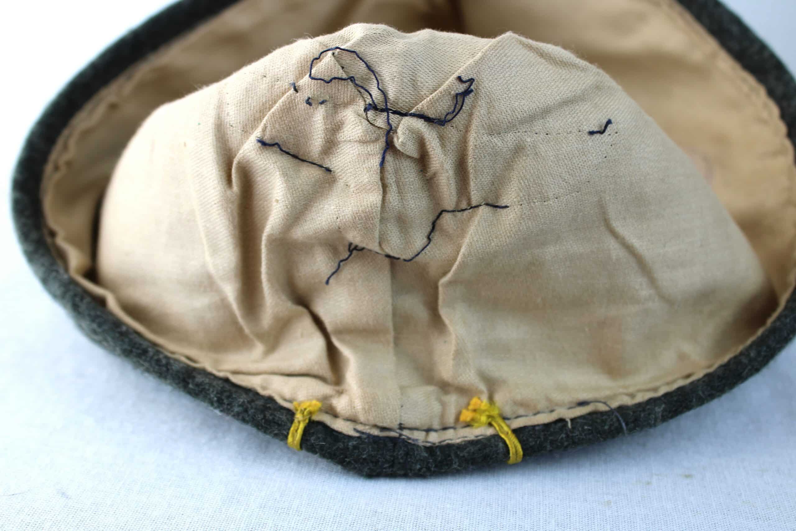 Ce très beau calot de la Kriegsmarine pour la troupe et sous officier de l’artillerie cotière est réalisé en drap épais de prise, doublure écrue bien marquée du tampon « Chapellerie Parisienne » et taille 57. La cocarde est de fabrication Bevo cousue main, le V en fil doré et également cousu main par dessus la cocarde, le calot est dénazifié mais les coutures de l’aigle sont clairement visibles au revers.