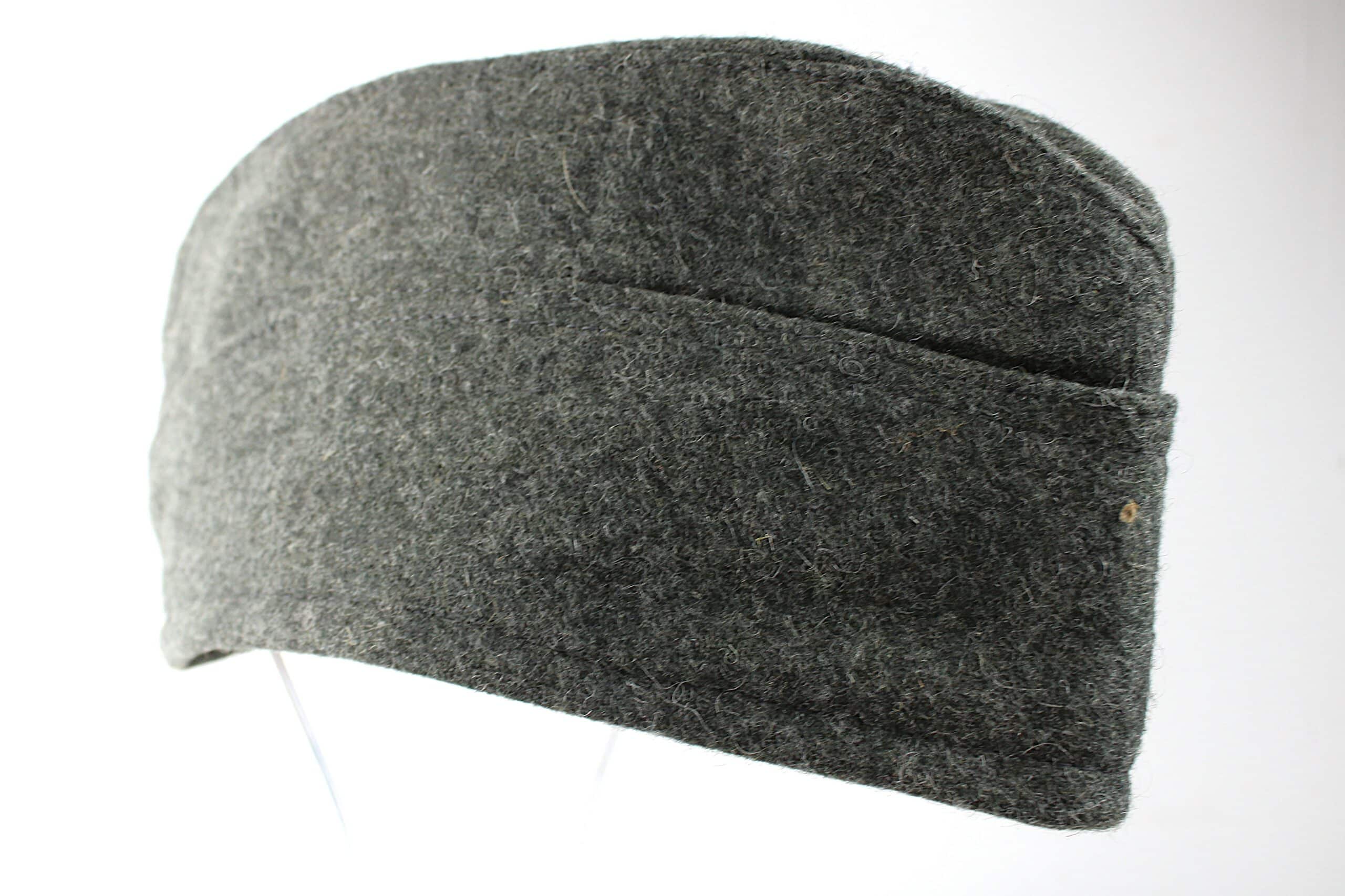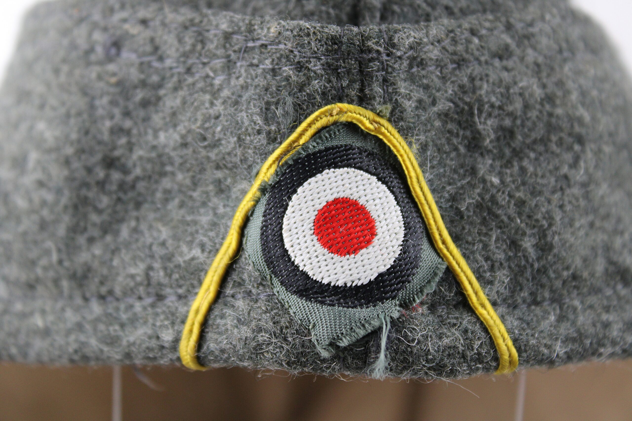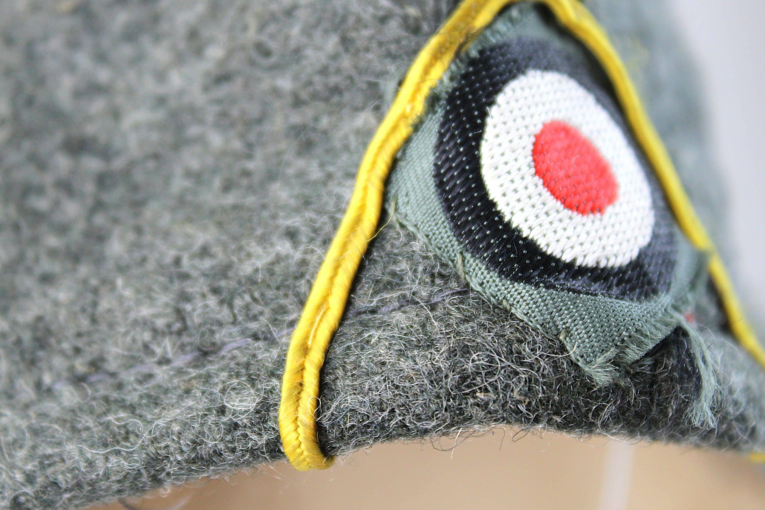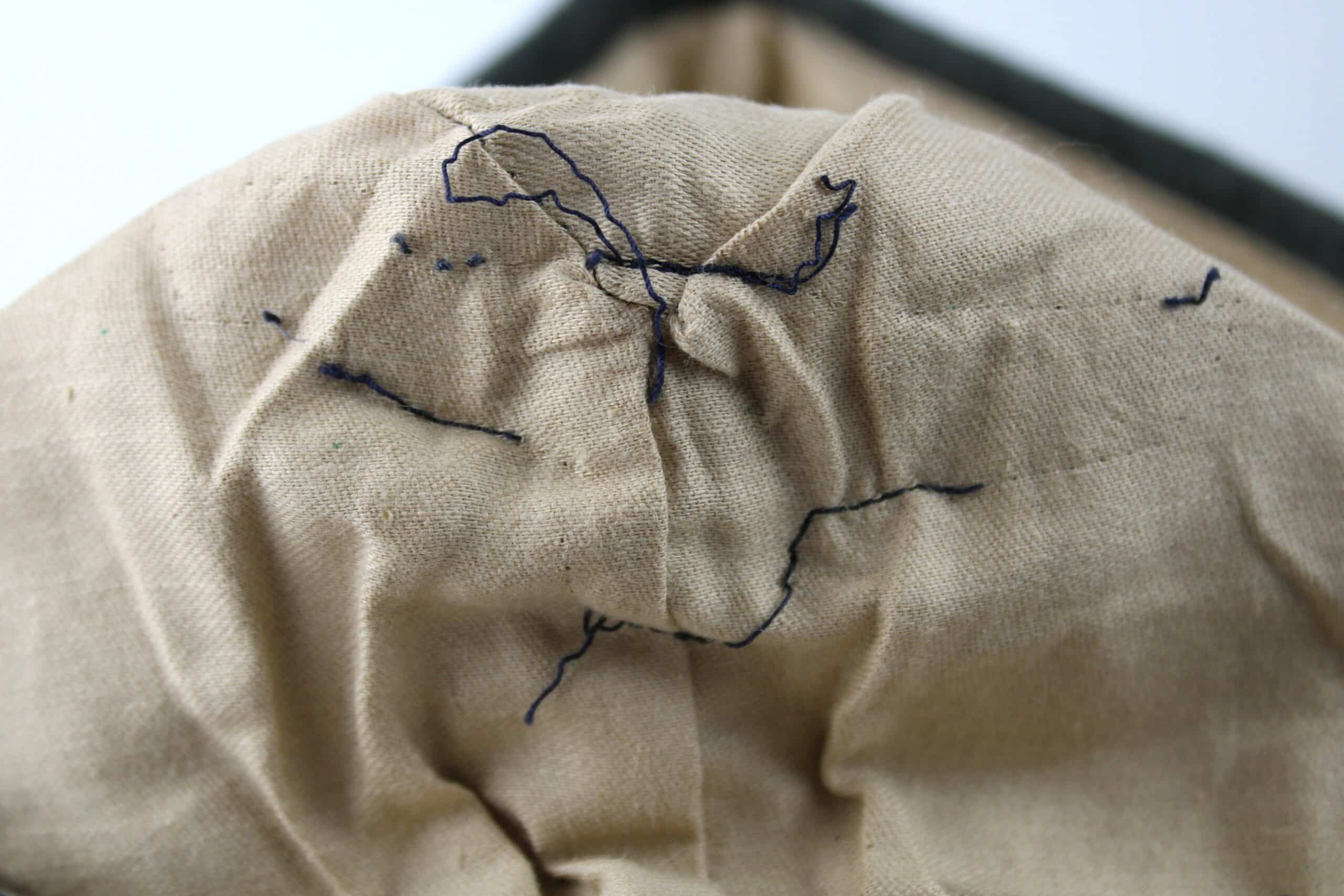 Ce très beau calot de la Kriegsmarine pour la troupe et sous officier de l’artillerie cotière est réalisé en drap épais de prise, doublure écrue bien marquée du tampon « Chapellerie Parisienne » et taille 57. La cocarde est de fabrication Bevo cousue main, le V en fil doré et également cousu main par dessus la cocarde, le calot est dénazifié mais les coutures de l’aigle sont clairement visibles au revers.