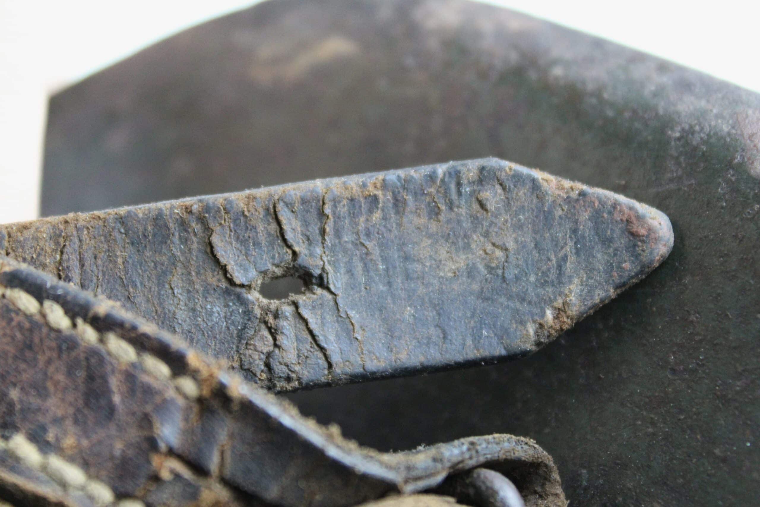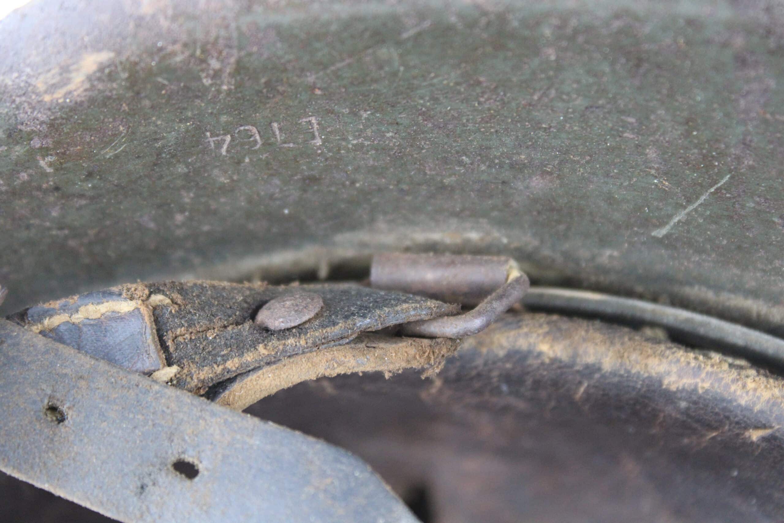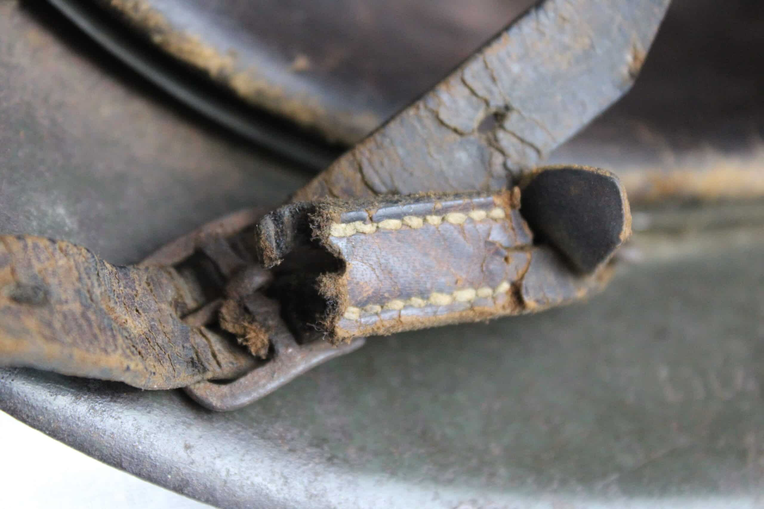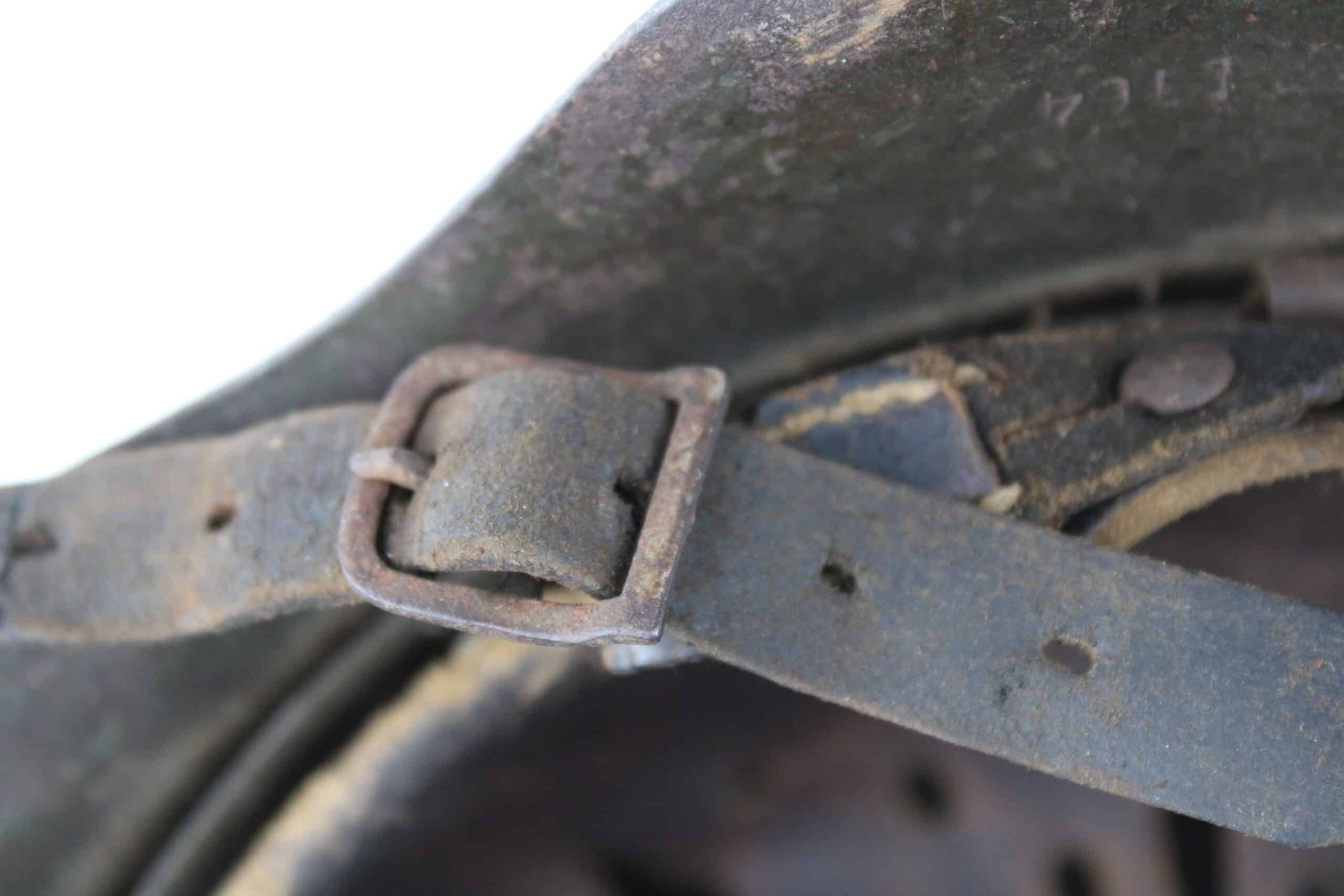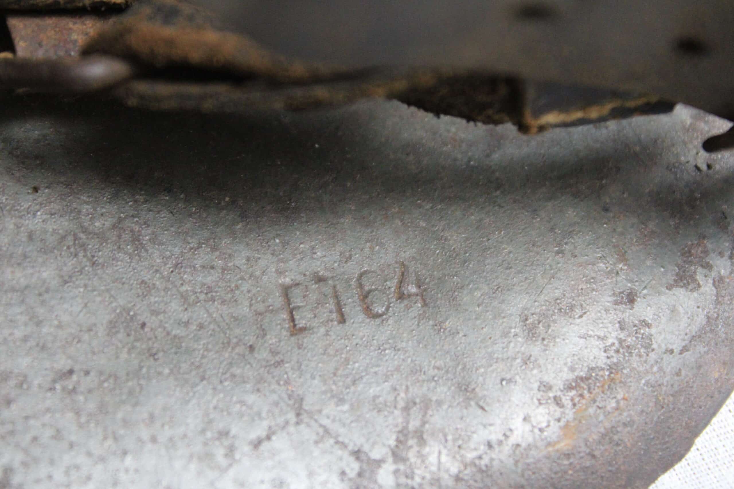 Casque M42 Heer avec un bel insigne encore très présent indiquant une fabrication de 1943, fine peinture Feldgrau typique de ces fabrications en plutôt bel état avec une très belle patine, marqué « ET64 », numéro de série « 2260 » . Intérieur en cuir bien monté d’origine sur son cerclage acier, jeu d’usage dans le rivet droit mais les autres sont parfaitement plaqués et surtout la patine montre clairemement qu’il n’y a jamais eu de démontage, cuir complet avec son cordon de serrage; jugulaire complète présente avec sa boucle acier, un marquage est faiblement visible avec la date 1943, le cuir est désolidarisé de la boucle.