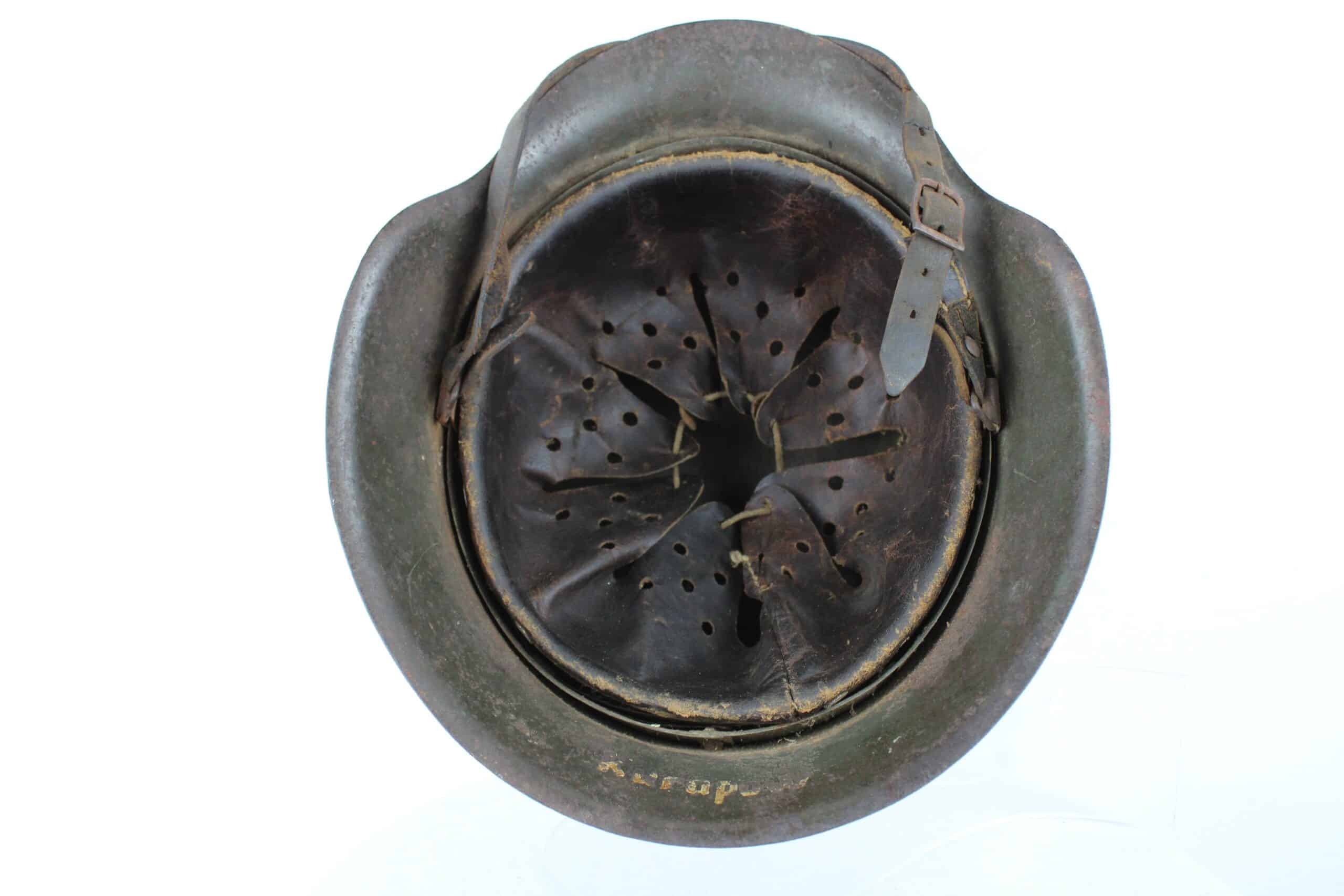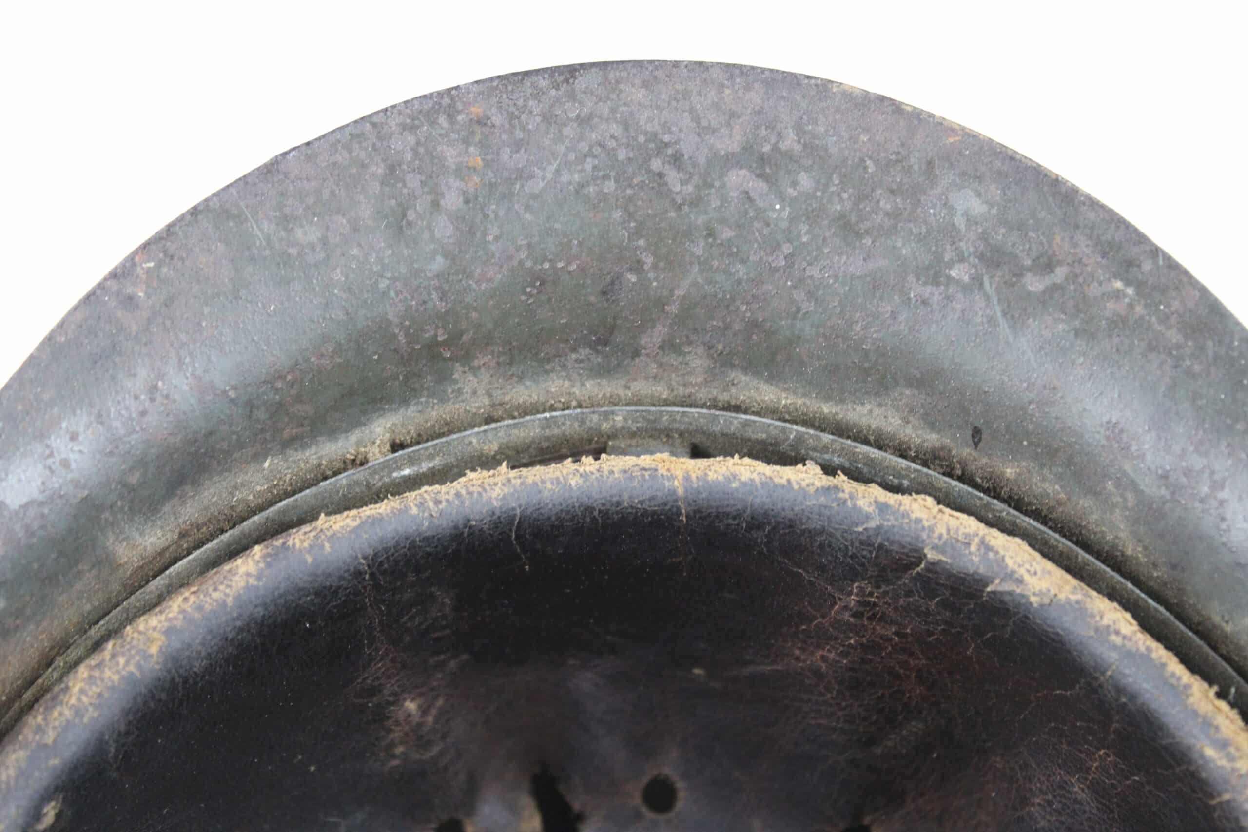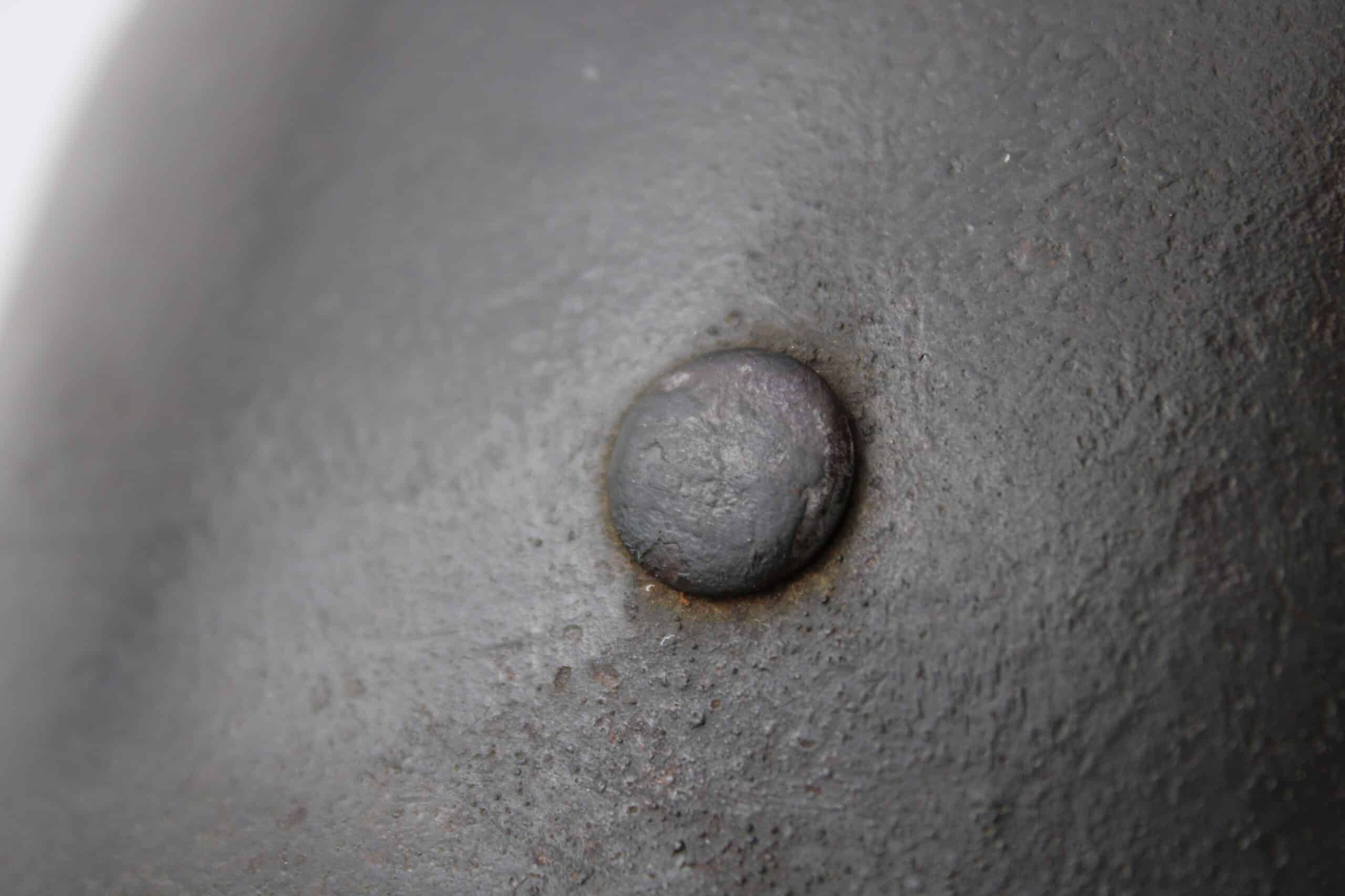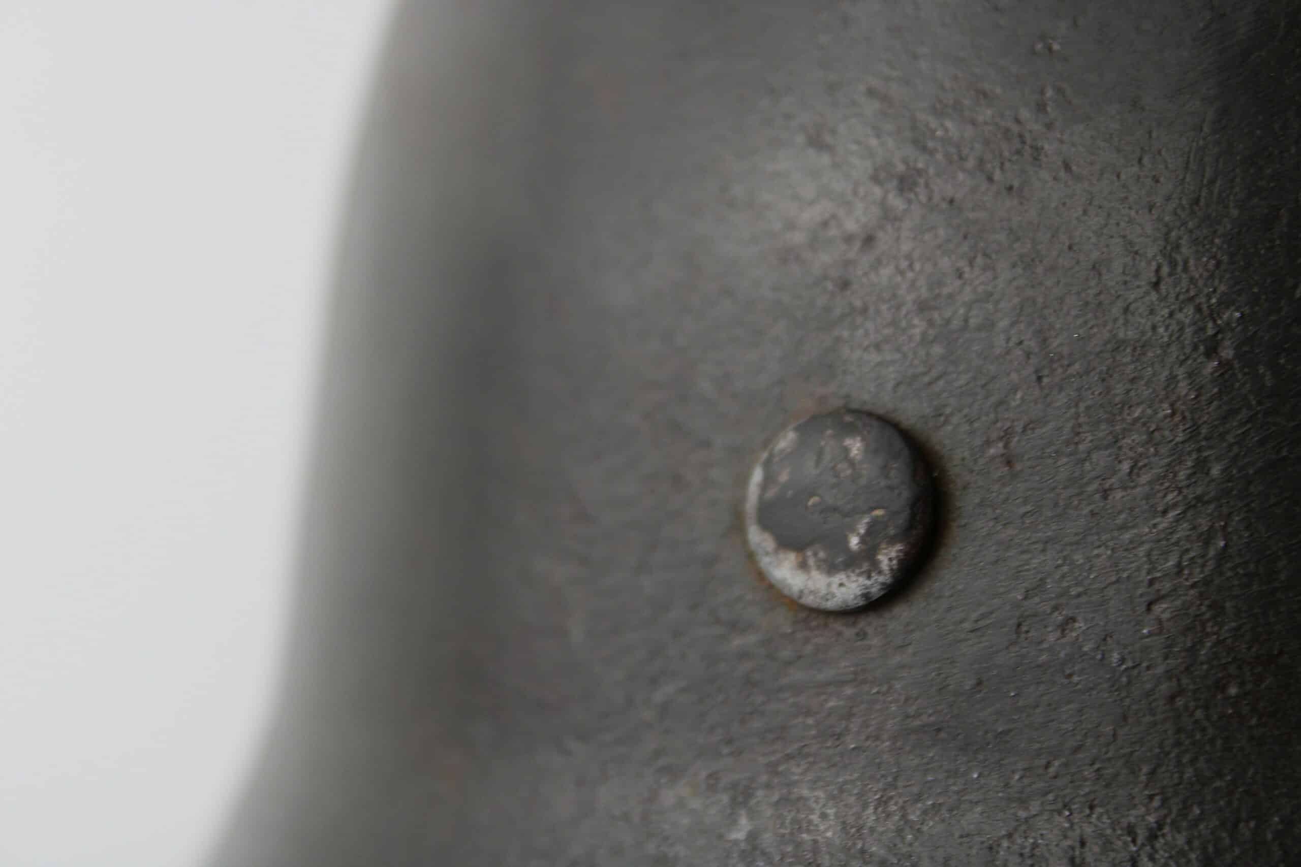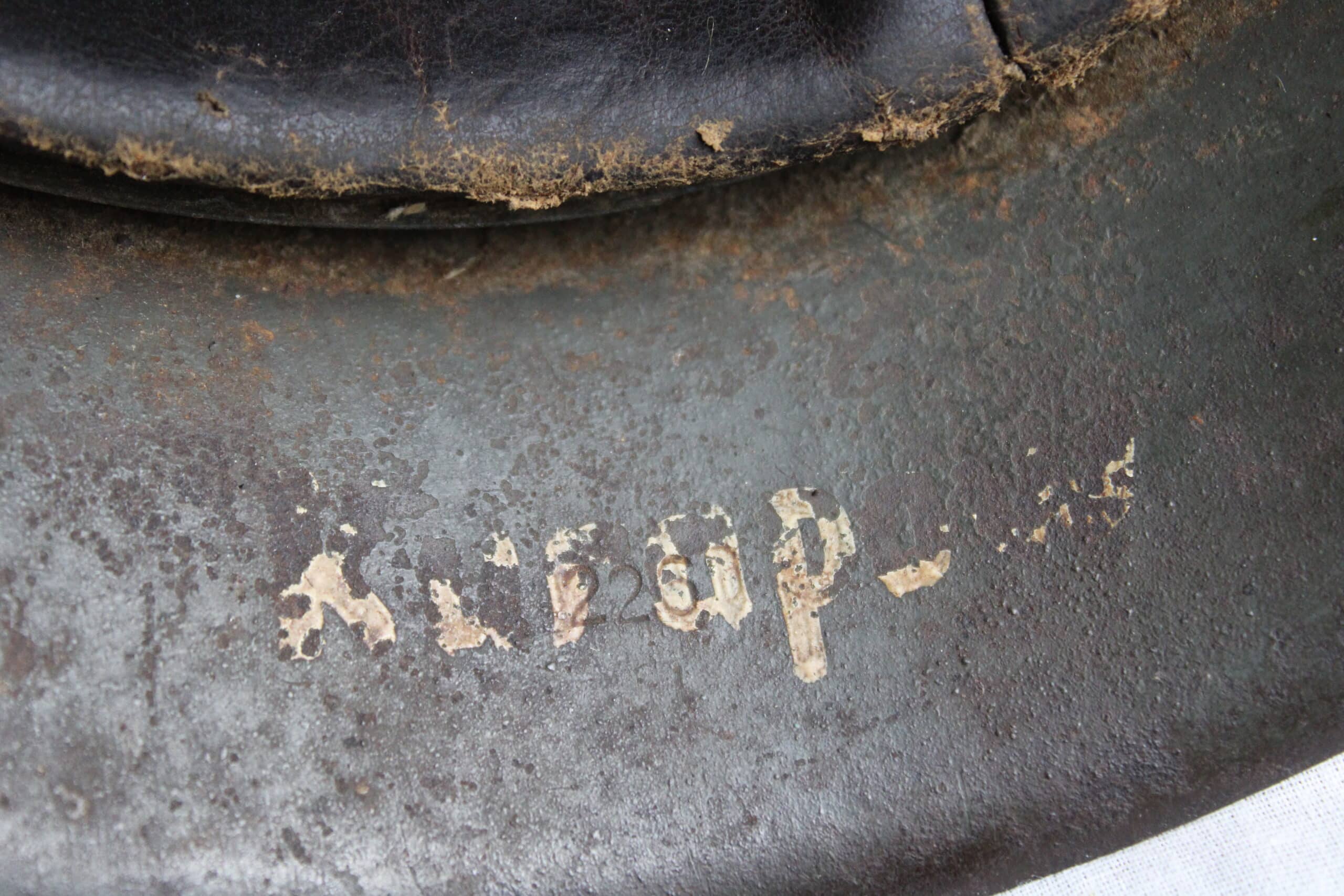 Casque M42 Heer avec un bel insigne encore très présent indiquant une fabrication de 1943, fine peinture Feldgrau typique de ces fabrications en plutôt bel état avec une très belle patine, marqué « ET64 », numéro de série « 2260 » . Intérieur en cuir bien monté d’origine sur son cerclage acier, jeu d’usage dans le rivet droit mais les autres sont parfaitement plaqués et surtout la patine montre clairemement qu’il n’y a jamais eu de démontage, cuir complet avec son cordon de serrage; jugulaire complète présente avec sa boucle acier, un marquage est faiblement visible avec la date 1943, le cuir est désolidarisé de la boucle.