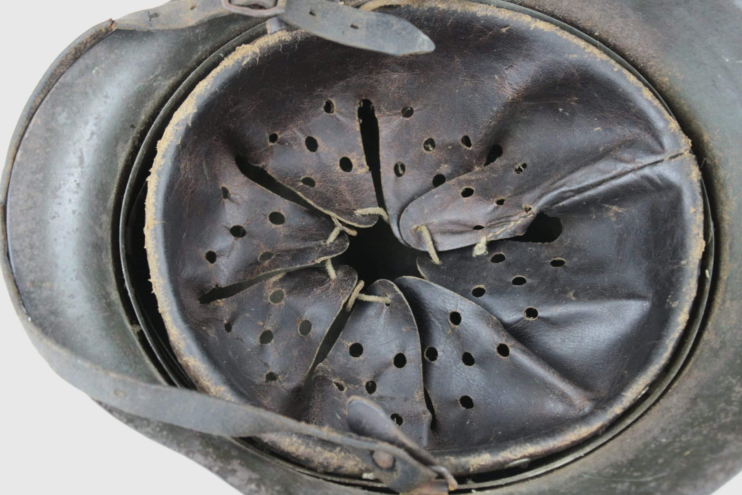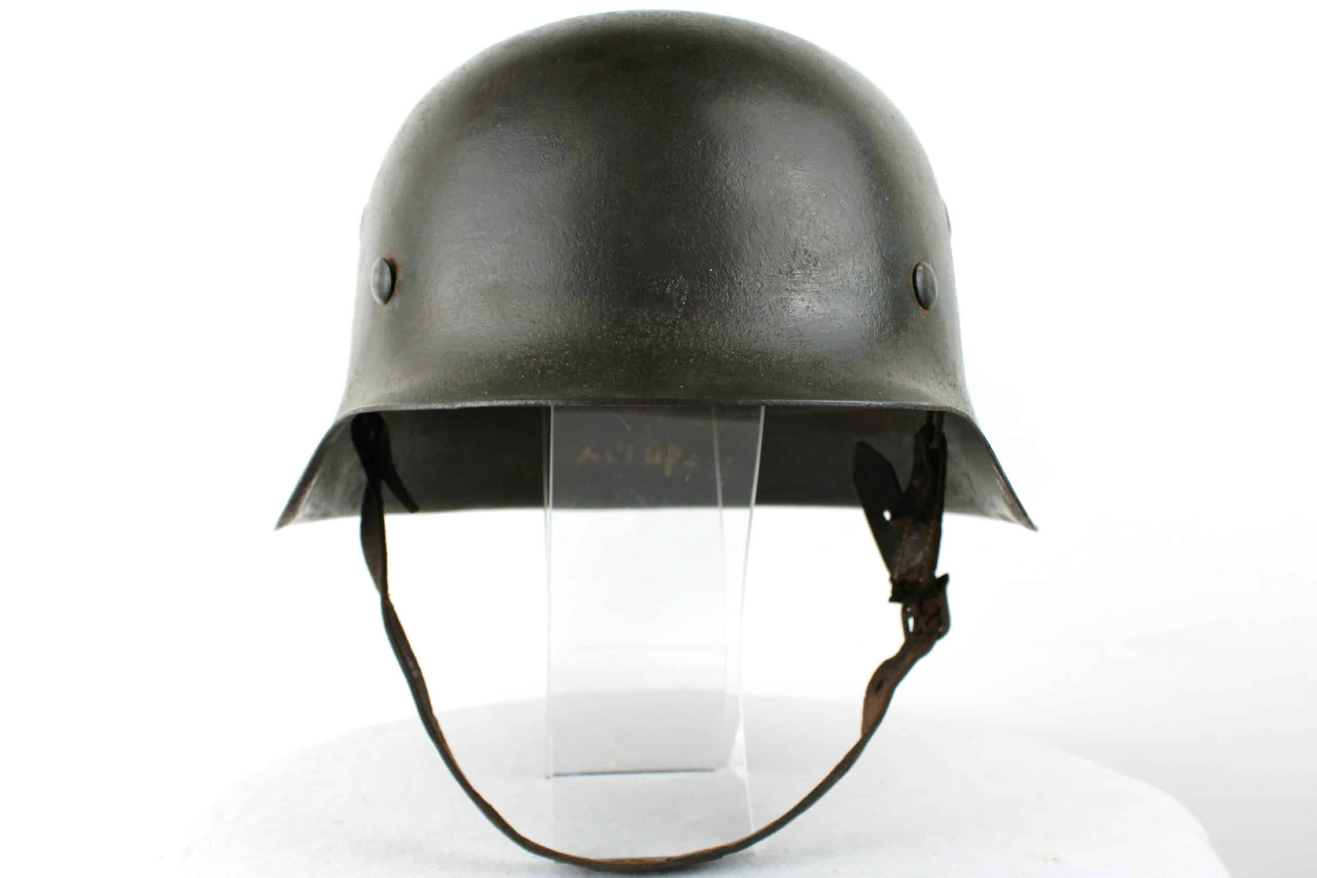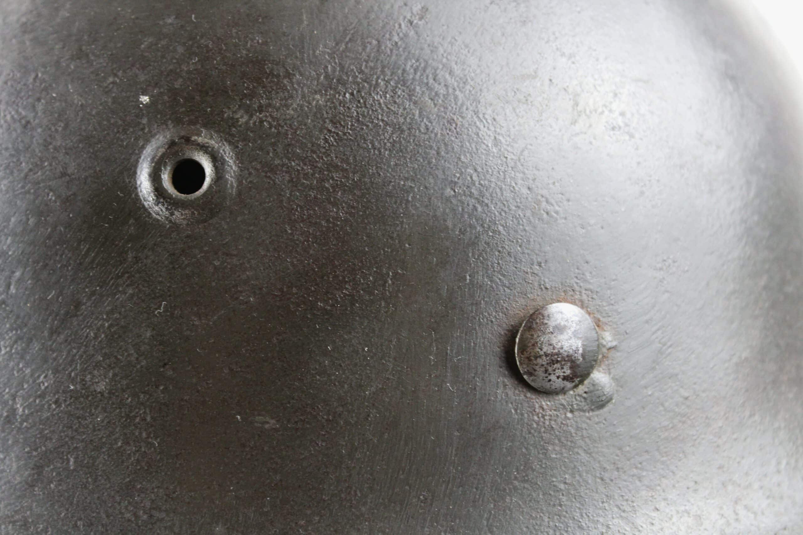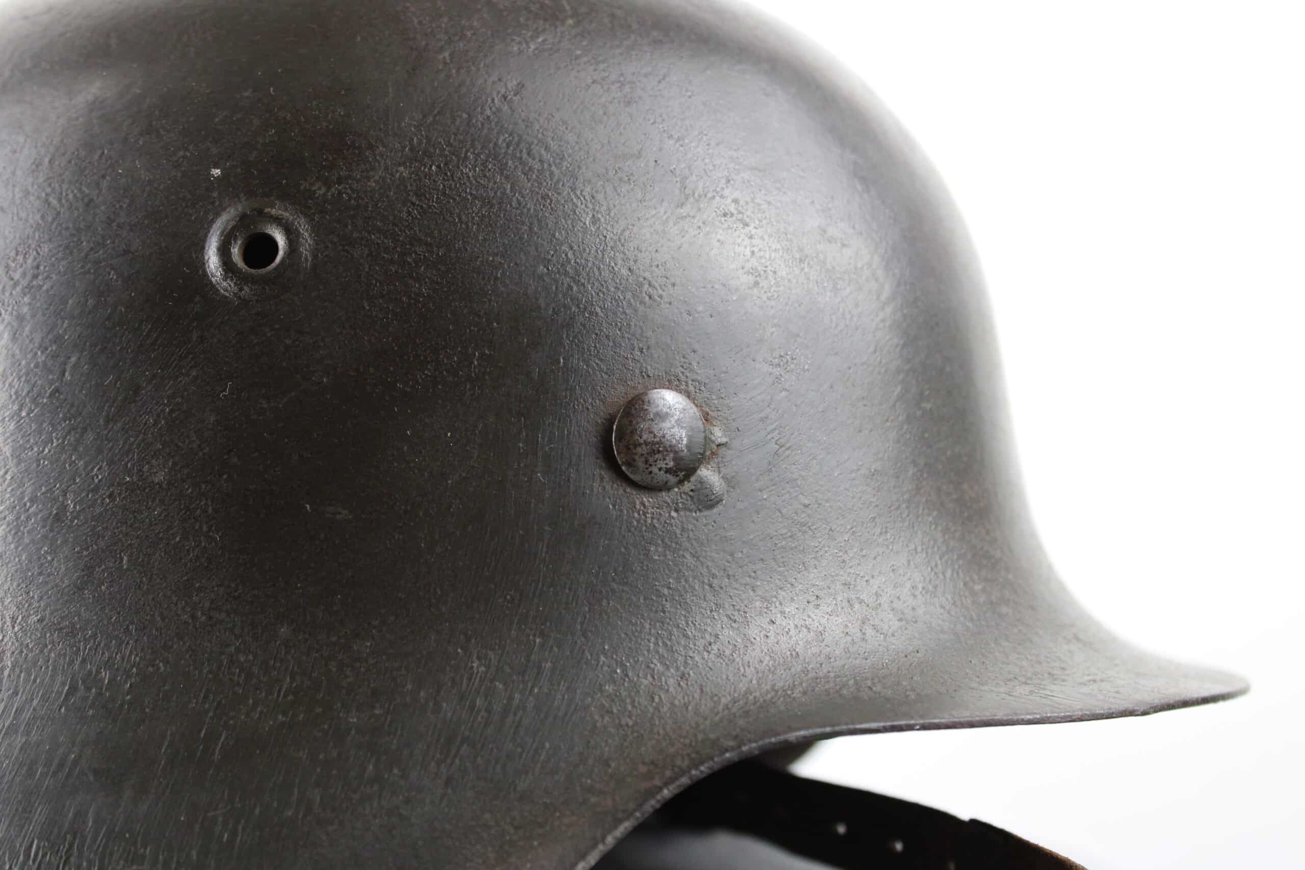 Casque M42 Heer avec un bel insigne encore très présent indiquant une fabrication de 1943, fine peinture Feldgrau typique de ces fabrications en plutôt bel état avec une très belle patine, marqué « ET64 », numéro de série « 2260 » . Intérieur en cuir bien monté d’origine sur son cerclage acier, jeu d’usage dans le rivet droit mais les autres sont parfaitement plaqués et surtout la patine montre clairemement qu’il n’y a jamais eu de démontage, cuir complet avec son cordon de serrage; jugulaire complète présente avec sa boucle acier, un marquage est faiblement visible avec la date 1943, le cuir est désolidarisé de la boucle.