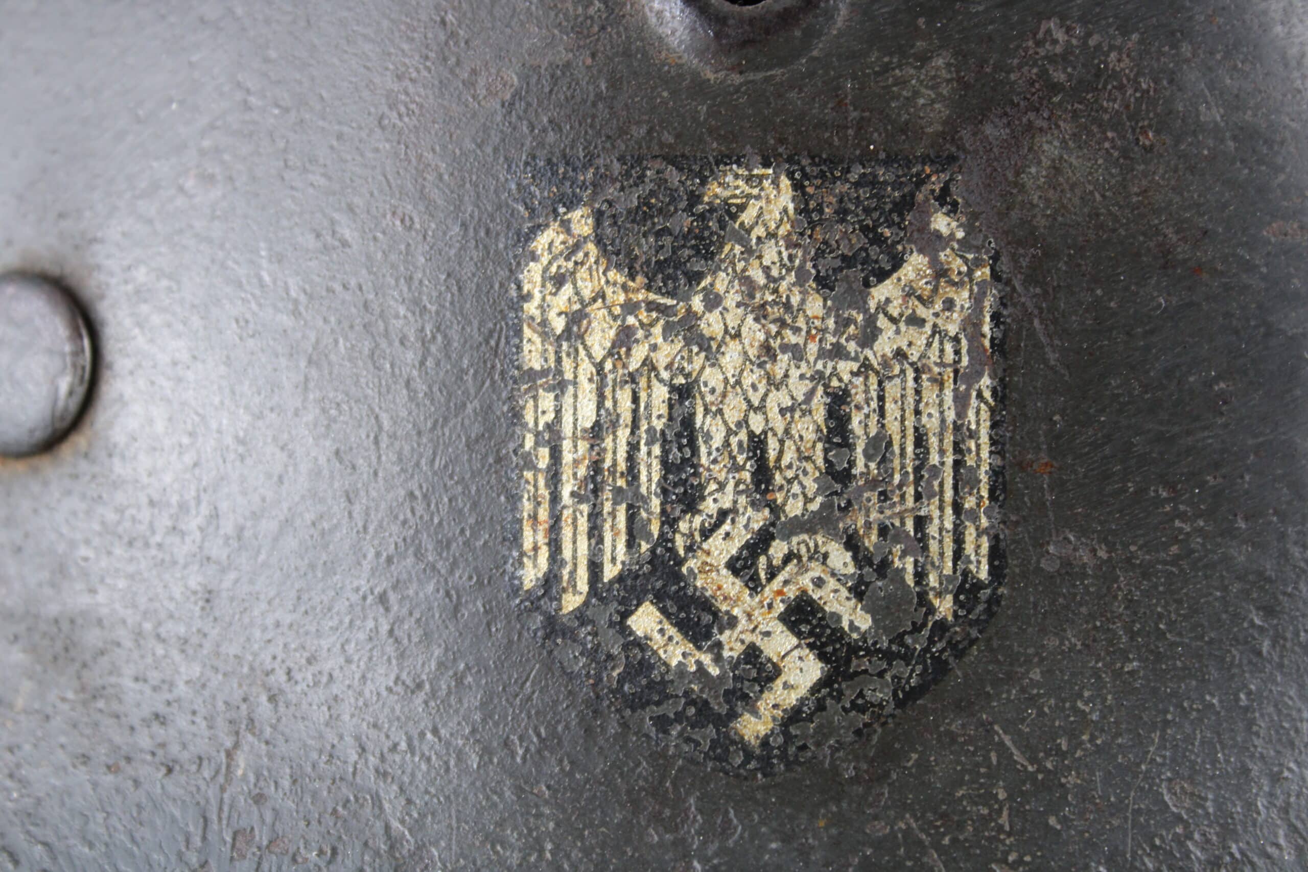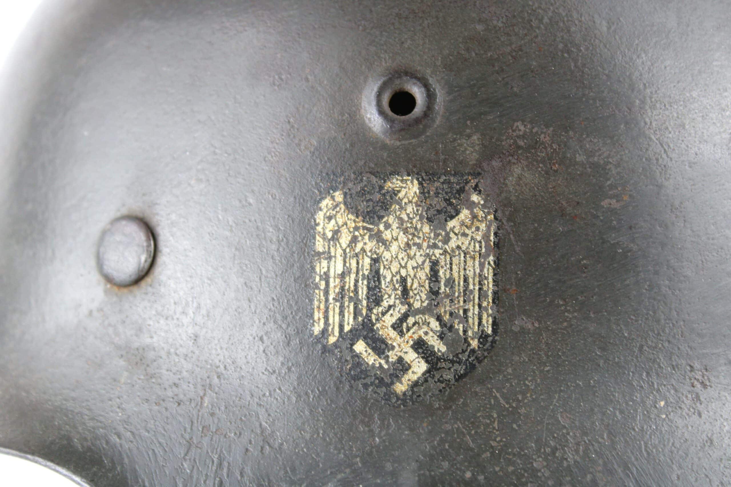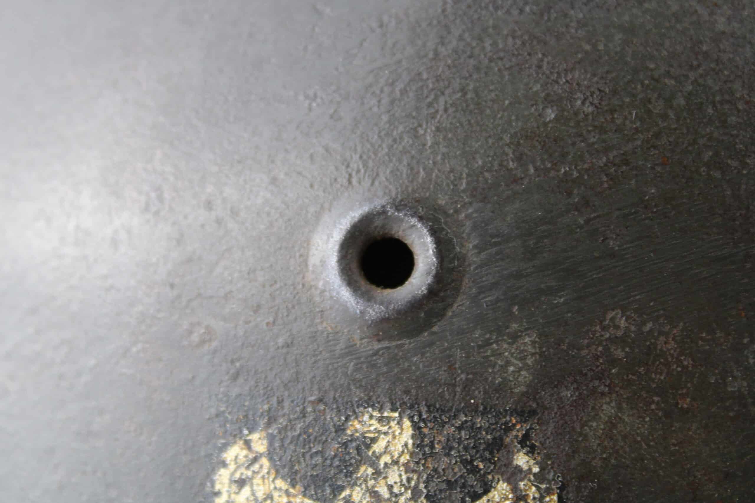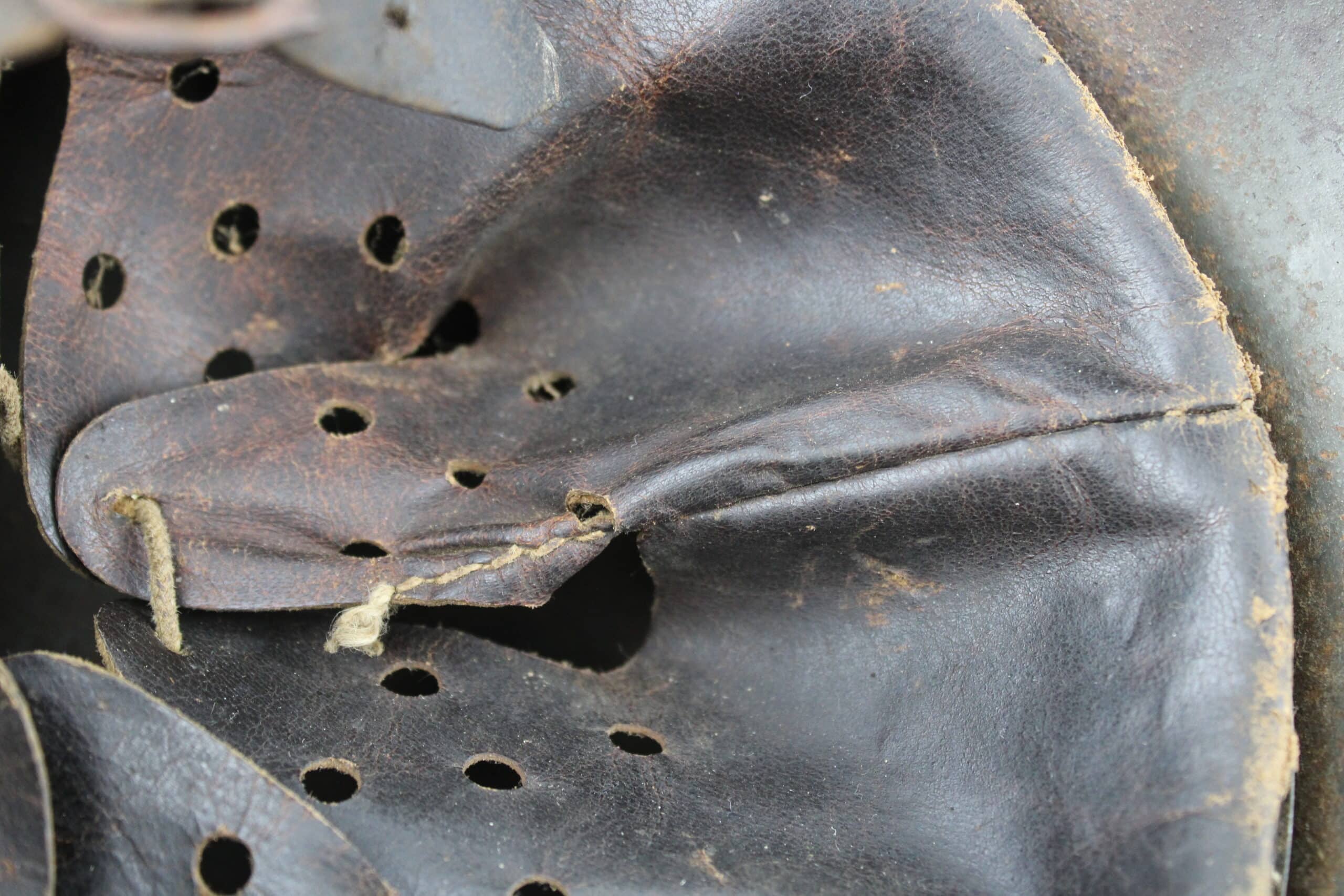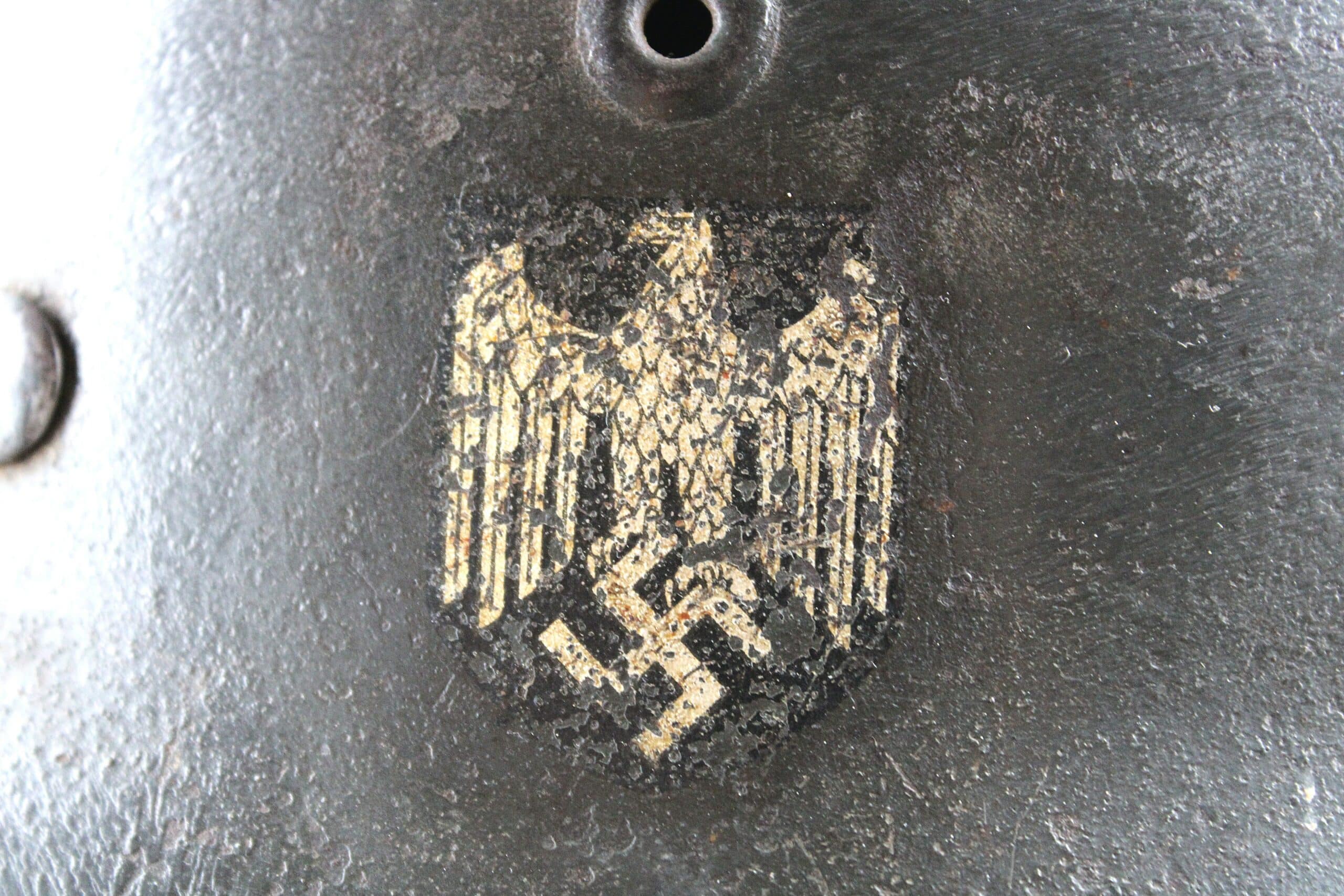 Casque M42 Heer avec un bel insigne encore très présent indiquant une fabrication de 1943, fine peinture Feldgrau typique de ces fabrications en plutôt bel état avec une très belle patine, marqué « ET64 », numéro de série « 2260 » . Intérieur en cuir bien monté d’origine sur son cerclage acier, jeu d’usage dans le rivet droit mais les autres sont parfaitement plaqués et surtout la patine montre clairemement qu’il n’y a jamais eu de démontage, cuir complet avec son cordon de serrage; jugulaire complète présente avec sa boucle acier, un marquage est faiblement visible avec la date 1943, le cuir est désolidarisé de la boucle.