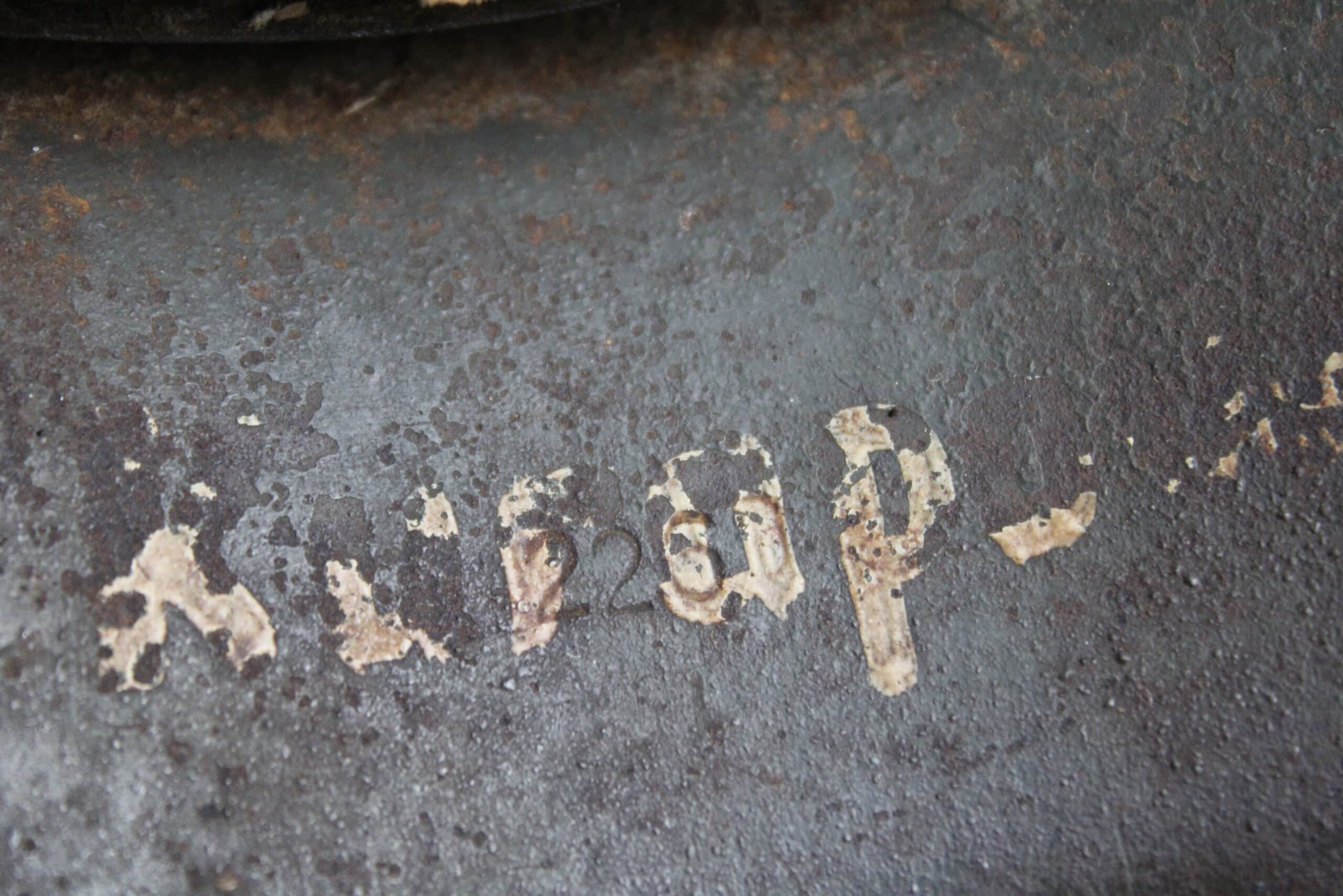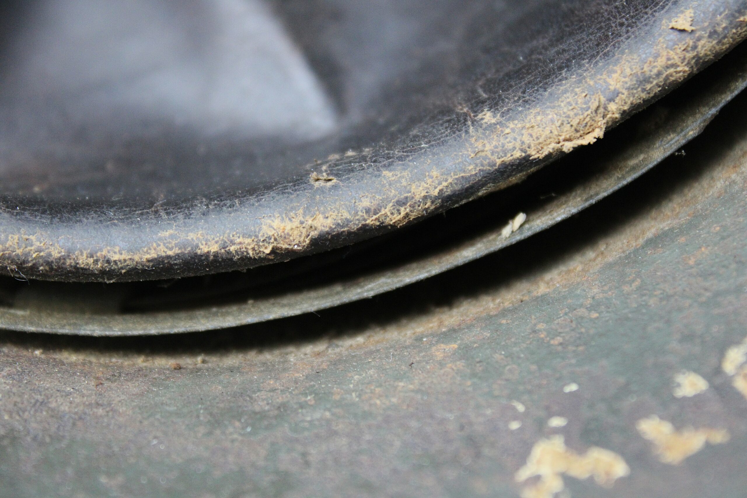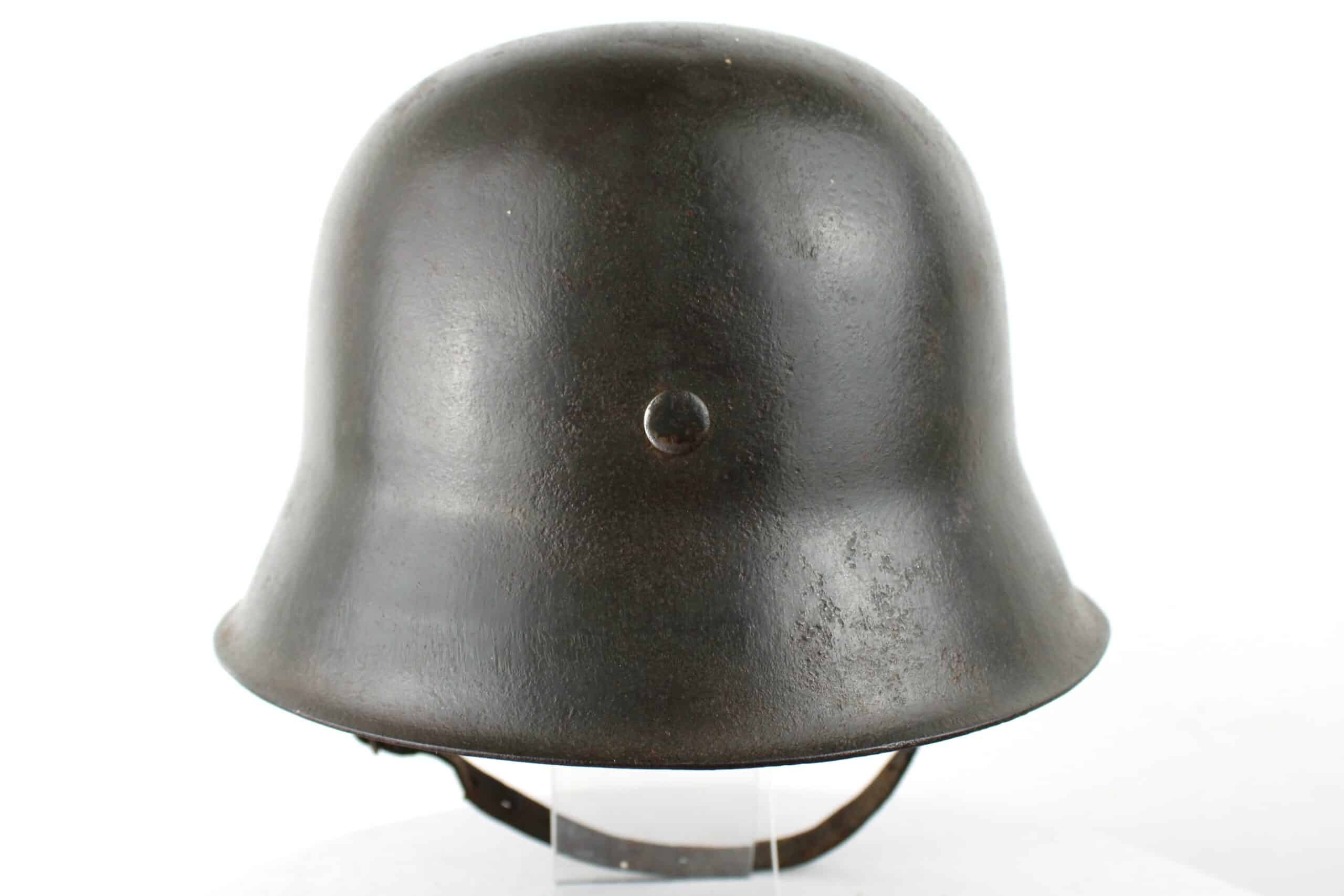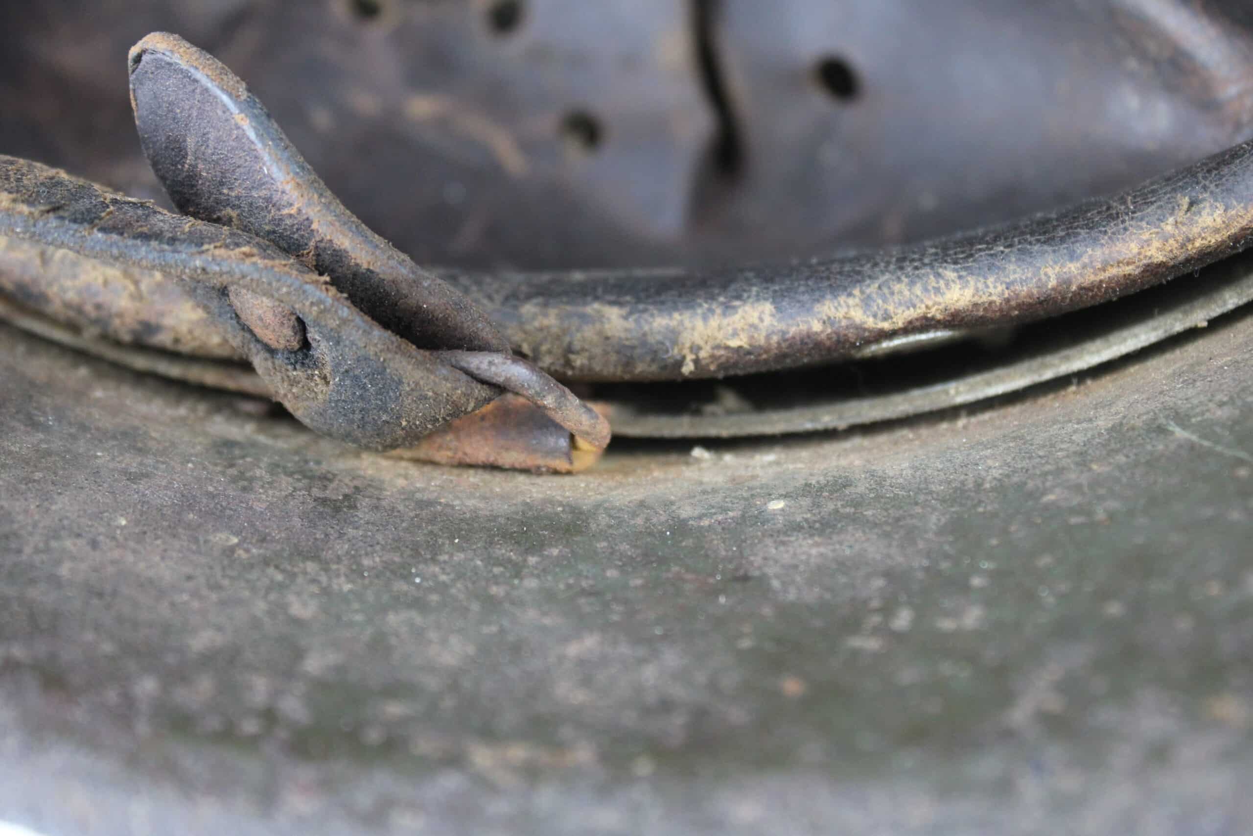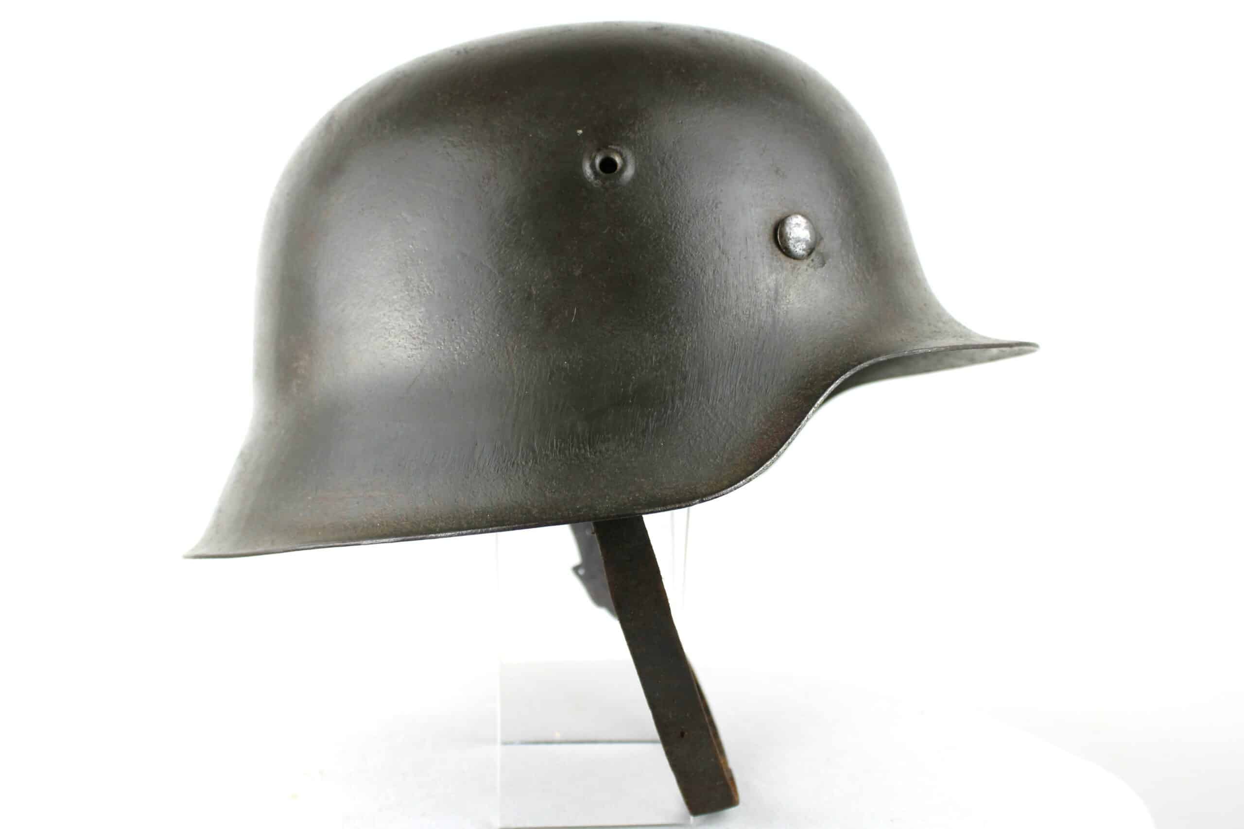 Casque M42 Heer avec un bel insigne encore très présent indiquant une fabrication de 1943, fine peinture Feldgrau typique de ces fabrications en plutôt bel état avec une très belle patine, marqué « ET64 », numéro de série « 2260 » . Intérieur en cuir bien monté d’origine sur son cerclage acier, jeu d’usage dans le rivet droit mais les autres sont parfaitement plaqués et surtout la patine montre clairemement qu’il n’y a jamais eu de démontage, cuir complet avec son cordon de serrage; jugulaire complète présente avec sa boucle acier, un marquage est faiblement visible avec la date 1943, le cuir est désolidarisé de la boucle.