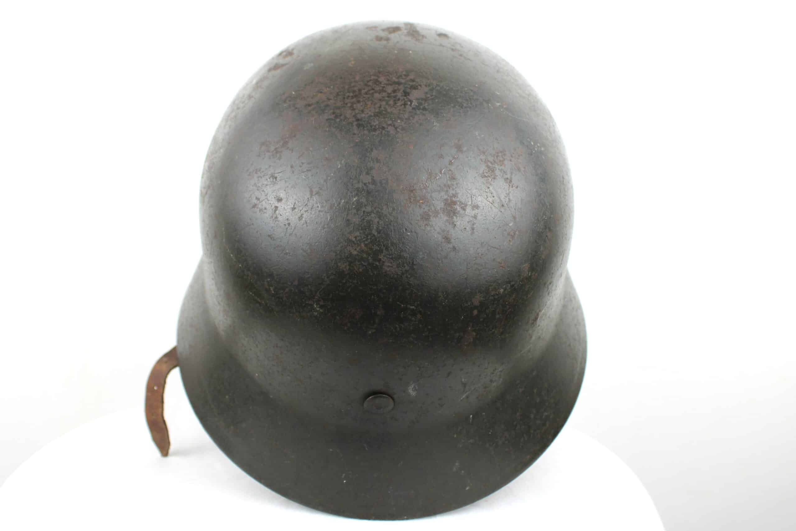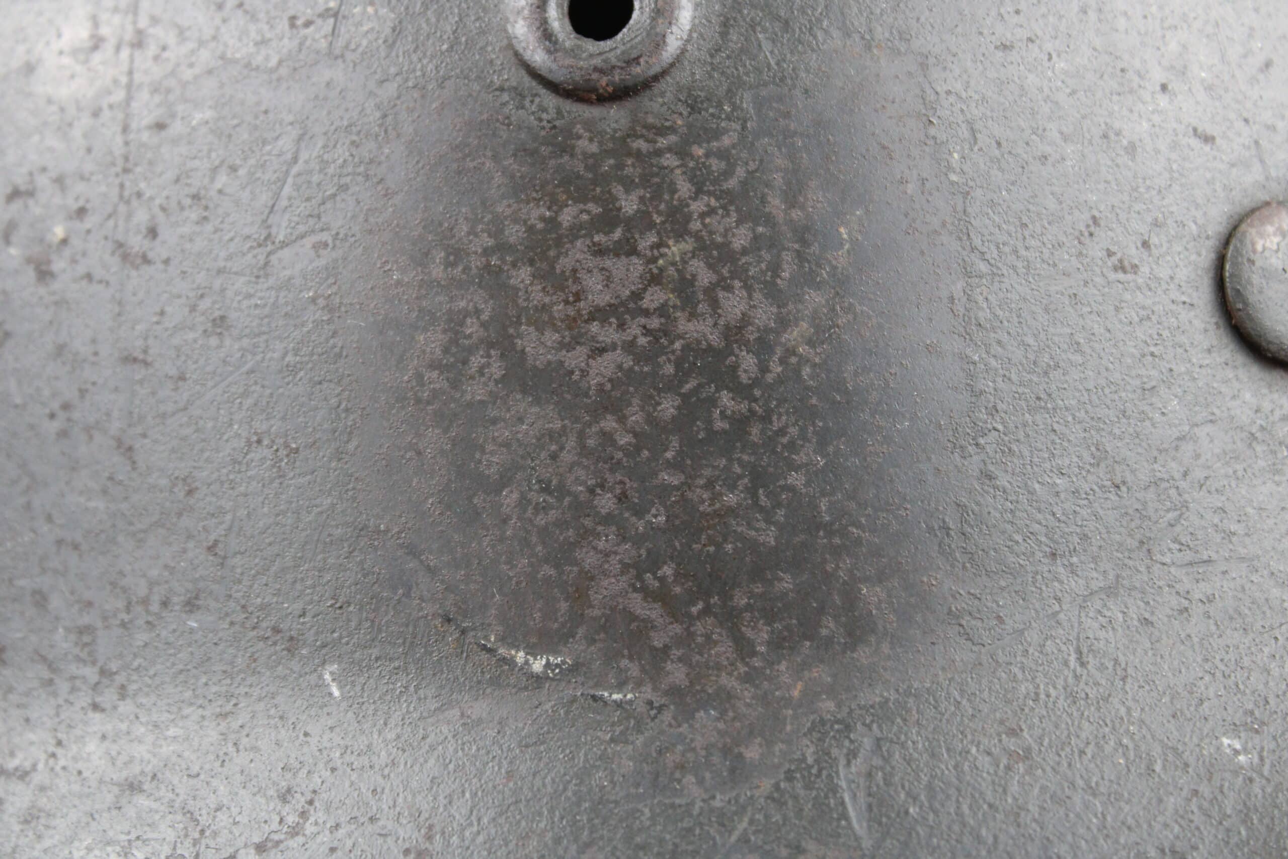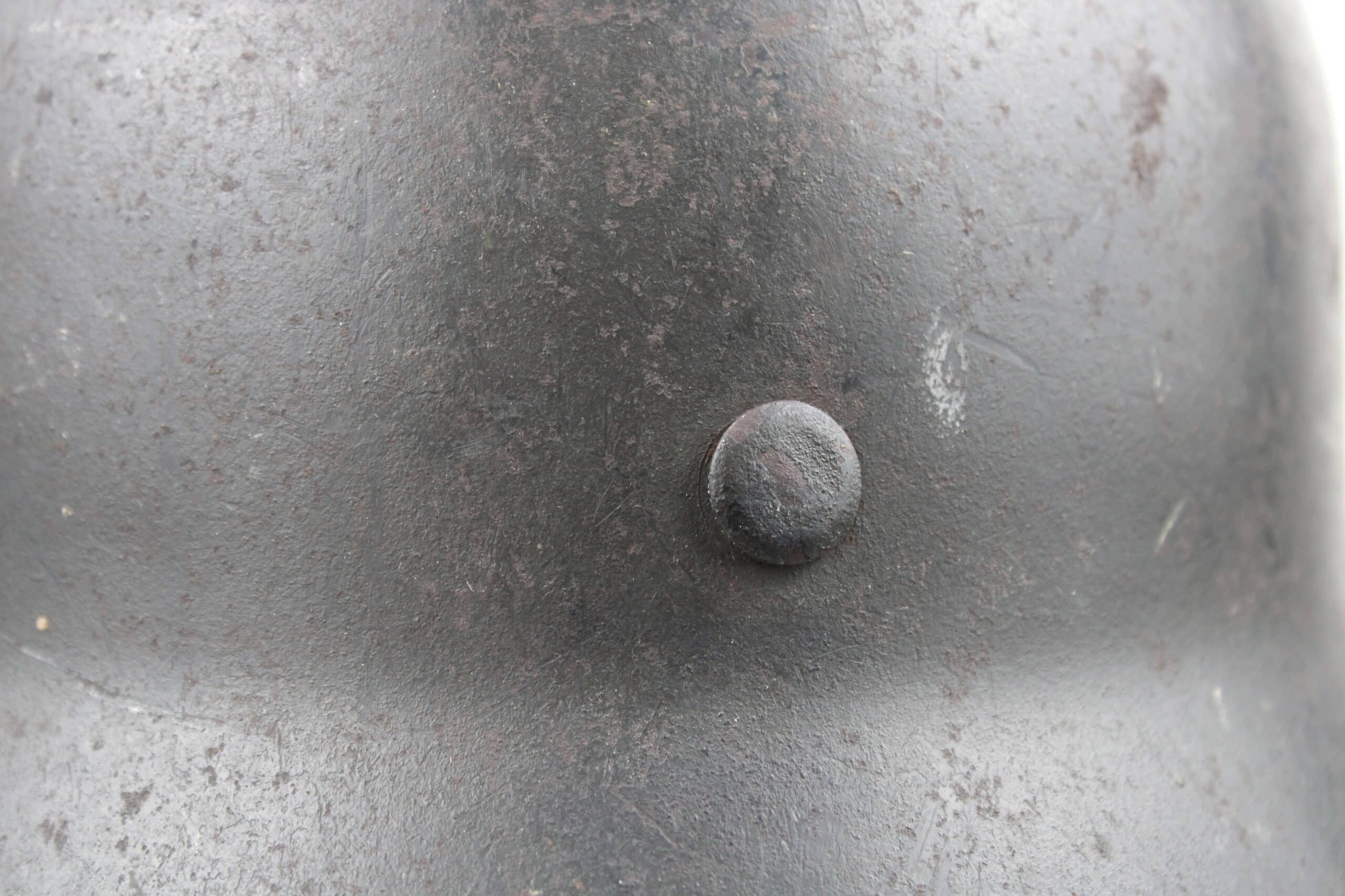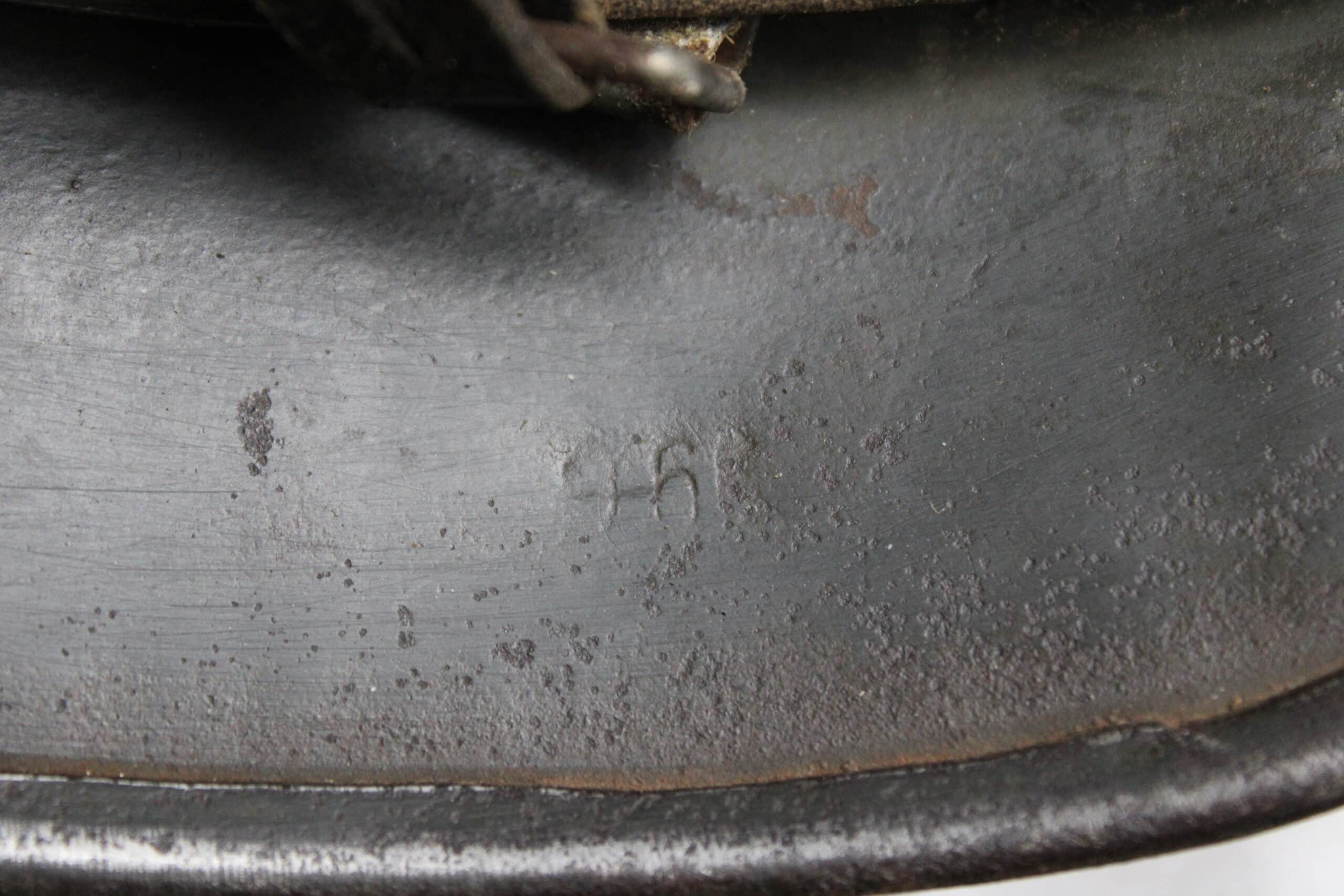 Casque de fabrication Q taille 66. Numéro de lot 10C33 , peinture feldgrau sombre typique des casque Waffen encore très présente, insigne malheureusement gratté, un petit bout du bas de l’écu est encore visible.