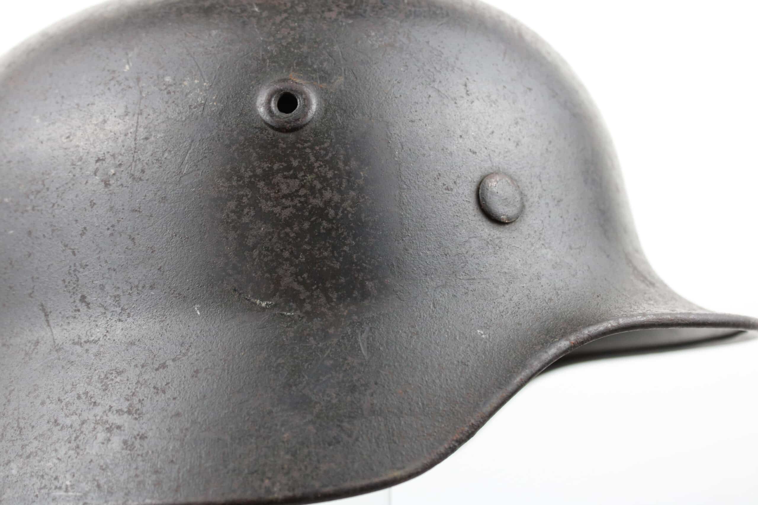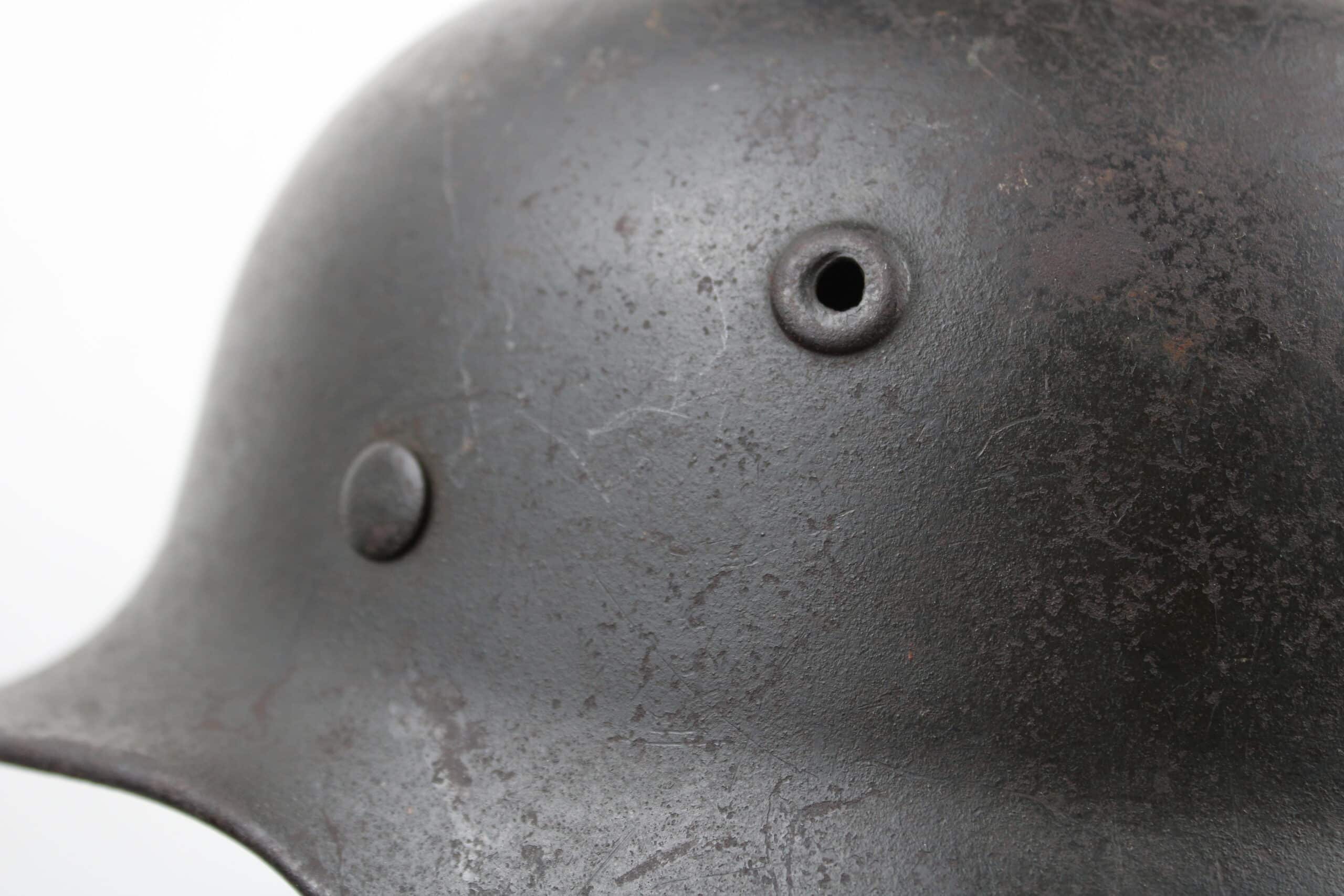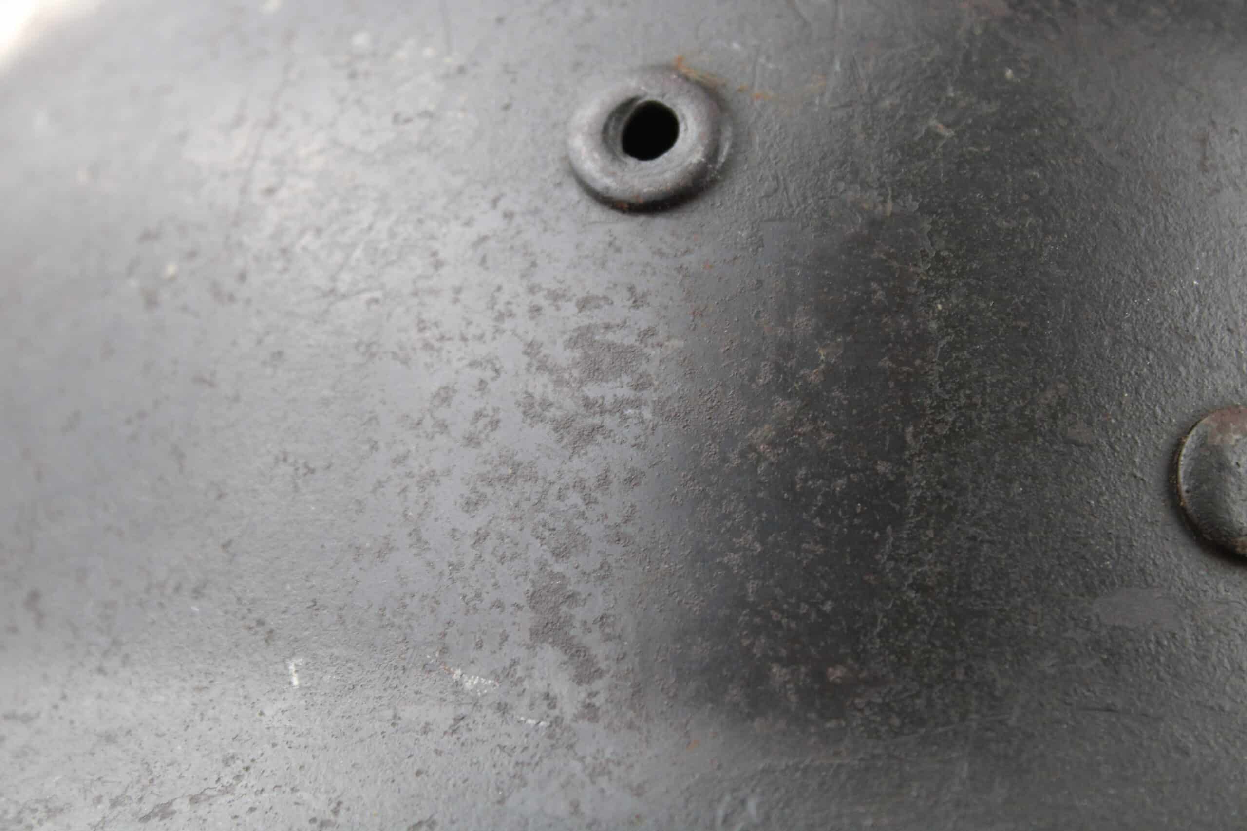 Casque de fabrication Q taille 66. Numéro de lot 10C33 , peinture feldgrau sombre typique des casque Waffen encore très présente, insigne malheureusement gratté, un petit bout du bas de l’écu est encore visible.