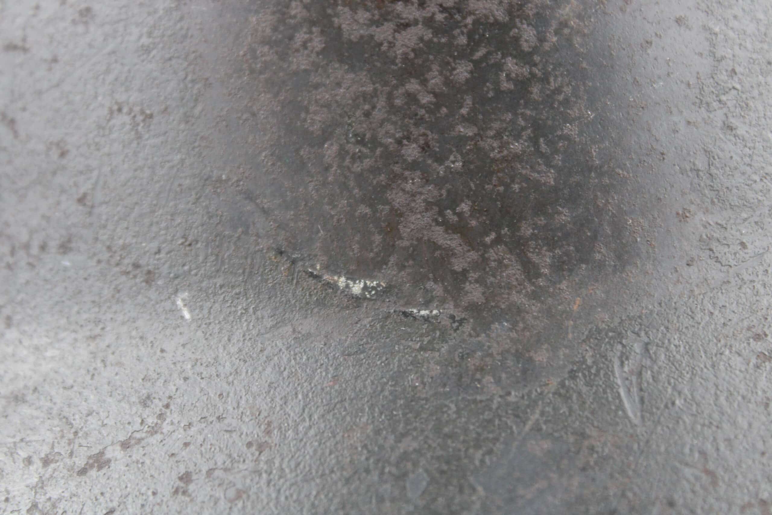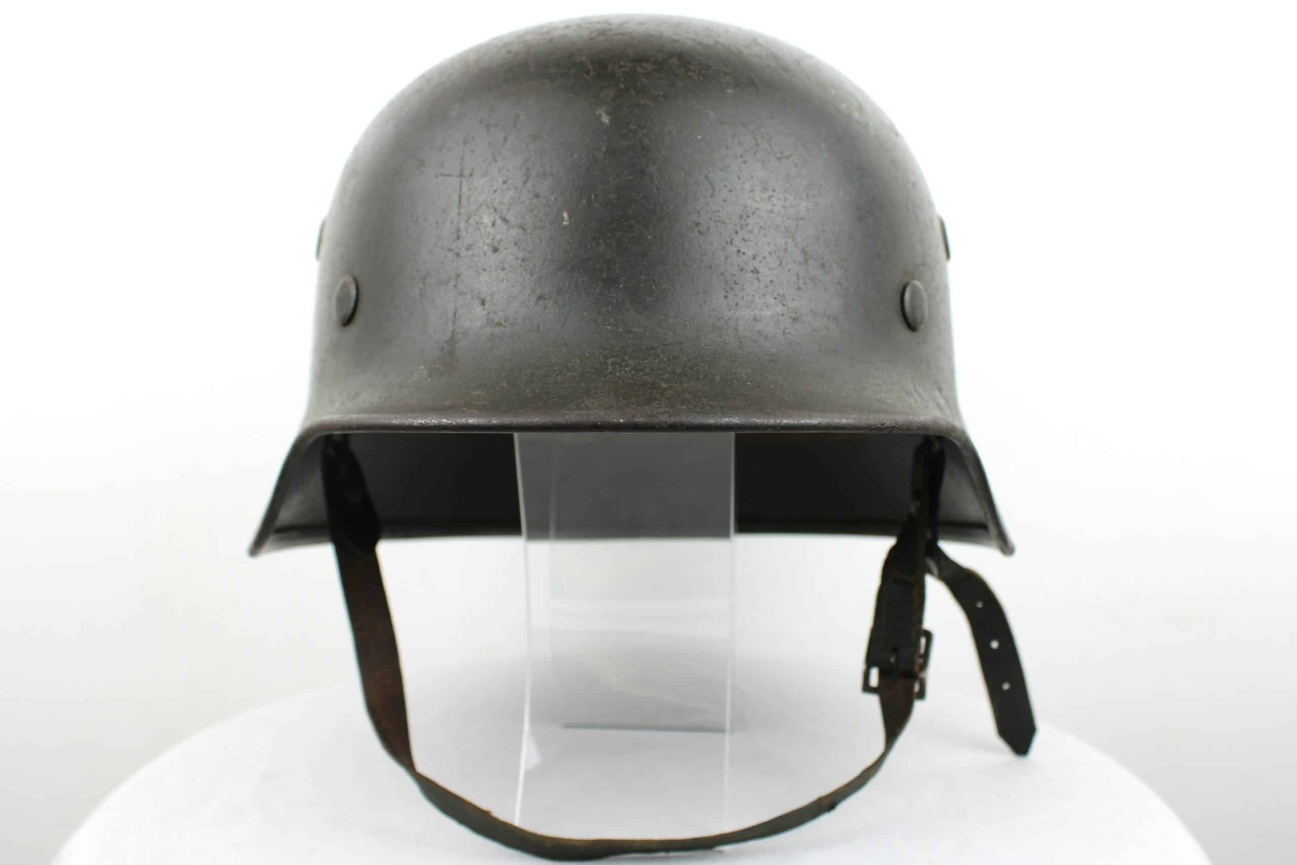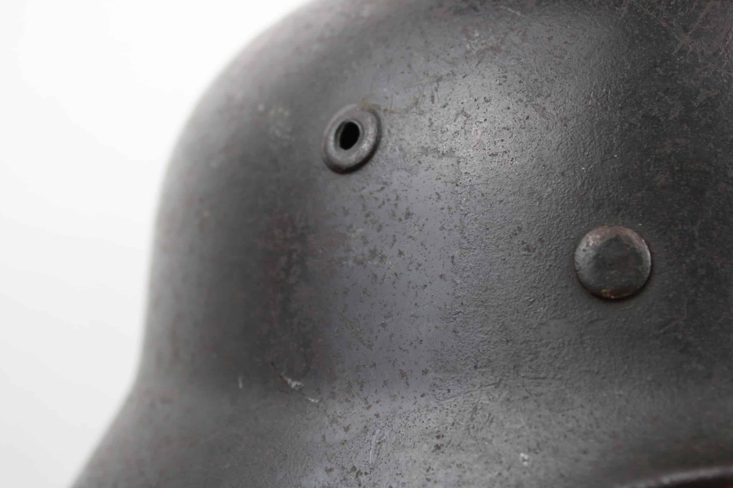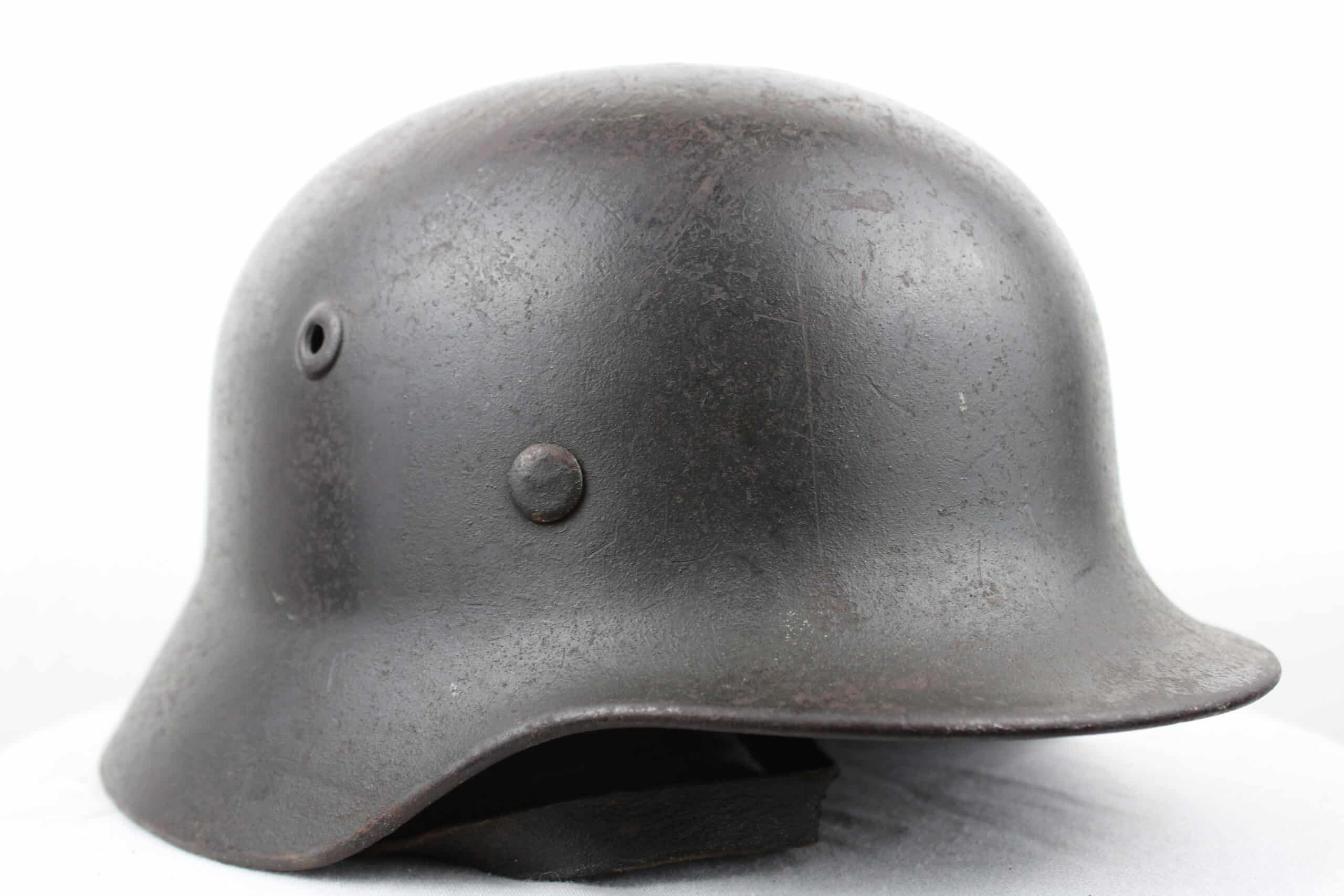Casque de fabrication Q taille 66. Numéro de lot 10C33 , peinture feldgrau sombre typique des casque Waffen encore très présente, insigne malheureusement gratté, un petit bout du bas de l’écu est encore visible.