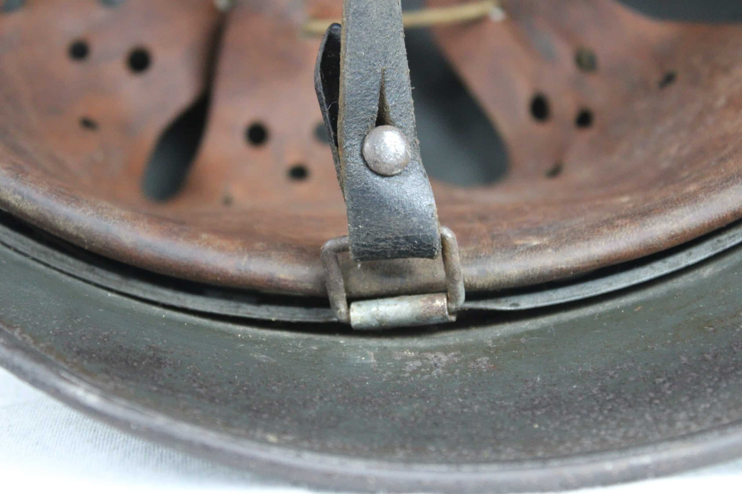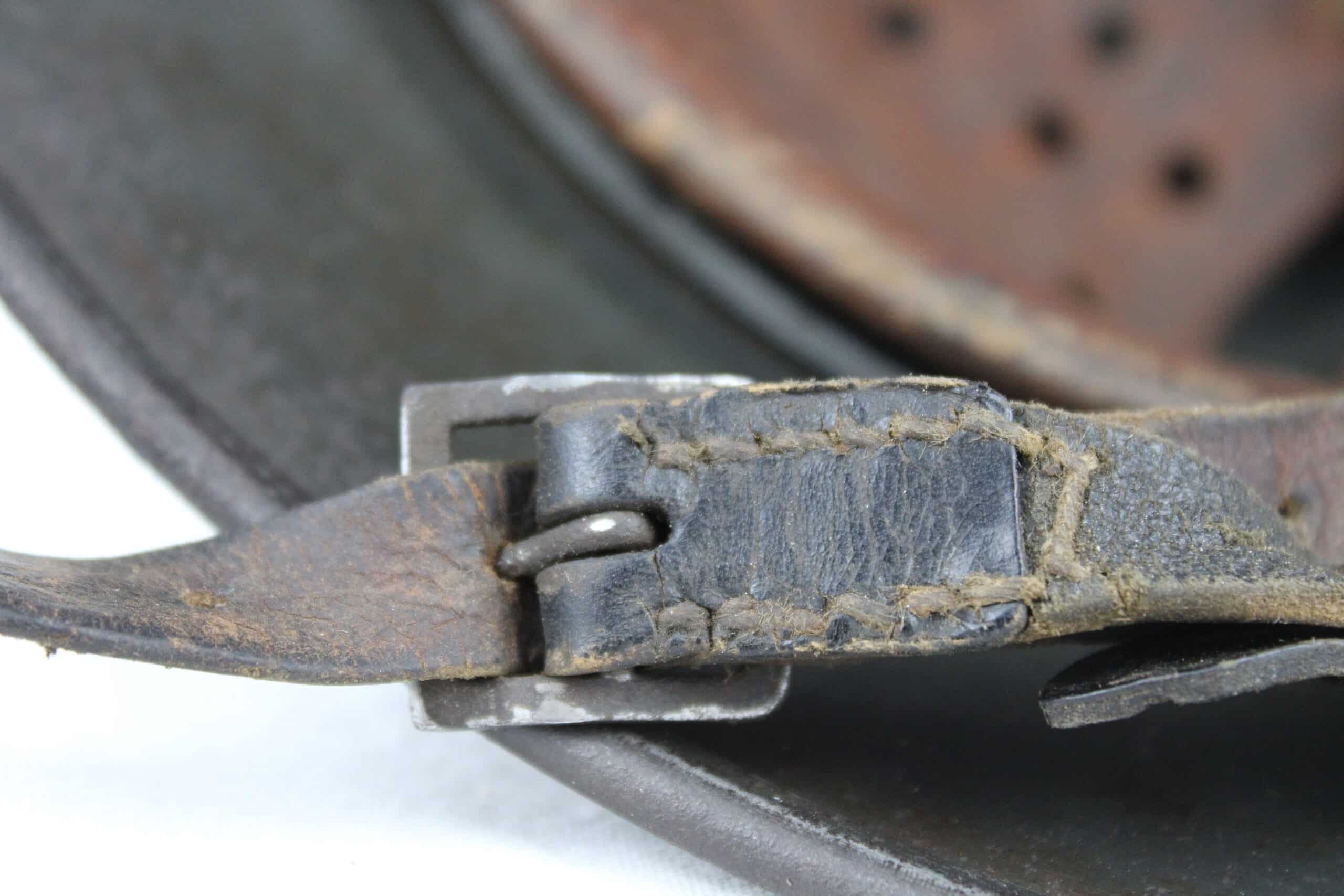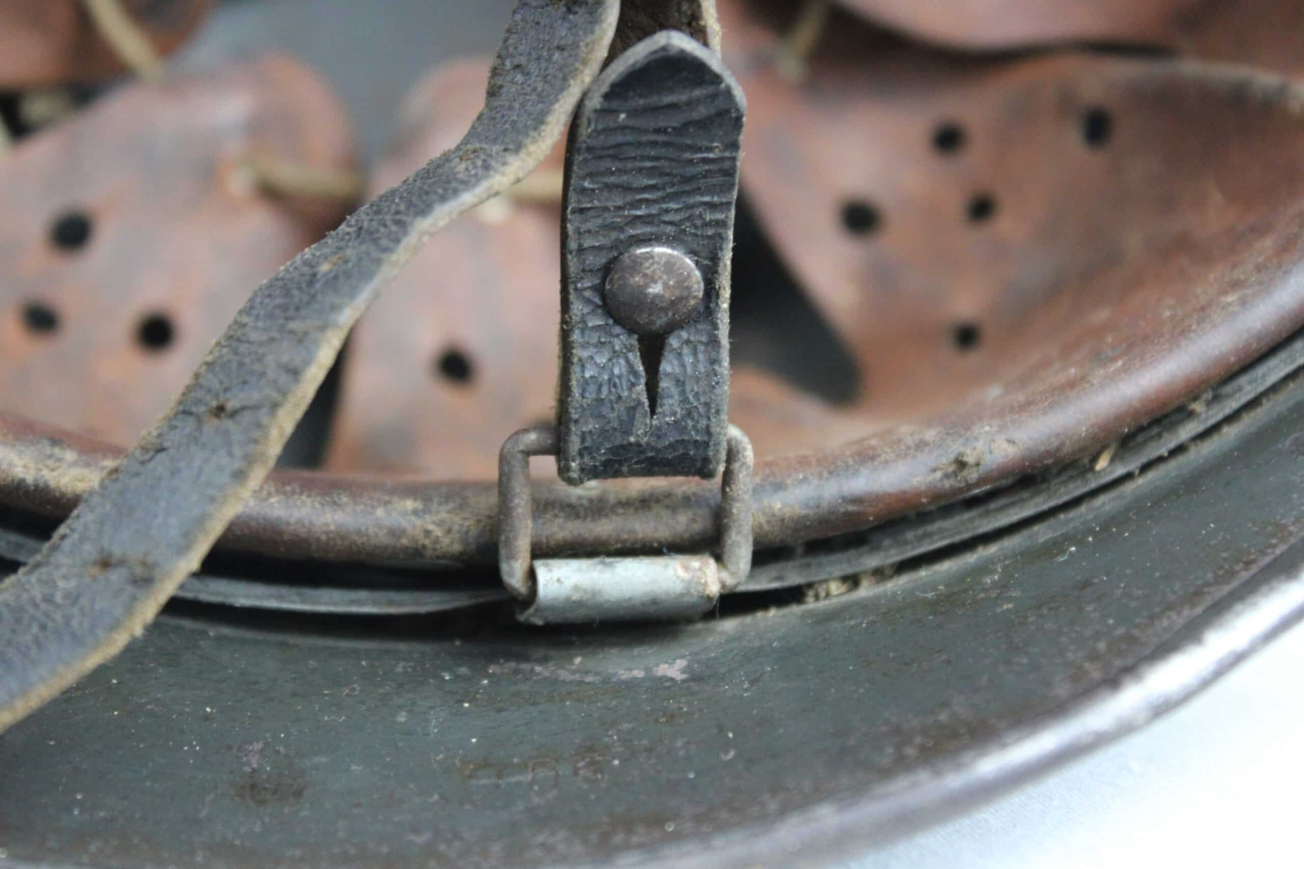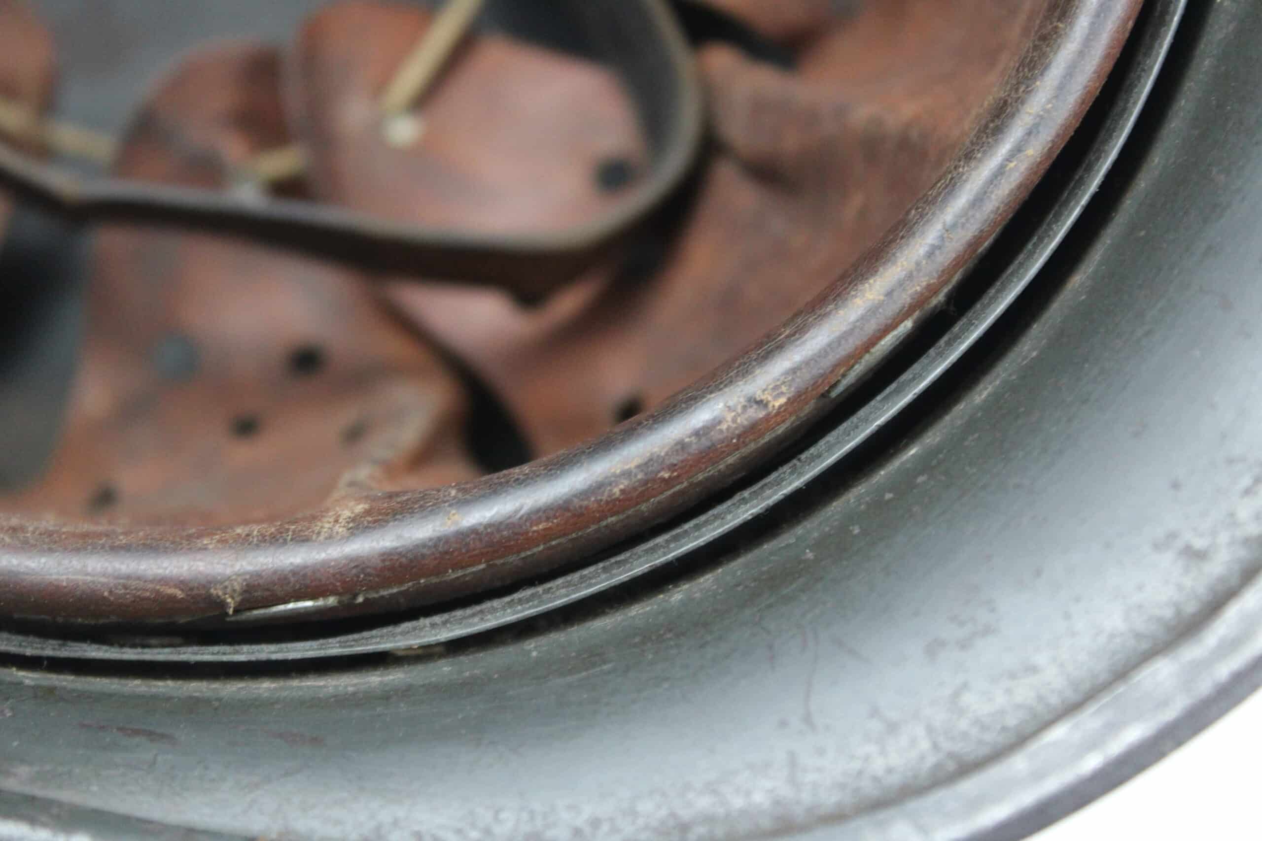 Cuir en place fin de guerre avec un léger jeu, maintenu par ses 3 rivets, monté d’origine sur cerclage acier tardif. Le cuir est en très bel état est bien souple en taille 59.
