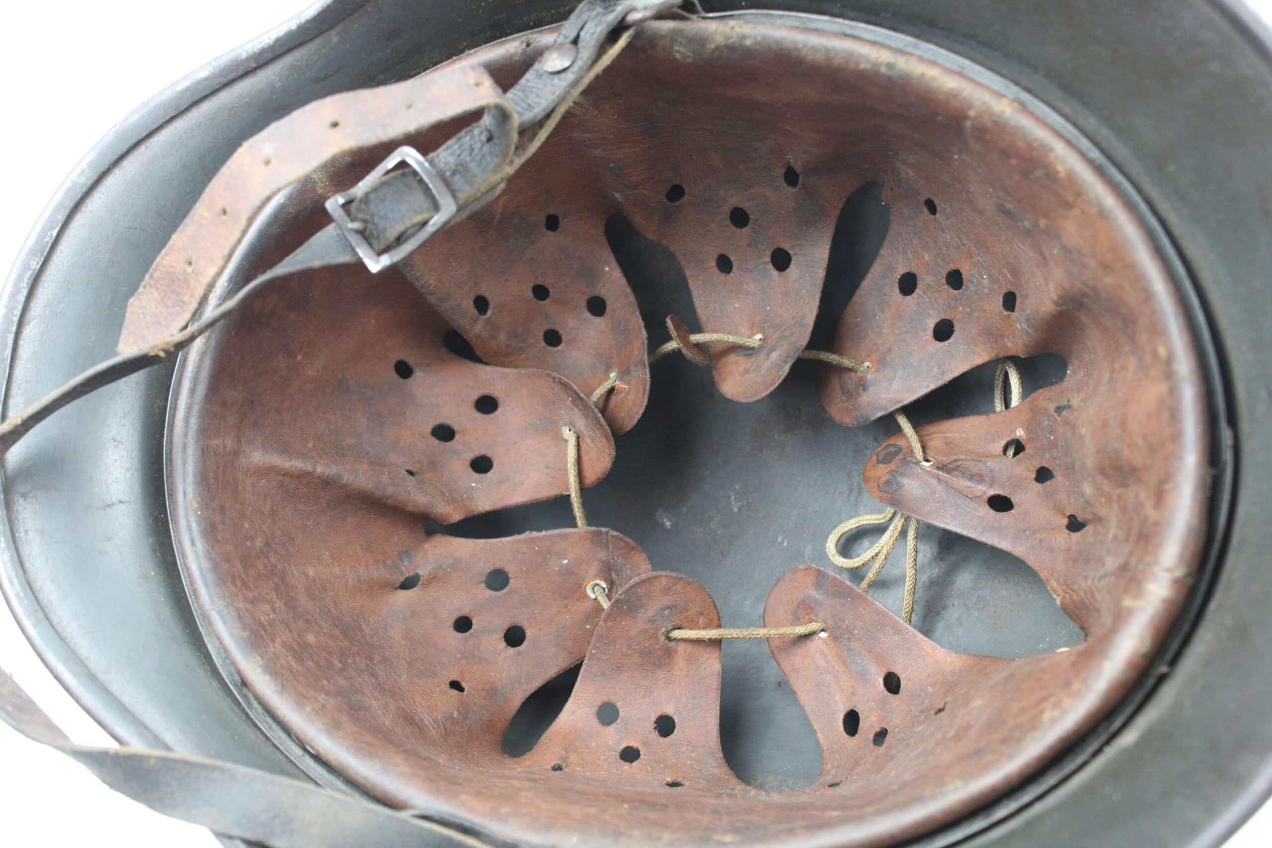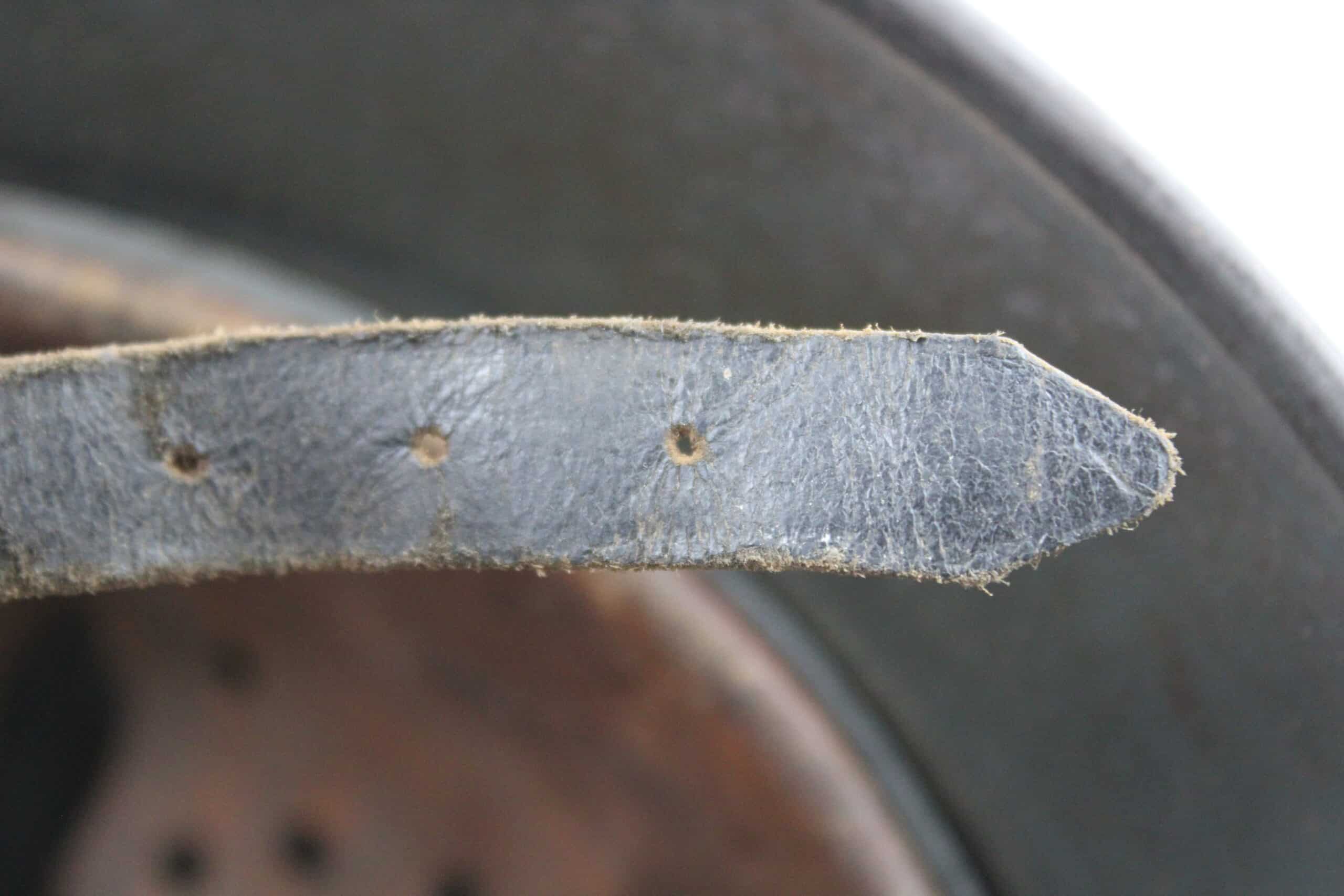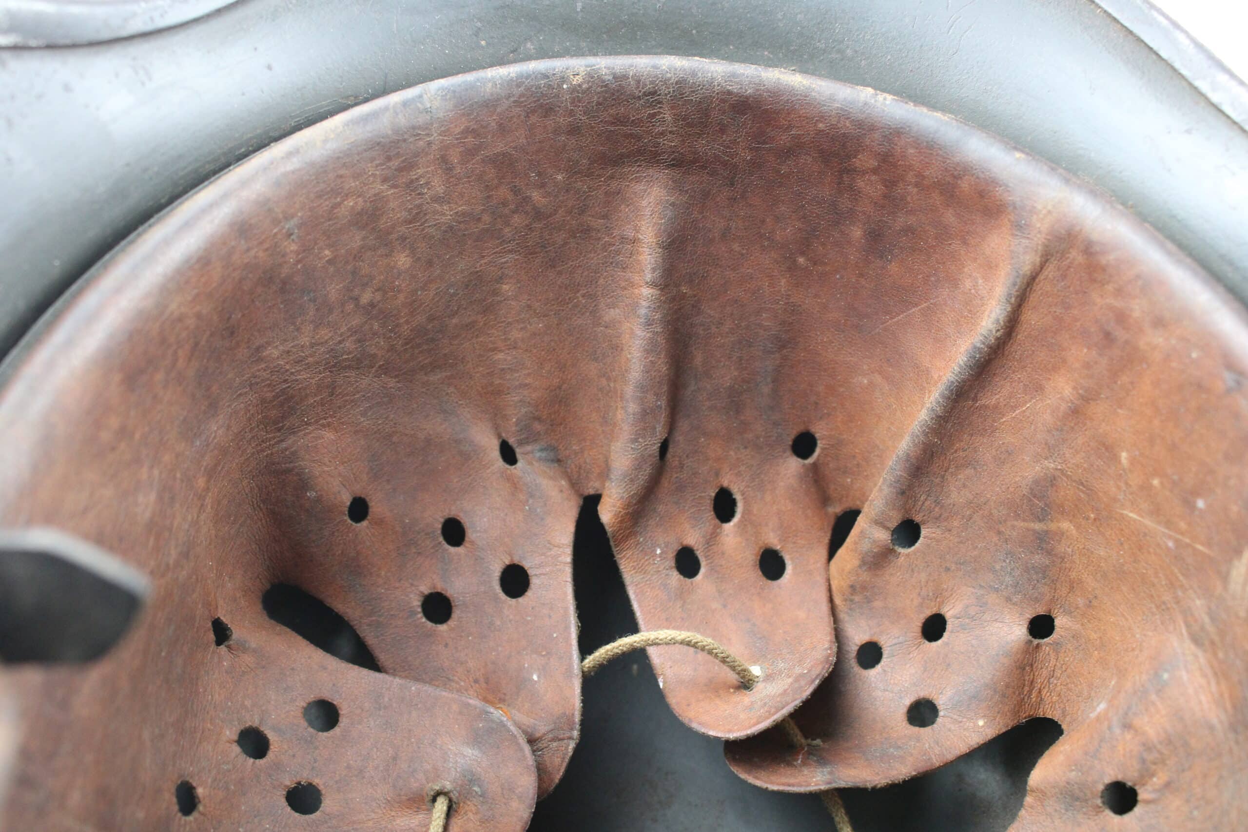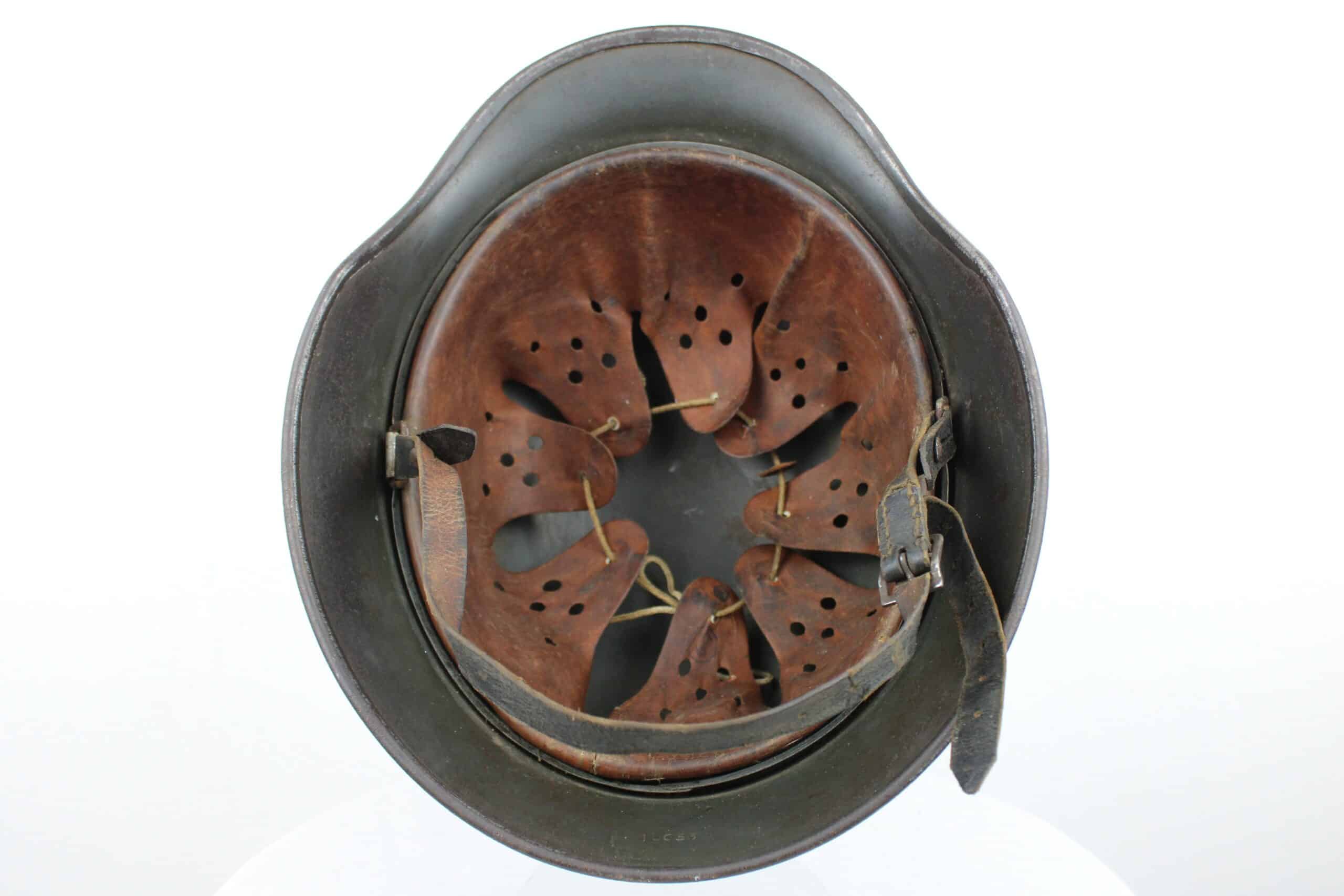 Cuir en place fin de guerre avec un léger jeu, maintenu par ses 3 rivets, monté d’origine sur cerclage acier tardif. Le cuir est en très bel état est bien souple en taille 59.