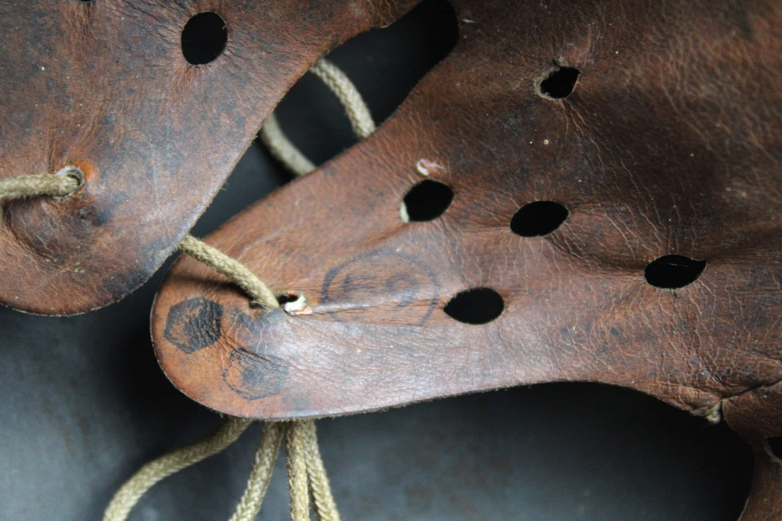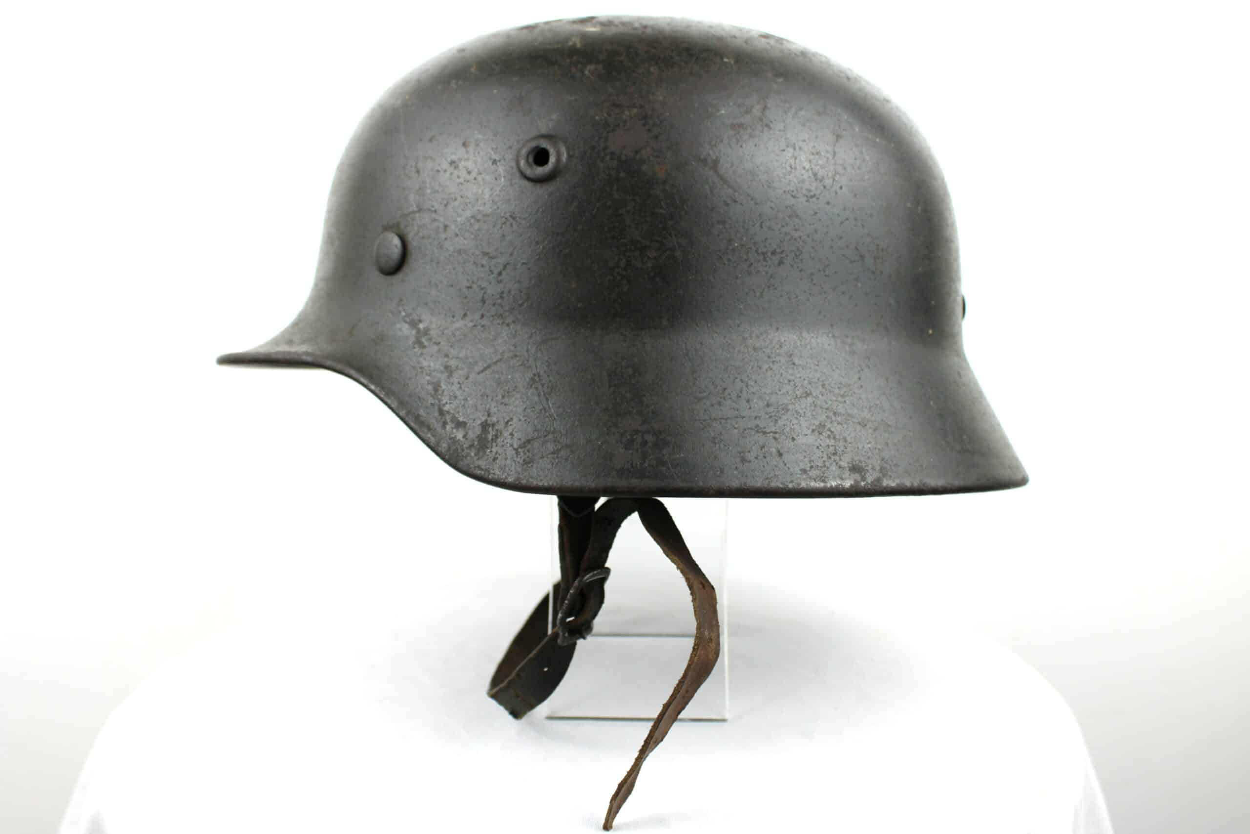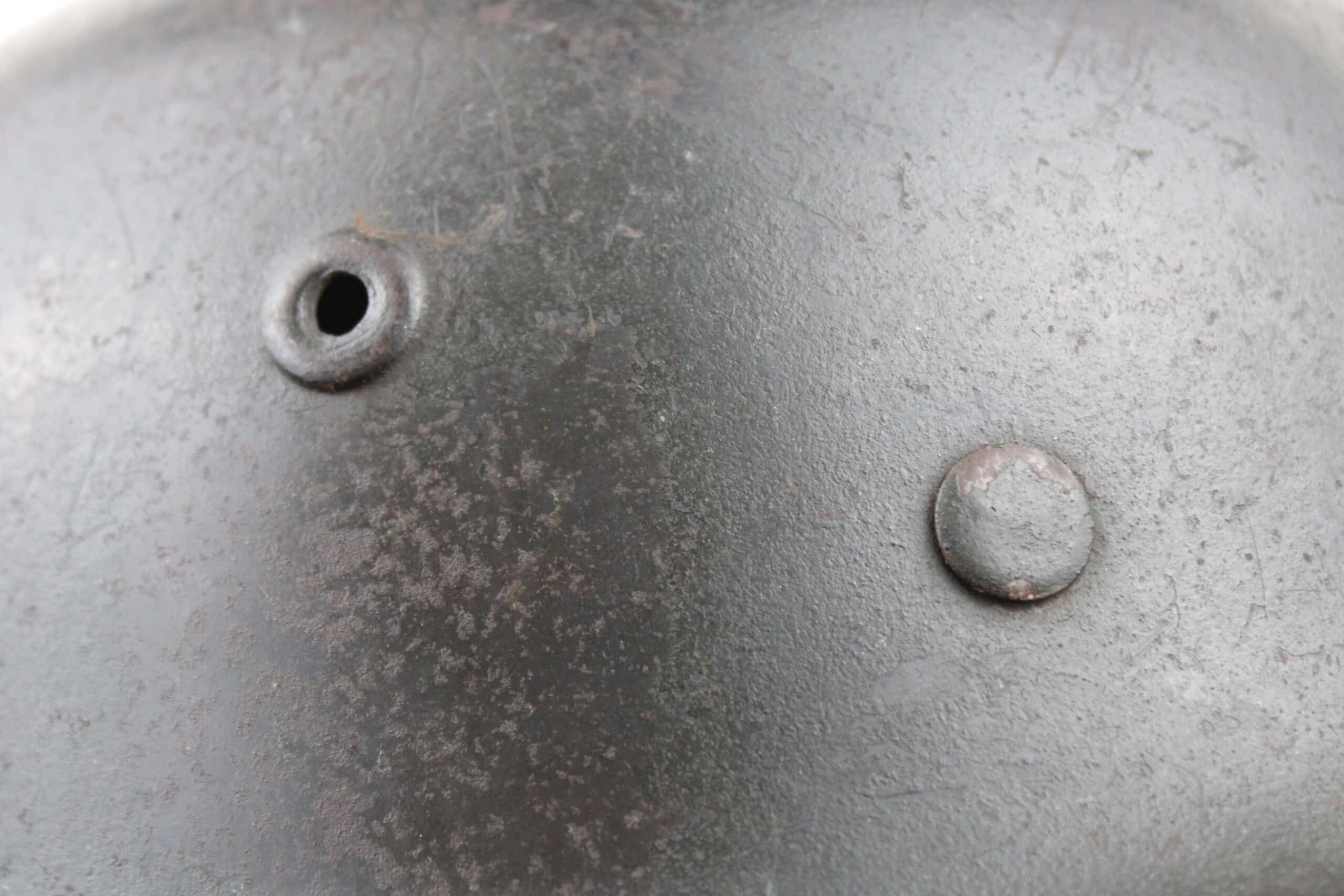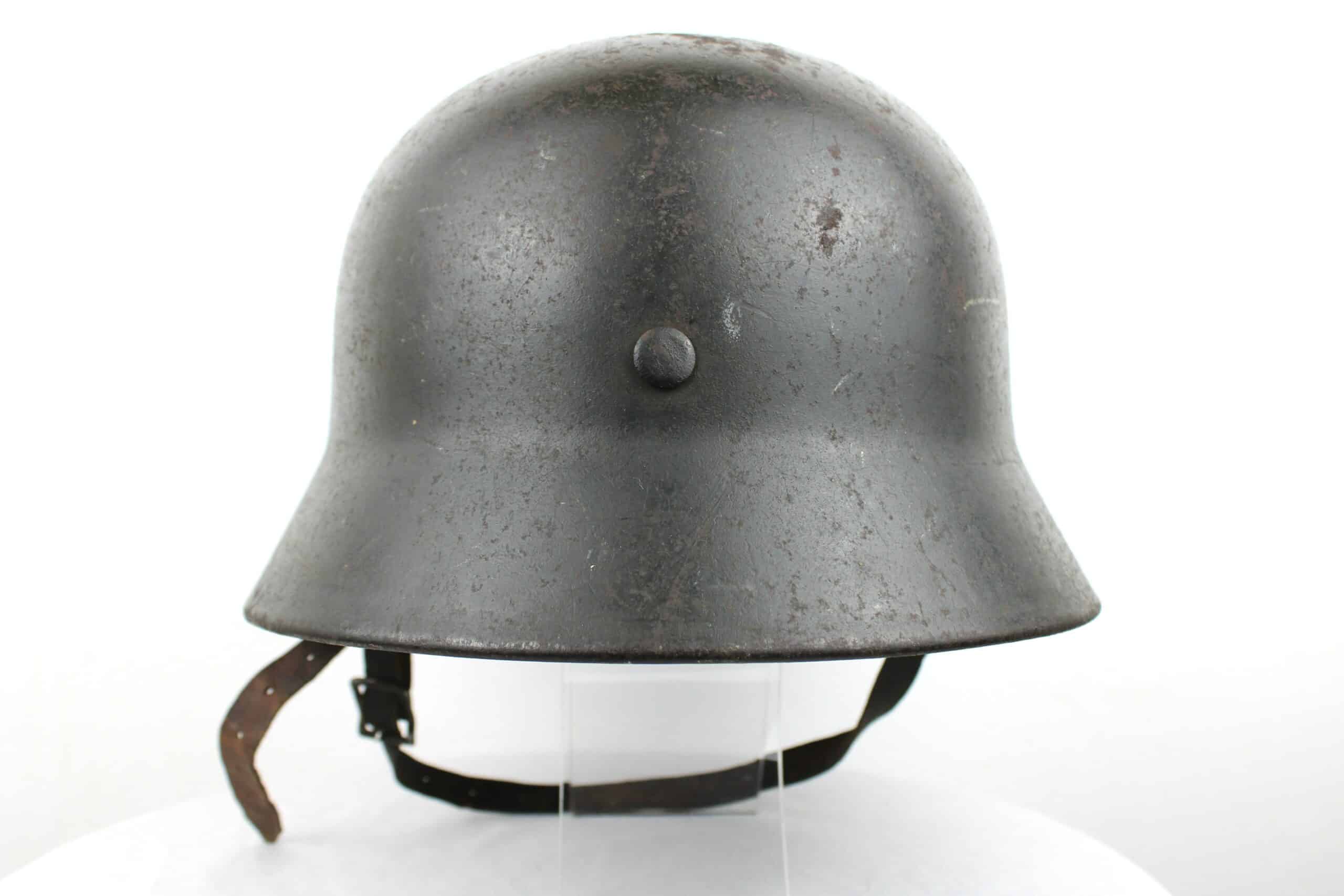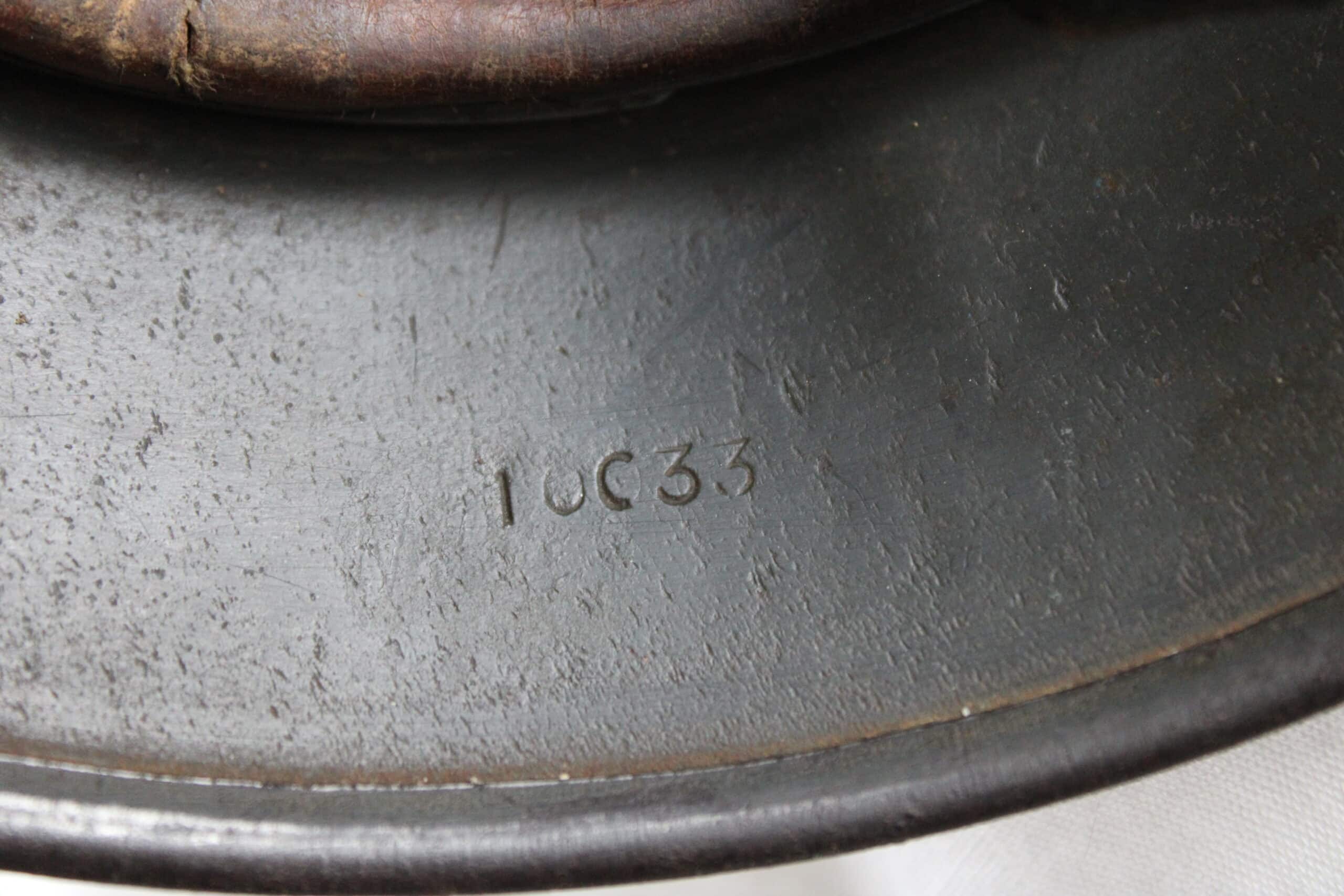 Cuir en place fin de guerre avec un léger jeu, maintenu par ses 3 rivets, monté d’origine sur cerclage acier tardif. Le cuir est en très bel état est bien souple en taille 59.
