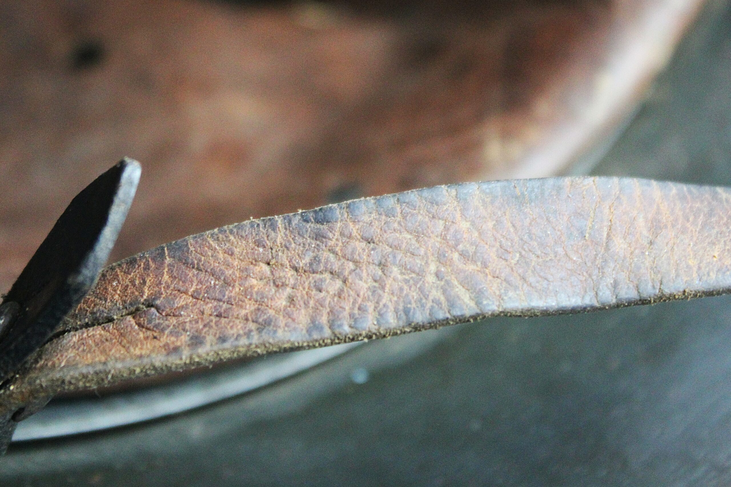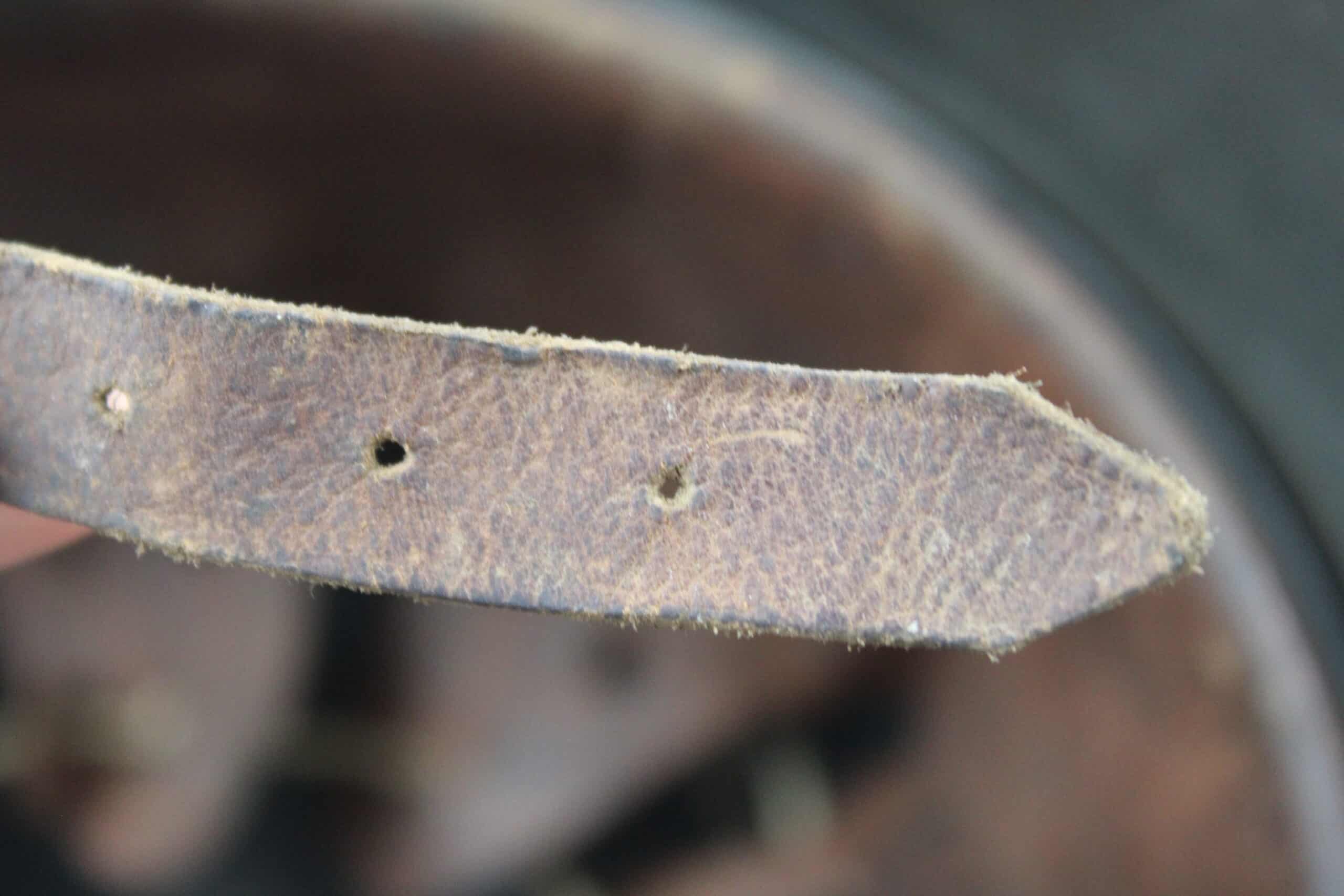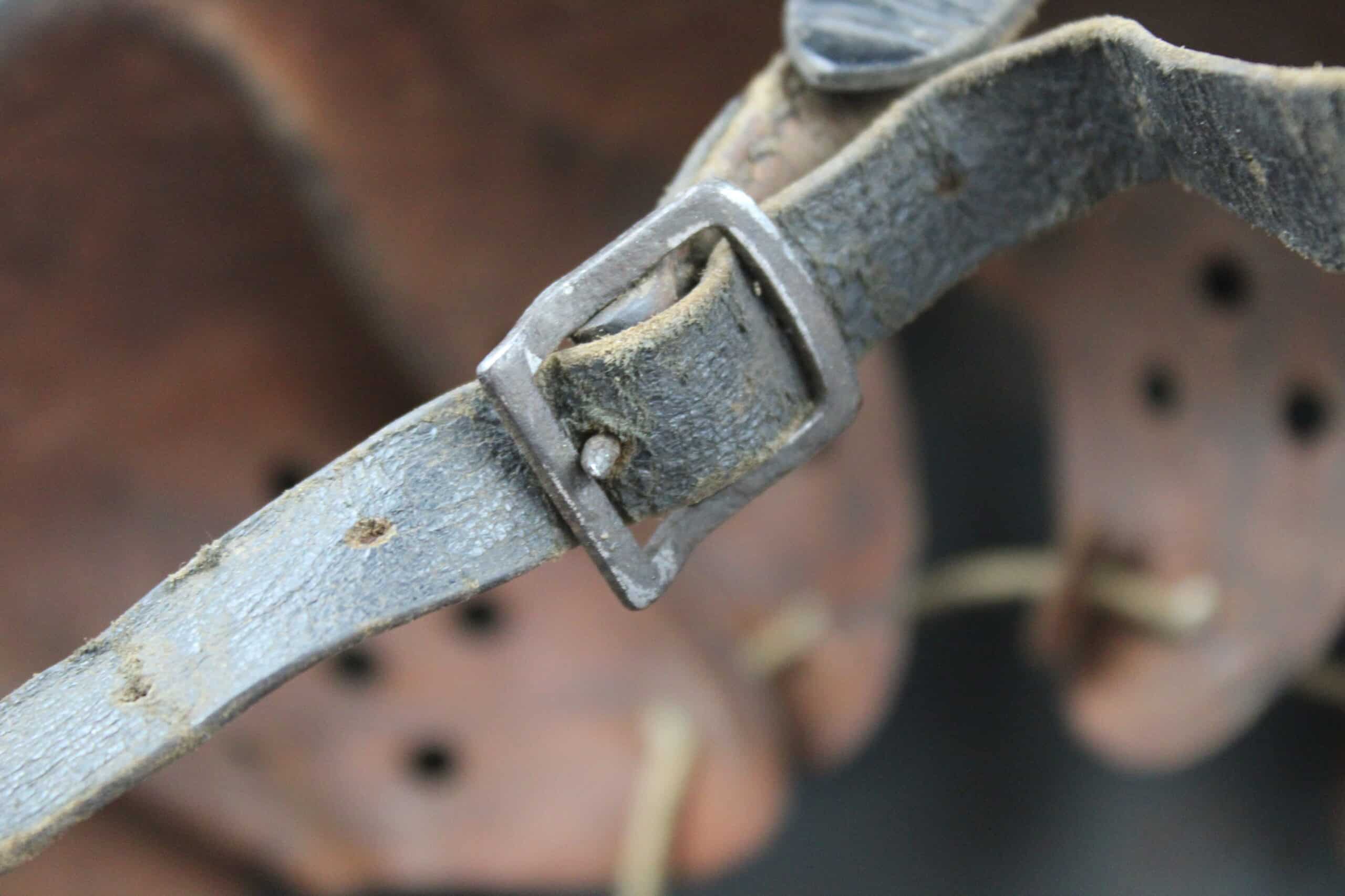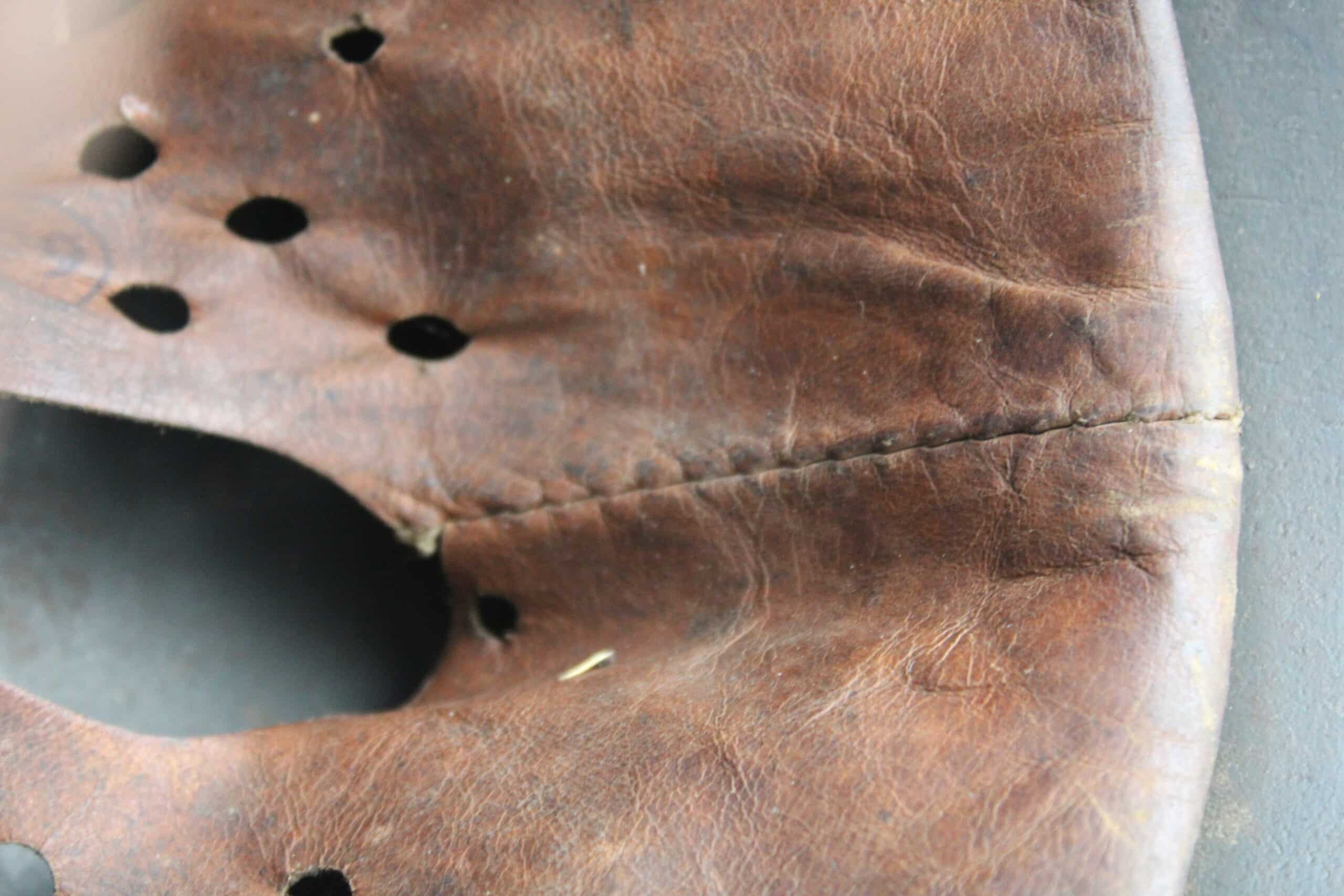 Cuir en place fin de guerre avec un léger jeu, maintenu par ses 3 rivets, monté d’origine sur cerclage acier tardif. Le cuir est en très bel état est bien souple en taille 59.