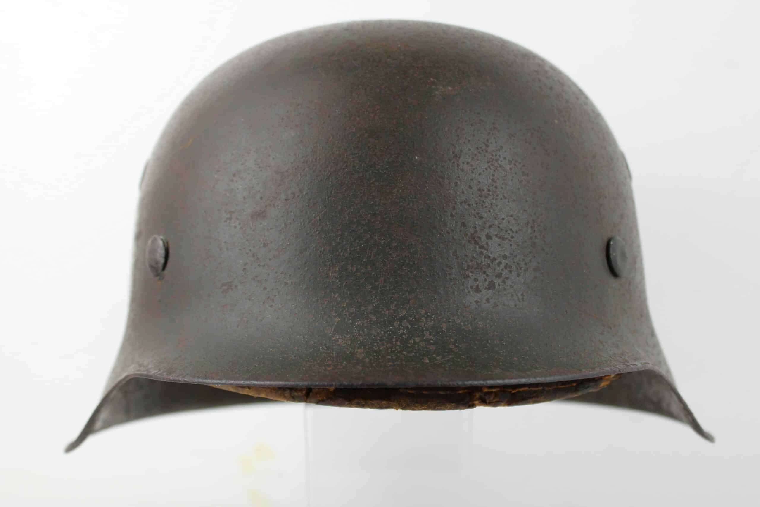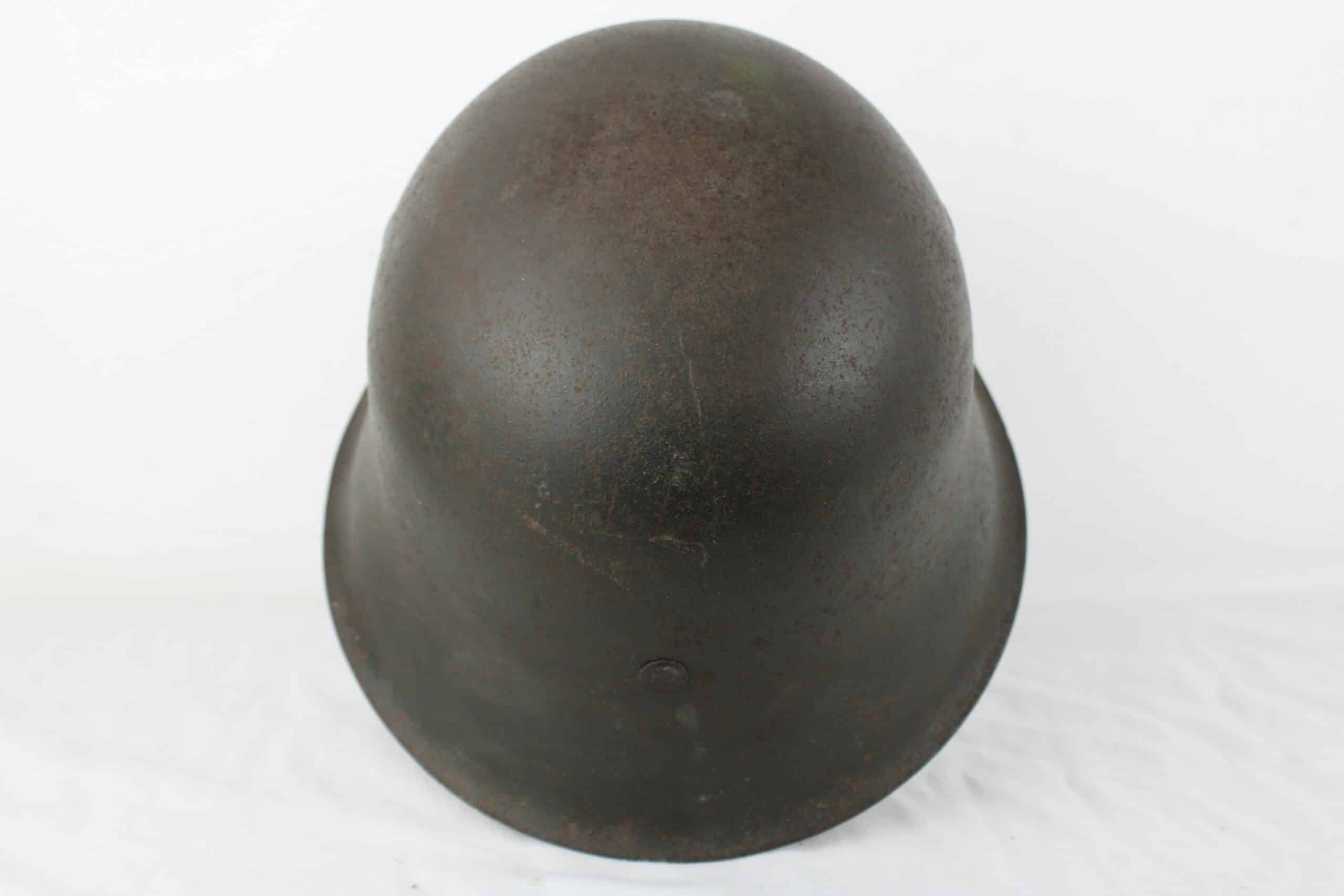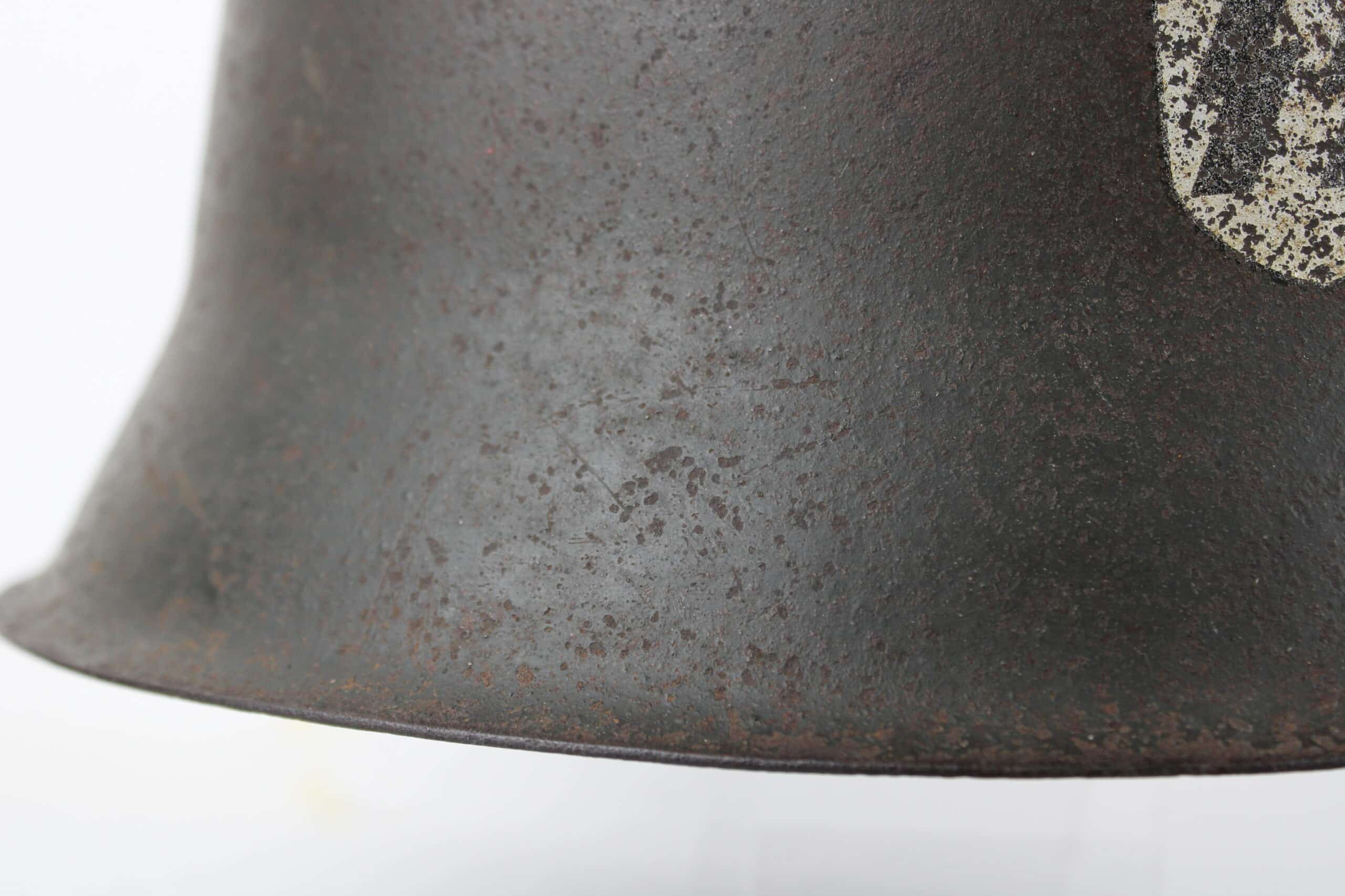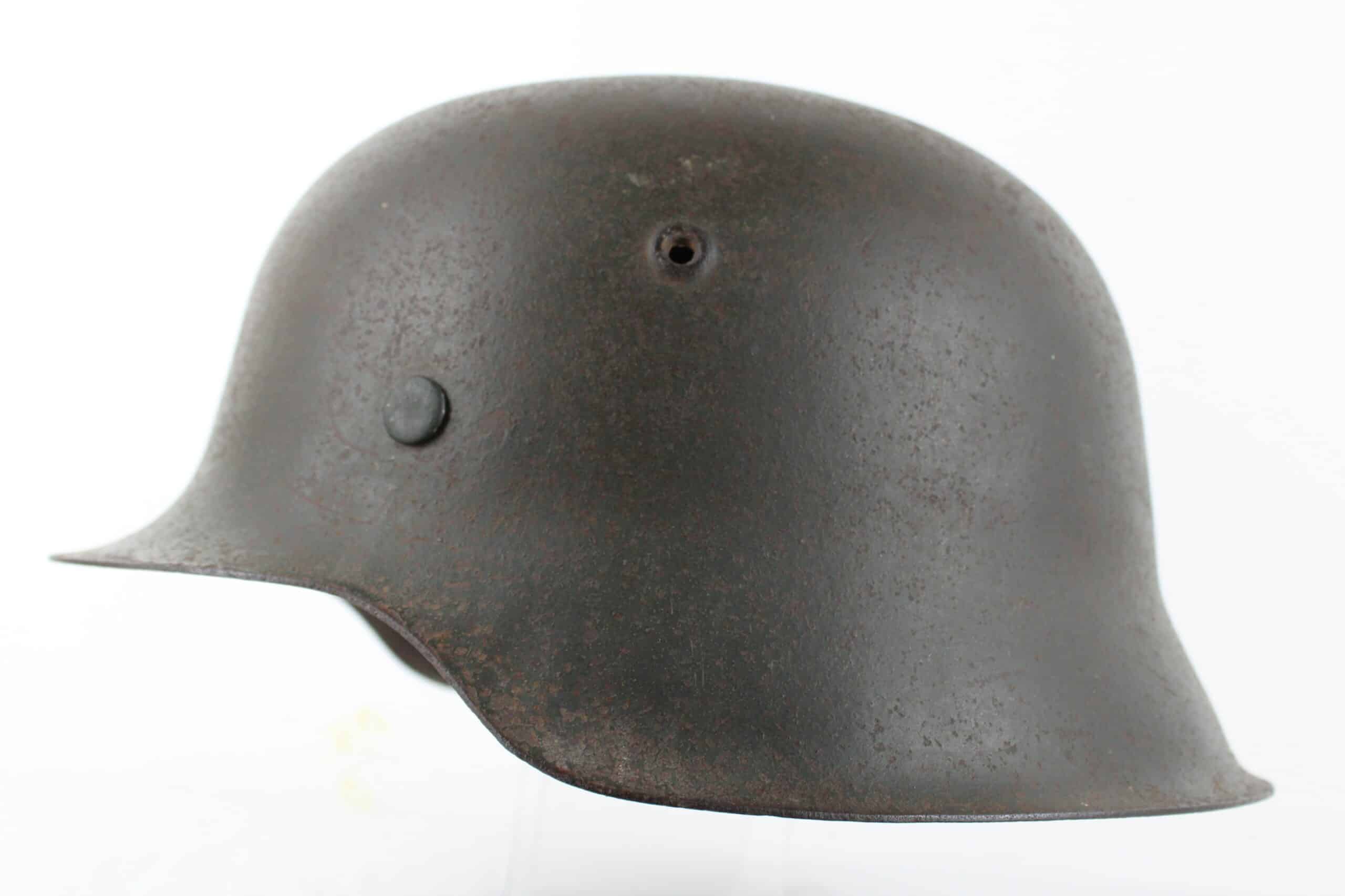 Casque de fabrication ET/CKL taille 64 ,ET est connu pour ses marquages de mauvaise facture, ce qui est le cas ici, en revanche nous pouvons identifier le fabricant par la forme général du casque ainsi que par ses œillets d’aération. Numéro de lot quasi illisible, peinture feldgrau sombre typique des casque Waffen encore très présente avec un bel insigne coté droit de type « ET » concordant parfaitement avec le fabricant.