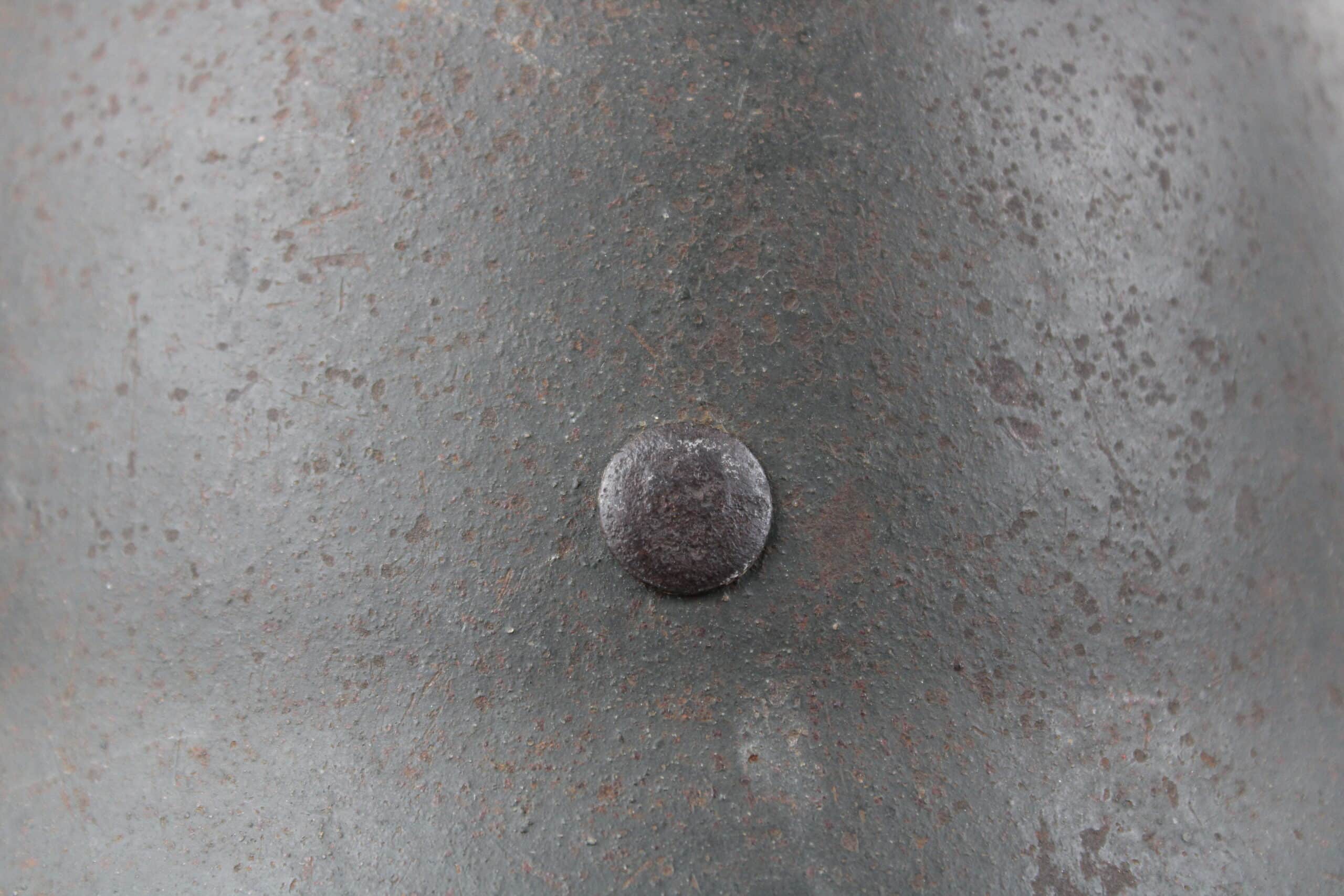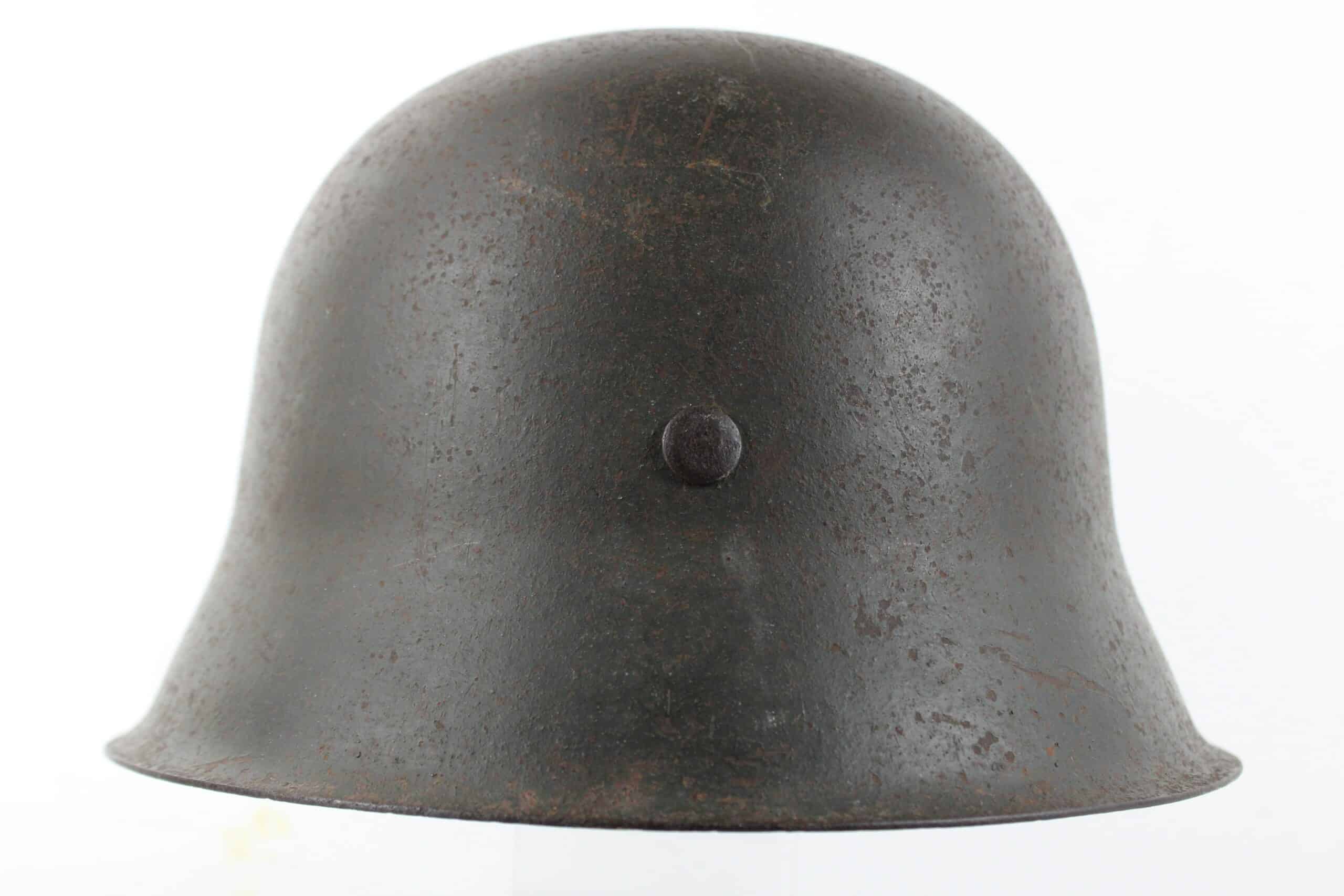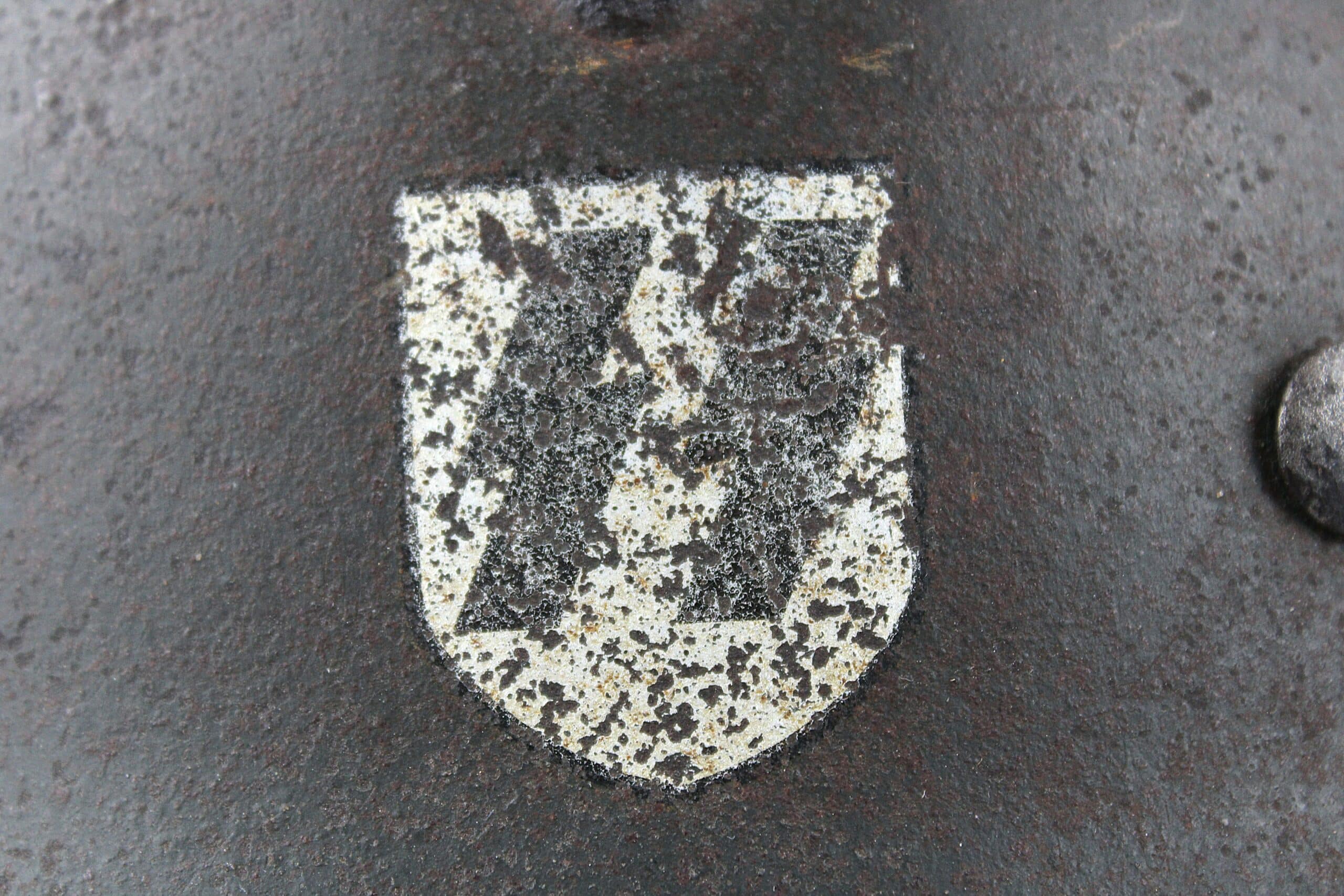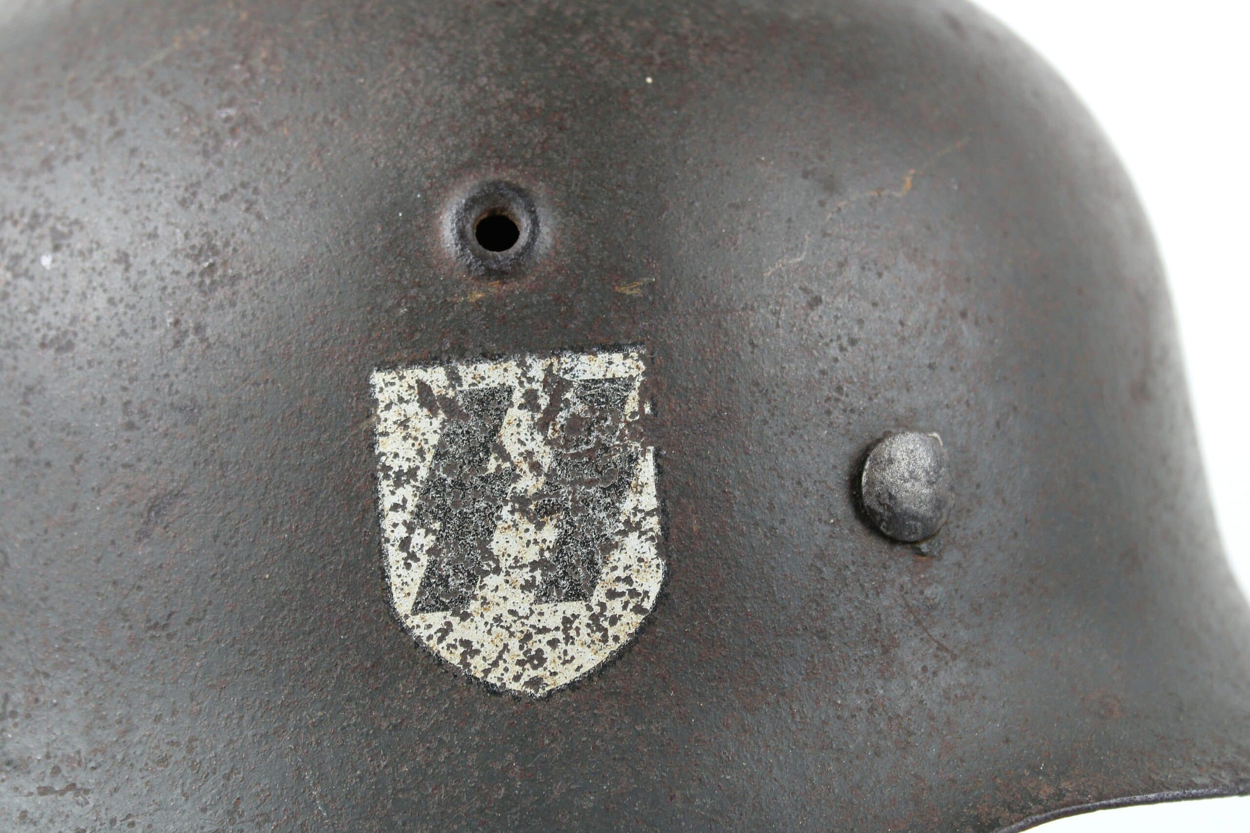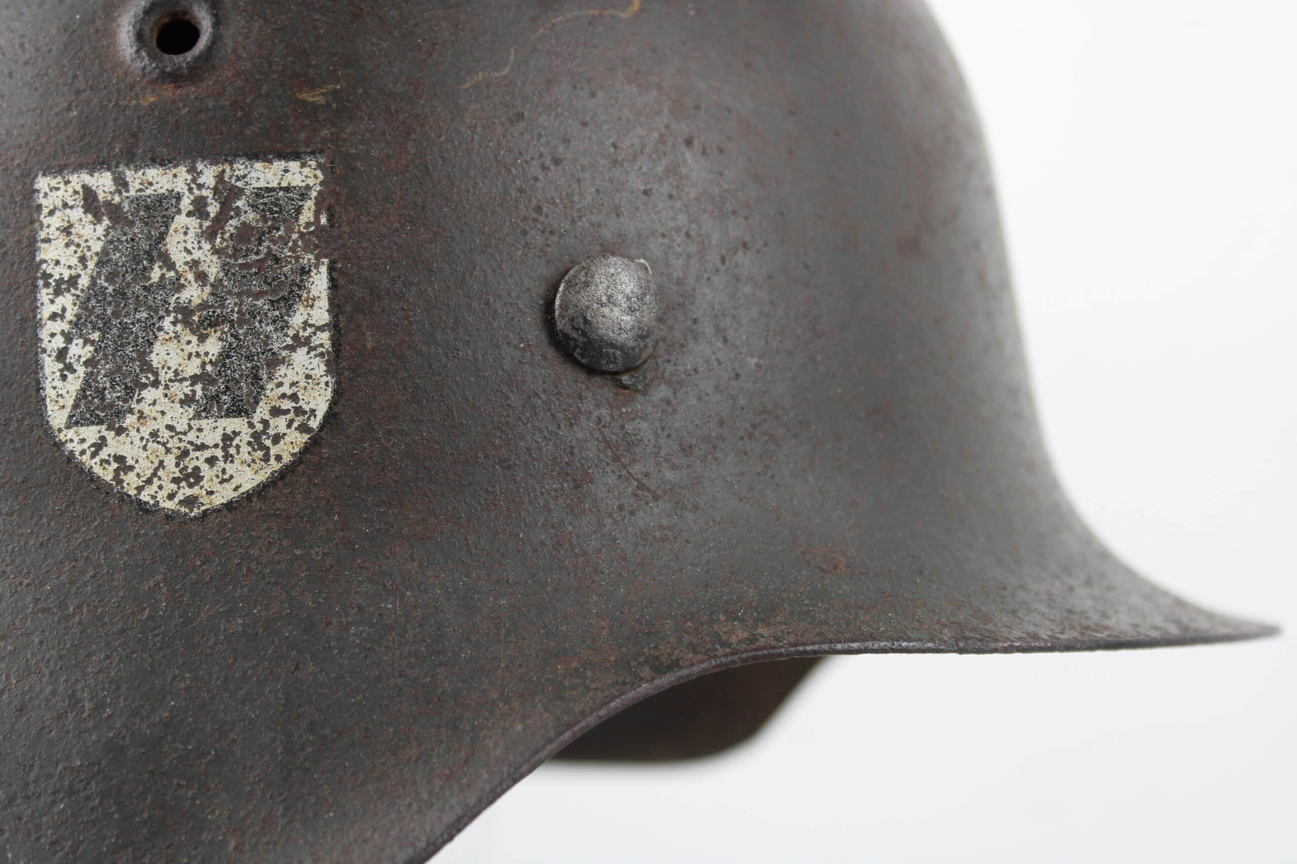 Casque de fabrication ET/CKL taille 64 ,ET est connu pour ses marquages de mauvaise facture, ce qui est le cas ici, en revanche nous pouvons identifier le fabricant par la forme général du casque ainsi que par ses œillets d’aération. Numéro de lot quasi illisible, peinture feldgrau sombre typique des casque Waffen encore très présente avec un bel insigne coté droit de type « ET » concordant parfaitement avec le fabricant.