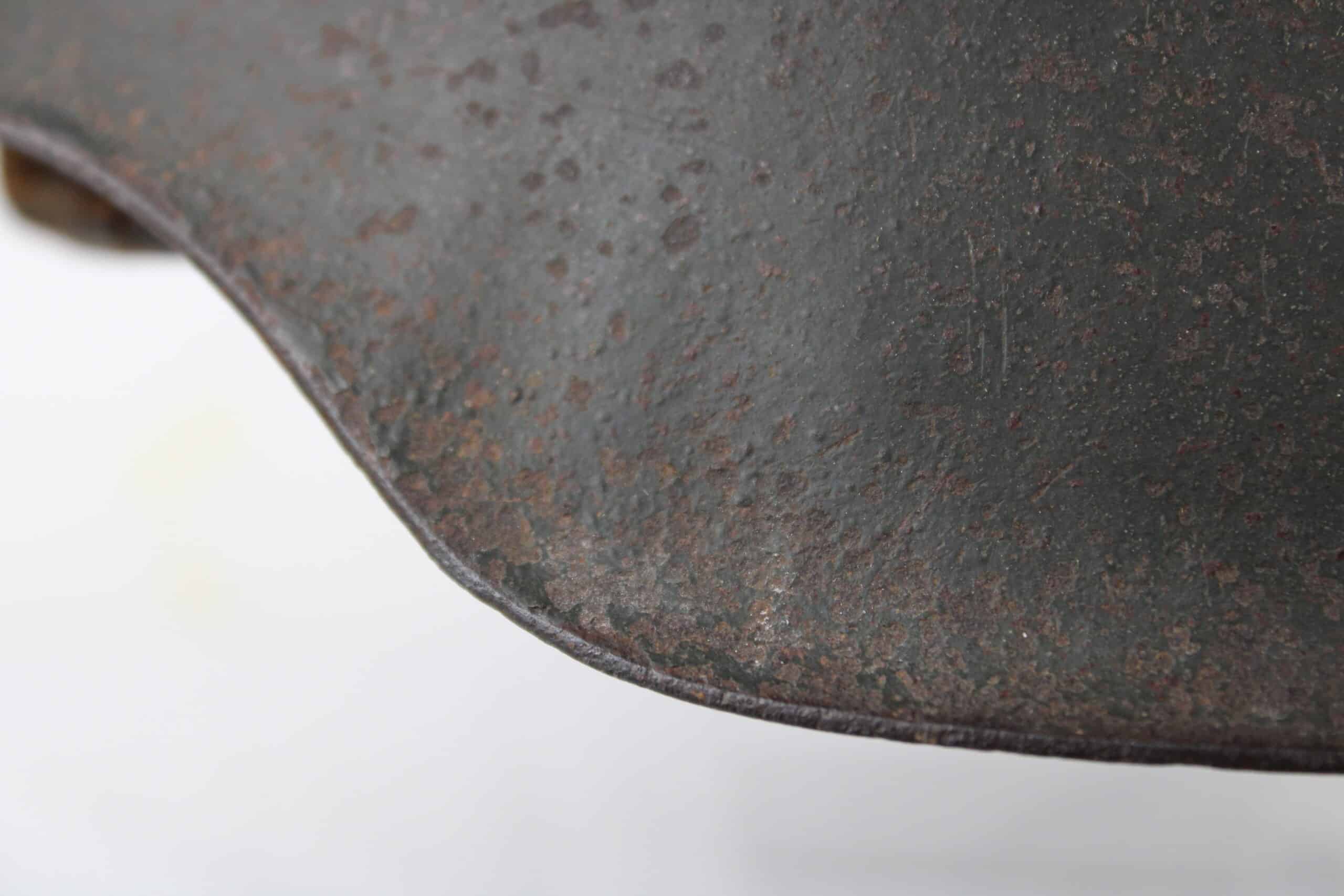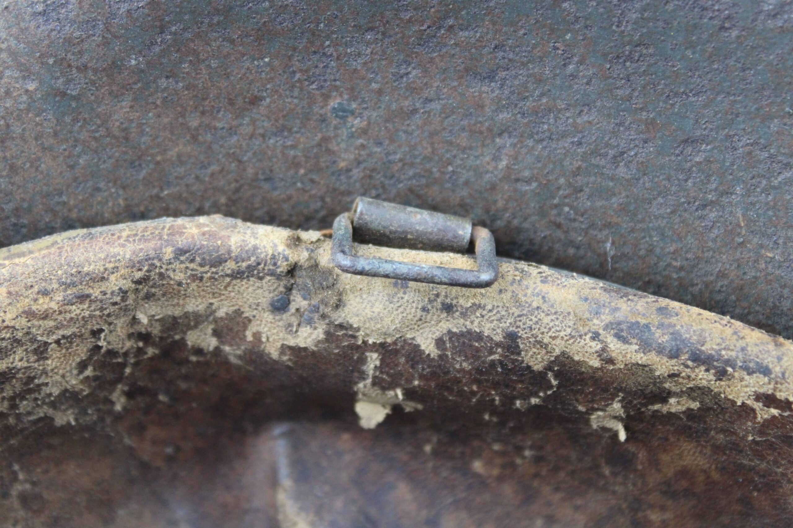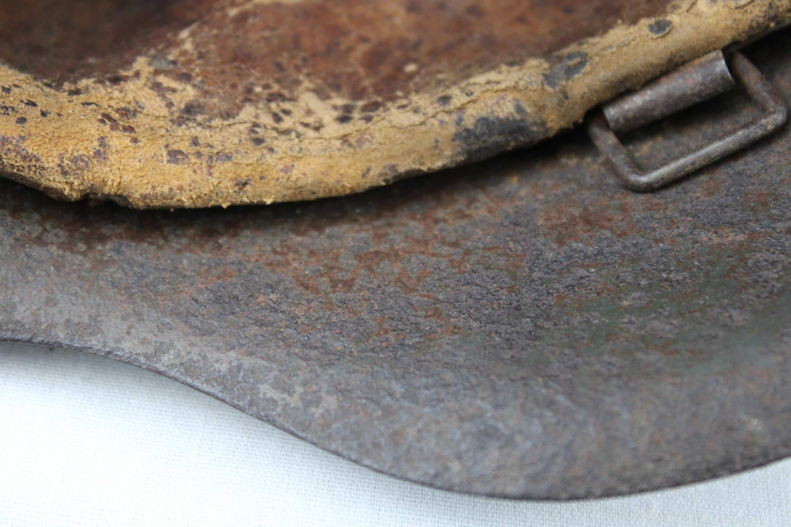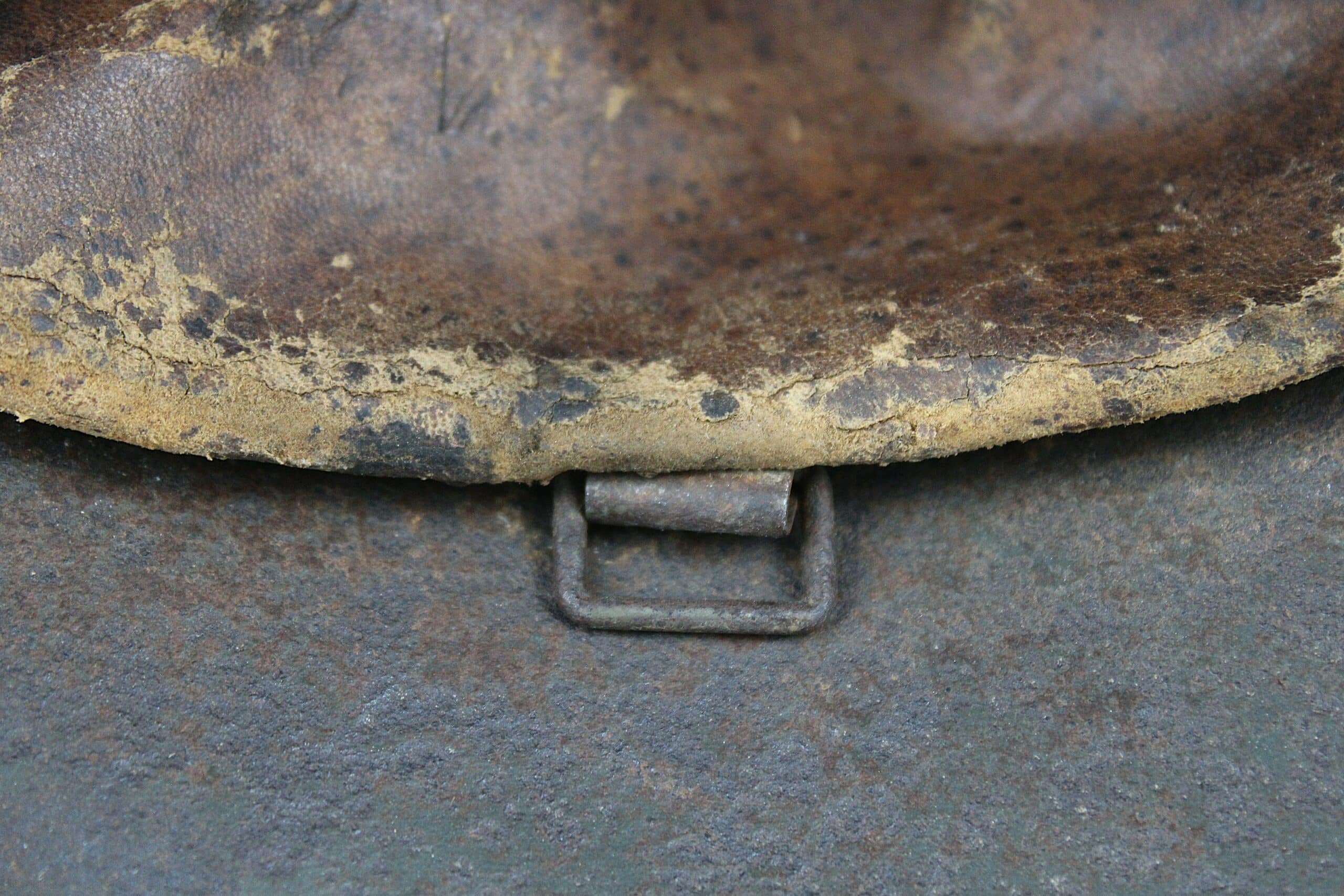 Cuir en place fin de guerre avec un léger jeu, maintenu par ses 3 rivets, monté sur cerclage acier tardif. L’avant du cuir est détaché du cerclage puisque les petits rivet aluminium sont absent.