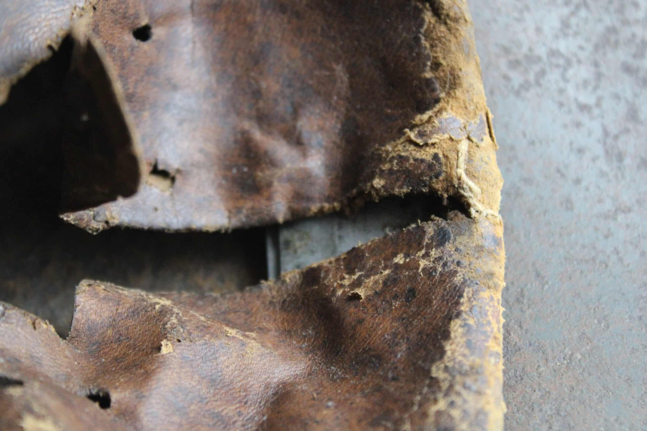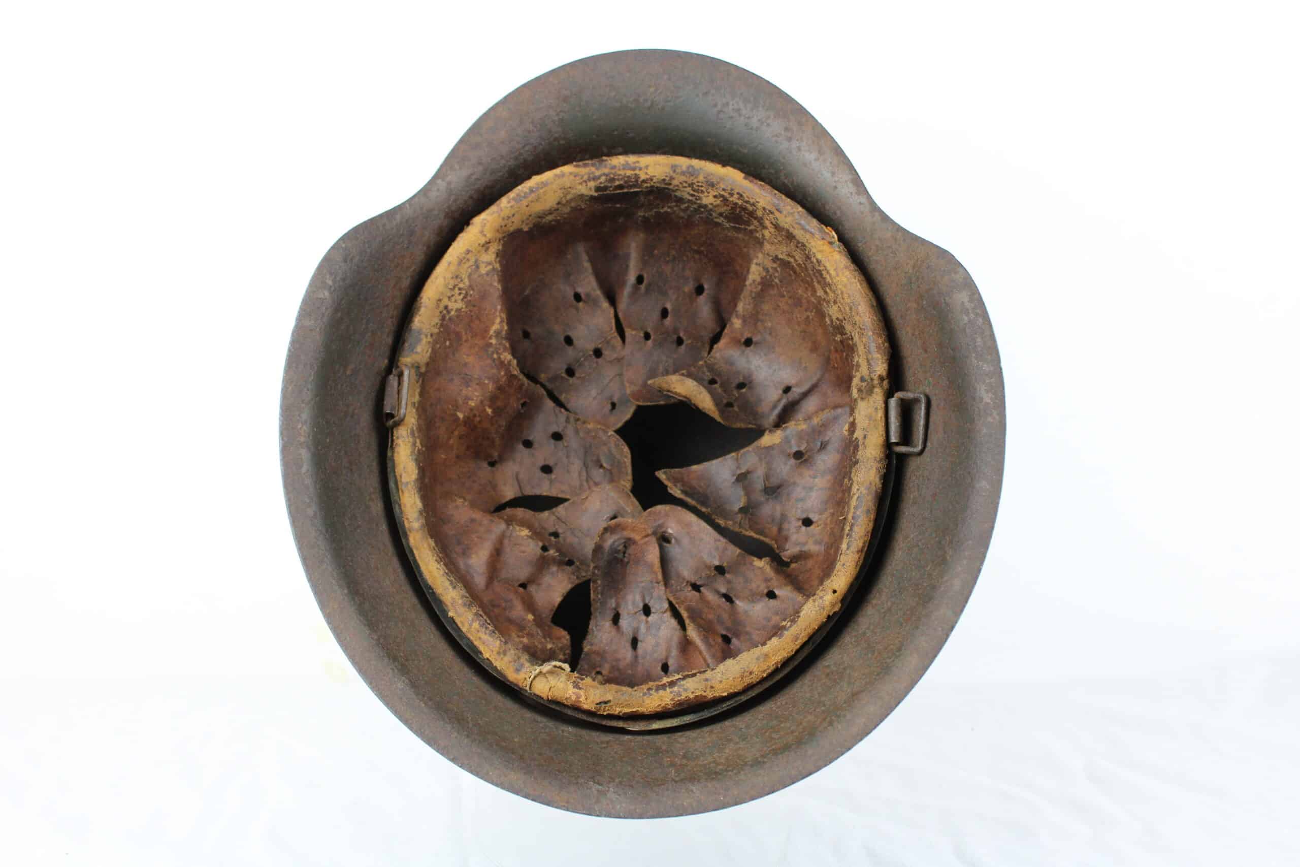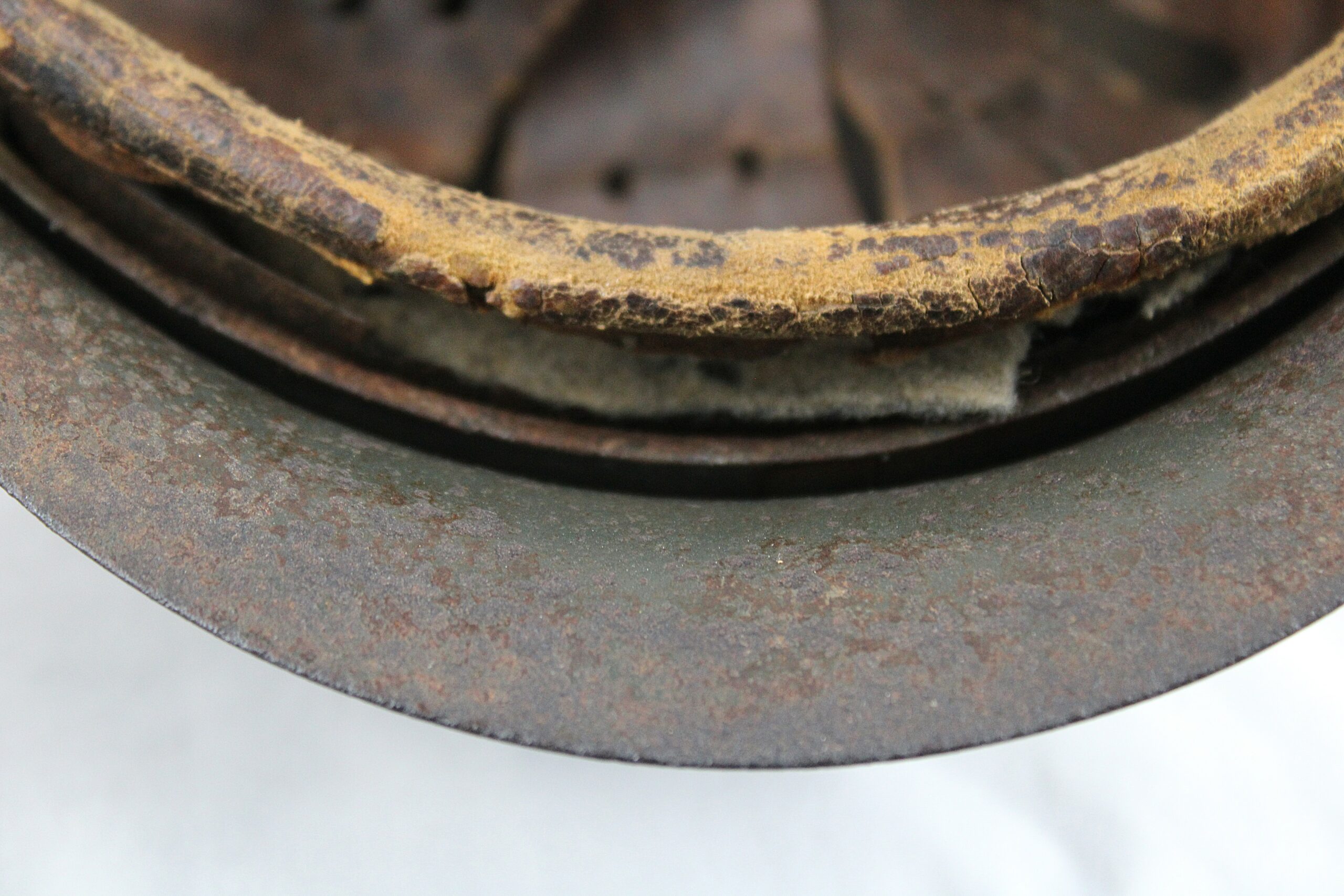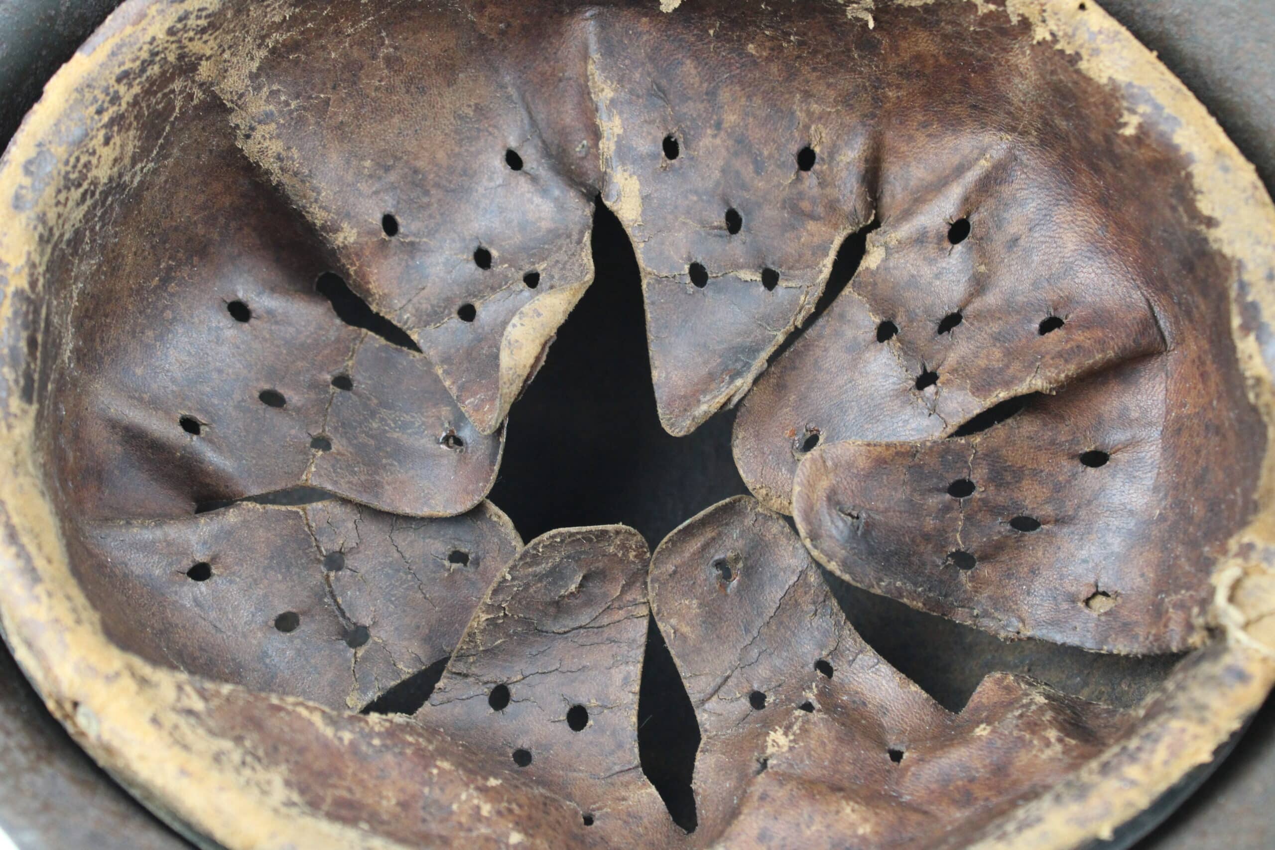 Cuir en place fin de guerre avec un léger jeu, maintenu par ses 3 rivets, monté sur cerclage acier tardif. L’avant du cuir est détaché du cerclage puisque les petits rivet aluminium sont absent.