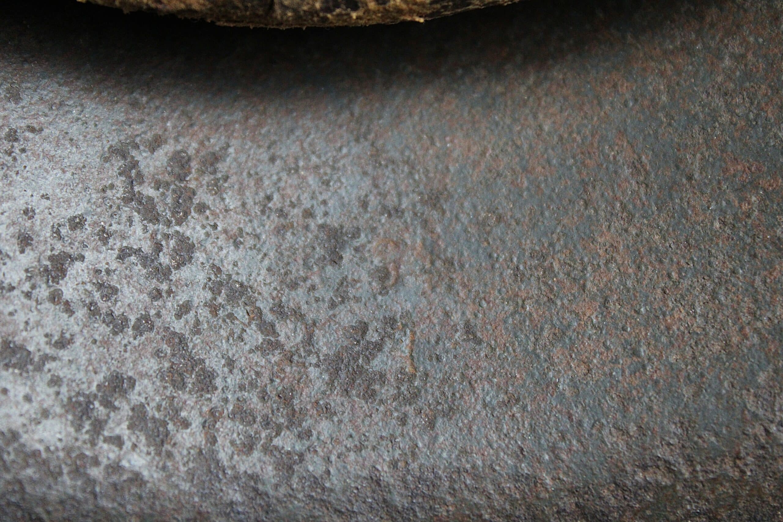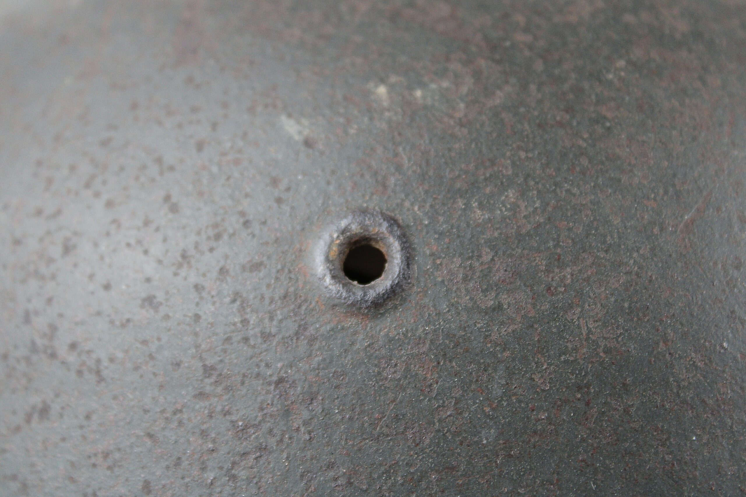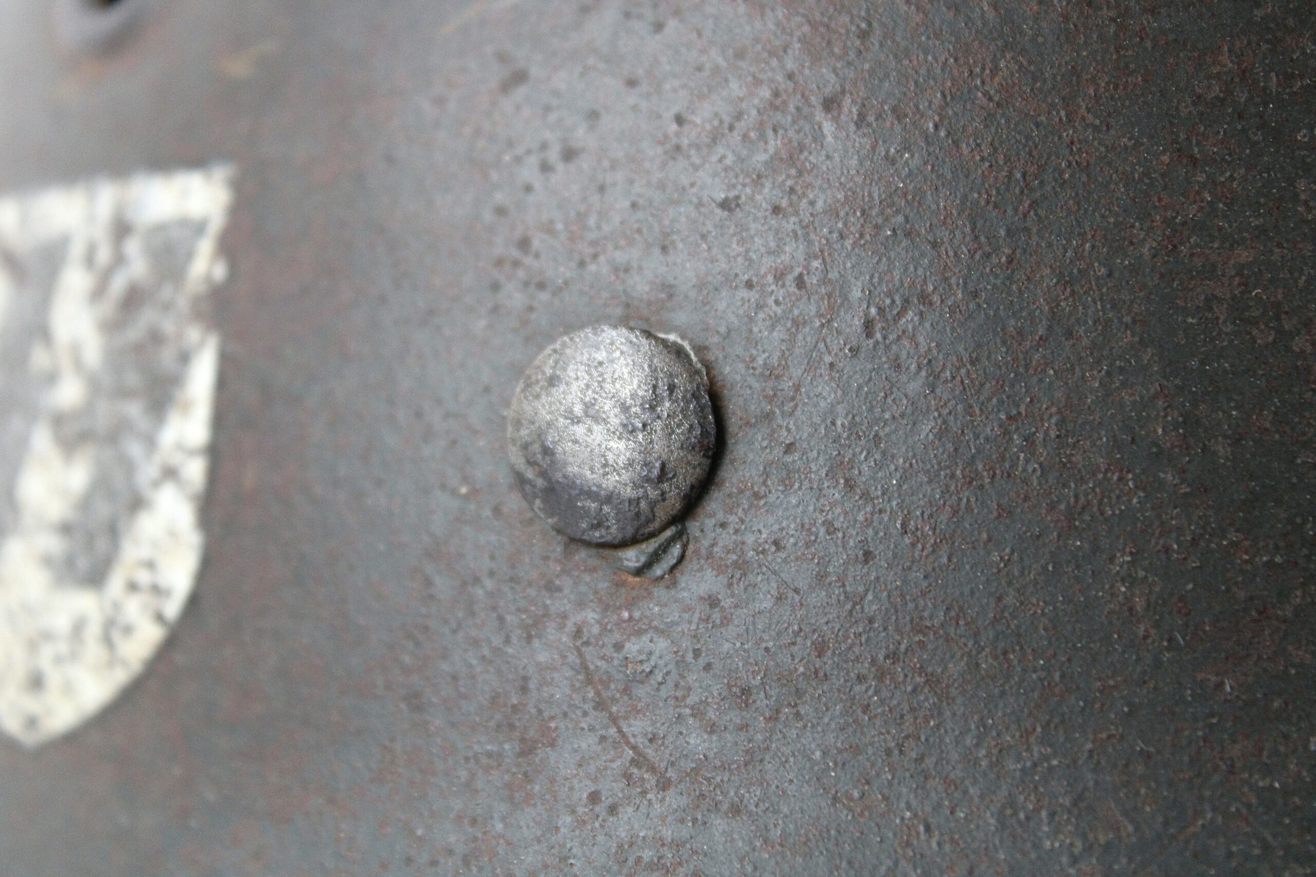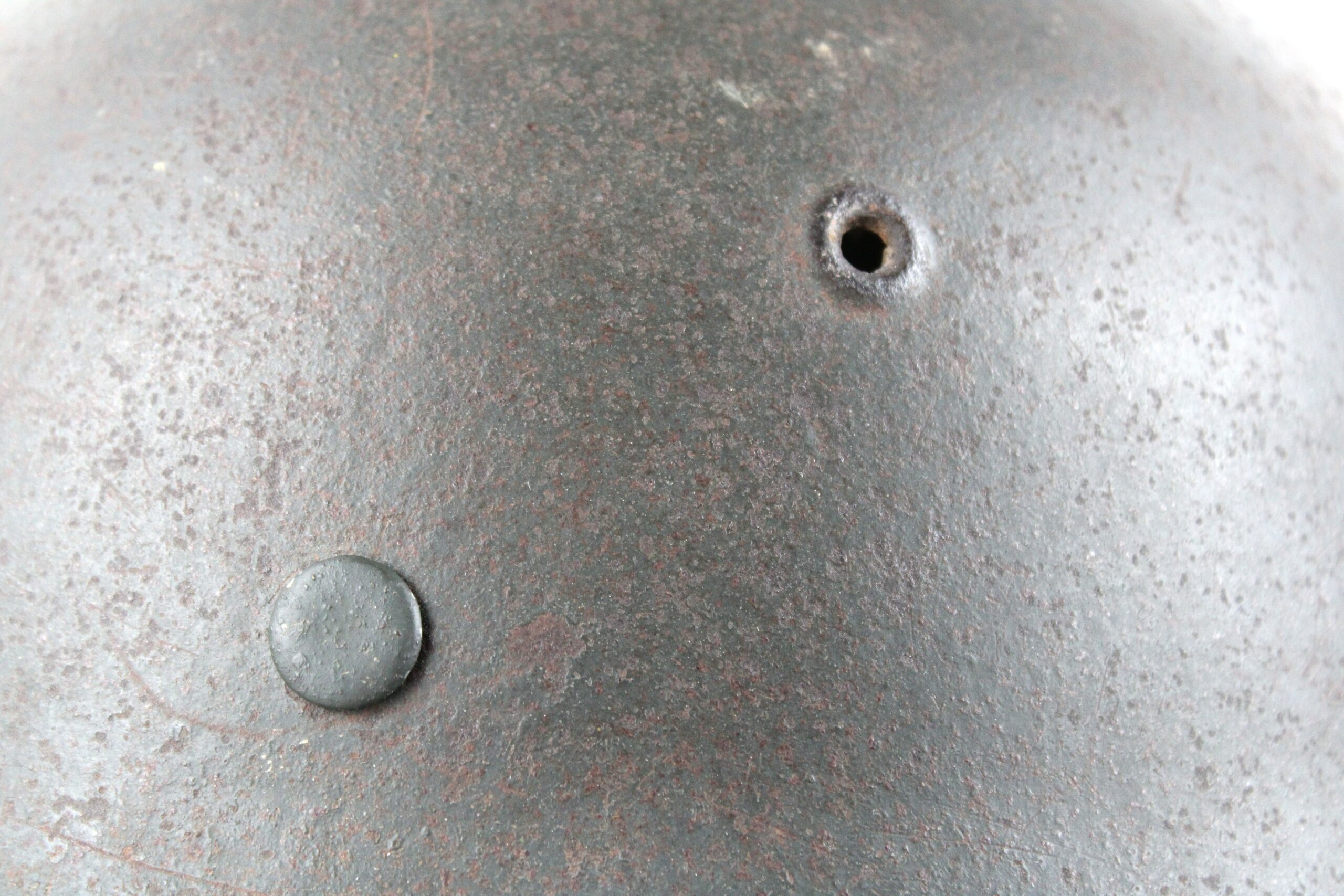 Cuir en place fin de guerre avec un léger jeu, maintenu par ses 3 rivets, monté sur cerclage acier tardif. L’avant du cuir est détaché du cerclage puisque les petits rivet aluminium sont absent.