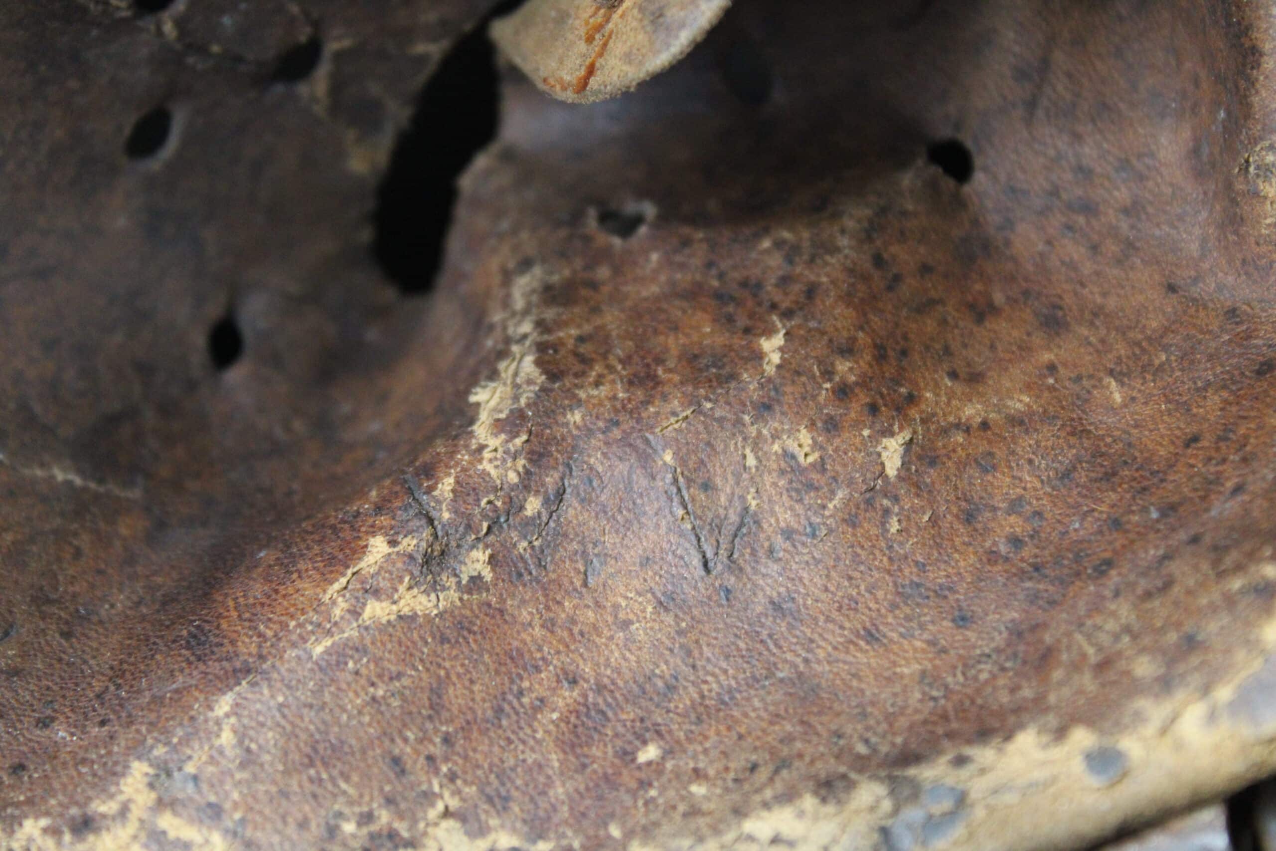 Initiales du porteur gravé sur le cuir par entaille.